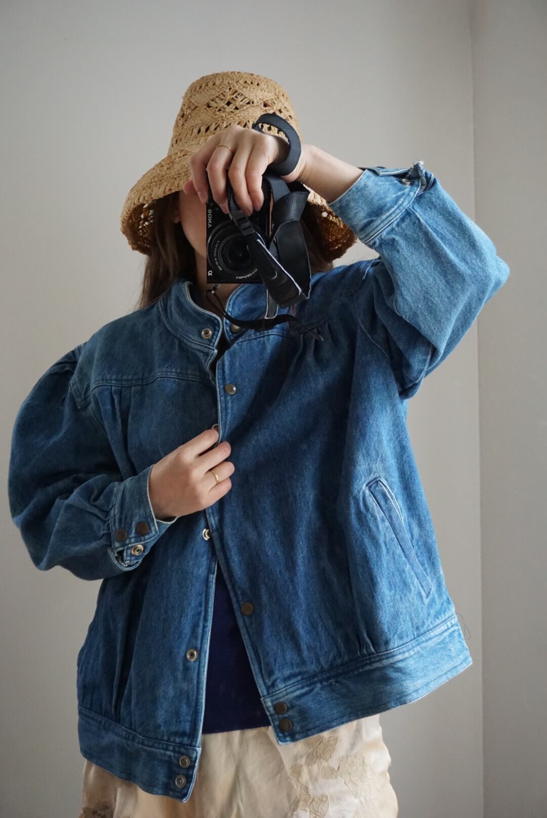 パフスリーブのシルエットが優雅で、デニムの素材感がカジュアルさを引き立てます。シンプルなボトムスやスカートと合わせることで、個性豊かなコーディネートが完成します。