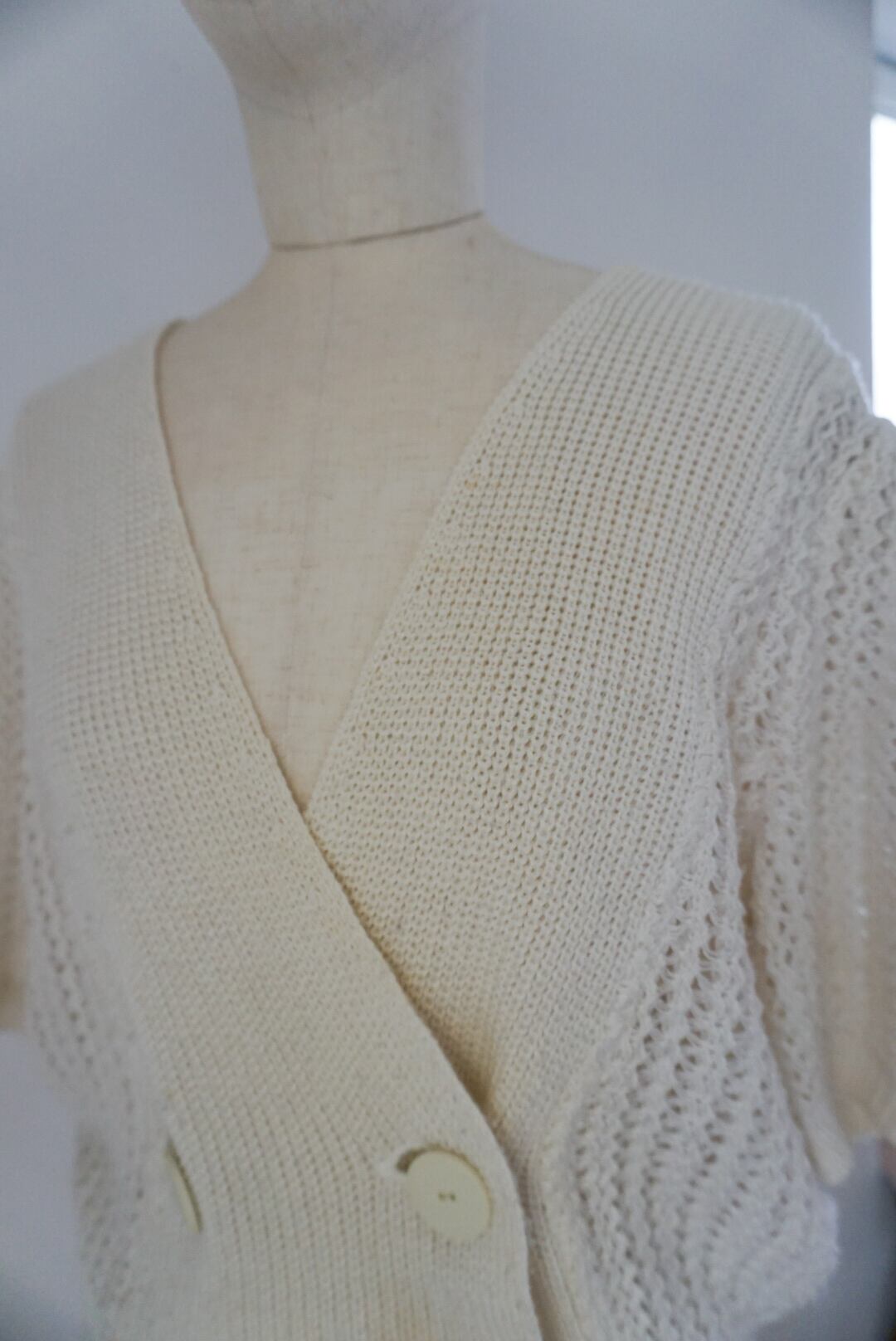 このカーディガンは、クラシックなホワイトカラーに、ダブルボタンが特徴のデザインで、ソフトなニット素材が心地よい着心地です。
