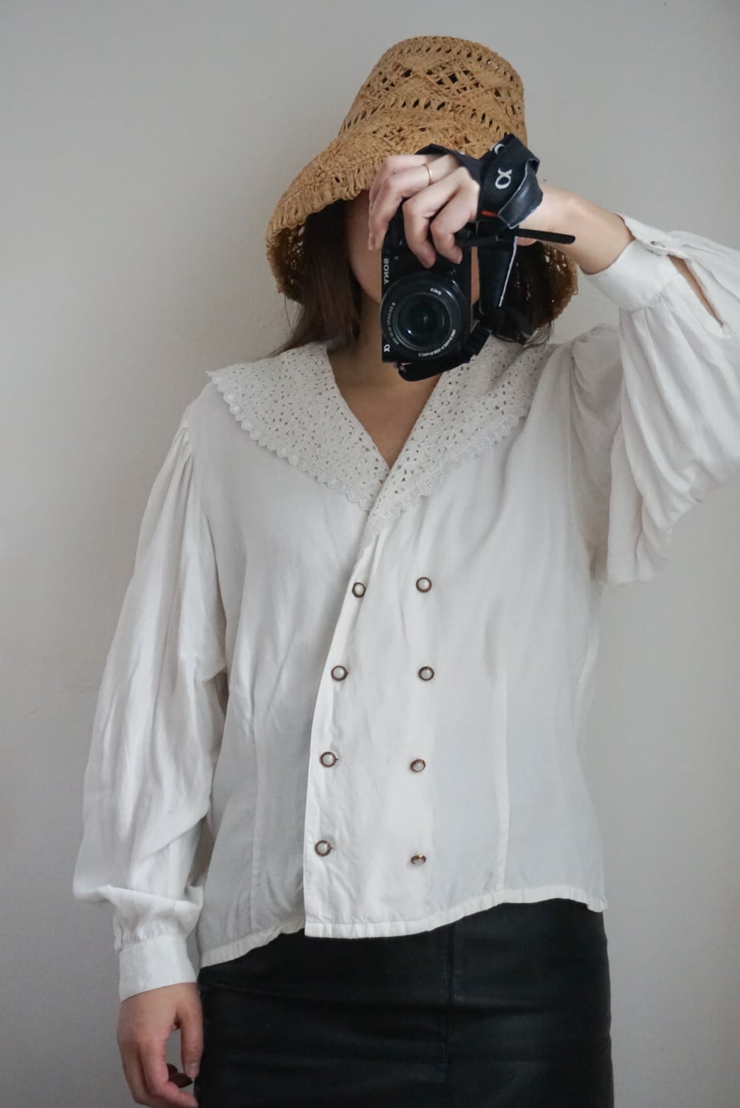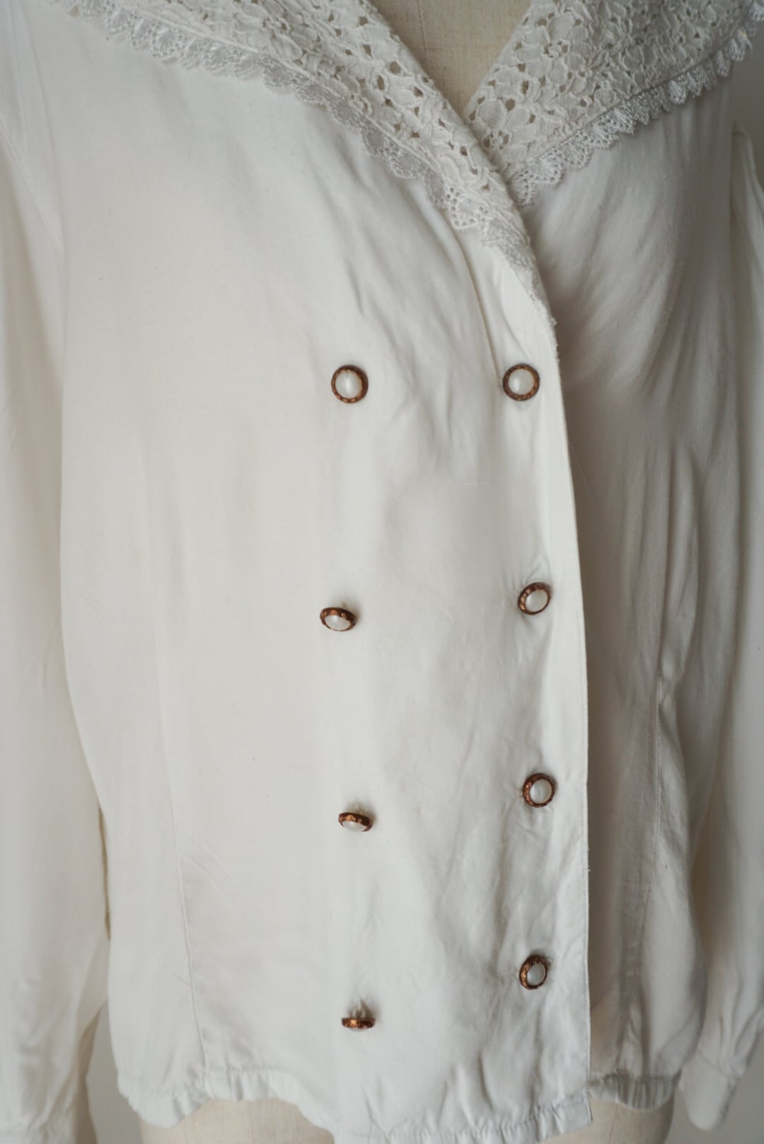 このブラウスは、1990年代のスタイルを感じさせる清楚なホワイトカラーに、レースの襟が施されたデザインが特徴です。柔らかな素材感が心地よいフィット感を提供し、カジュアルな日常使いから特別なシーンまで、多彩なコーディネートで活躍します。