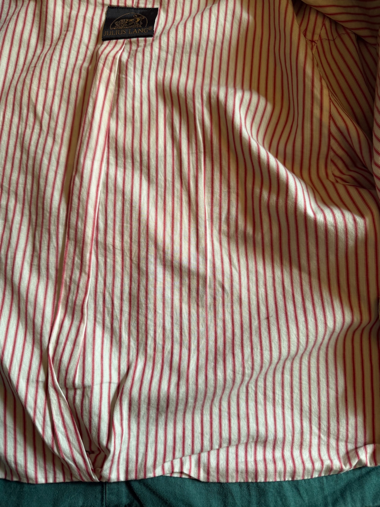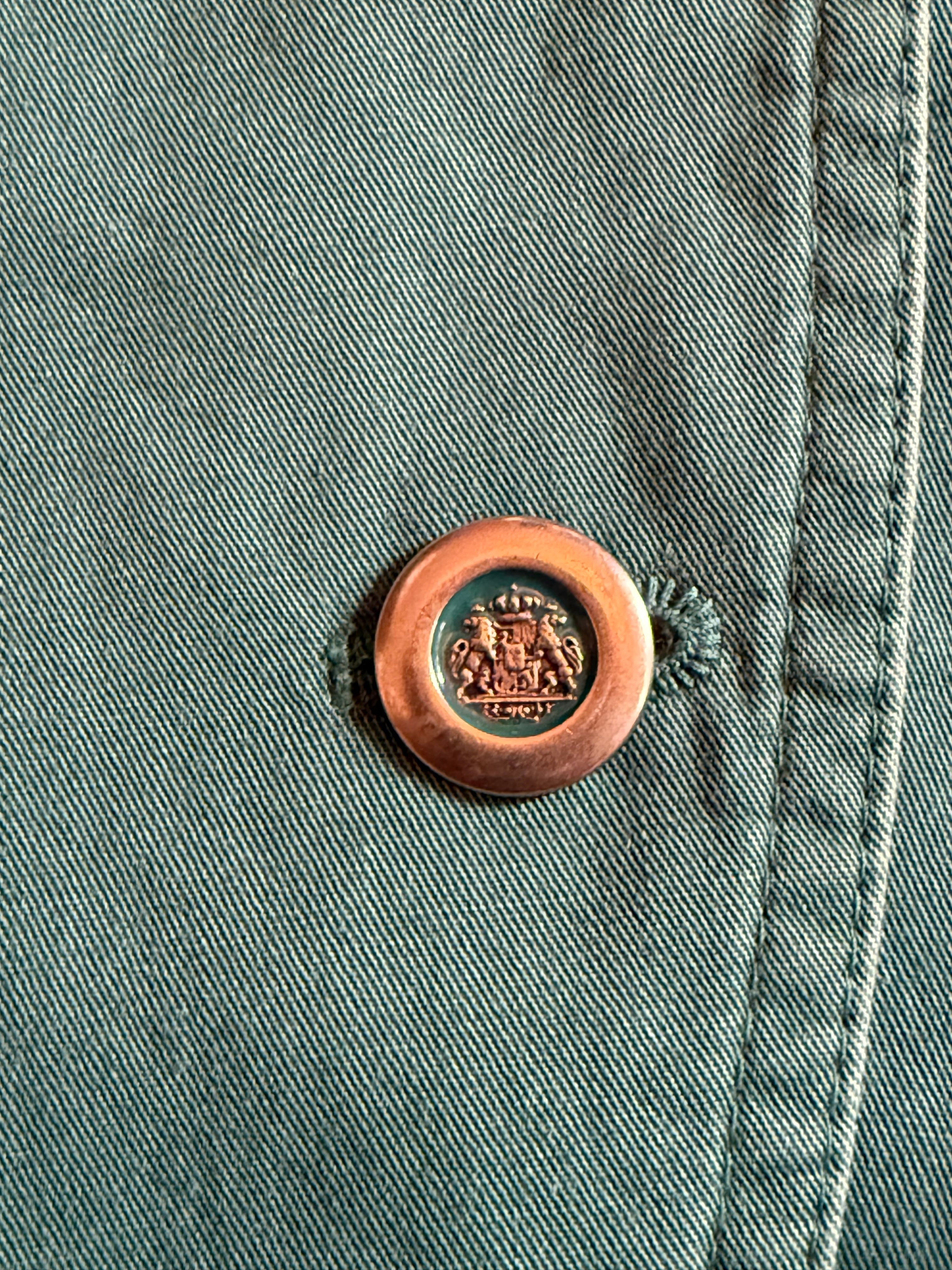 特にこのジャケットの裏地には遊び心のあるストライプがあり、袖を折り返すことでアクセントを楽しむことができます。ボタンもとても個性的です。