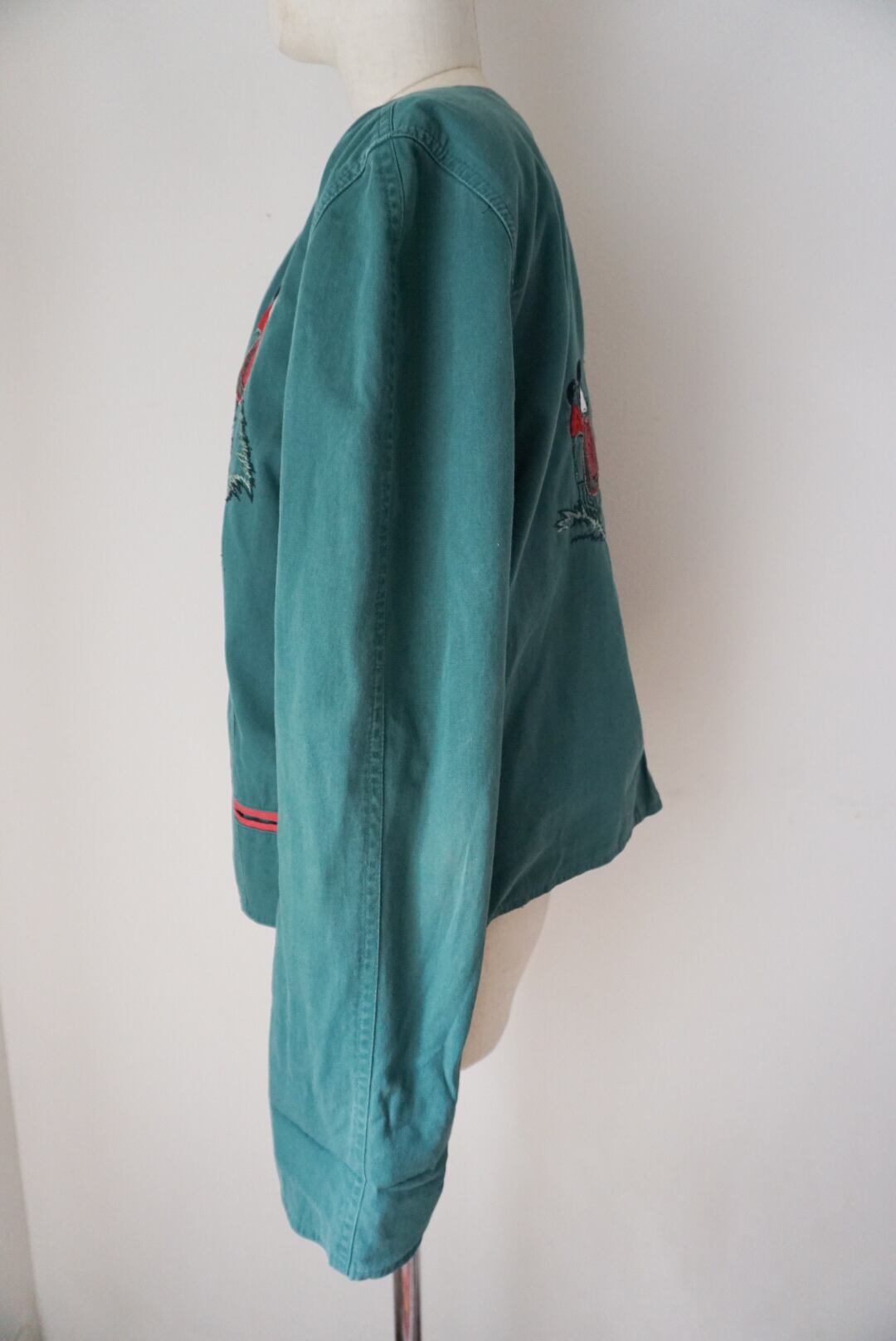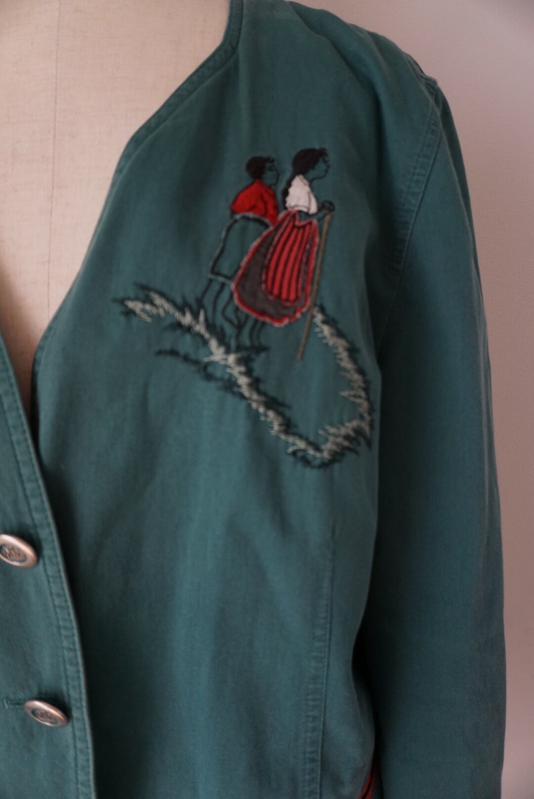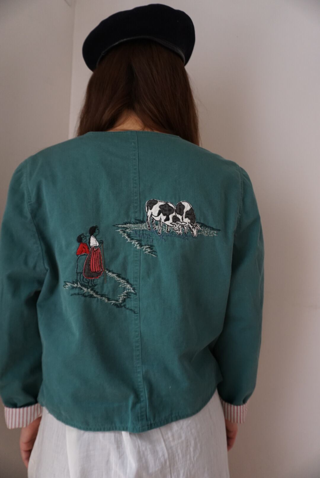 このジャケットは、鮮やかなグリーンカラーにユニークな刺繍が施されたデザインが特徴です。素材感がとても心地よい着心地です。