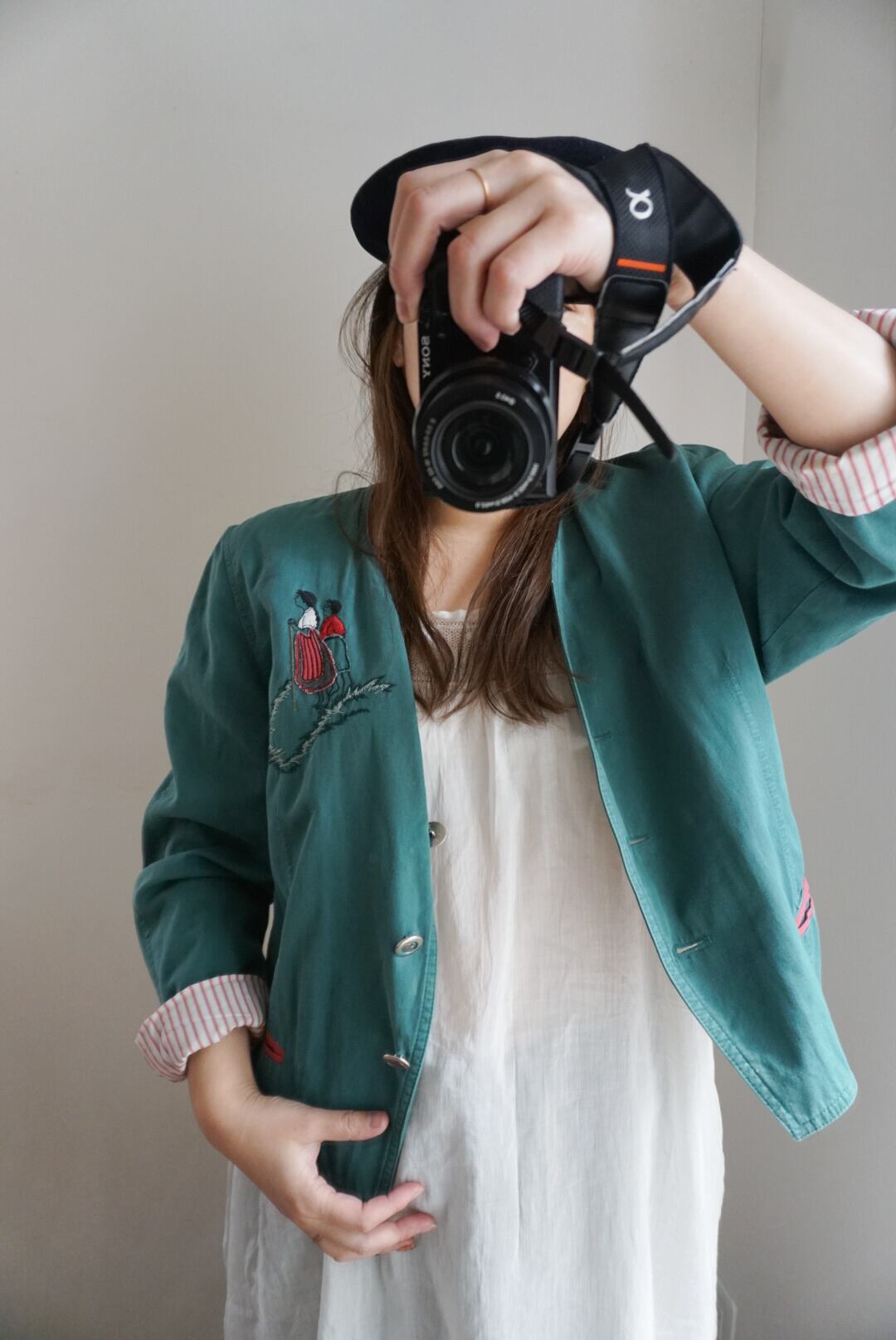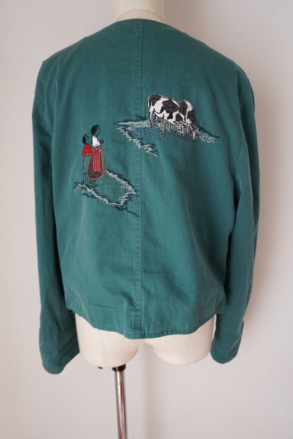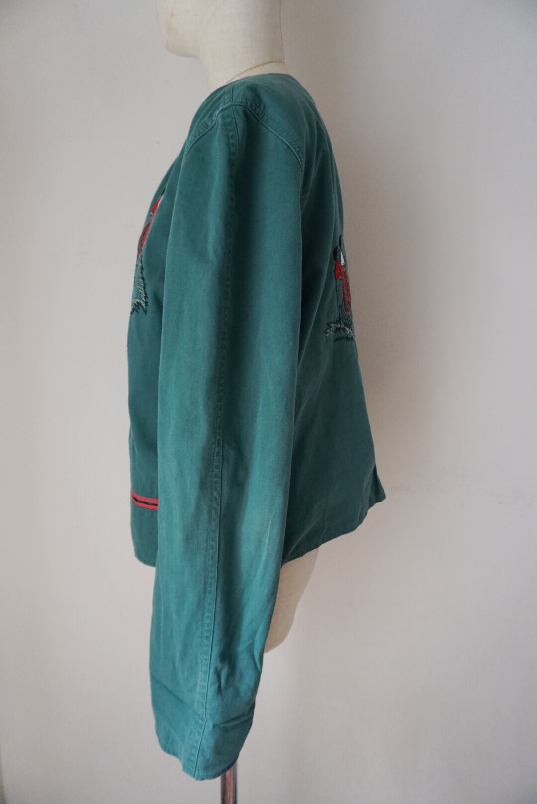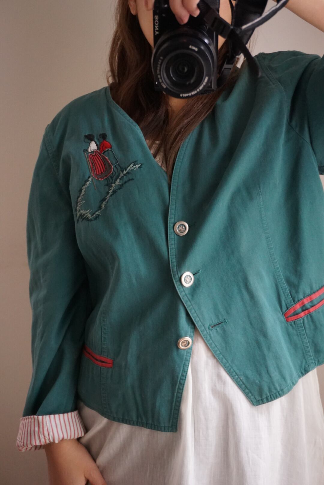 このジャケットは、鮮やかなグリーンカラーにユニークな刺繍が施されたデザインが特徴です。素材感がとても心地よい着心地です。