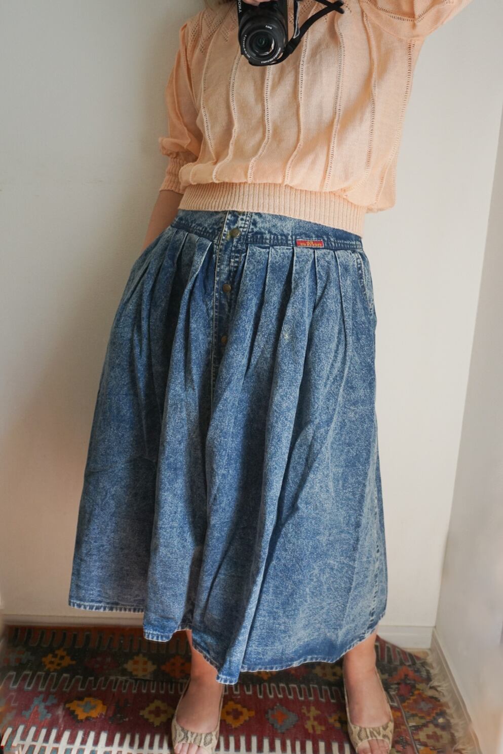 ユニークなデニムディテールが施されたこのスカートは、シンプルなトップスやブラウスとの組み合わせで洗練された印象を与えます。ウエストの切り替えしがガーリーでかわいいです。