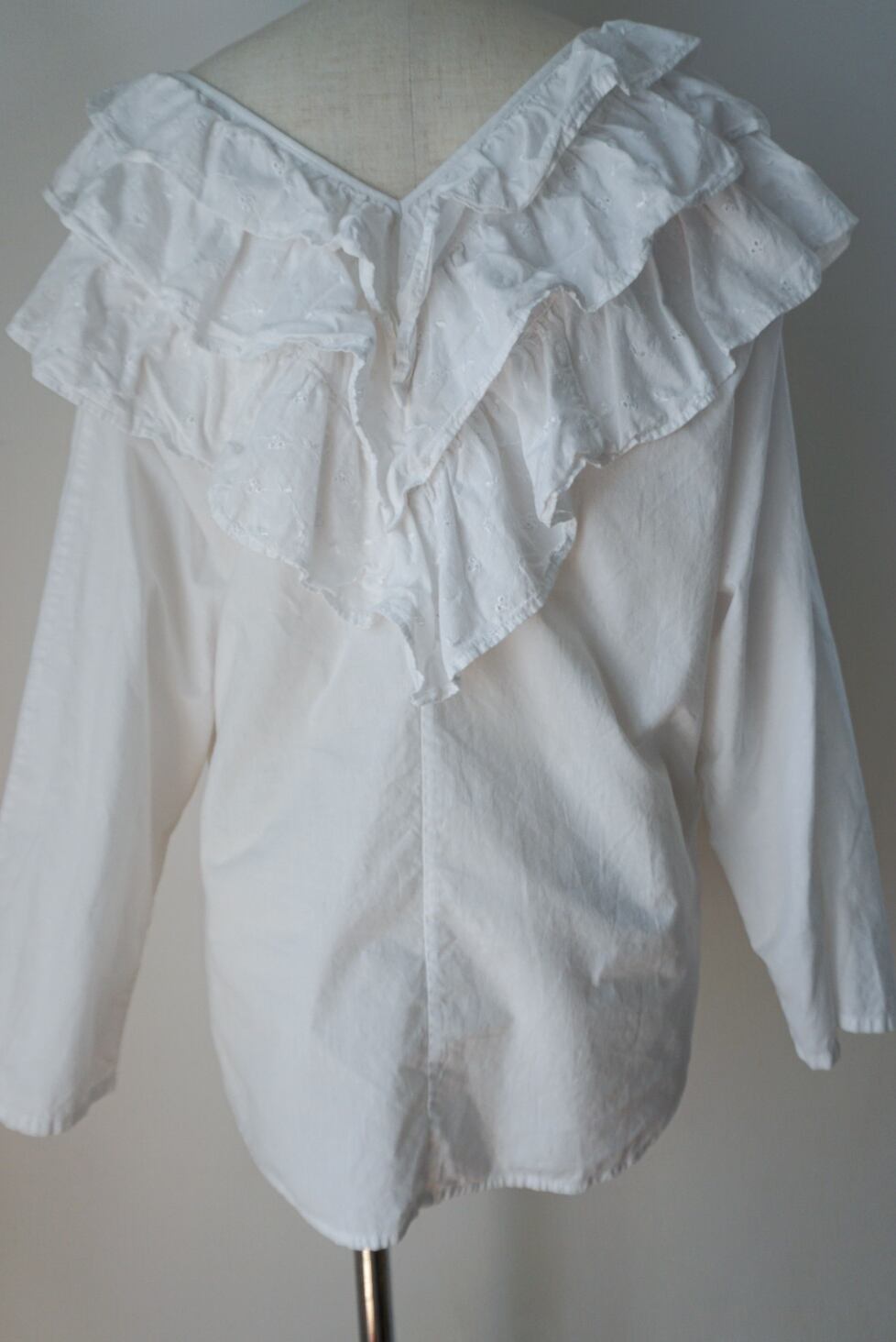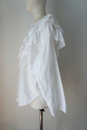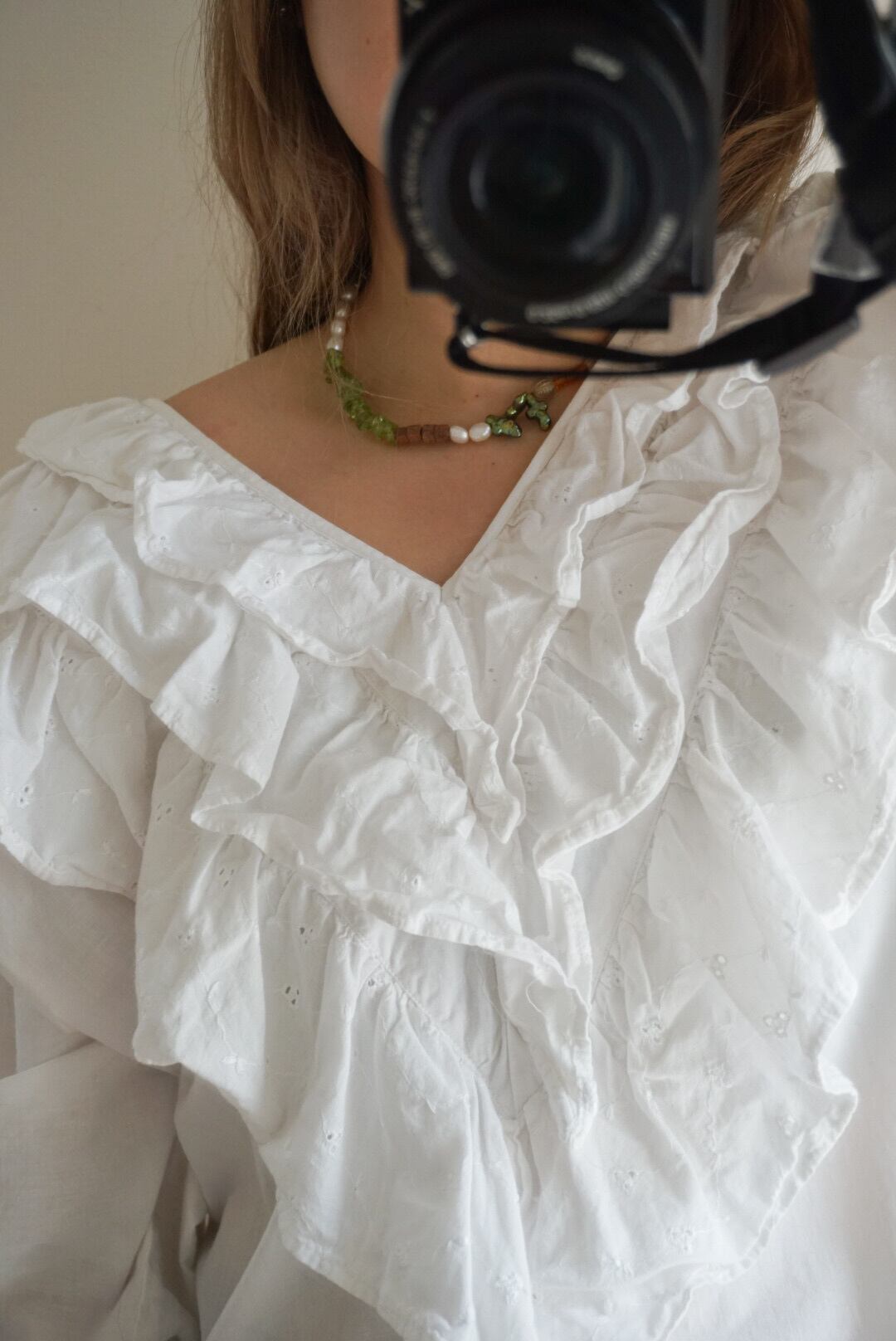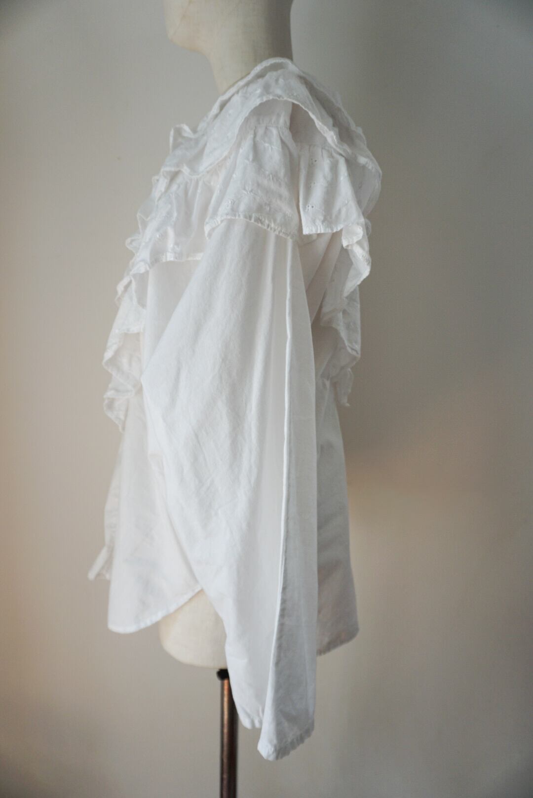 このトップスは、エレガントなホワイトカラーに、魅力的なレースが施されたデザインが特徴です。軽やかな素材感が心地よく、カジュアルからフォーマルまで幅広いスタイルでのコーディネートに活躍します。