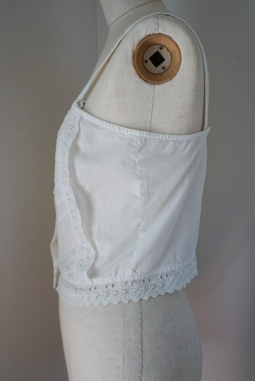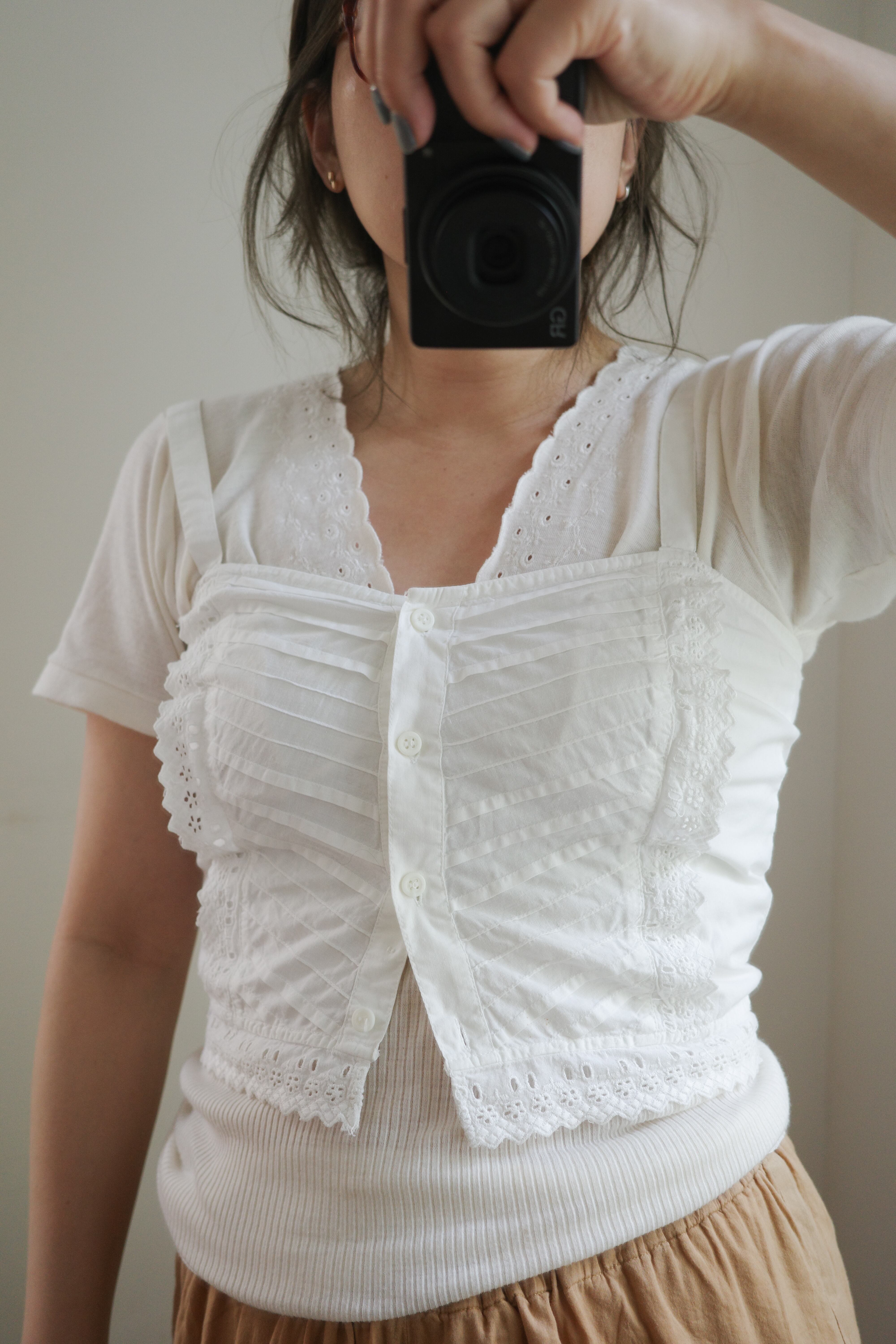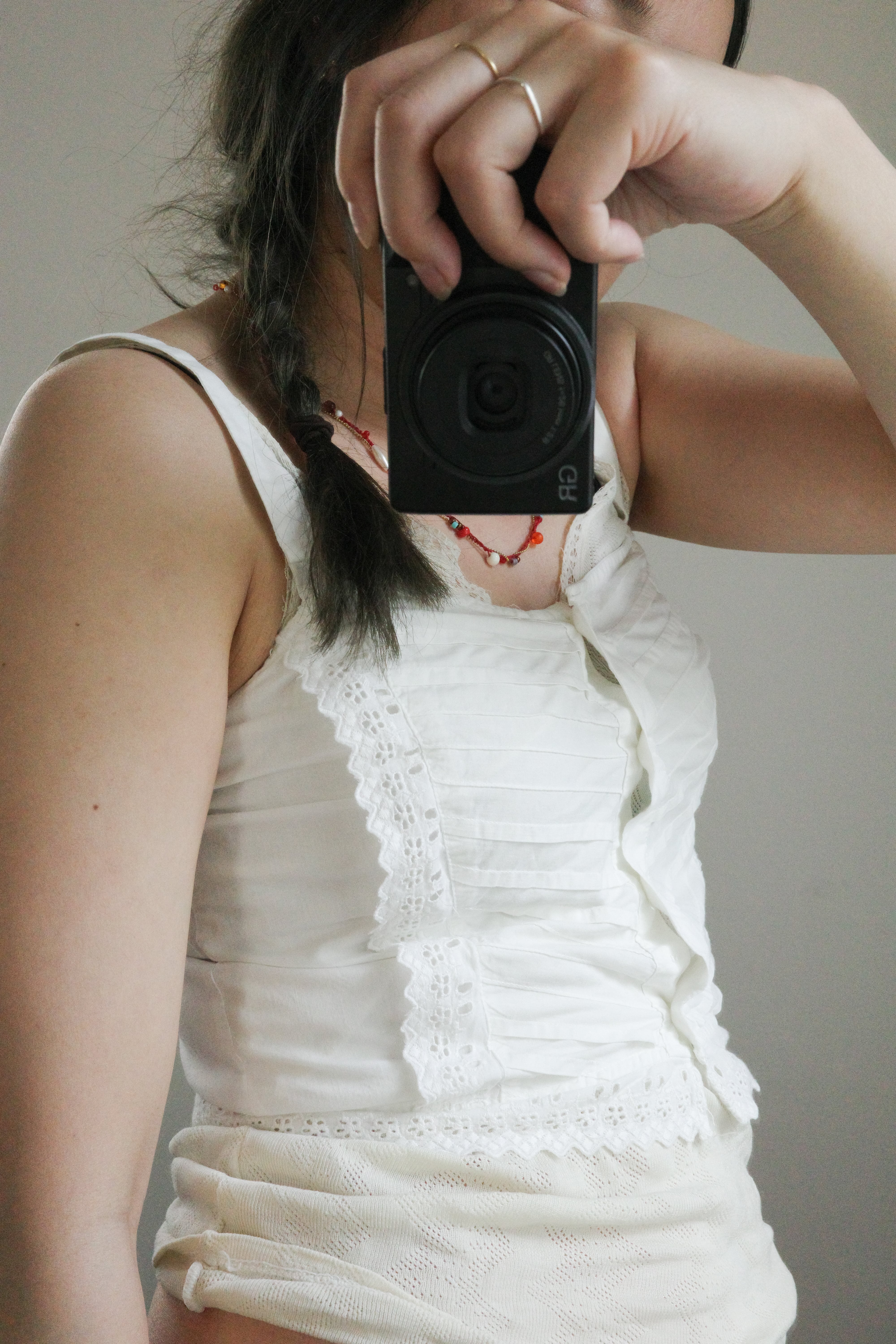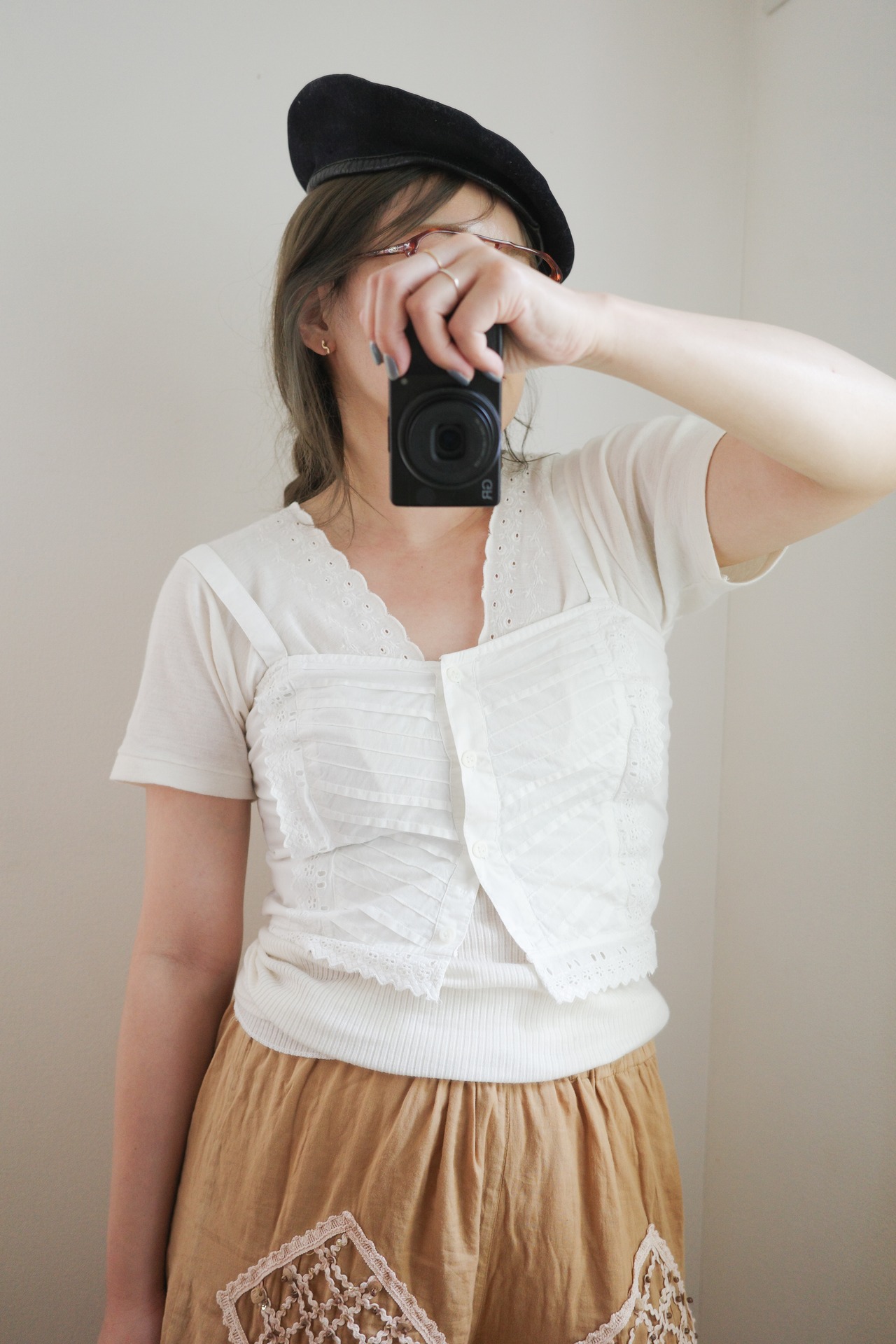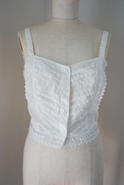 このキャミソールは、ヴィンテージ感あふれるホワイトのレース仕立てが特徴のアイテムです。柔らかな素材と透け感が心地よく、カジュアルから特別なシーンまで幅広く対応可能です。リラックスしたシルエットが女性らしさを引き立て、様々なボトムスとのコーディネートが楽しめます。デニムやスカートとの組み合わせが特におすすめです。