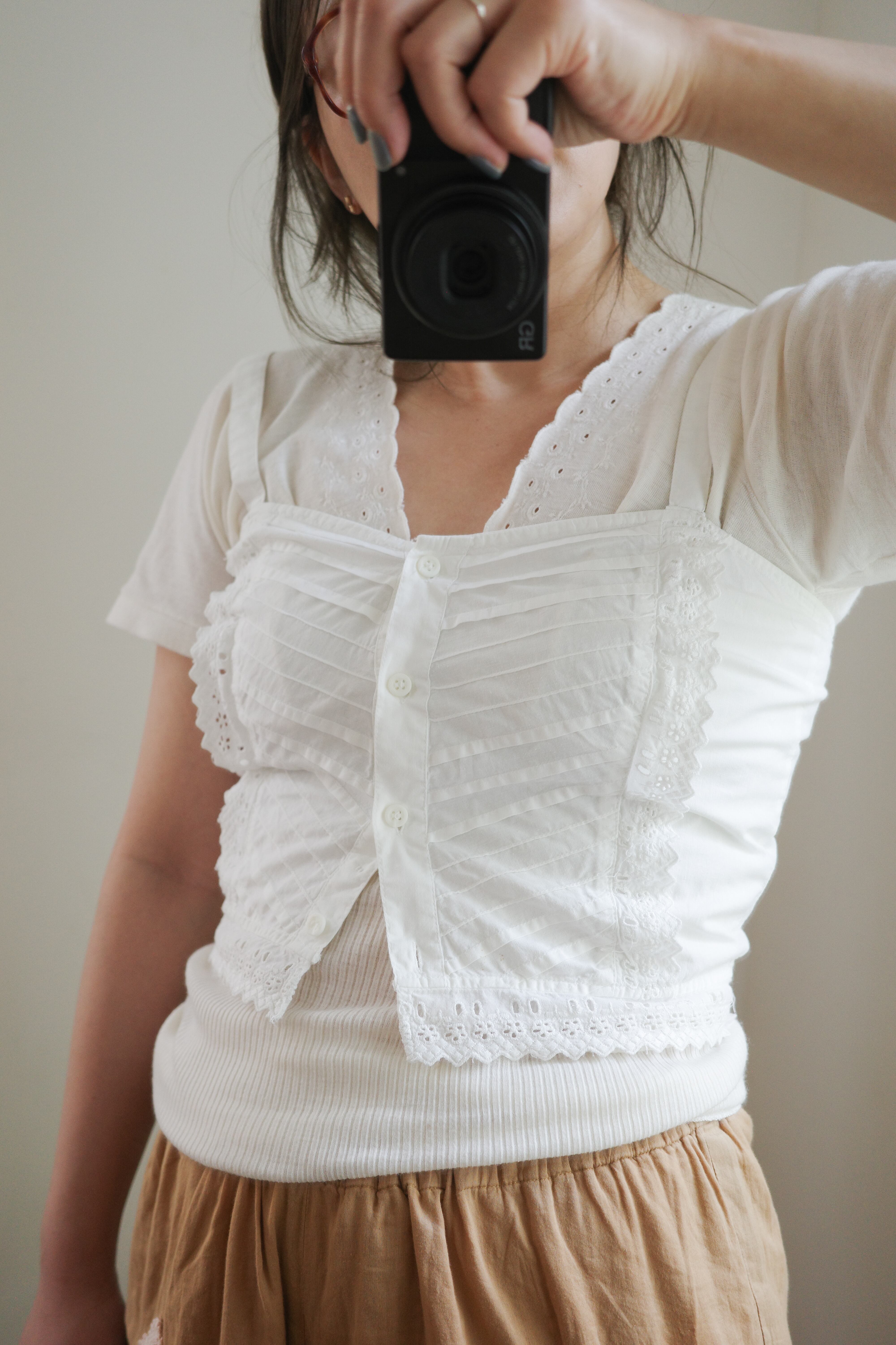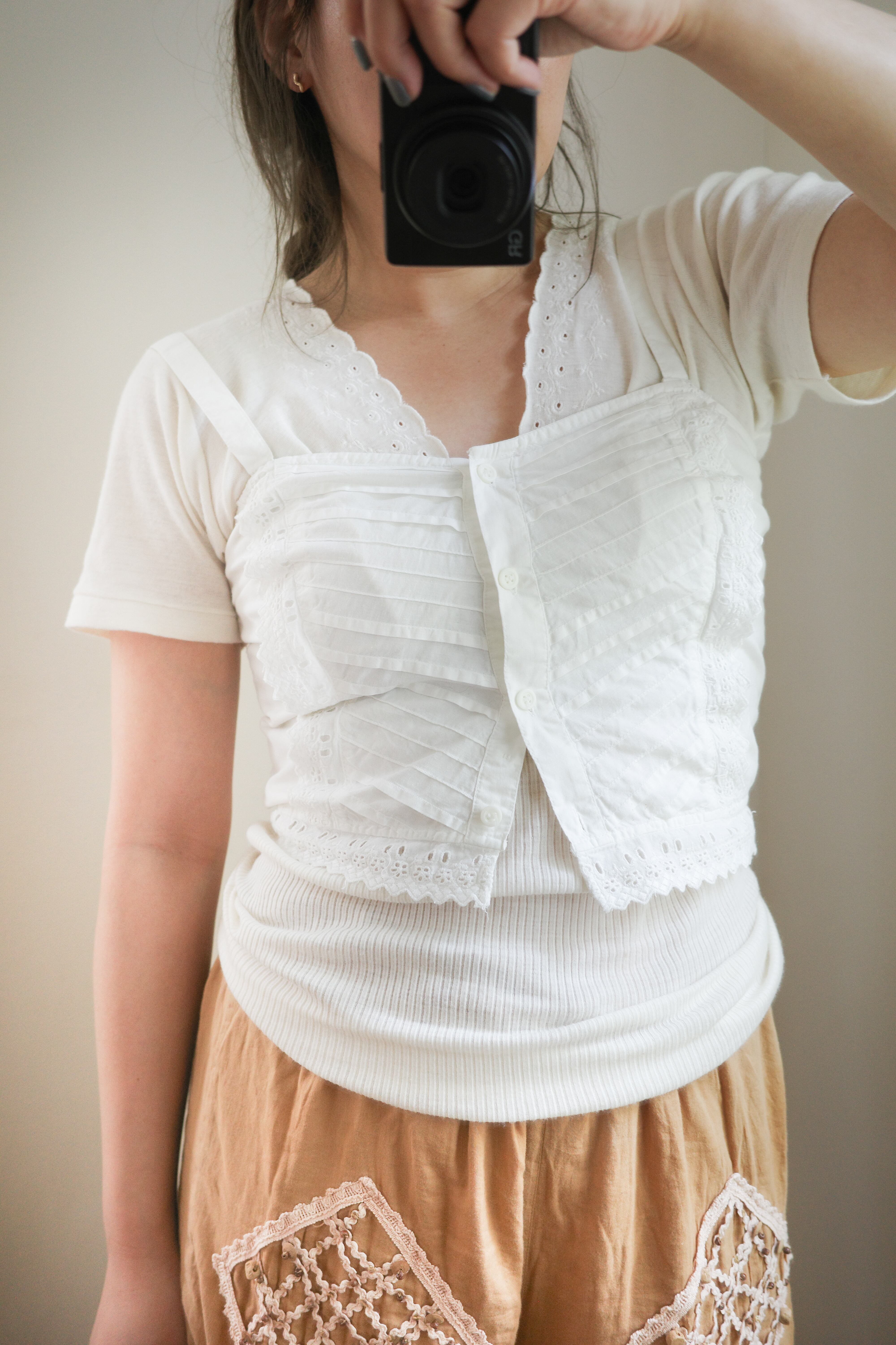 エレガントなレースのディテールがデザインのアクセントとなり、シンプルなスタイルでも華やかさを添えます。これからの季節にぴったりの一枚です。