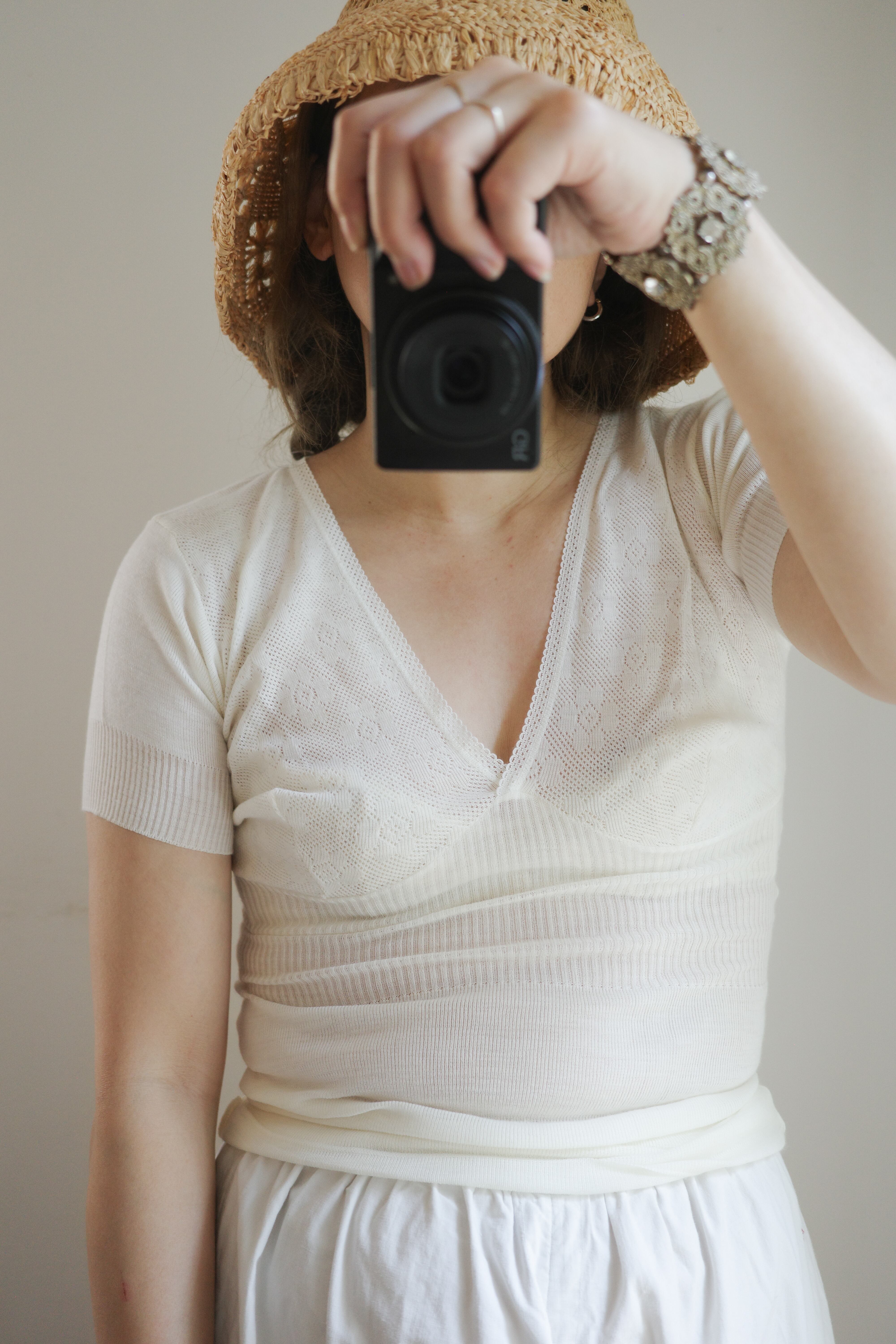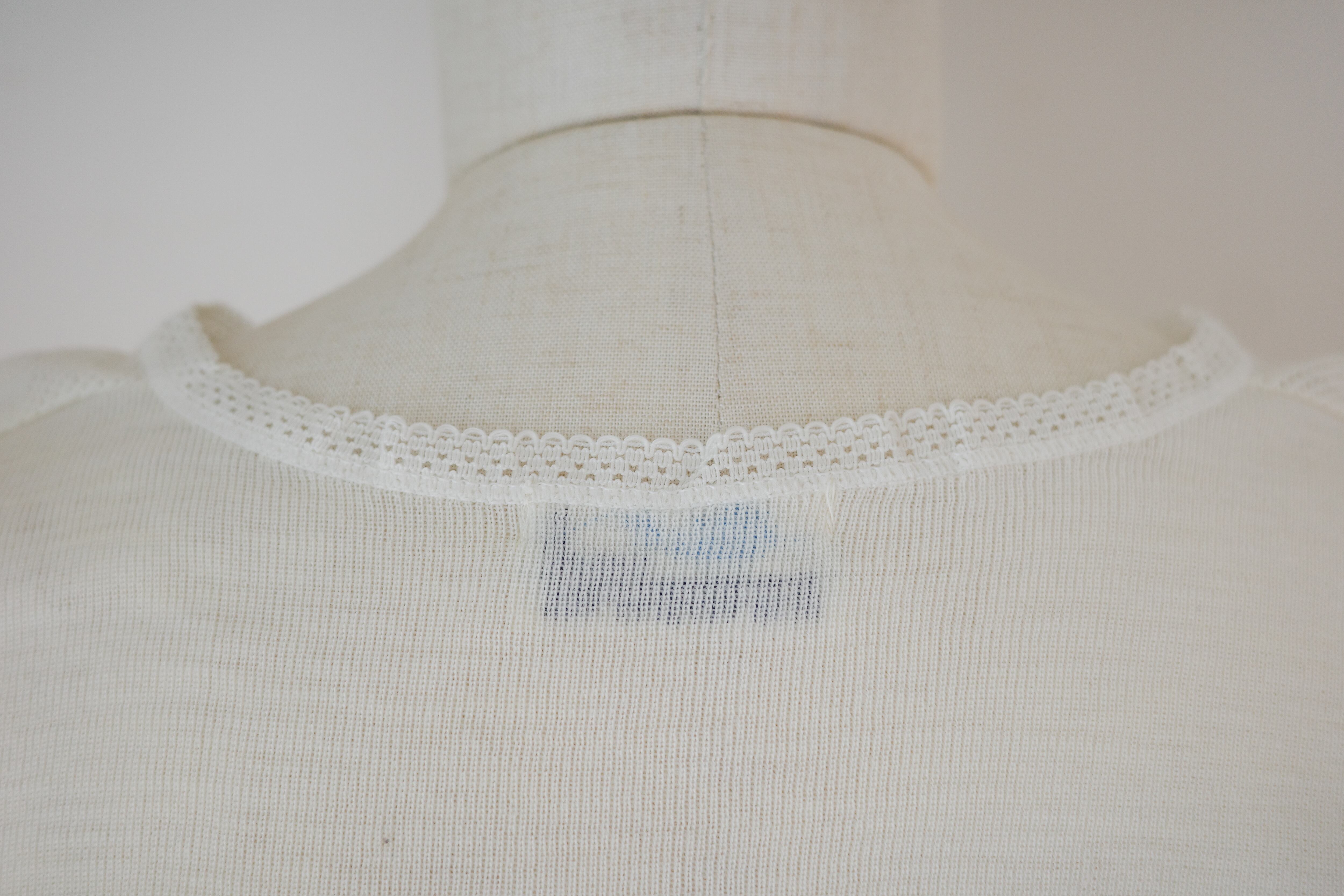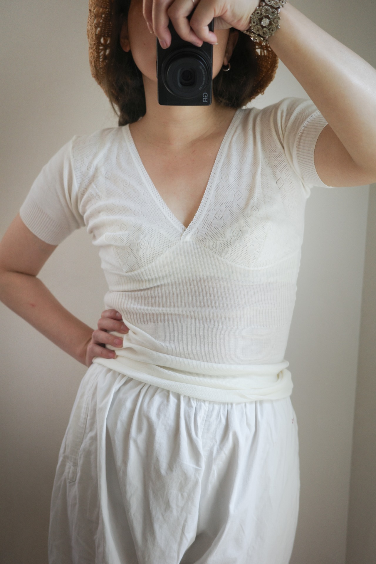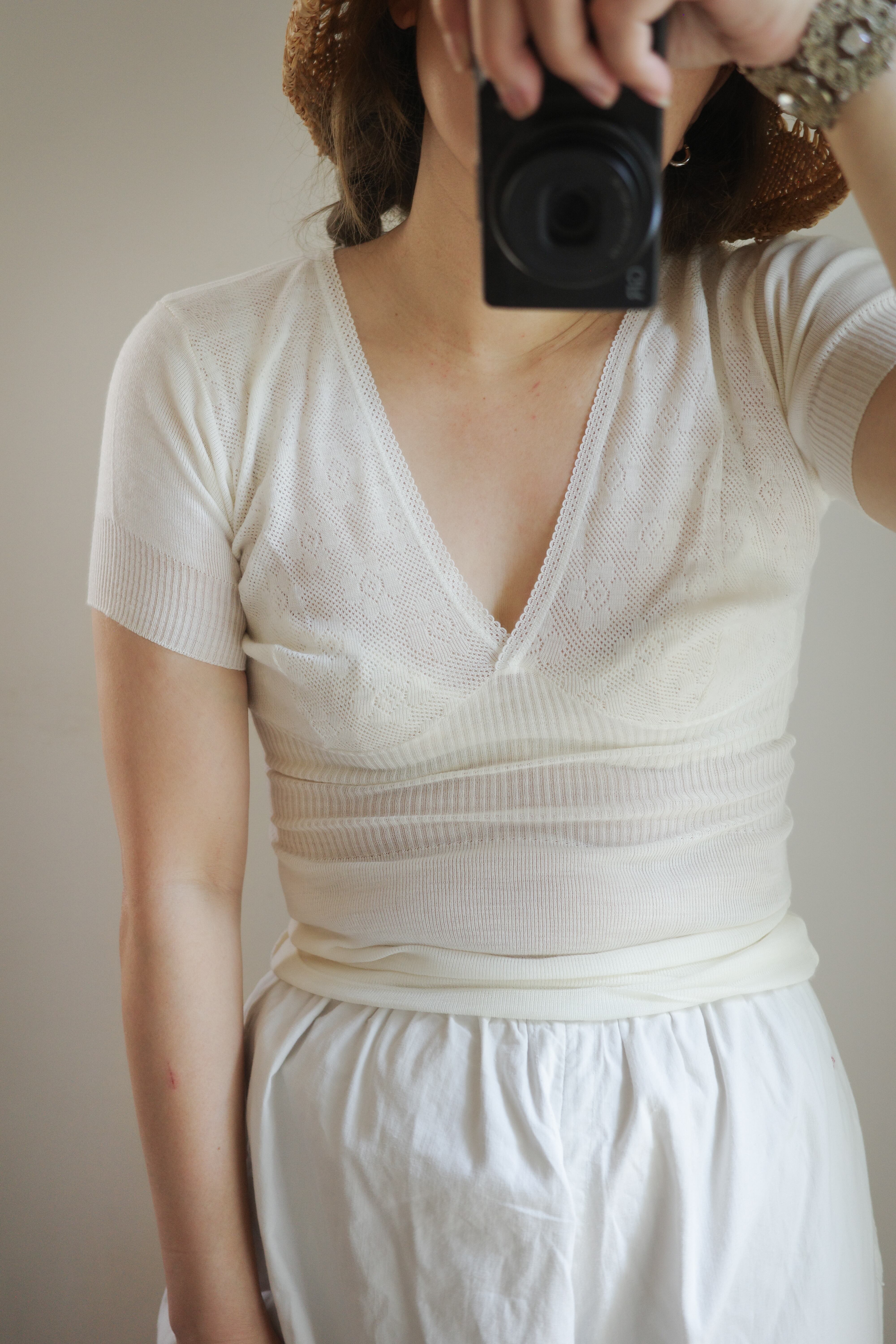 かつてアンダーウエアとして着られていたトップスは、胸元のディティールがとてもガーリーでかわいく誰とも被らないアイテムです。