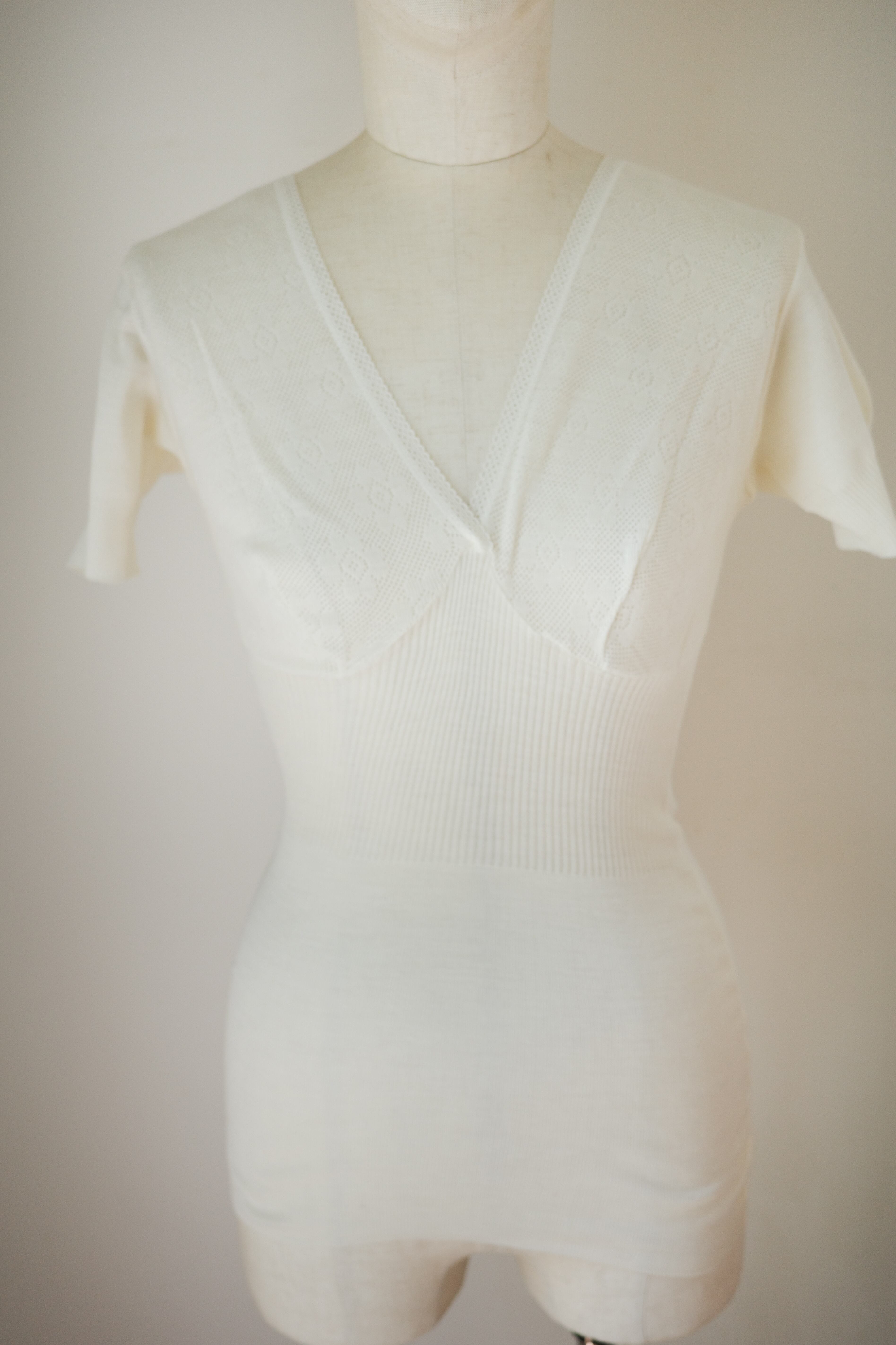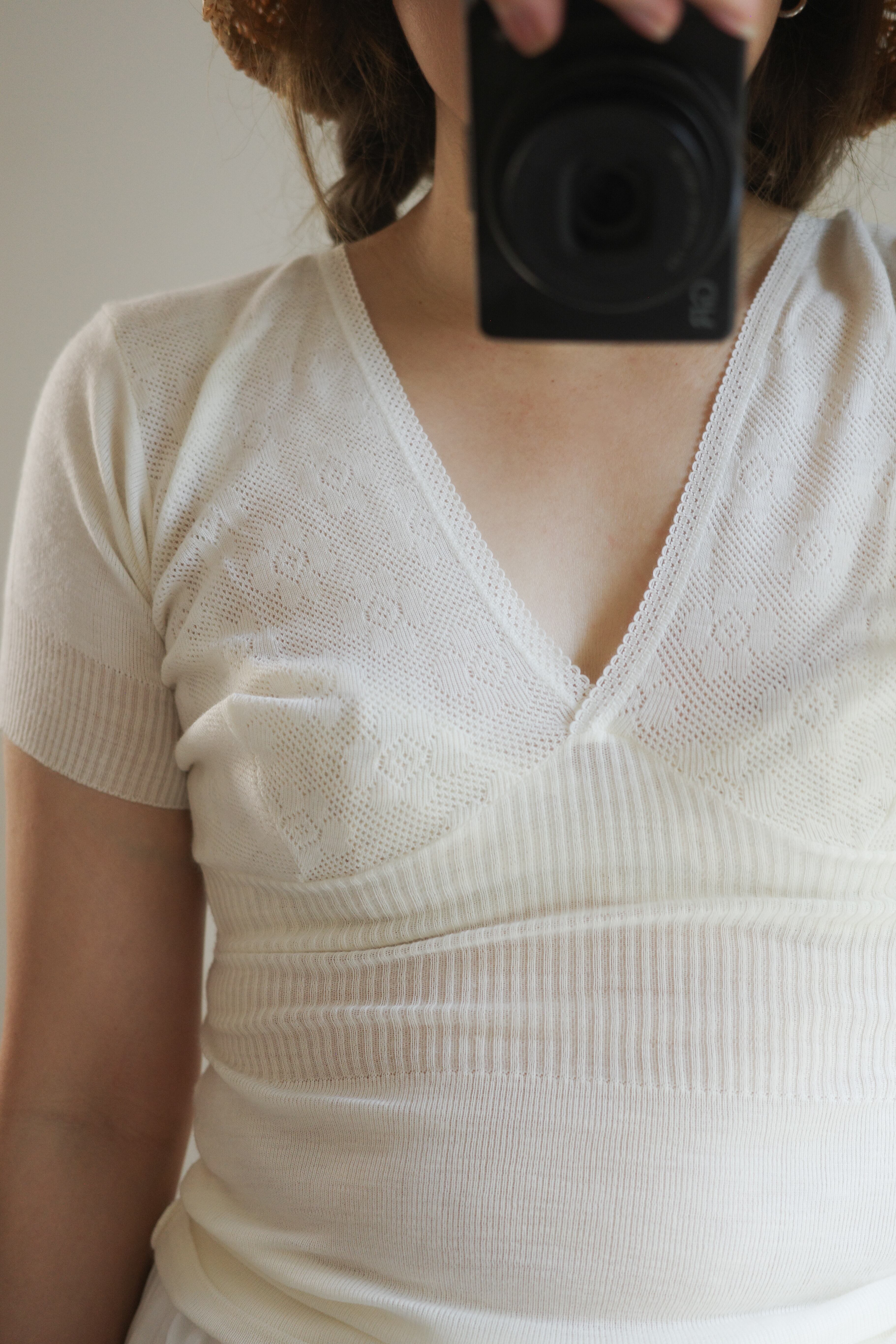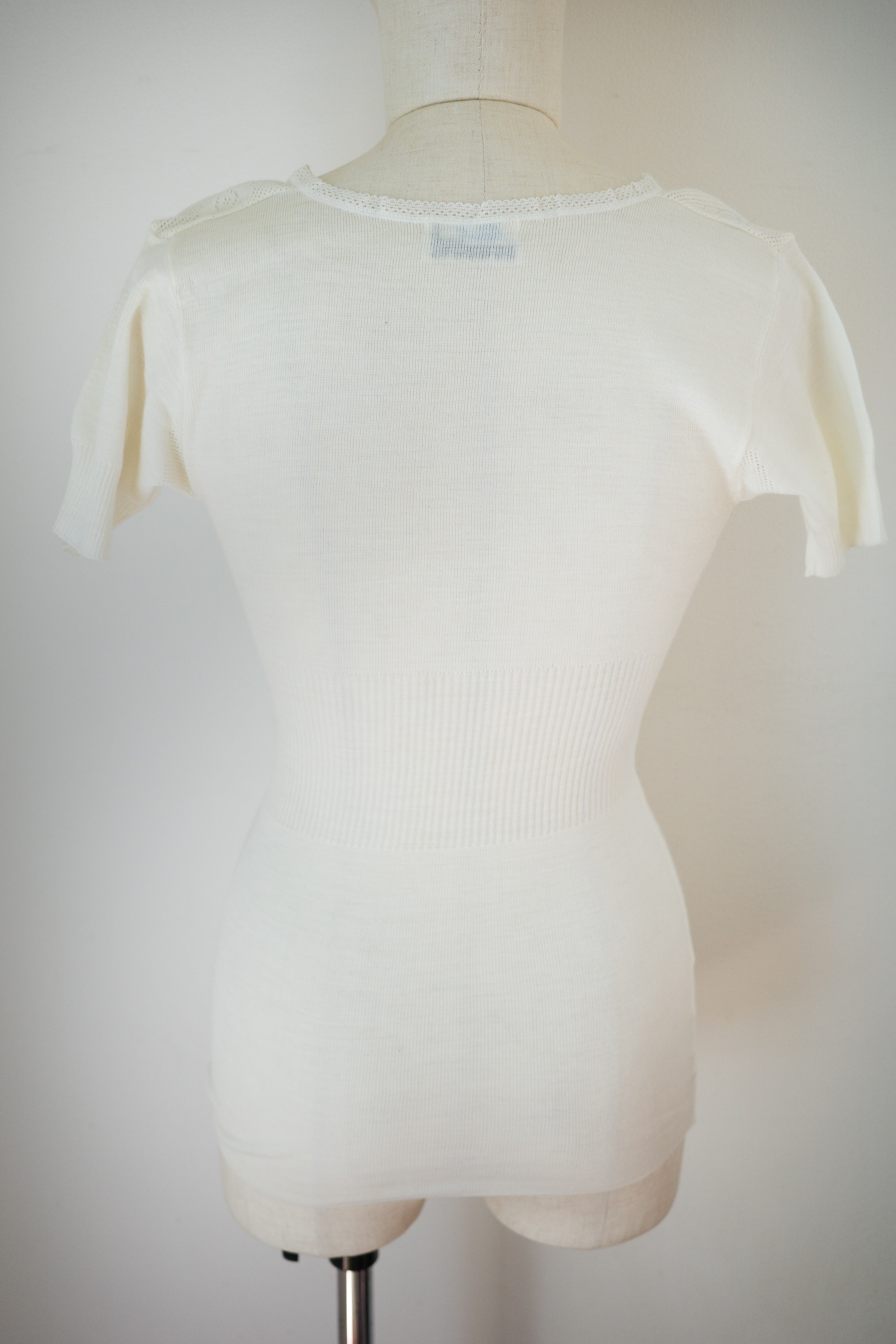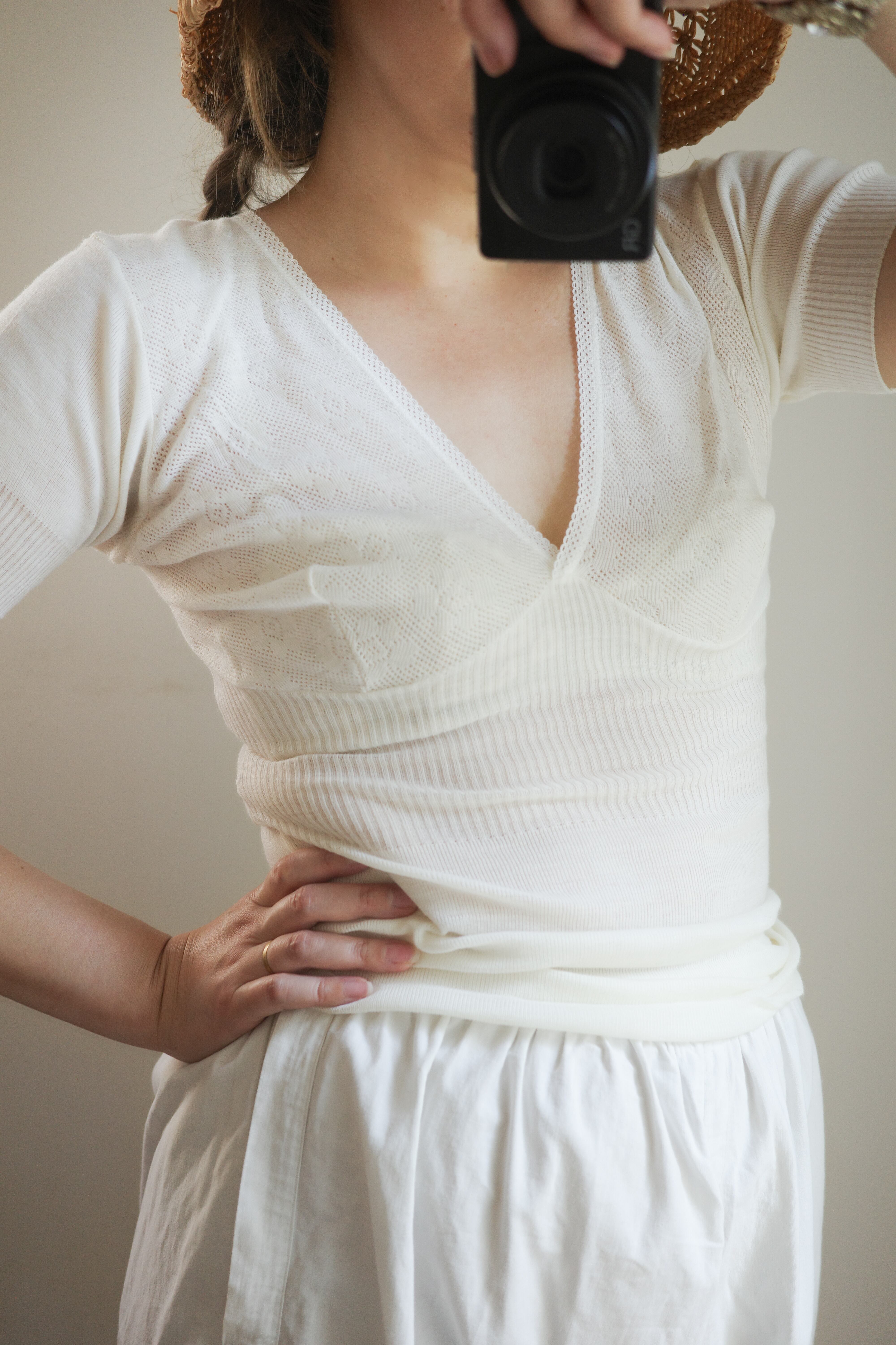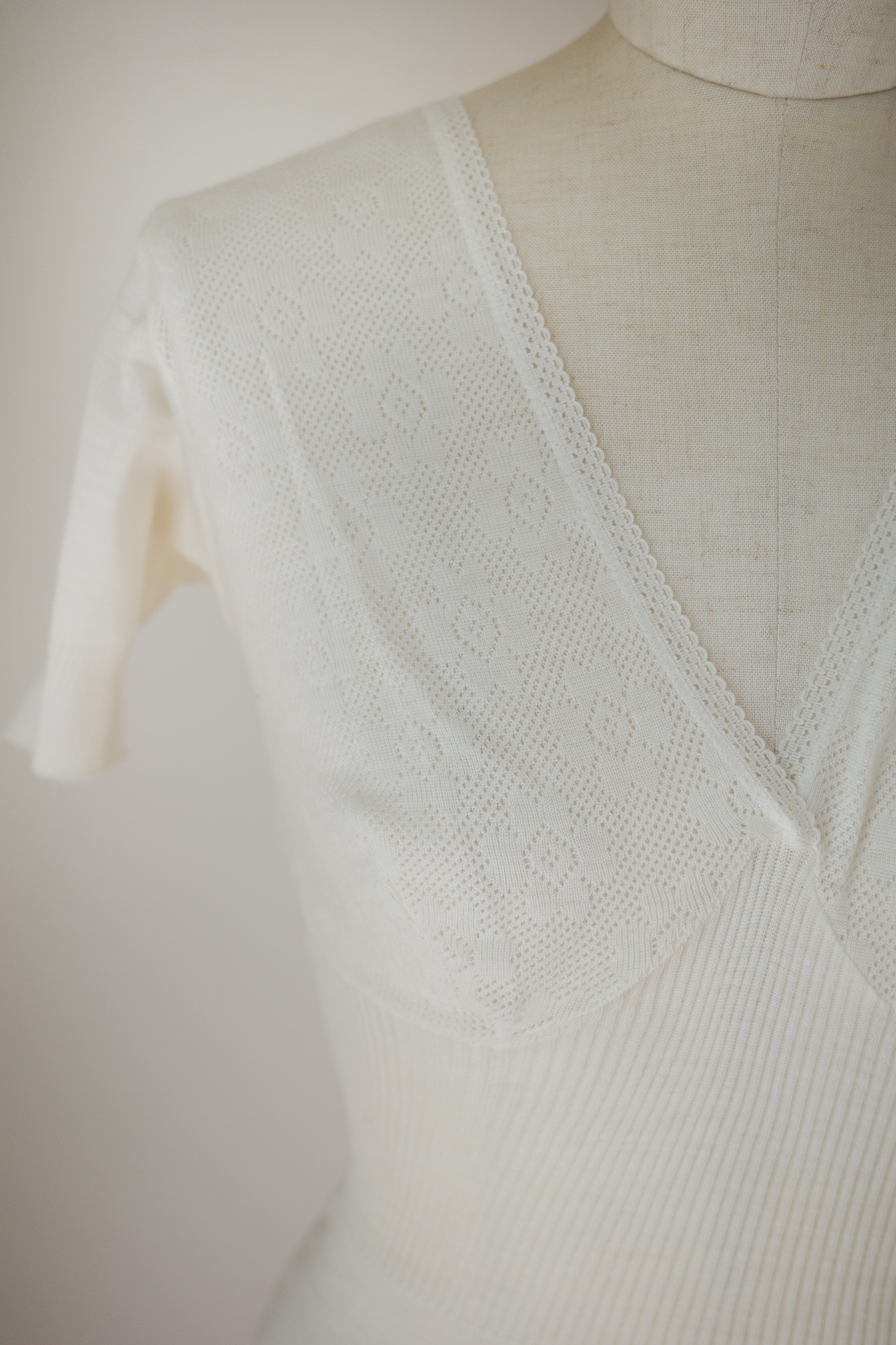 かつてアンダーウエアとして着られていたトップスは、胸元のディティールがとてもガーリーでかわいく誰とも被らないアイテムです。