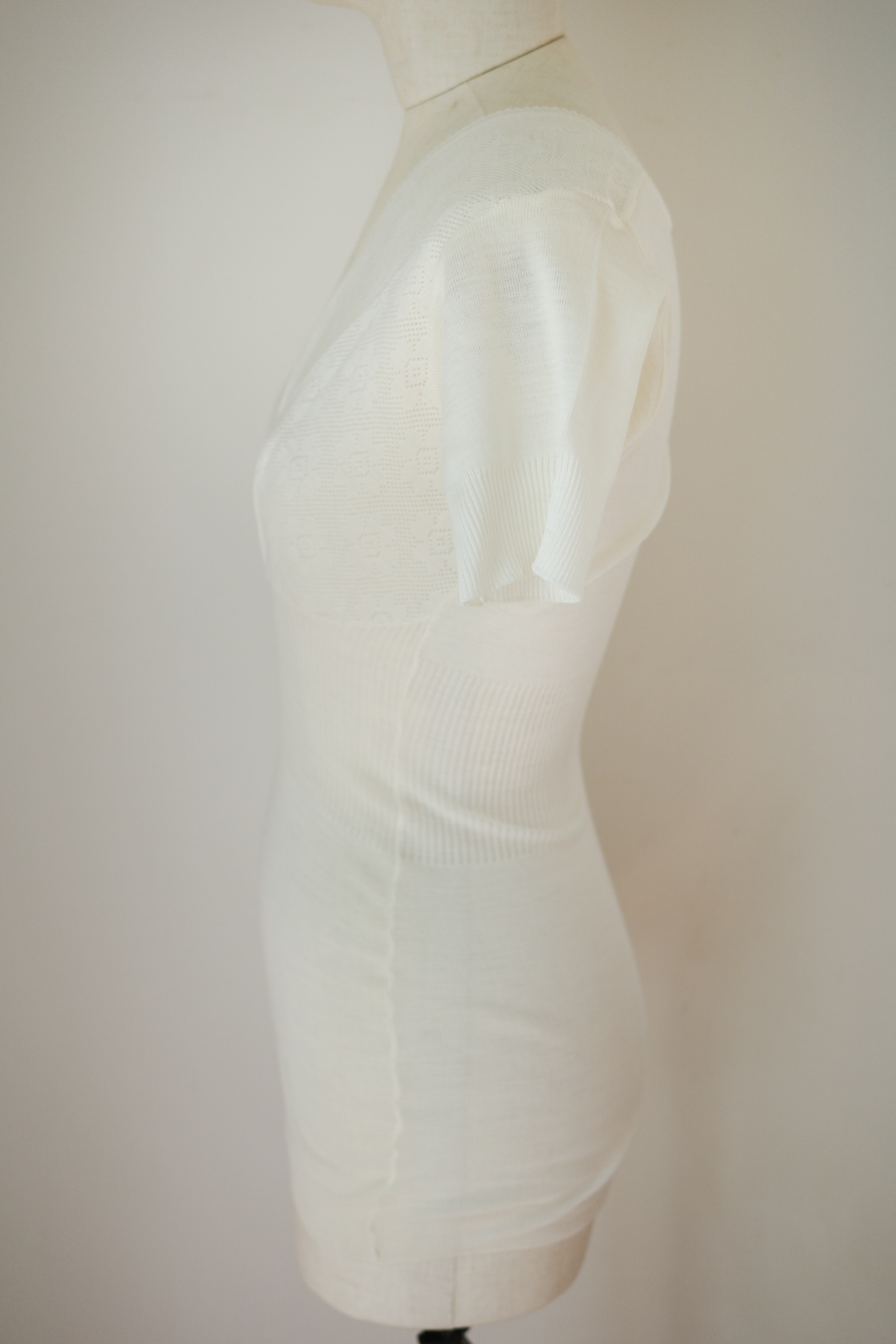 このアンダーウエアトップは、ヴィンテージ感あふれるホワイトコットン素材を使用した魅力的な一枚です。柔らかな手触りと軽やかなフィット感が心地よく、涼しげで普段使いから特別なシーンまで幅広く楽しむことができます。女性らしいラインがしっかりと引き立ち、さまざまなボトムスとのコーディネートが自在です。