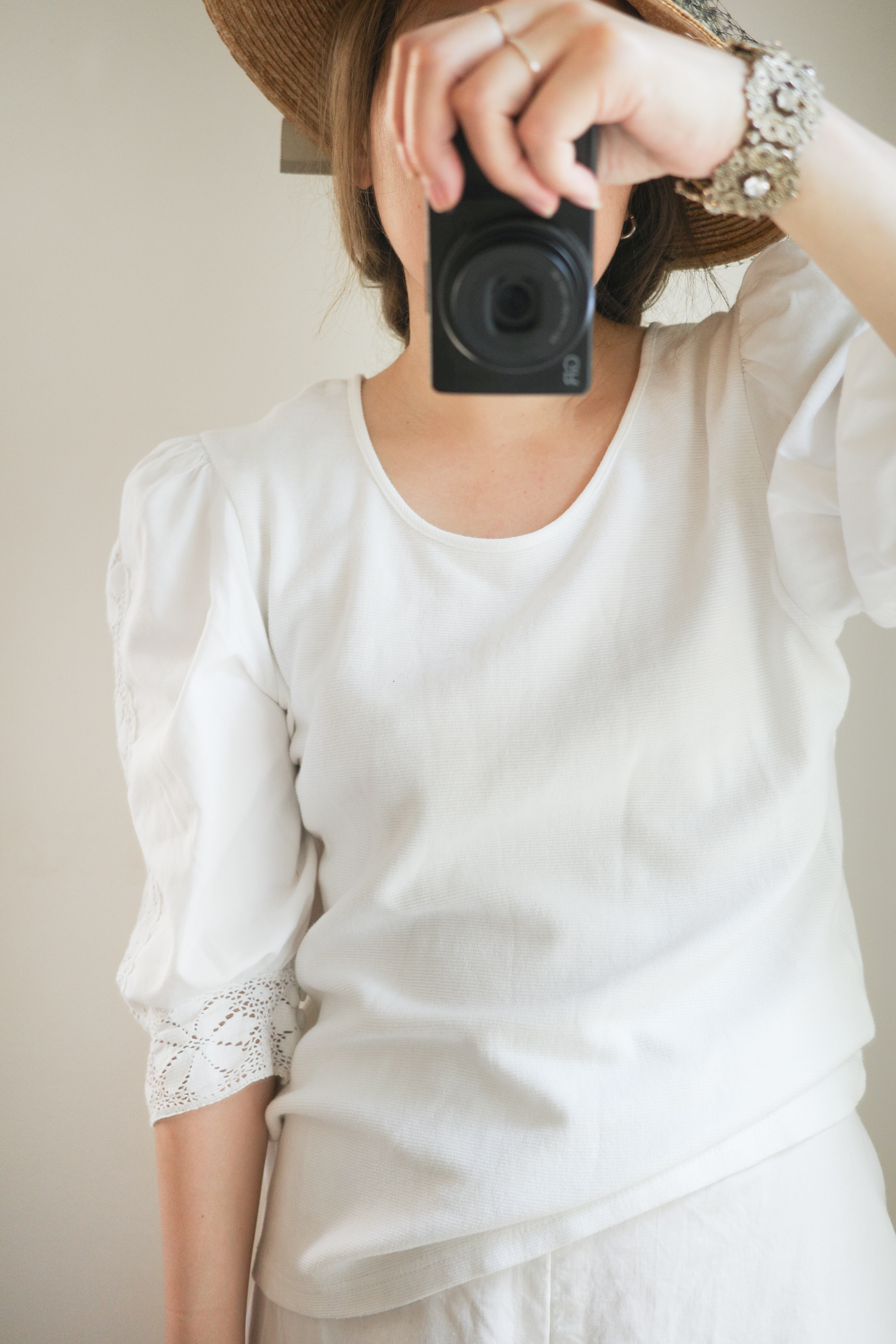 特に春夏の季節には、軽やかに着こなすことができ、デイリーユースにもぴったりのアイテムです。このトップスは、袖の素材は固めのコットンで袖以外は伸縮性のある柔らかい素材です。