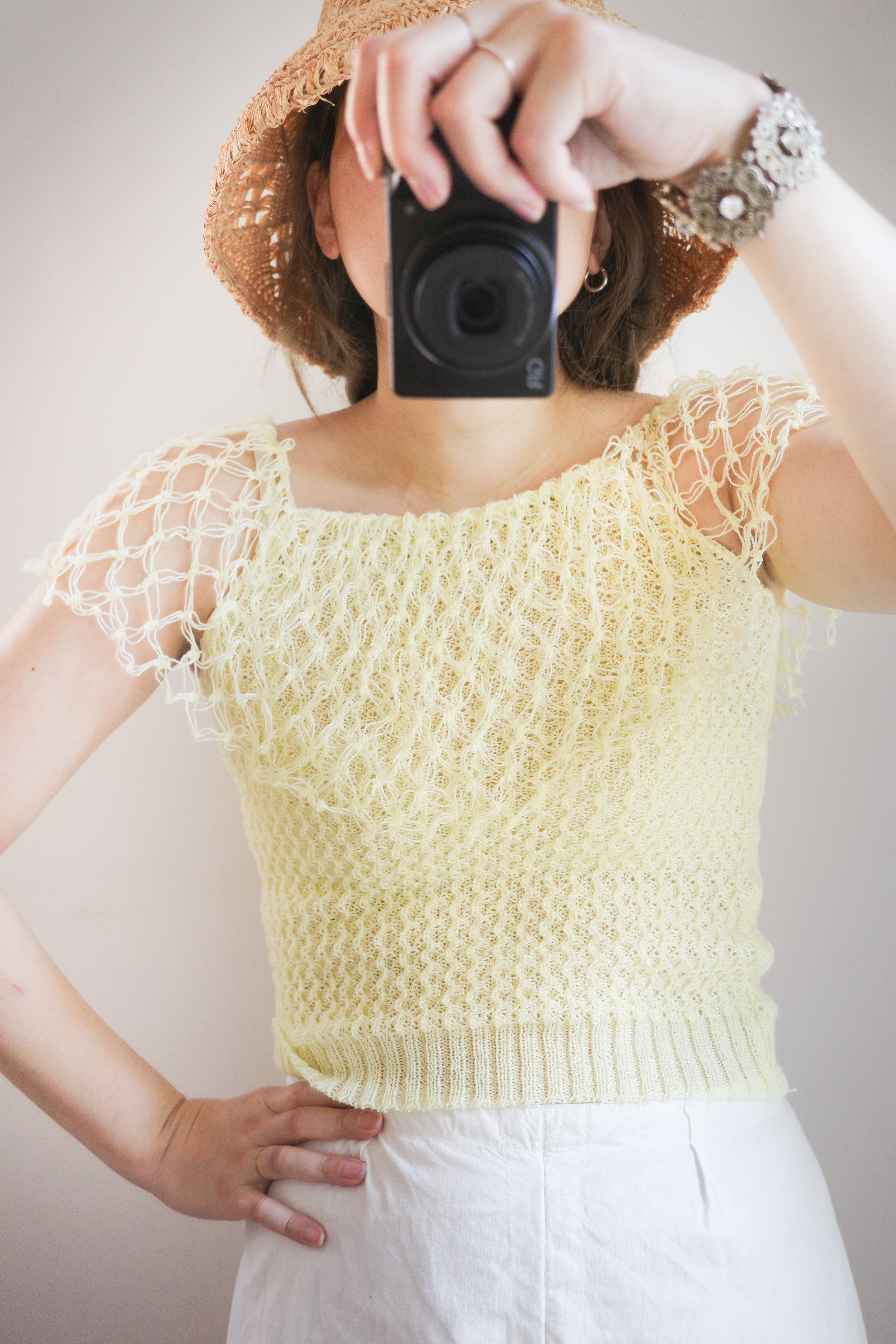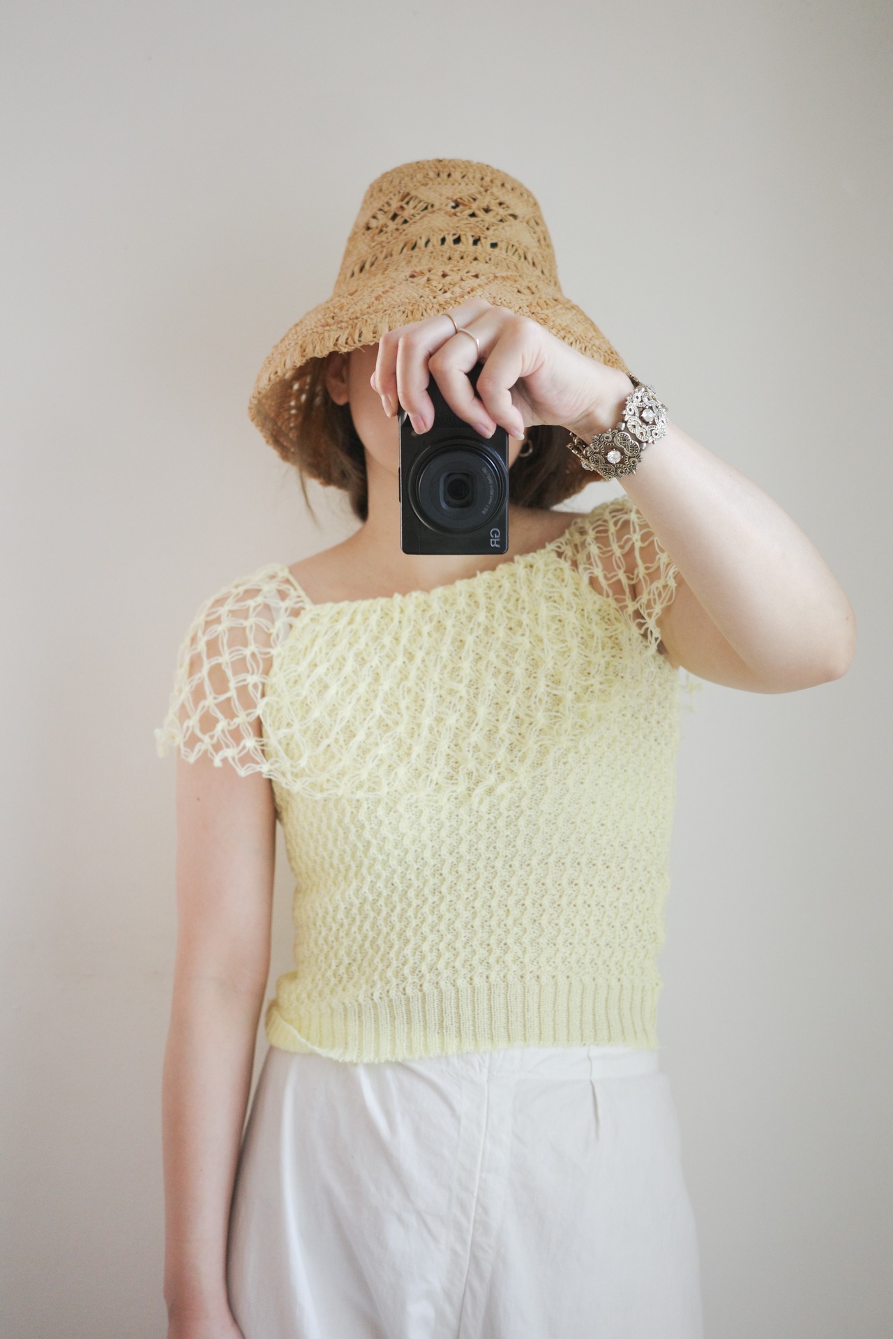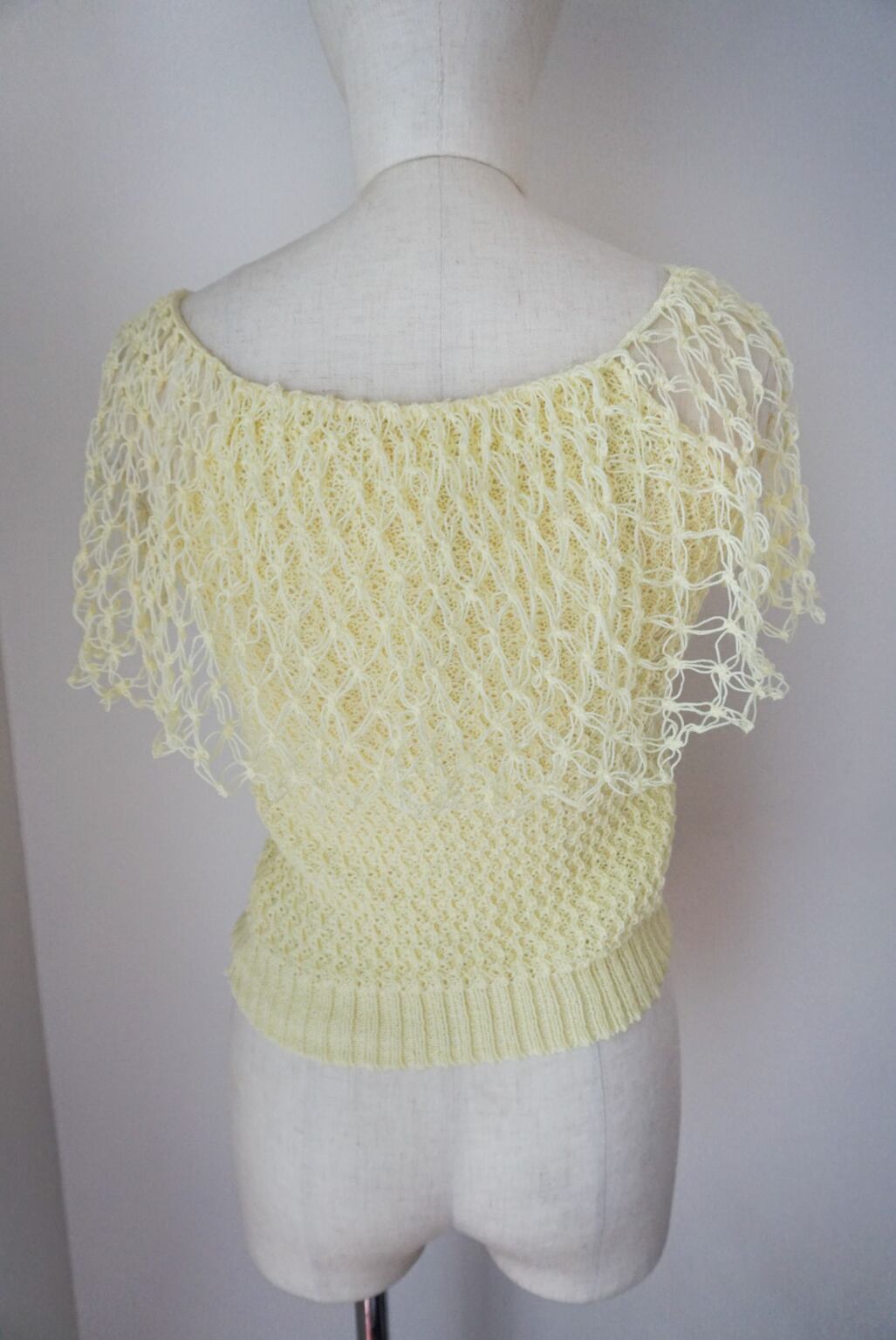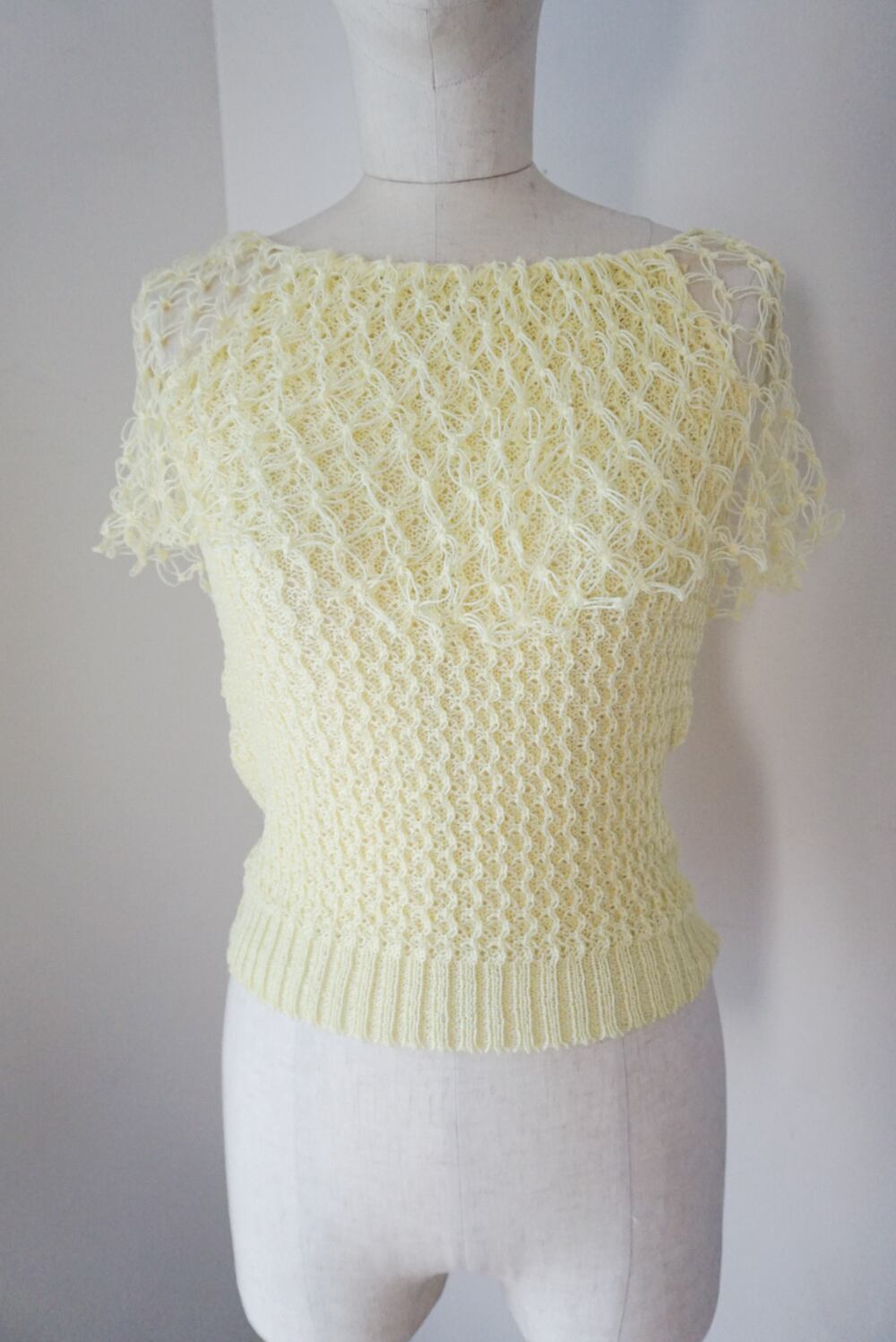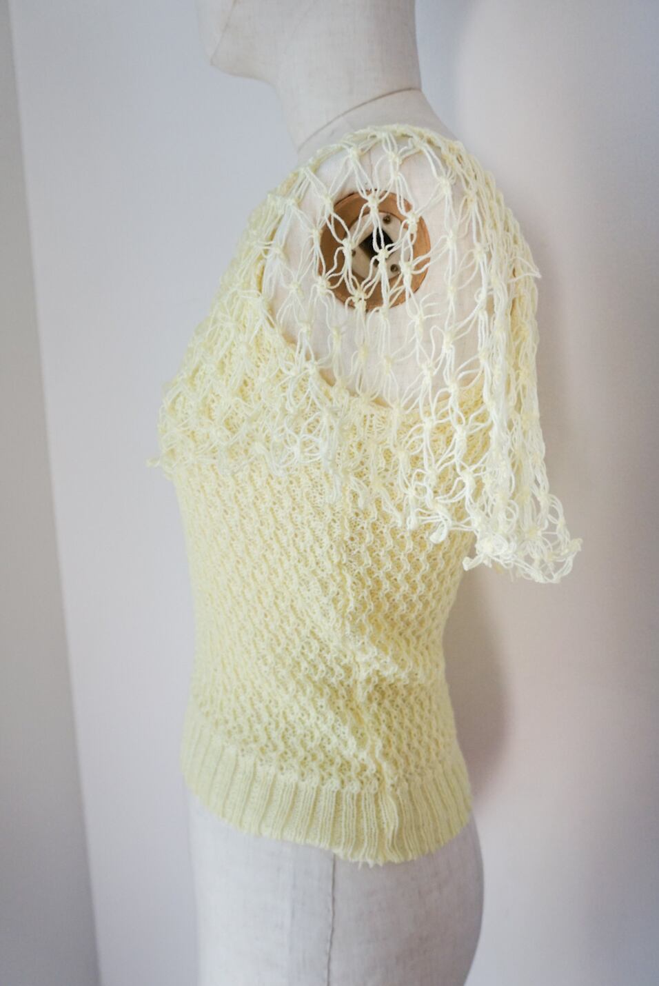 このトップは、ヴィンテージ感あふれるイエローのニット素材を使用した、オフショルダーにもでき、2wayデザインの魅力的な一枚です。
