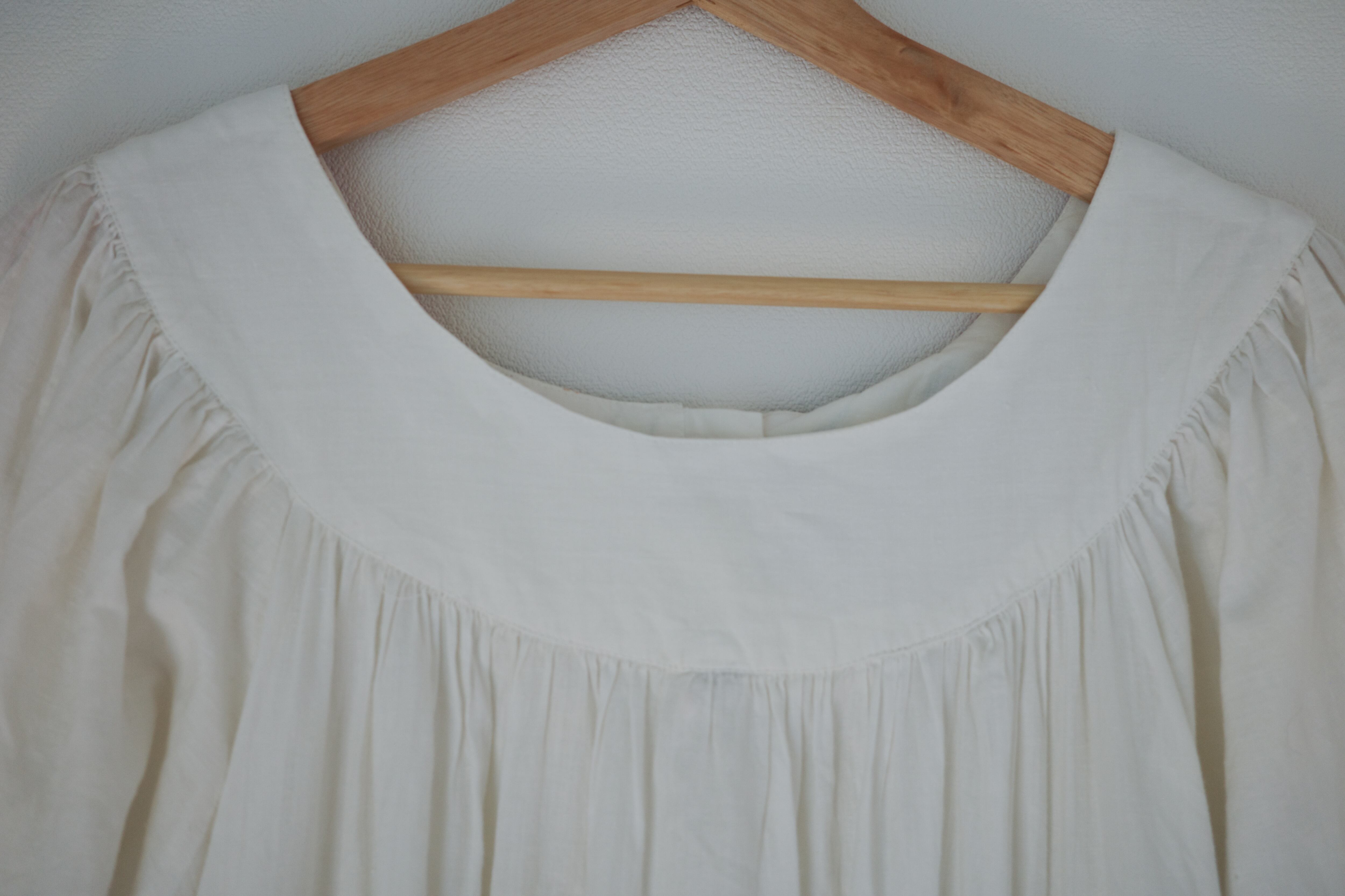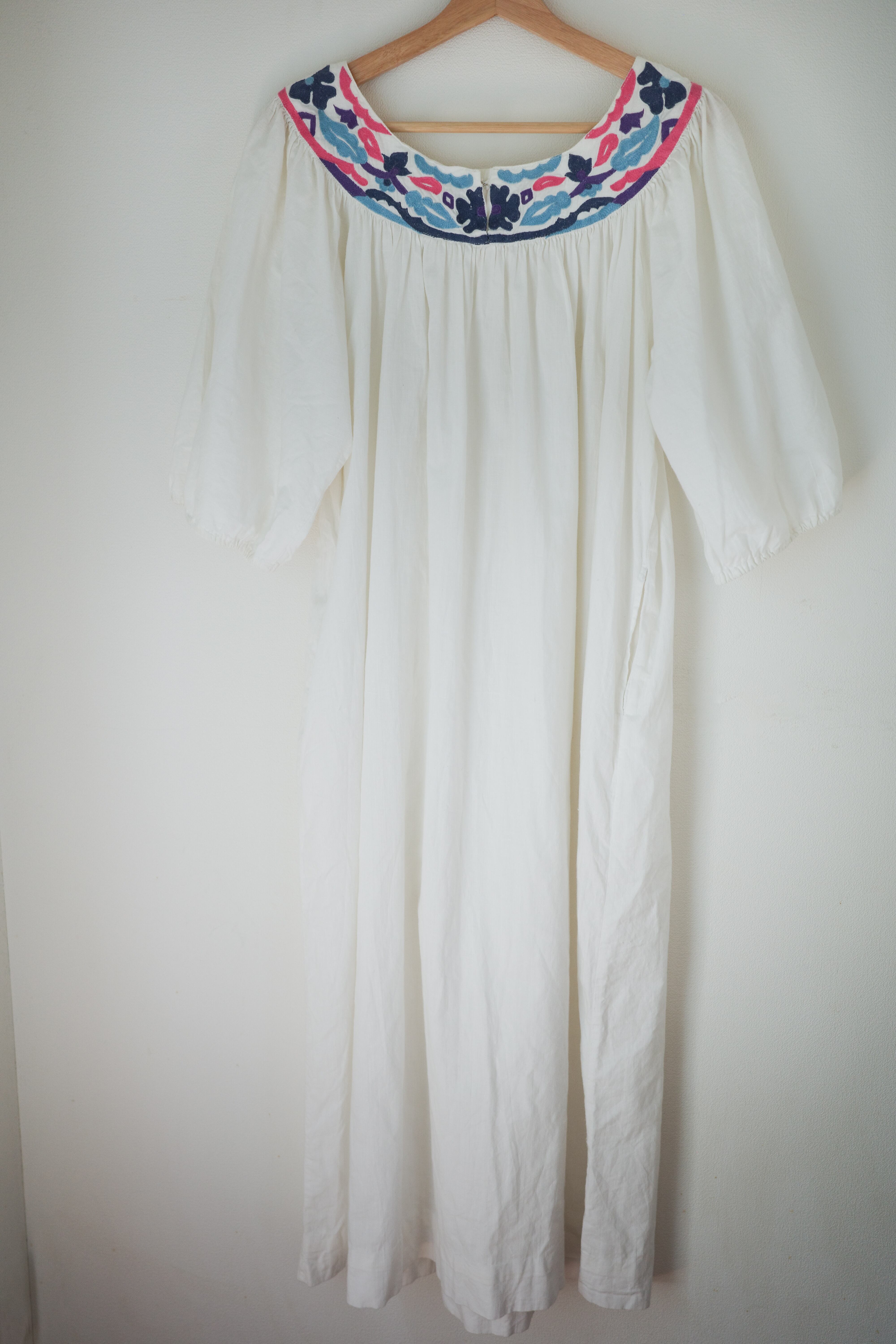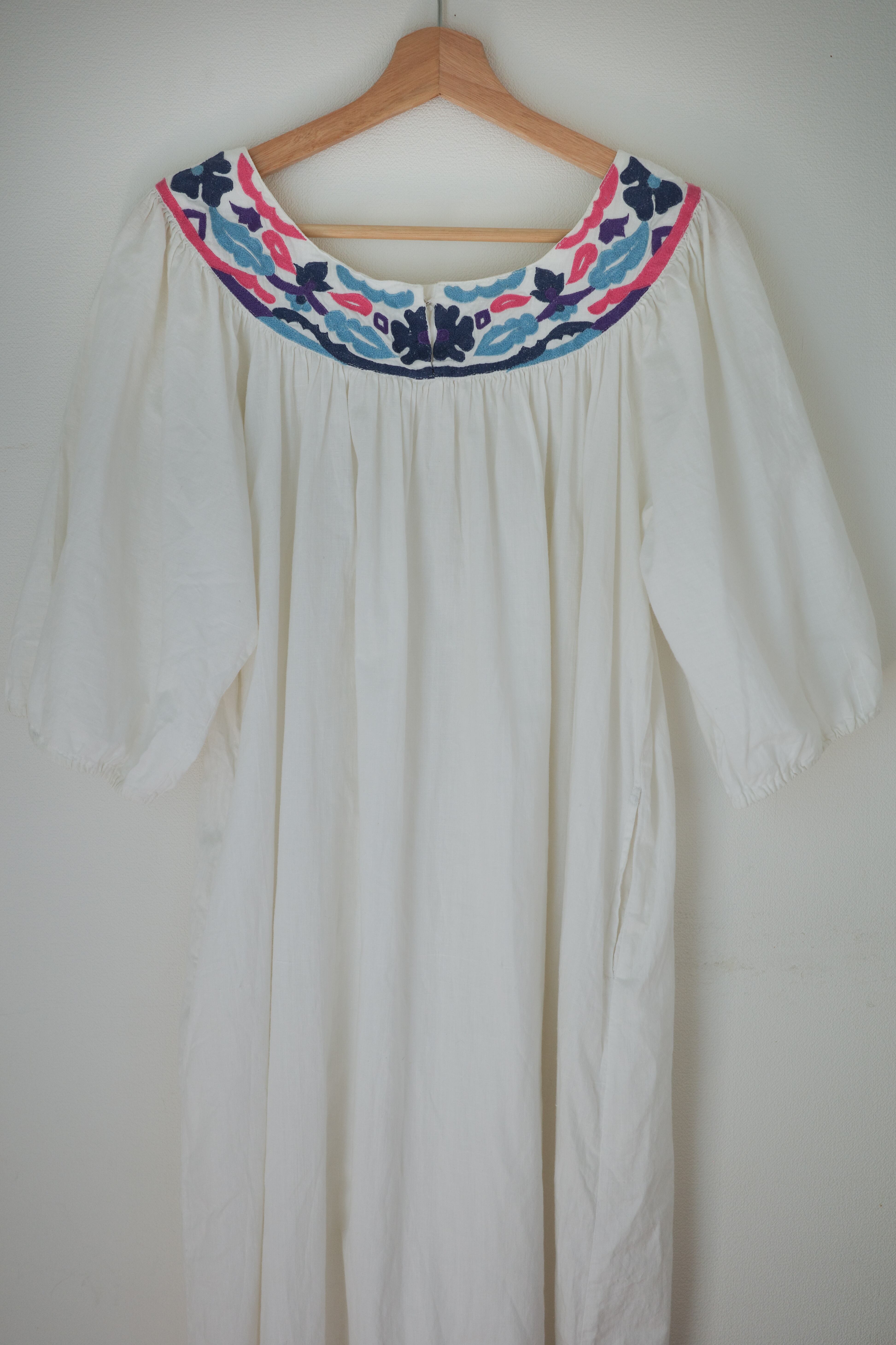 このドレスは、ヴィンテージ感が漂うホワイトコットン素材に色とりどりの刺繍が施された魅力的な一枚です。