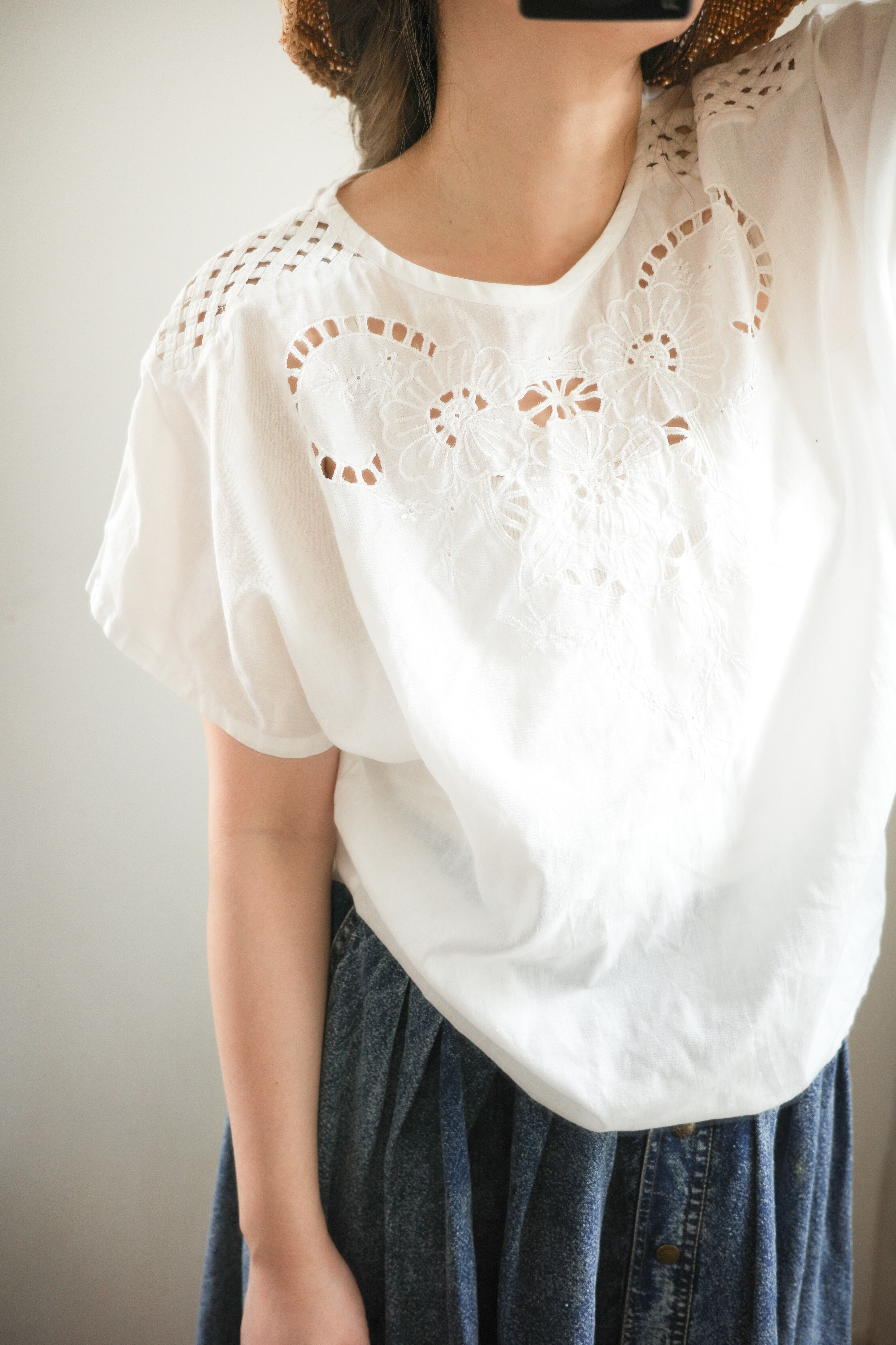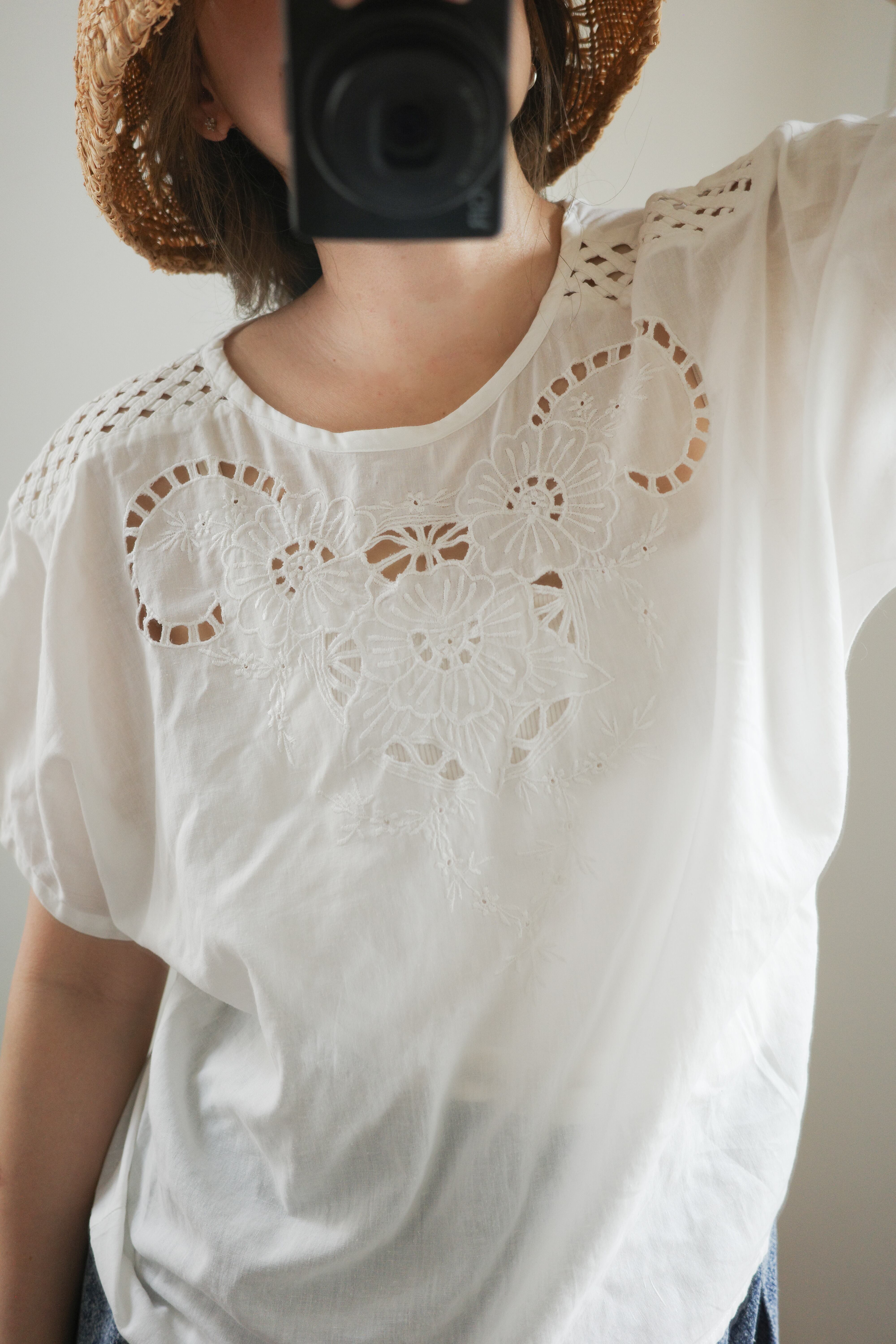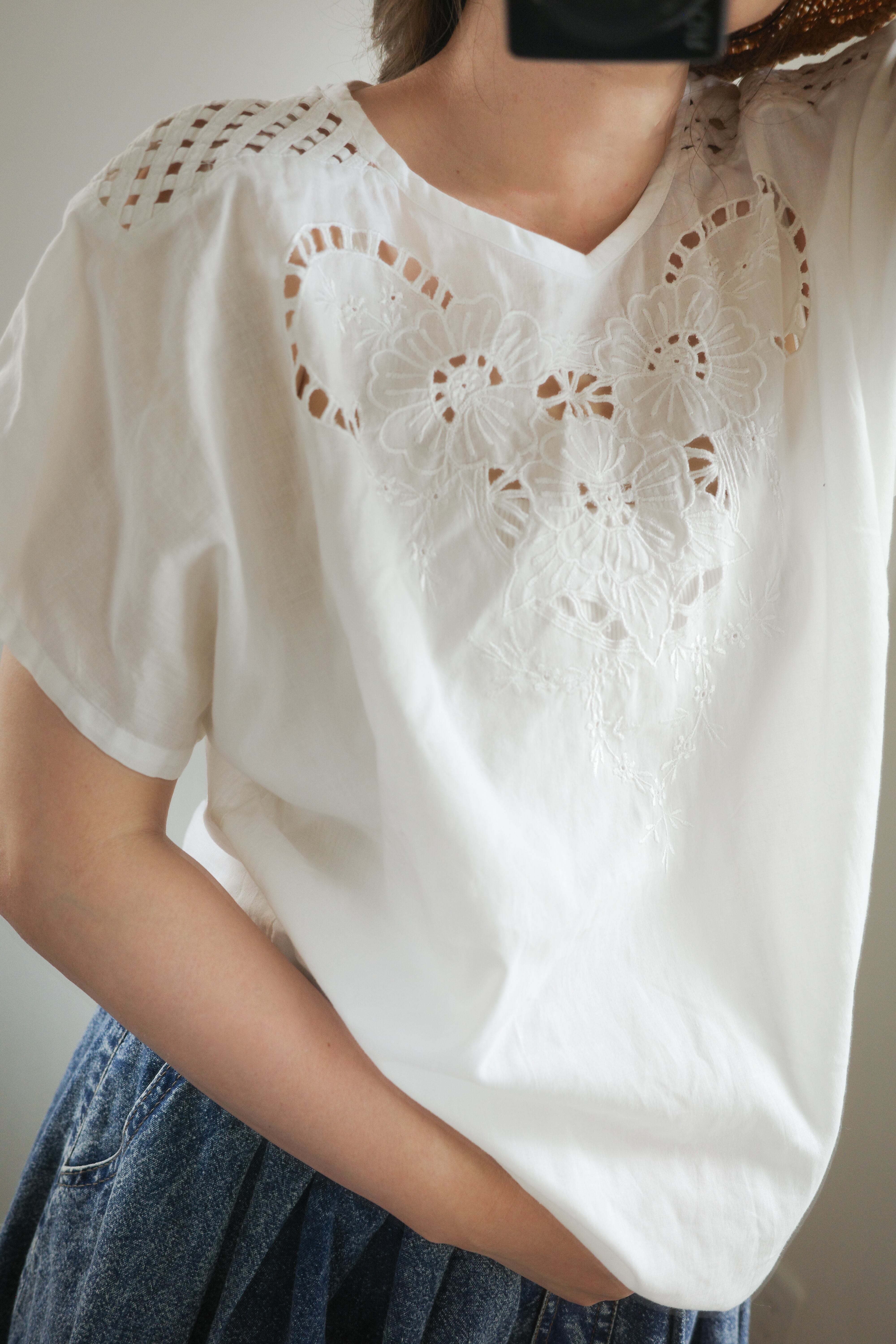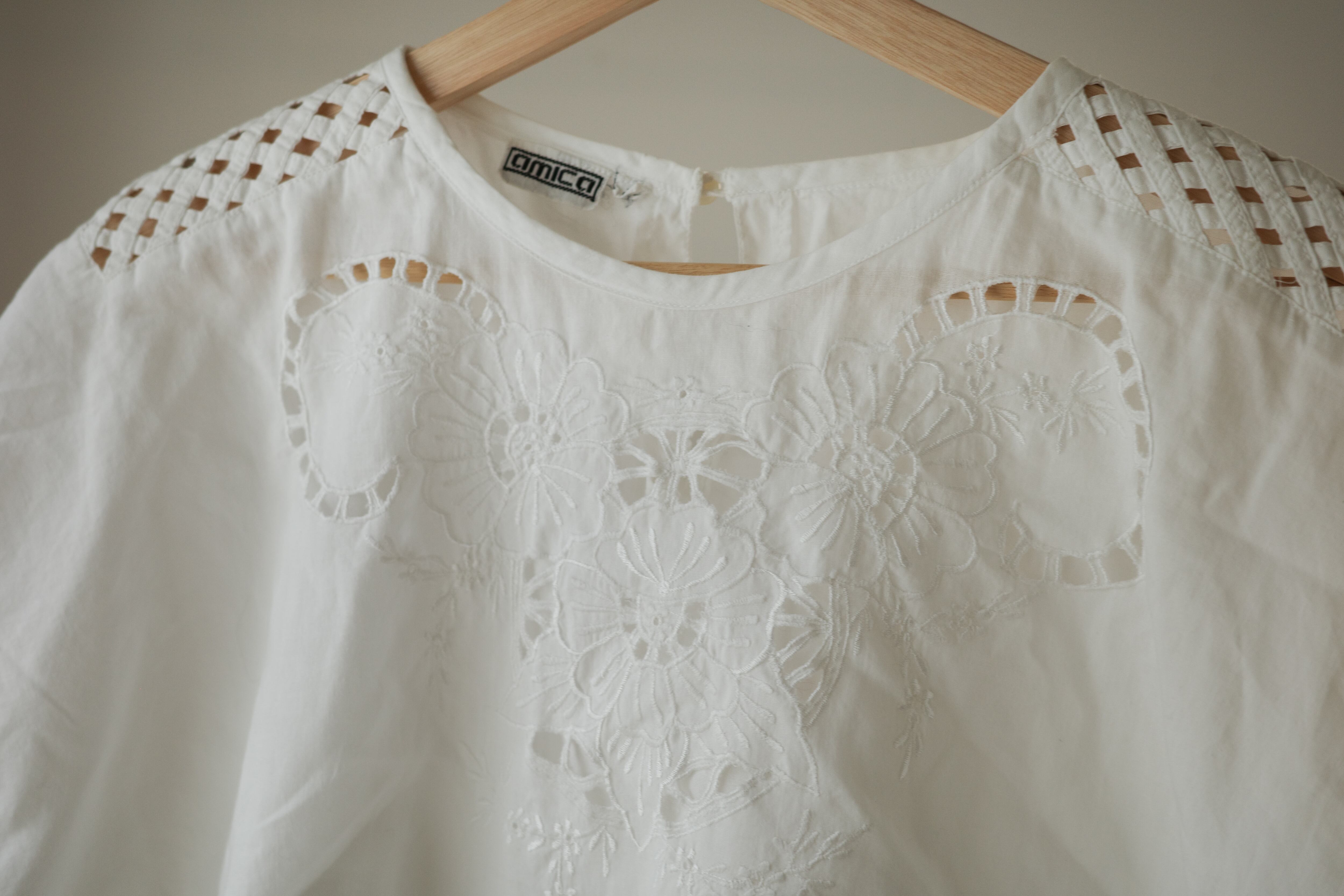 このトップスは、ヴィンテージ感漂うホワイトコットン素材に美しいフランス製のレースが施された一枚です。