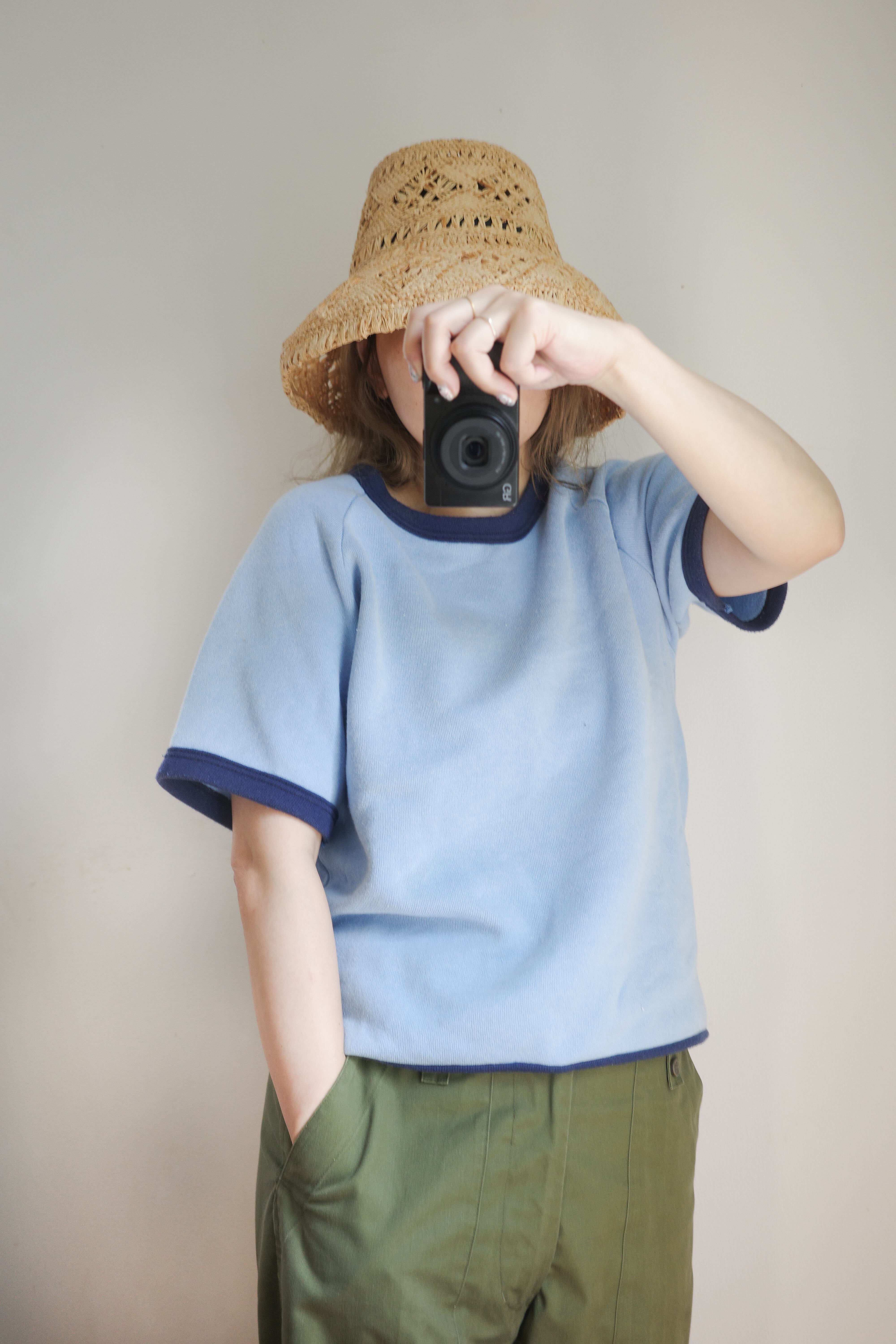 デザインのポイントは、爽やかなライトブルーの色合いと、リンガー仕様の袖口が特徴的で、カジュアルながらも洗練された印象を与えてくれます。