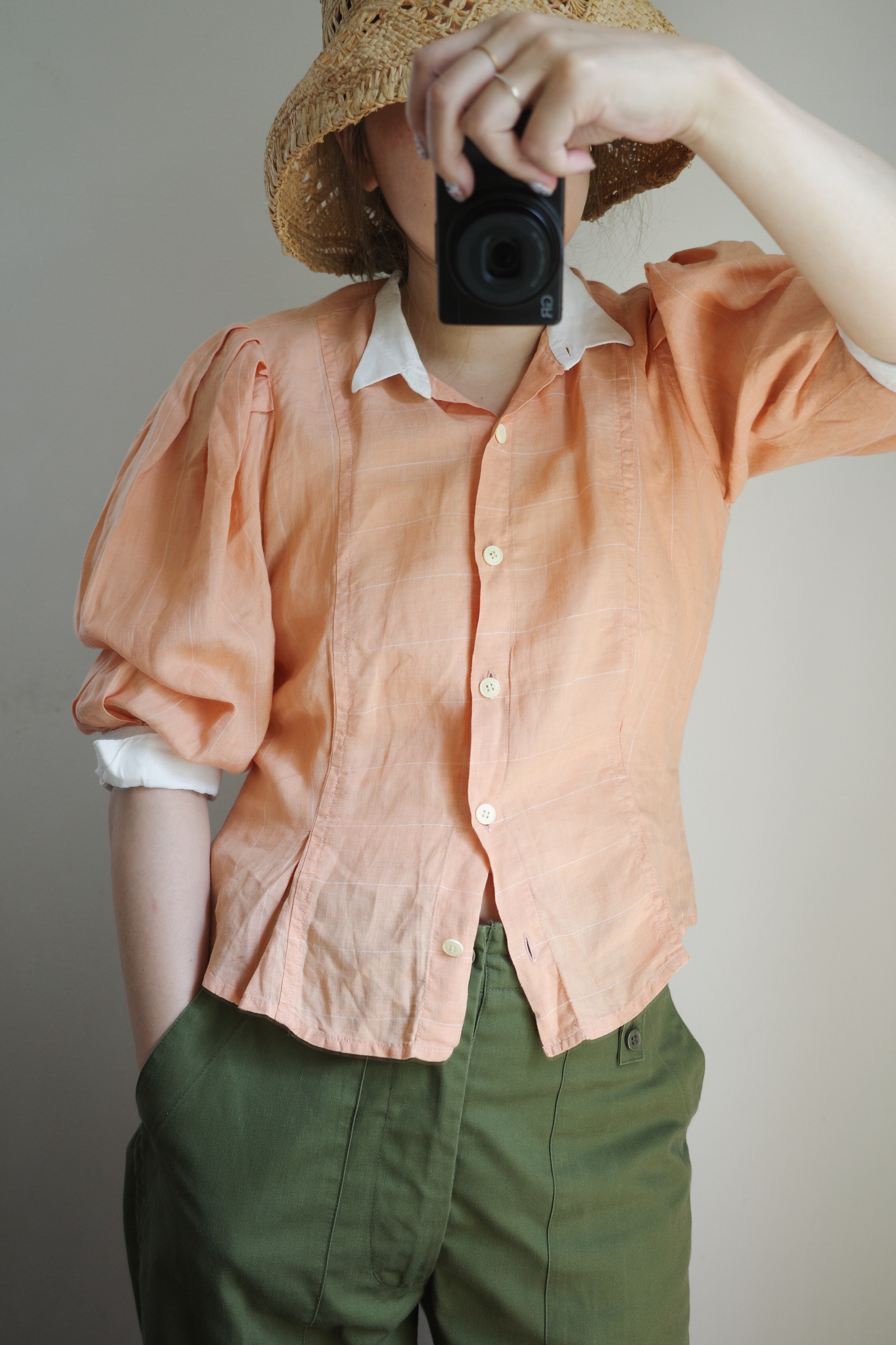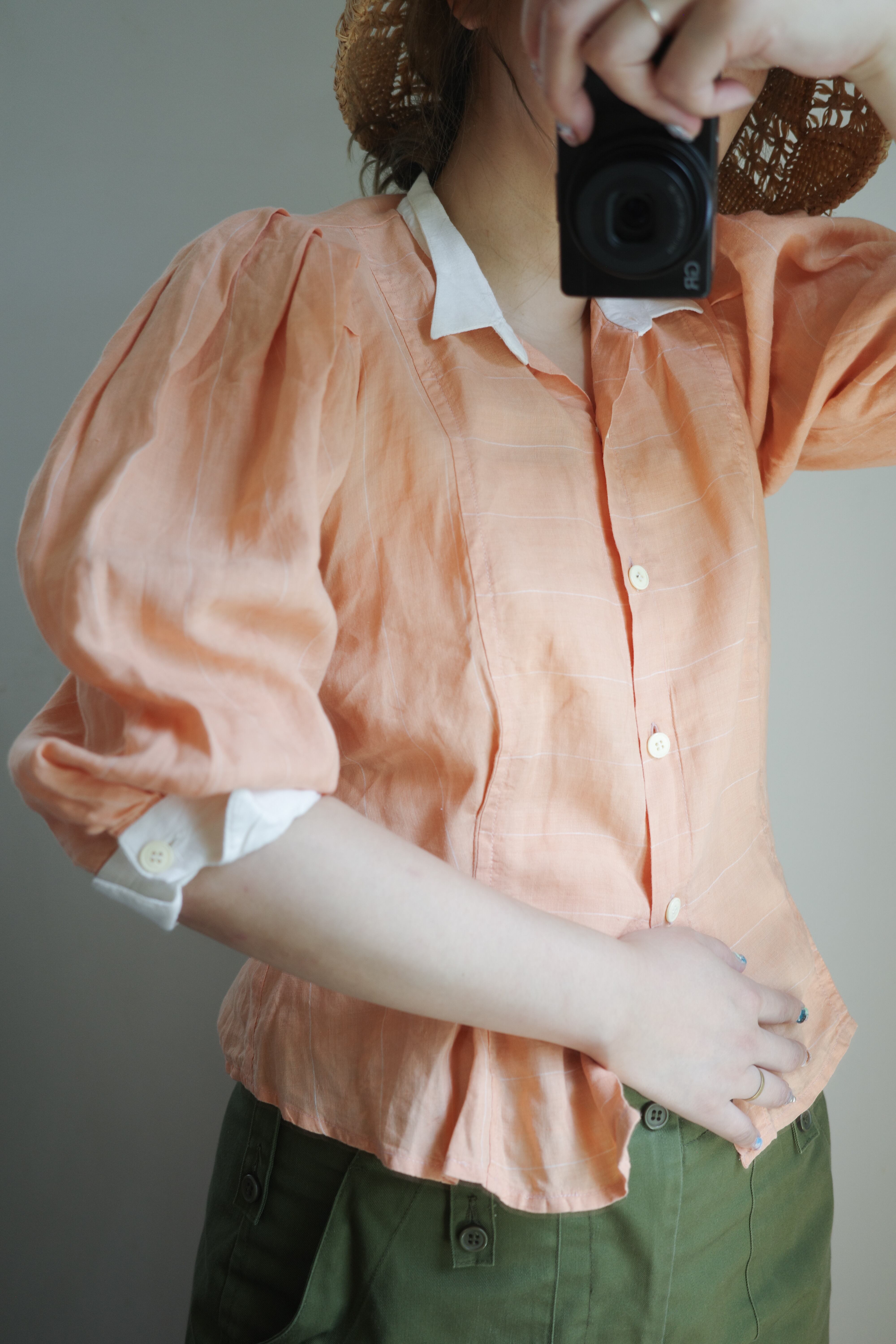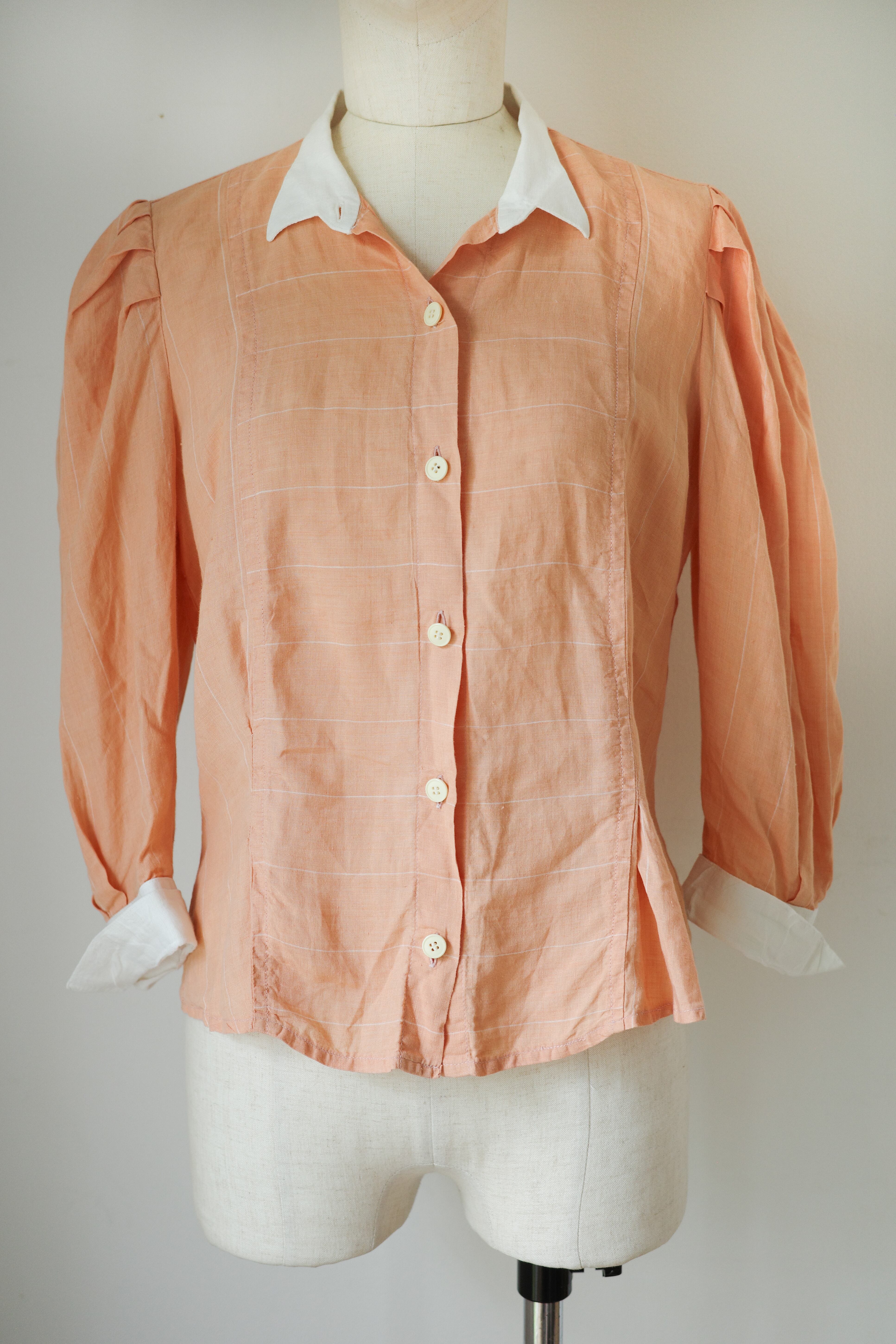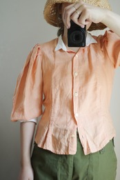 このピンクヴィンテージリネンパフスリーブブラウスは、女性らしさを引き立てるエレガントなデザインが特徴のアイテムです。ふんわりとしたパフスリーブが印象的で、軽やかに着こなすことができ、デイリーコーディネートから特別なシーンまで幅広く活躍します。