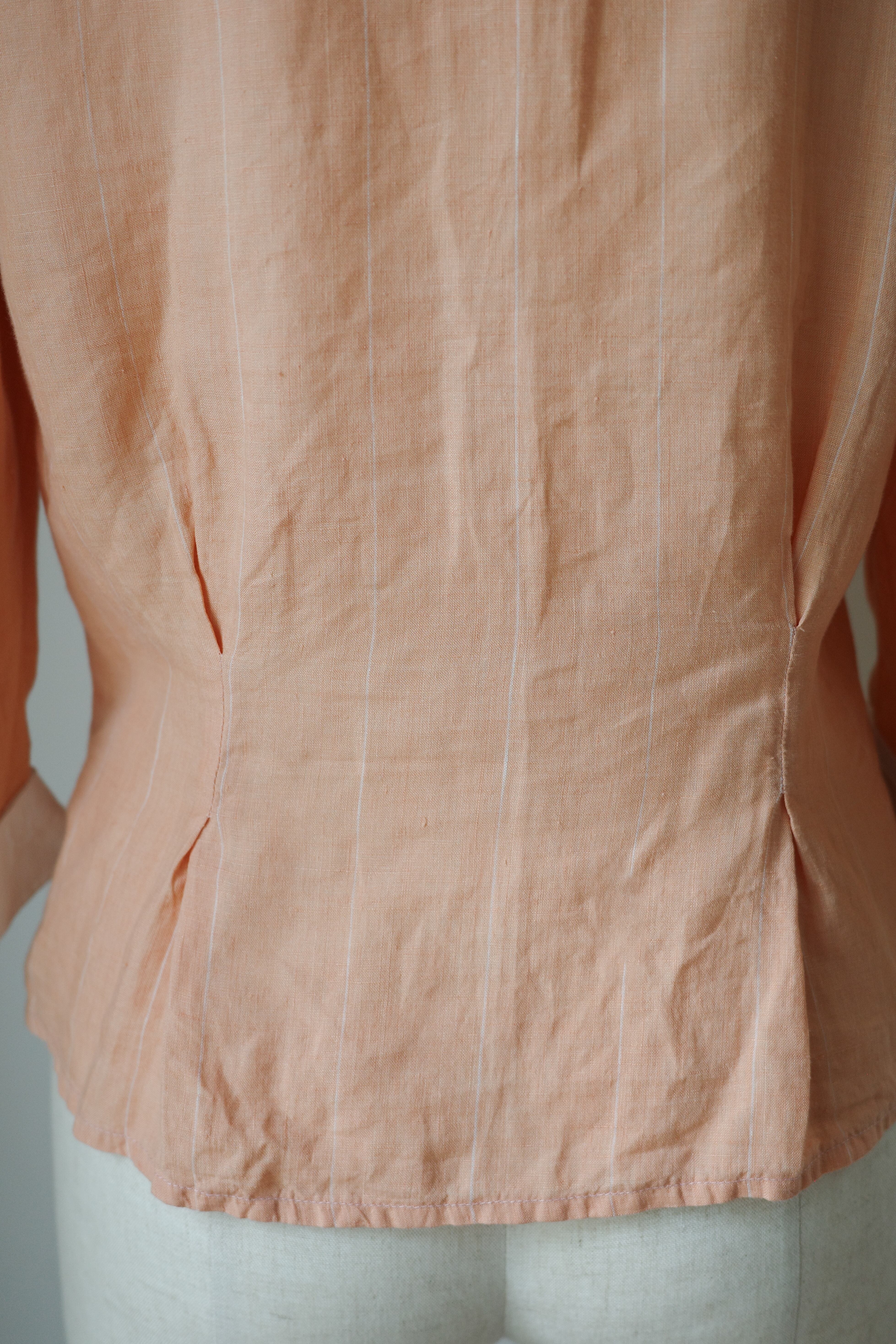 素材にはリネンを使用しており、通気性が良く、心地よい着心地が楽しめます。柔らかなピンク色は、肌を明るく見せ、優しい雰囲気を演出します。ディテールにもこだわりが見られ、ウエストは細身のシルエットが美しいラインを作り出しています。