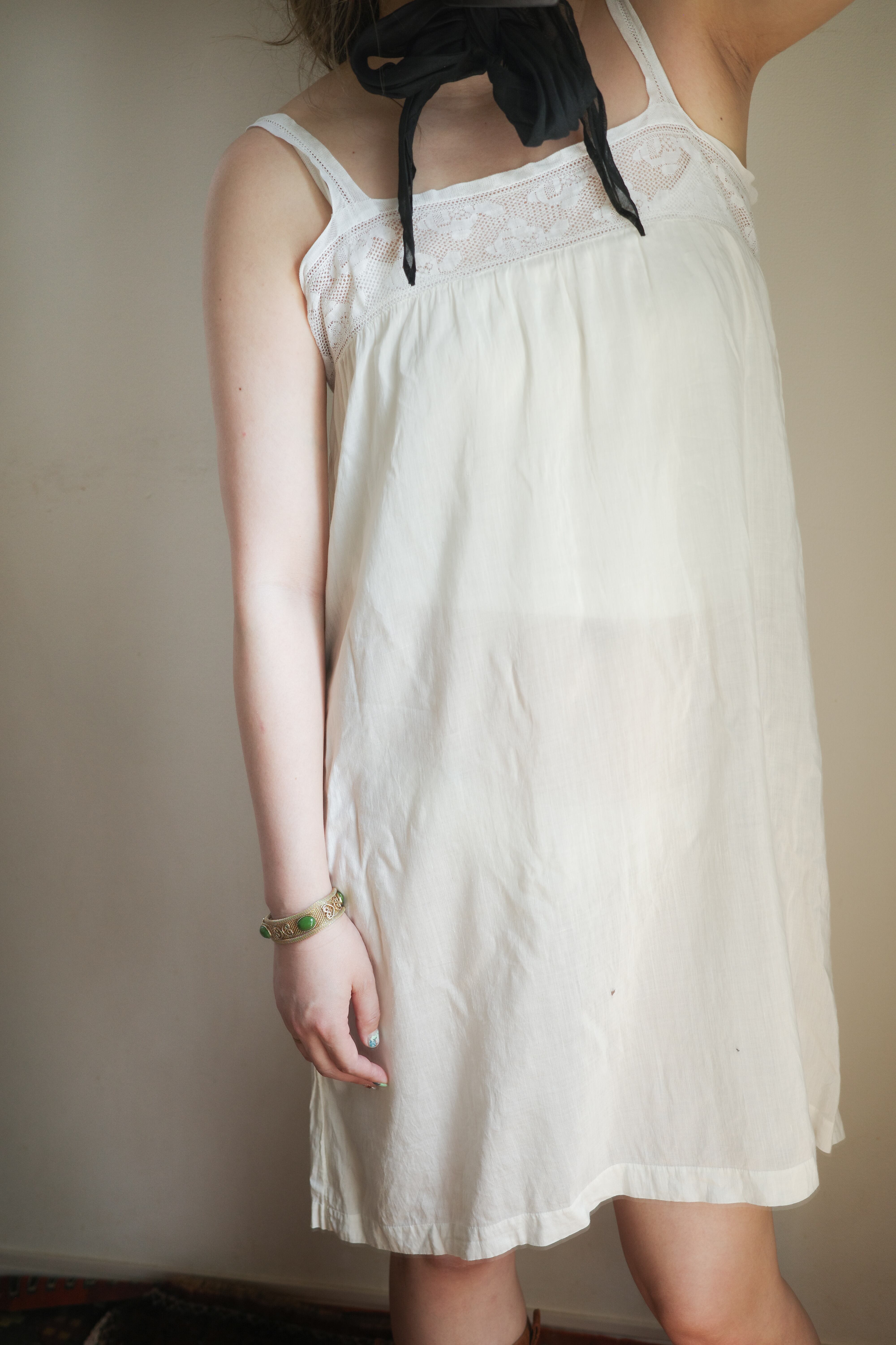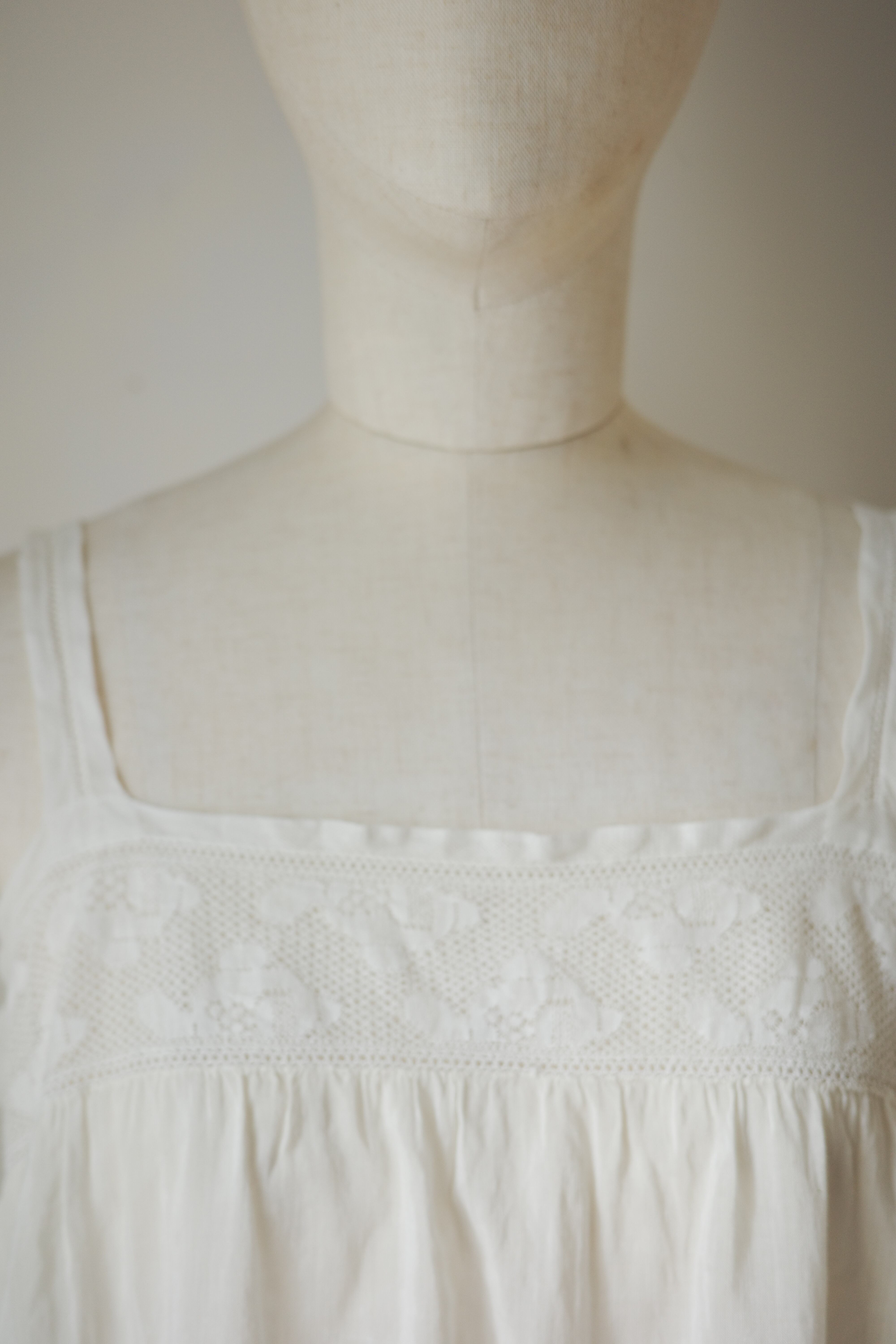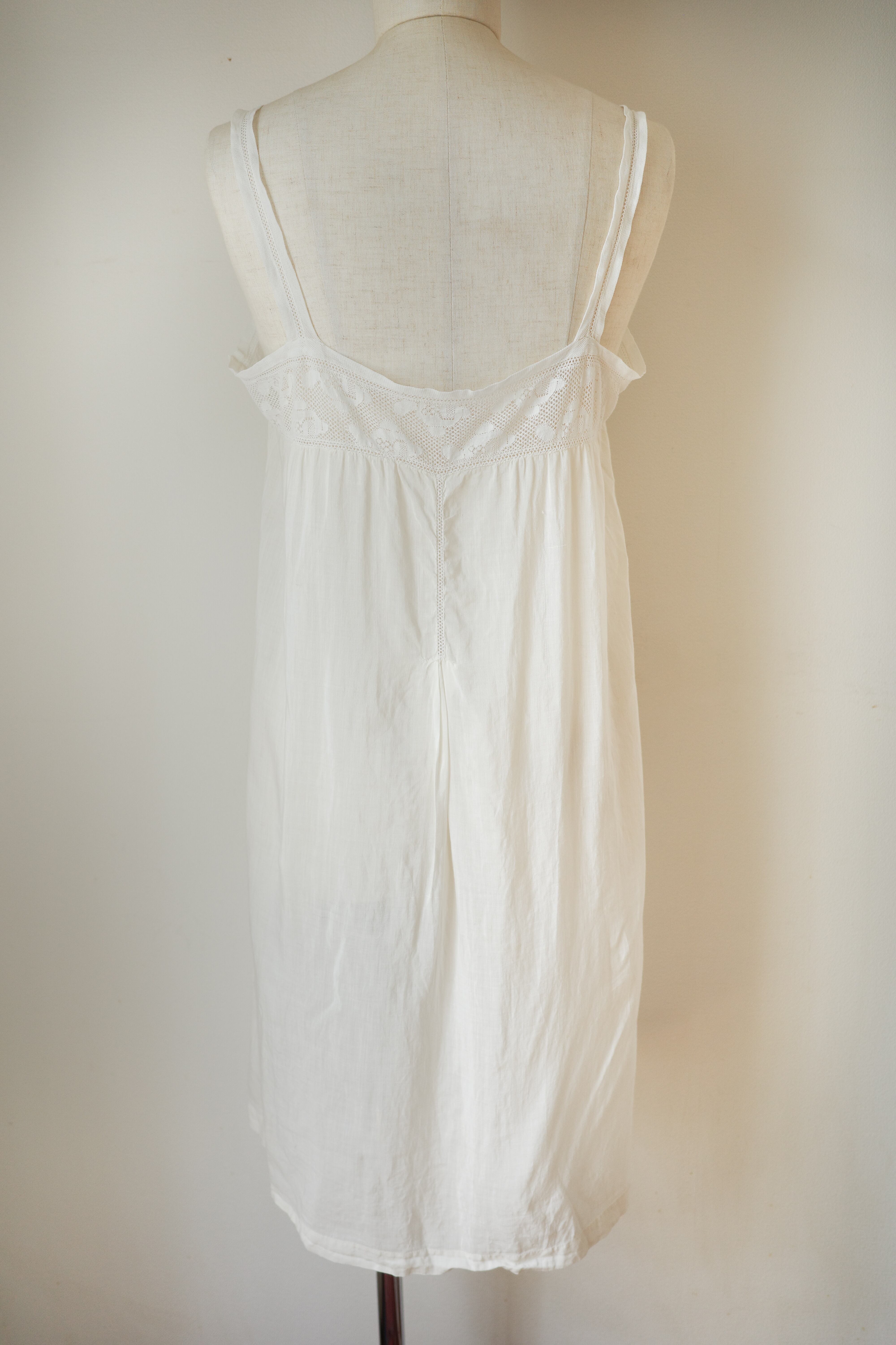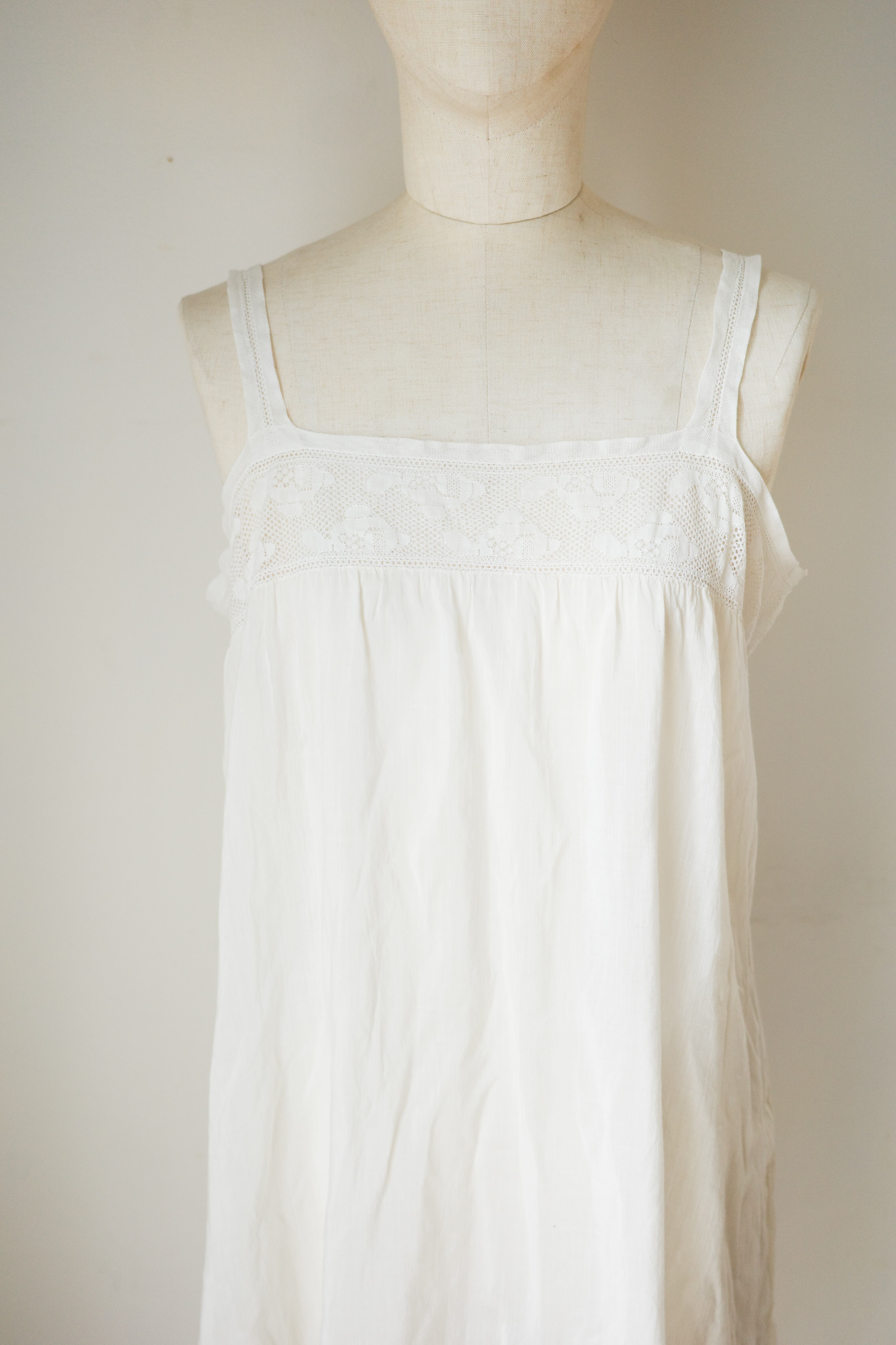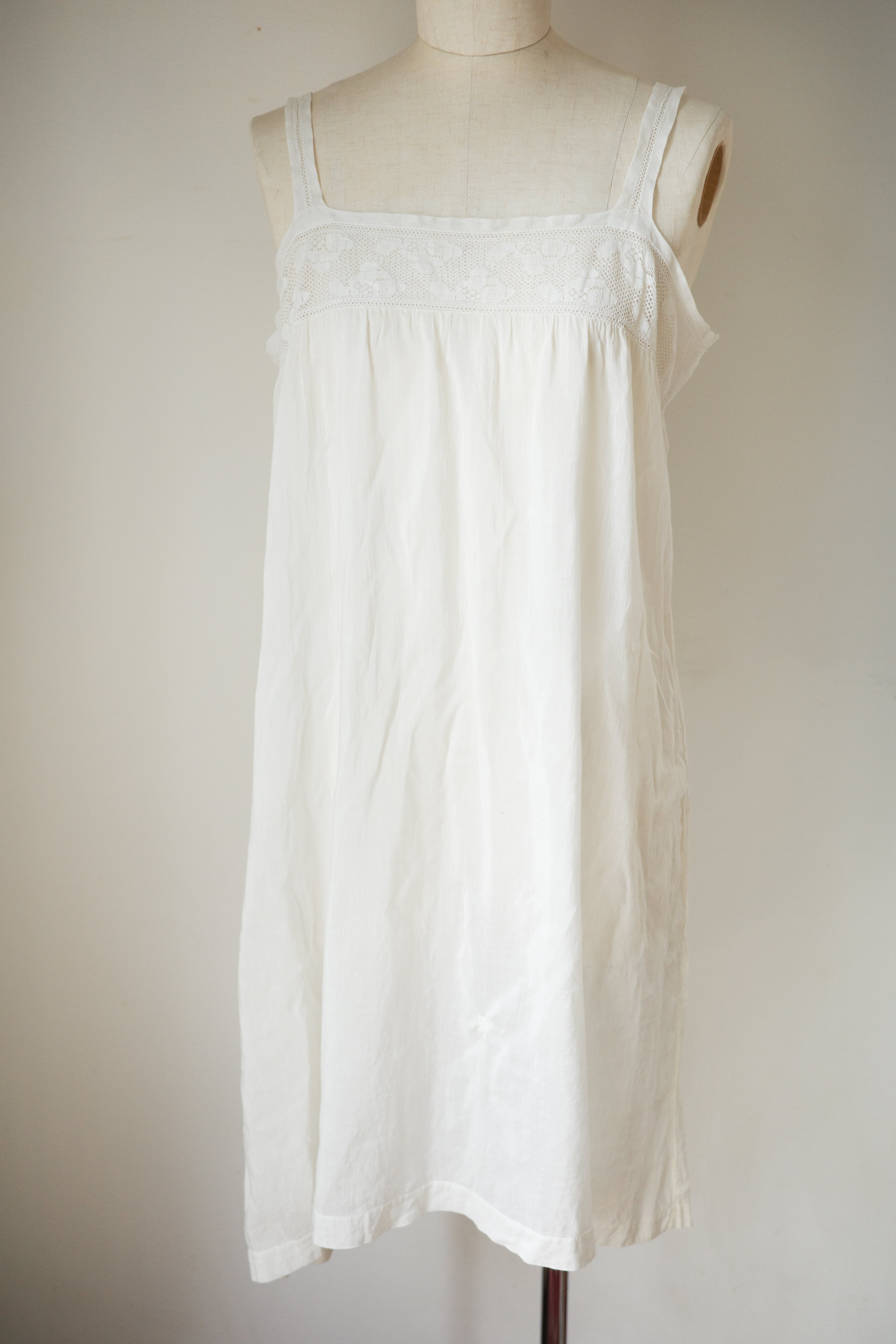 この1910年代のフレンチホワイトキャミソールドレスは、優雅でクラシカルなデザインが魅力的なアイテムです。軽やかな素材感が感じられ、様々なシーンで洗練された雰囲気を演出してくれます。普段使いから特別な場面まで、幅広くご利用いただけます。