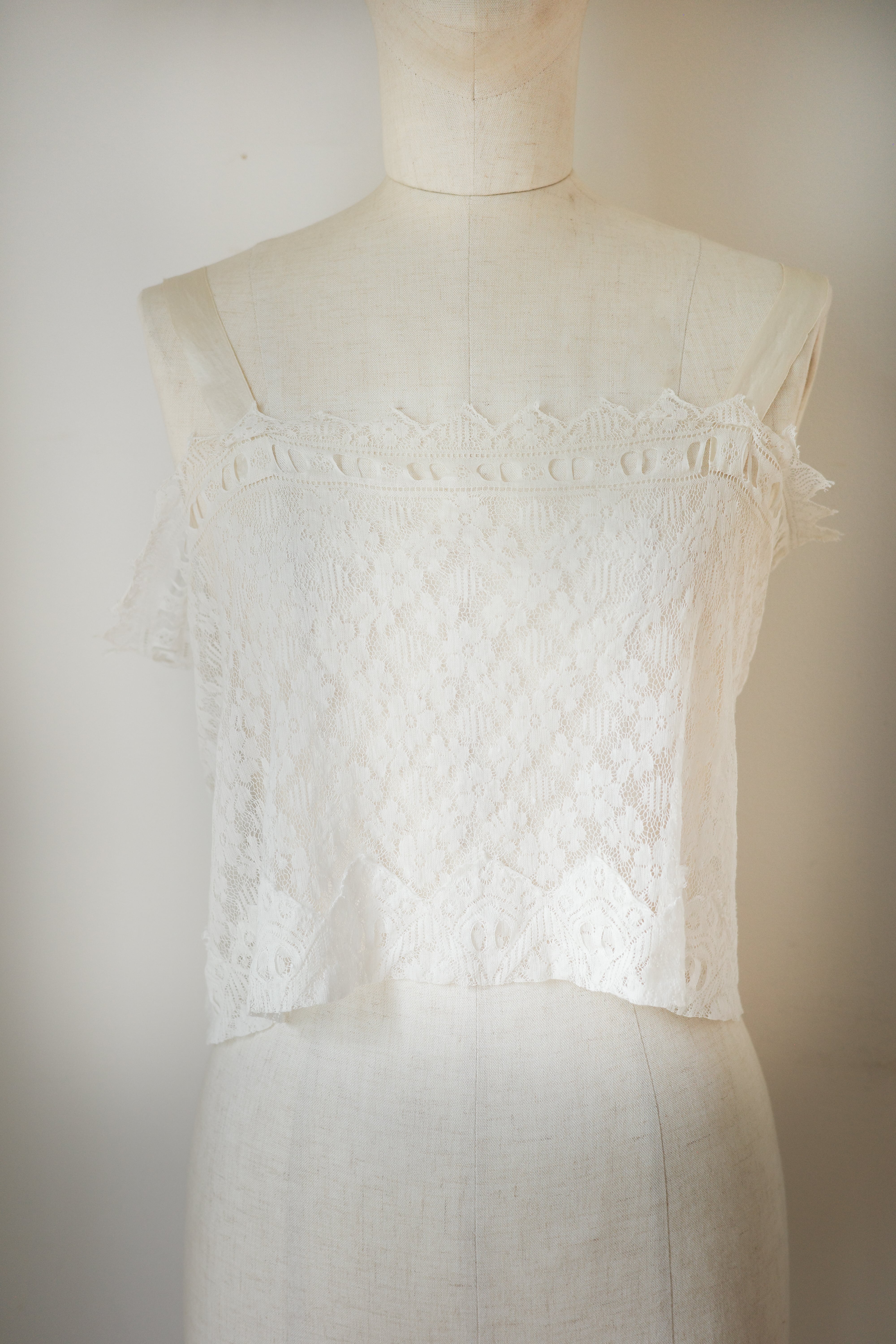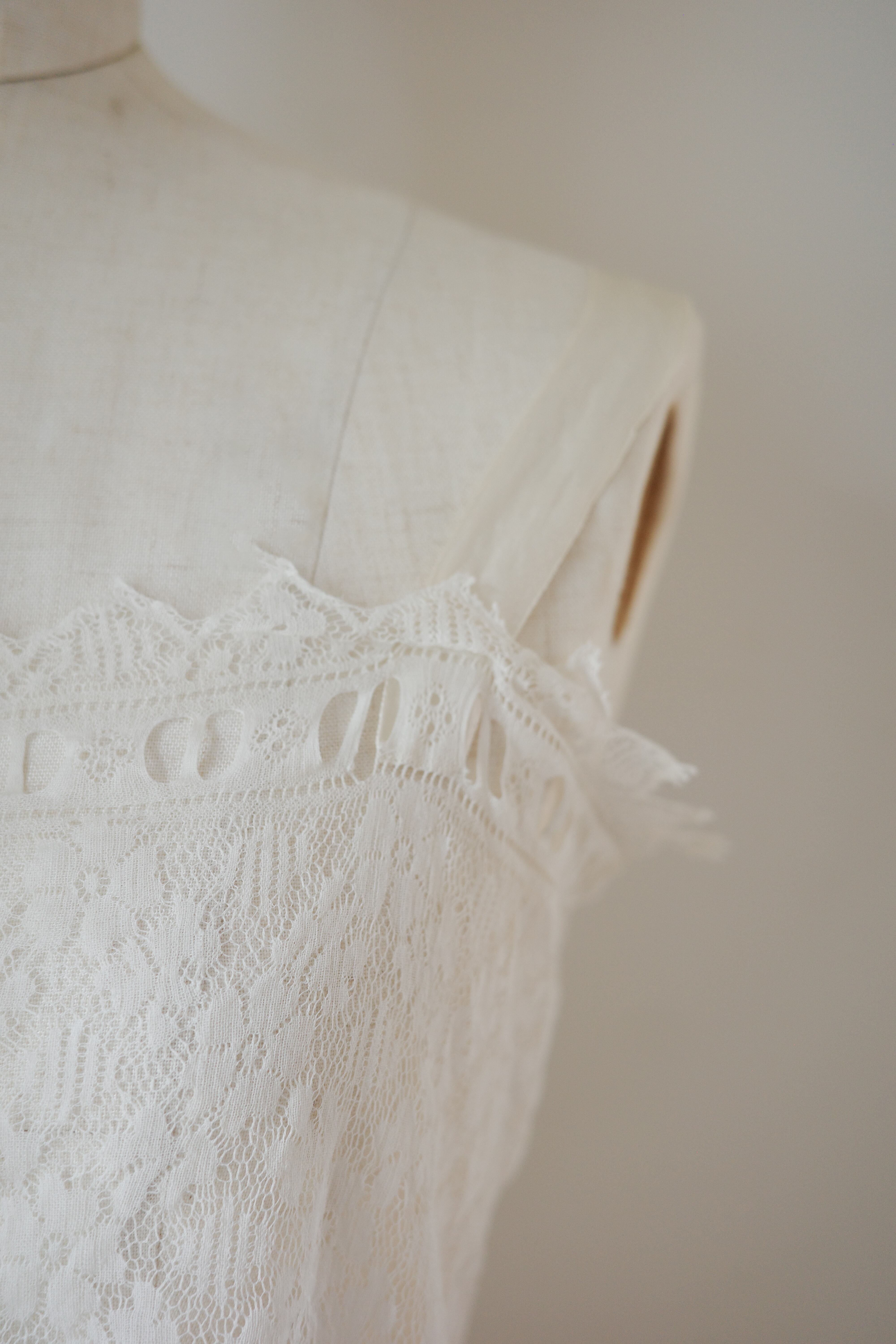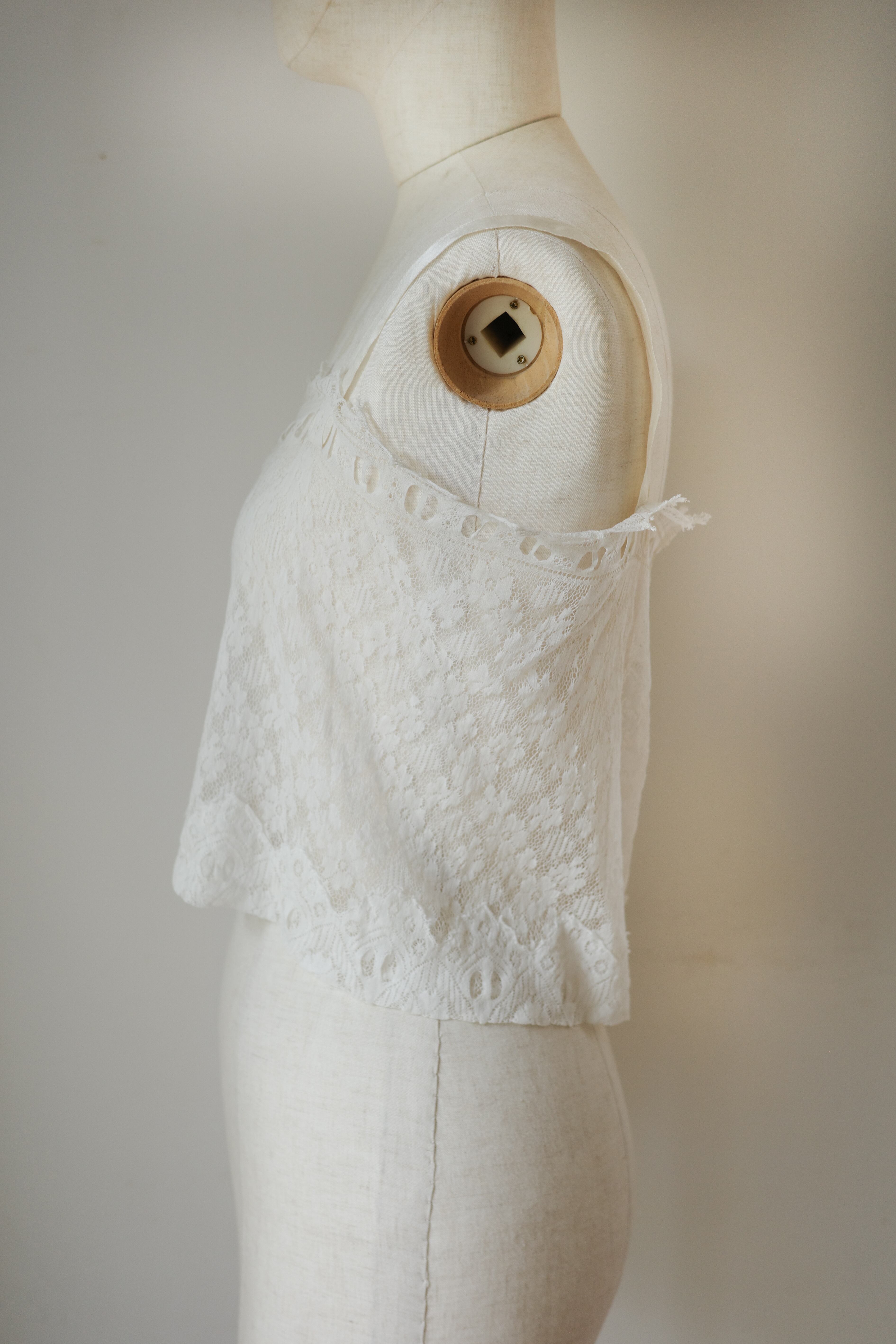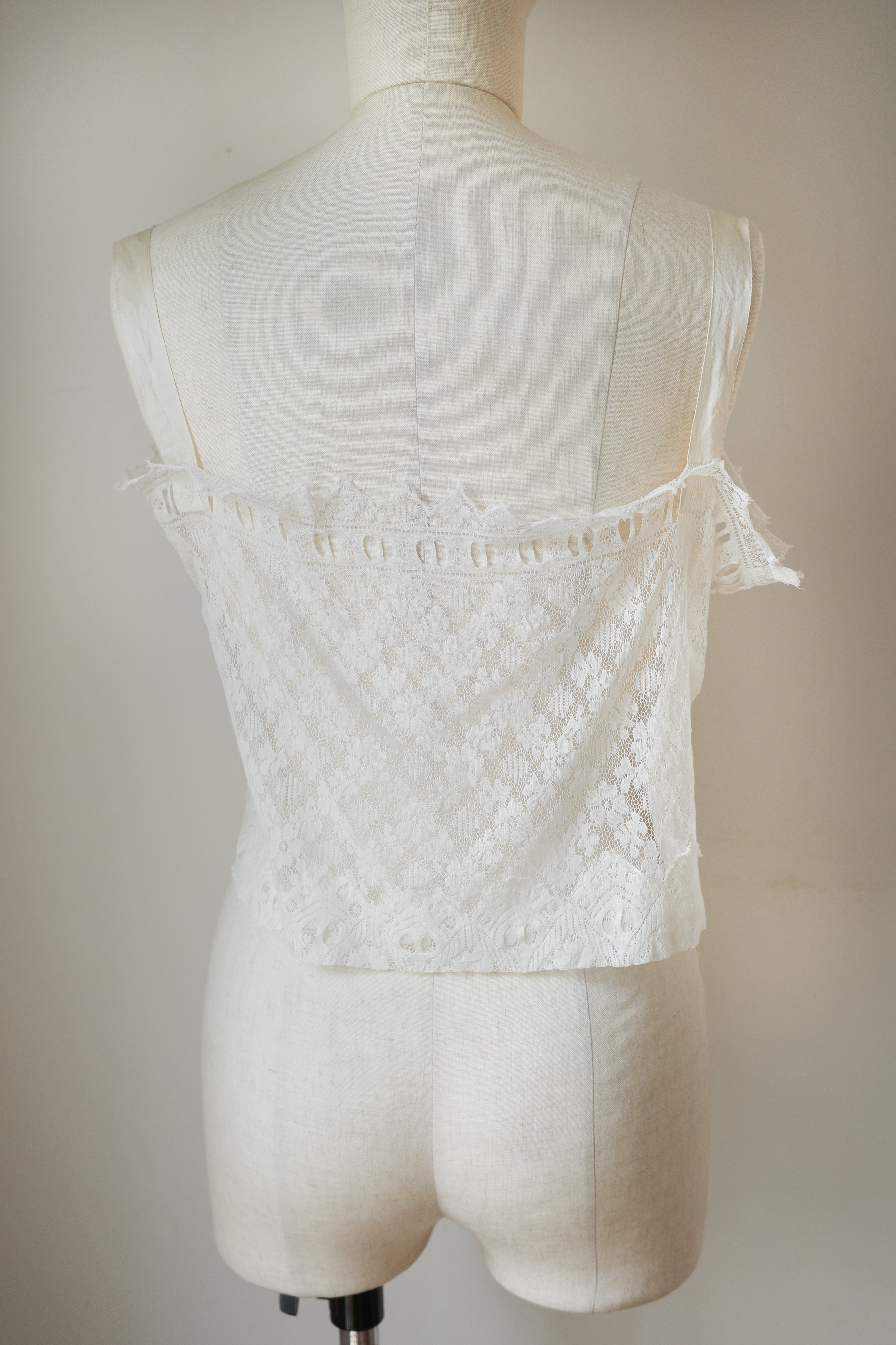 このキャミソールトップは、アンティークレースを使用したエレガントなアイテムです。柔らかな白の生地が女性らしい雰囲気を演出し、どんなスタイルにも華やかさをプラスします。軽やかで着心地が良く、普段使いから特別なシーンまで幅広くご利用いただけます。