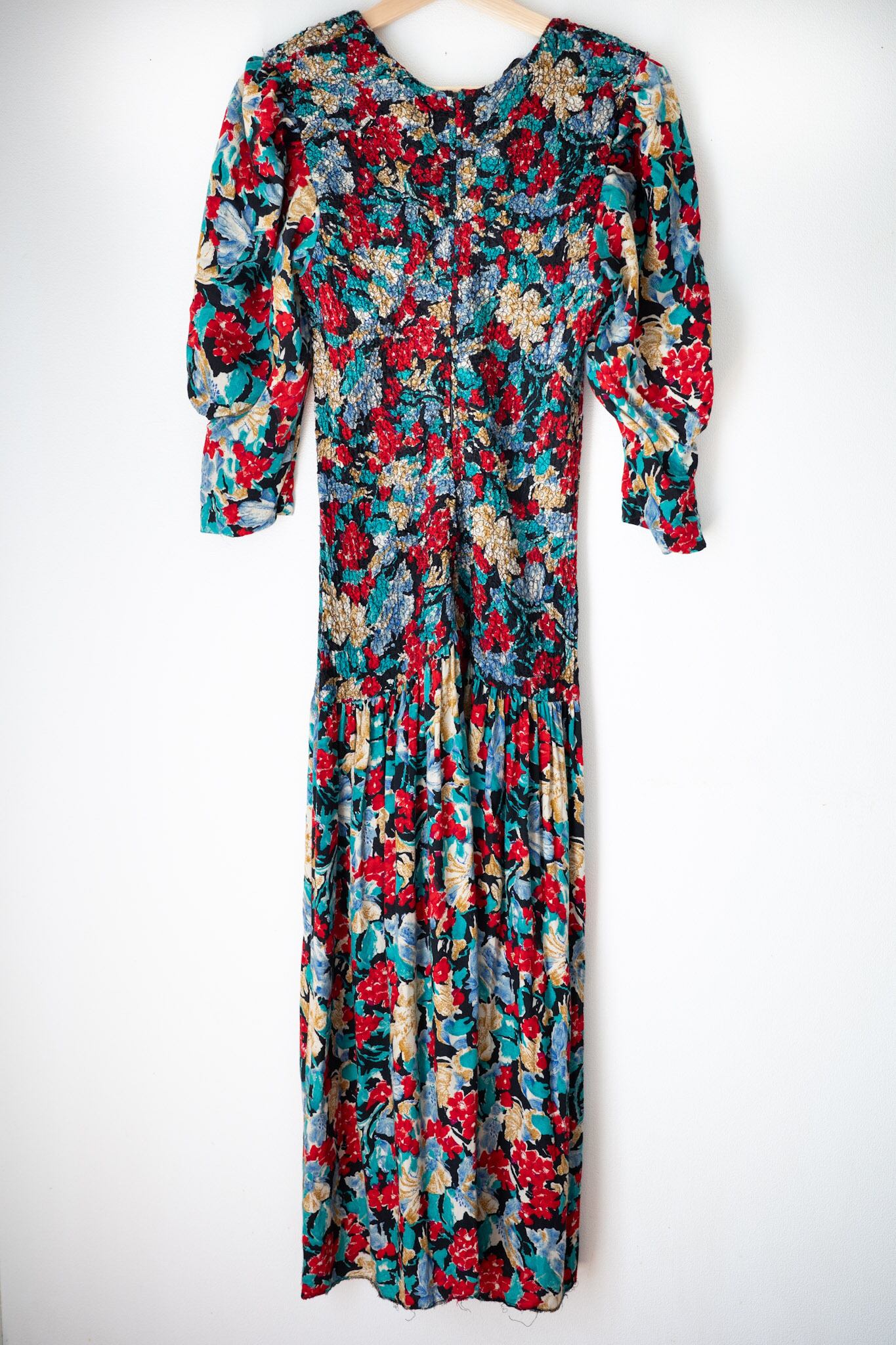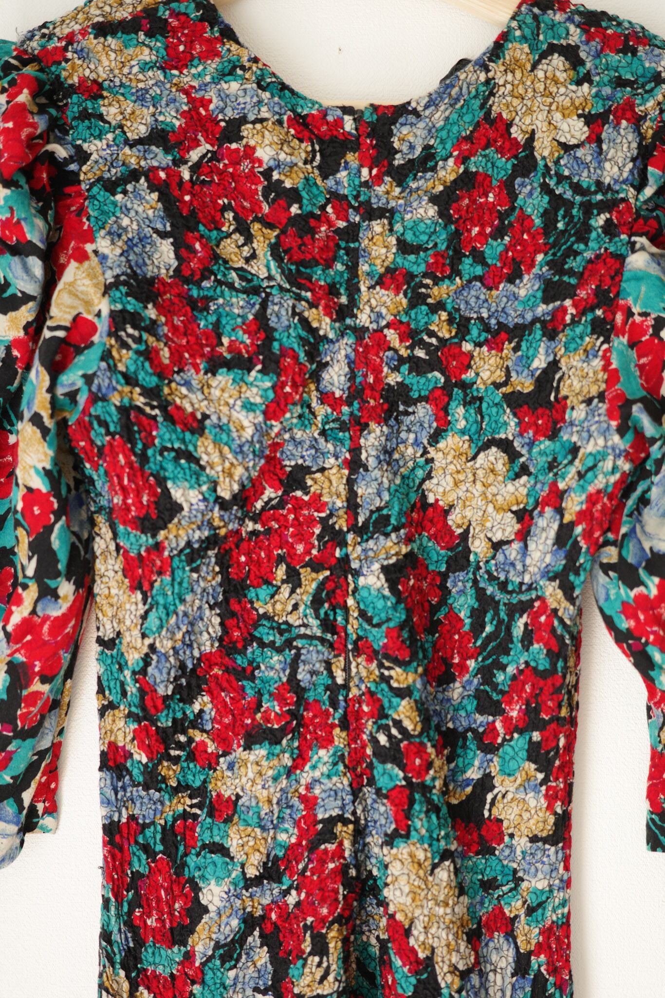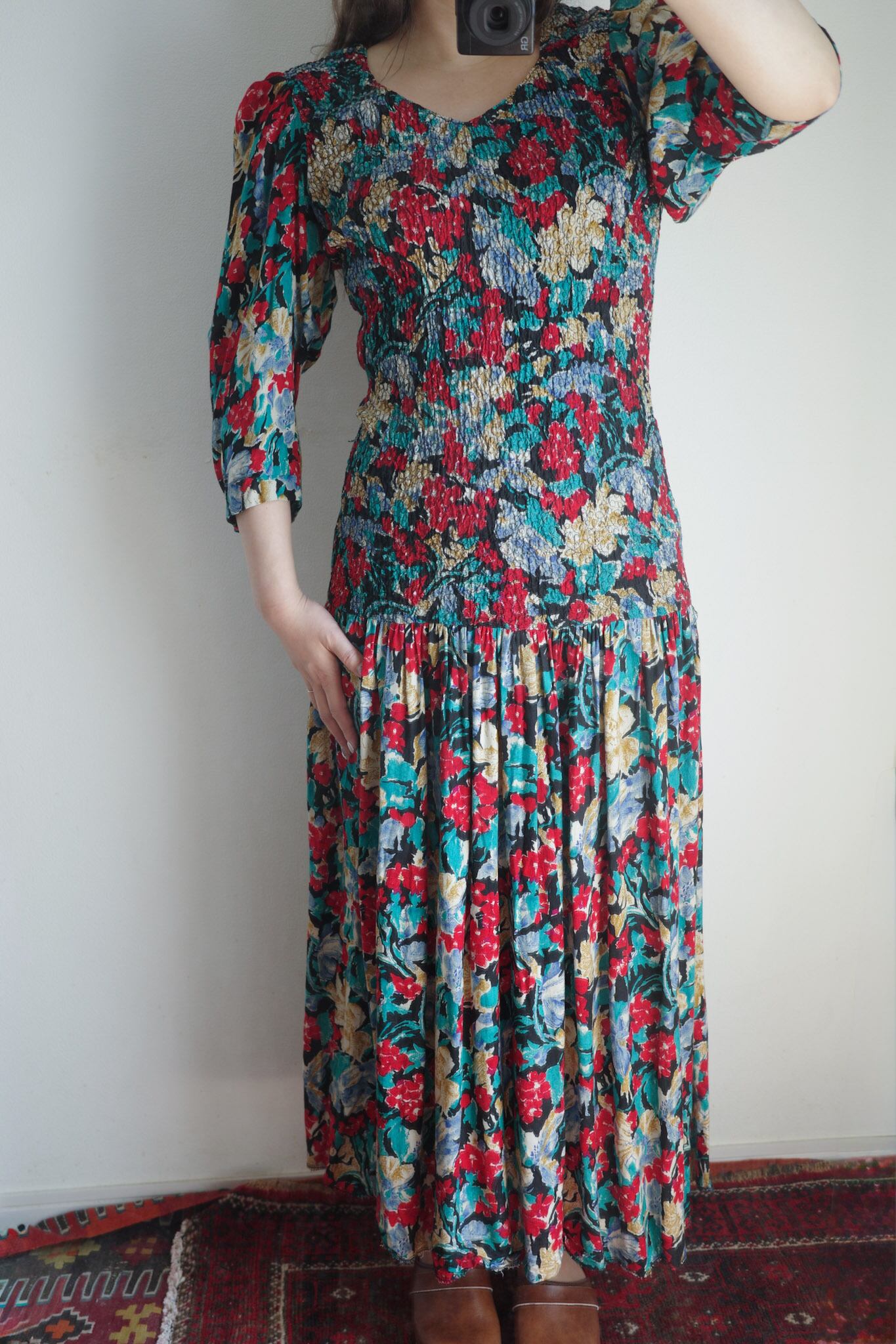 この1970年代のフラワーパターンが特徴的なロングドレスは、ボリュームのあるパフスリーブと鮮やかな花柄が印象的な一着です。優雅なデザインが女性らしさを引き立て、特別な日から普段使いまで幅広くご活用いただけるアイテムです。