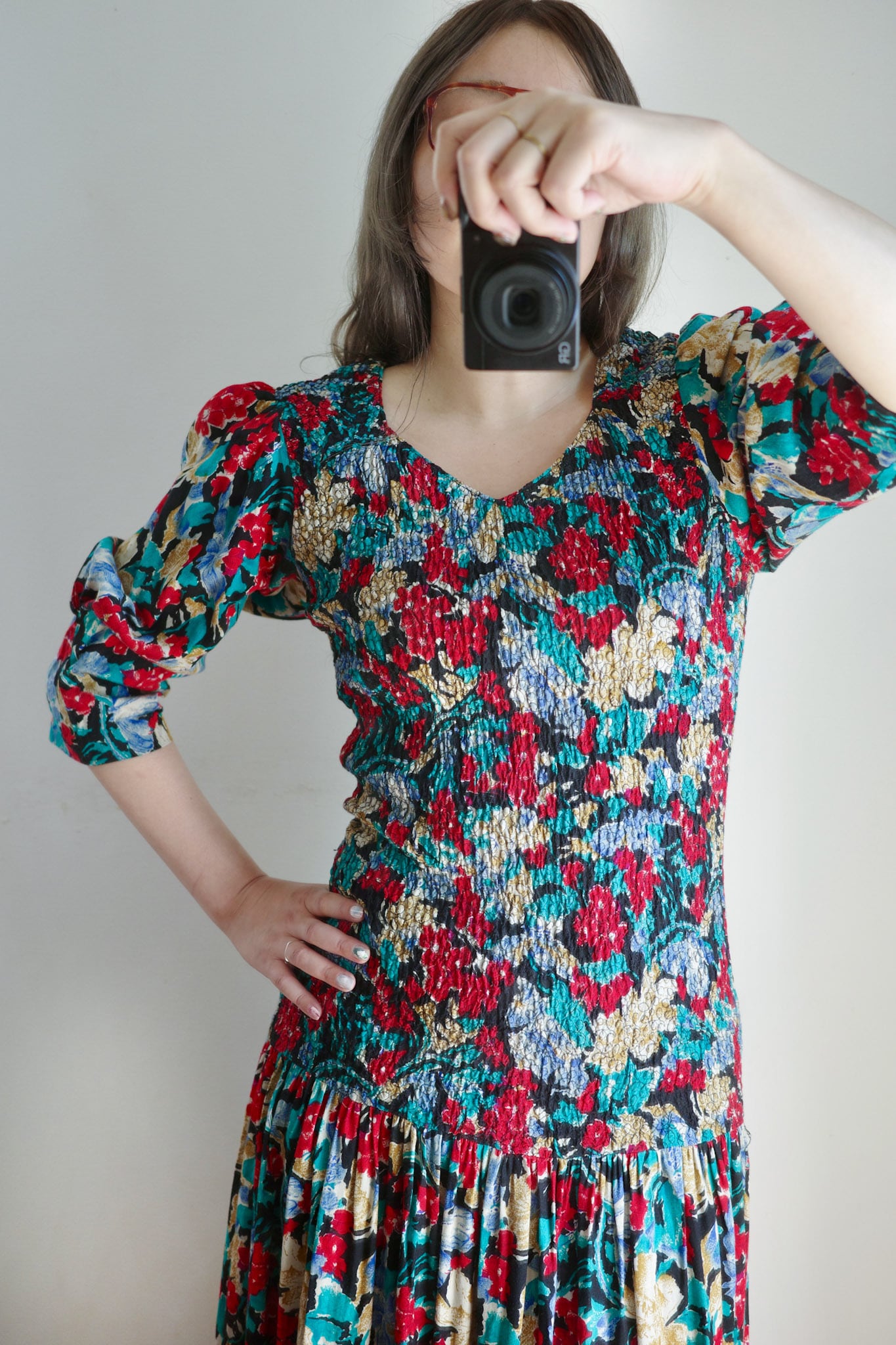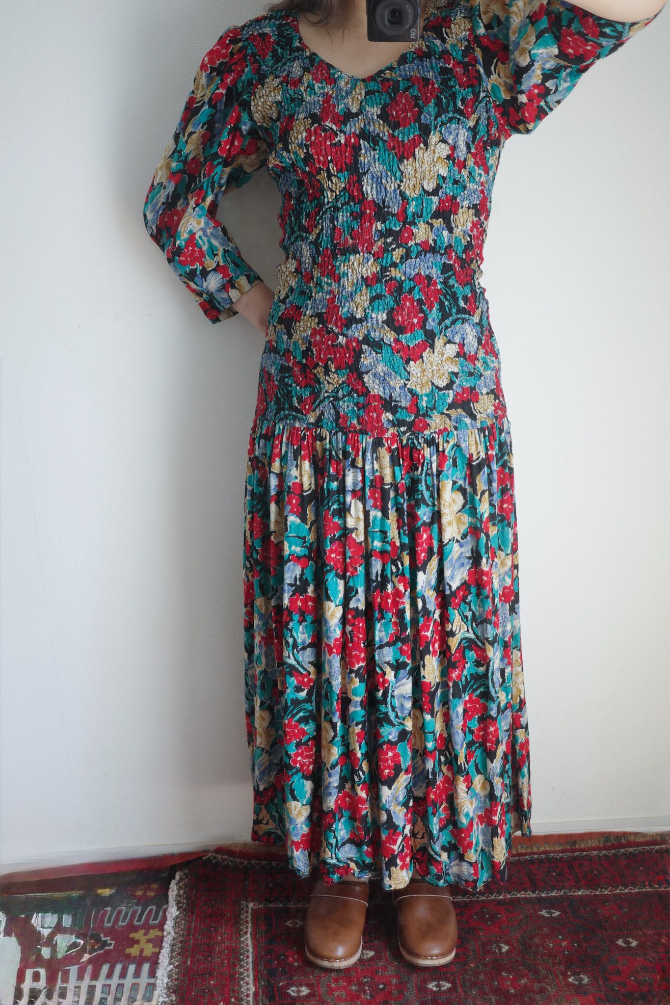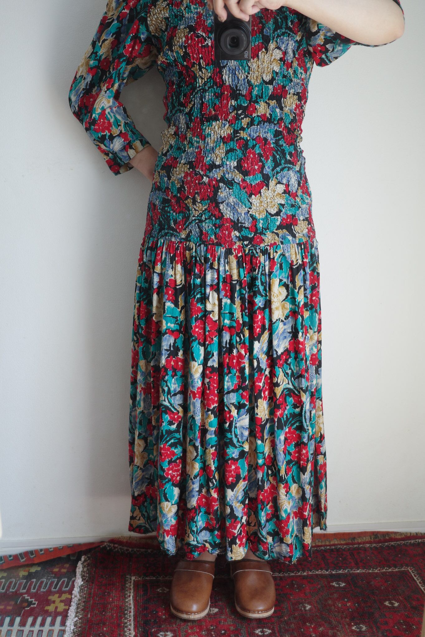 この1970年代のフラワーパターンが特徴的なロングドレスは、ボリュームのあるパフスリーブと鮮やかな花柄が印象的な一着です。優雅なデザインが女性らしさを引き立て、特別な日から普段使いまで幅広くご活用いただけるアイテムです。