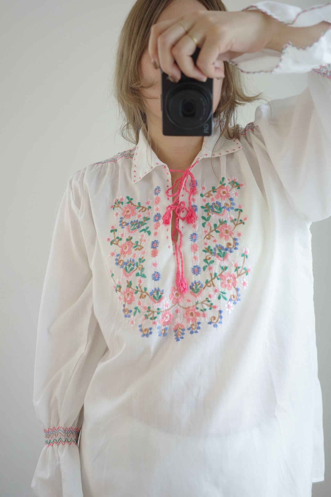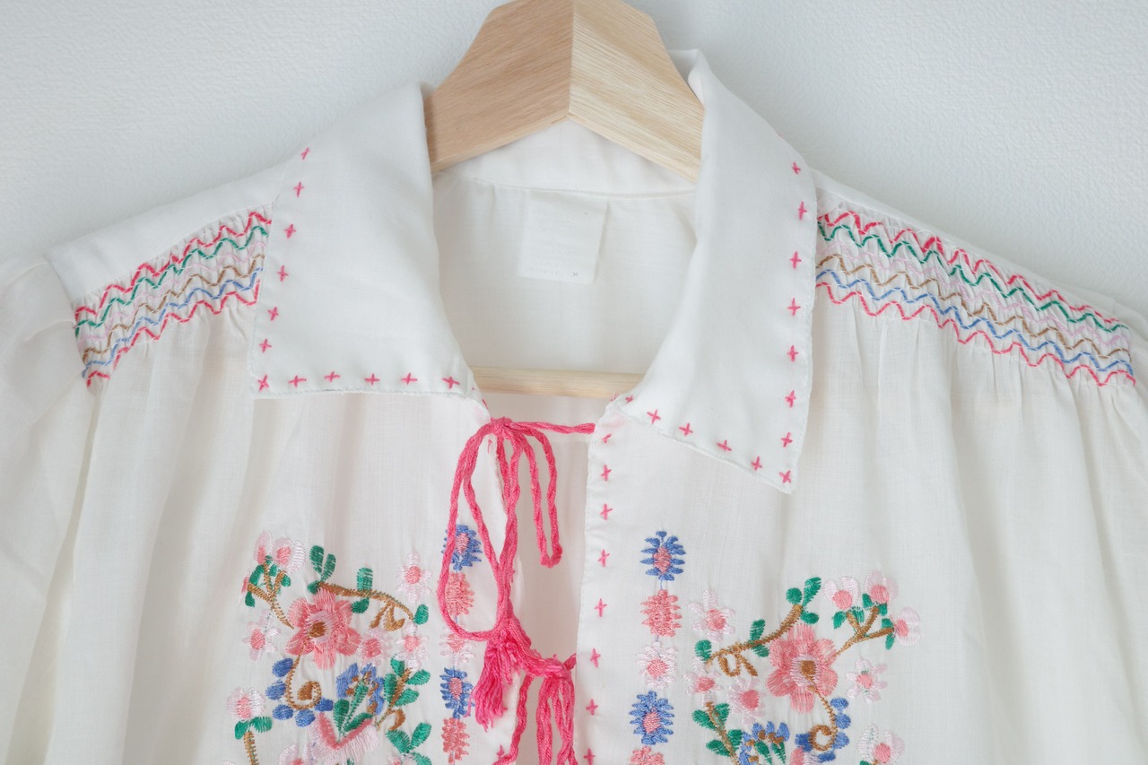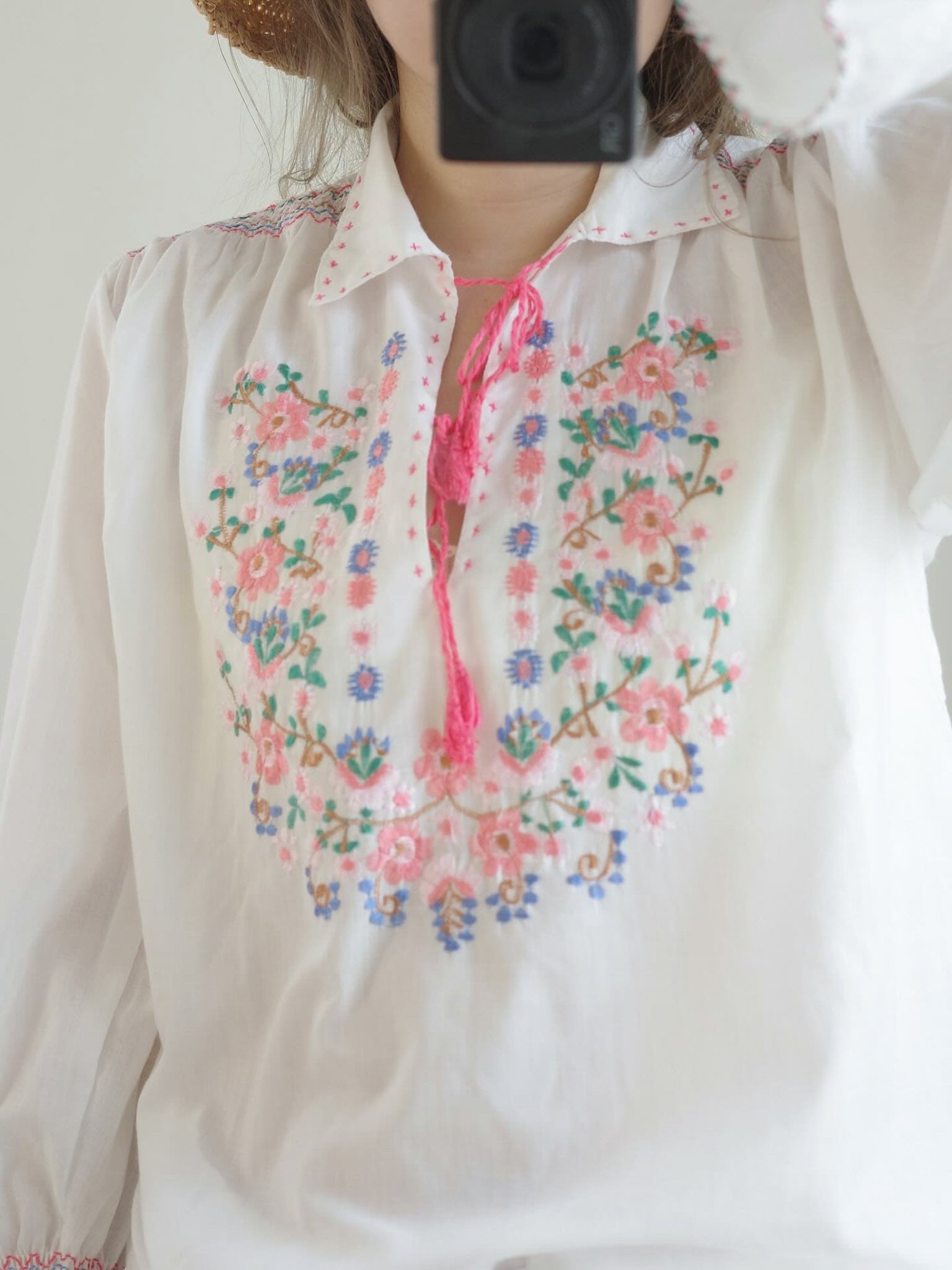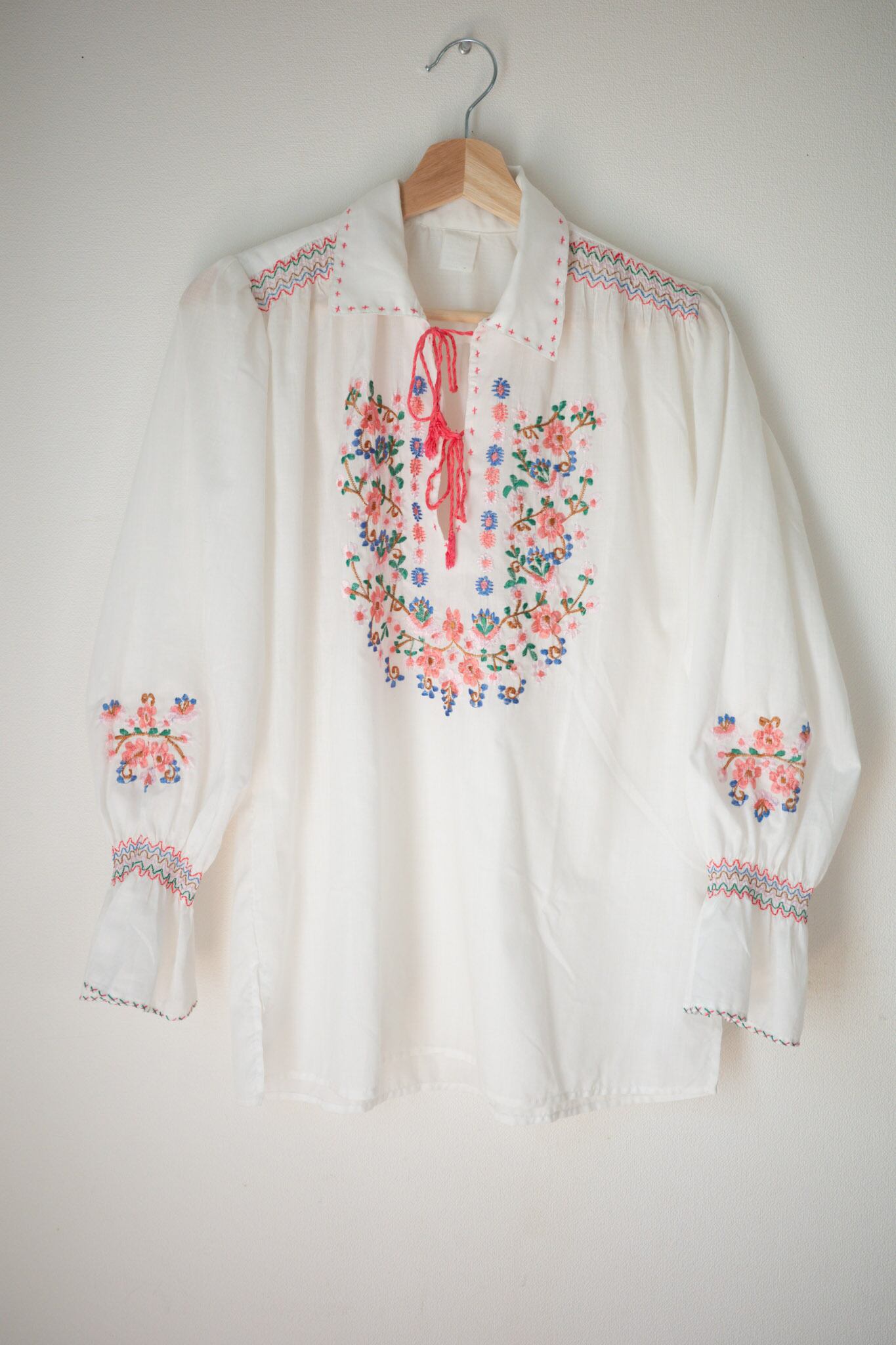 このヴィンテージのハンガリー刺繍フラワーブラウスは、繊細な刺繍と色鮮やかな花柄が魅力的な一着です。エレガントなデザインが目を引き、特別な日のコーディネートやカジュアルな日常使いに最適です。