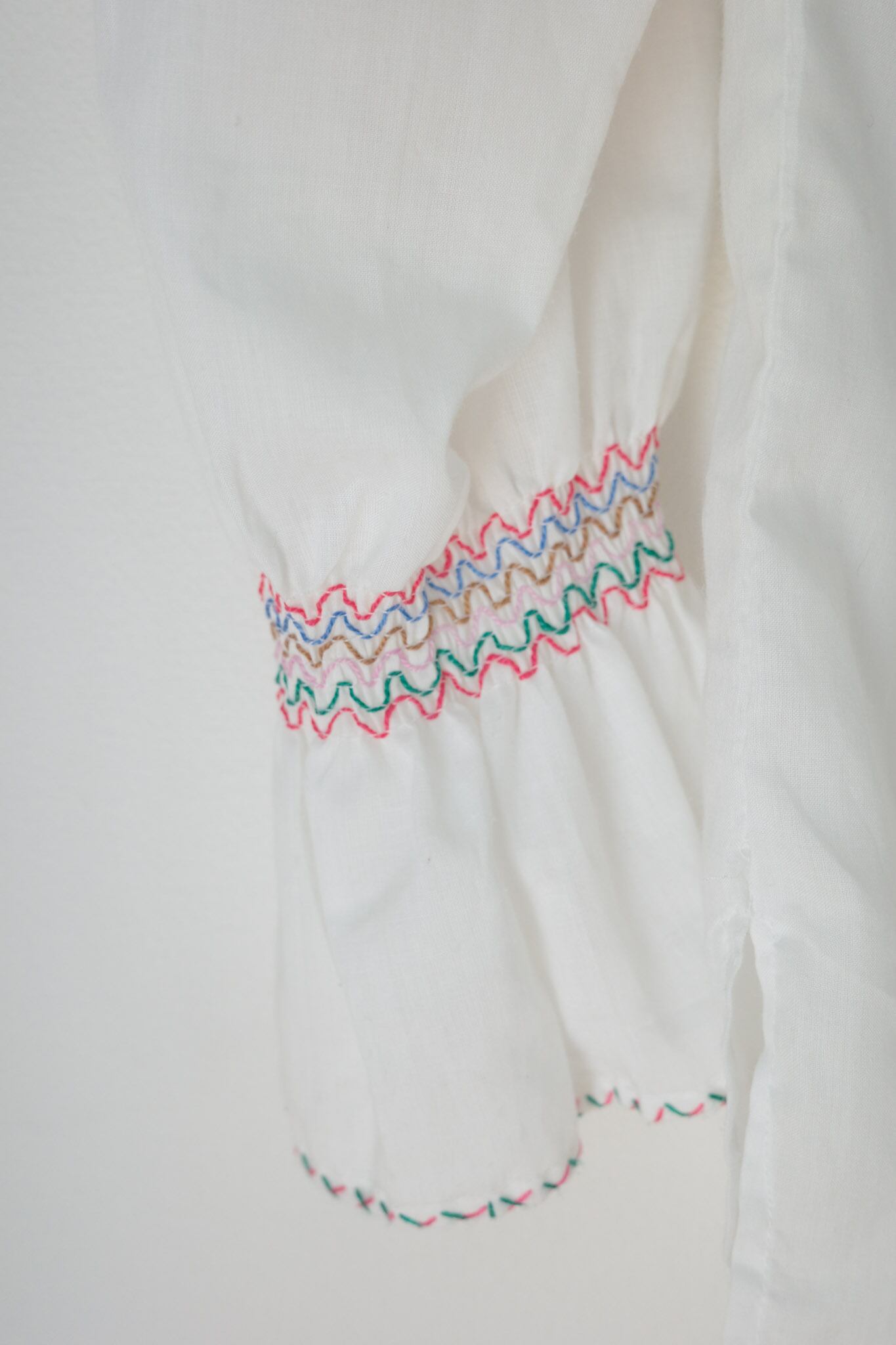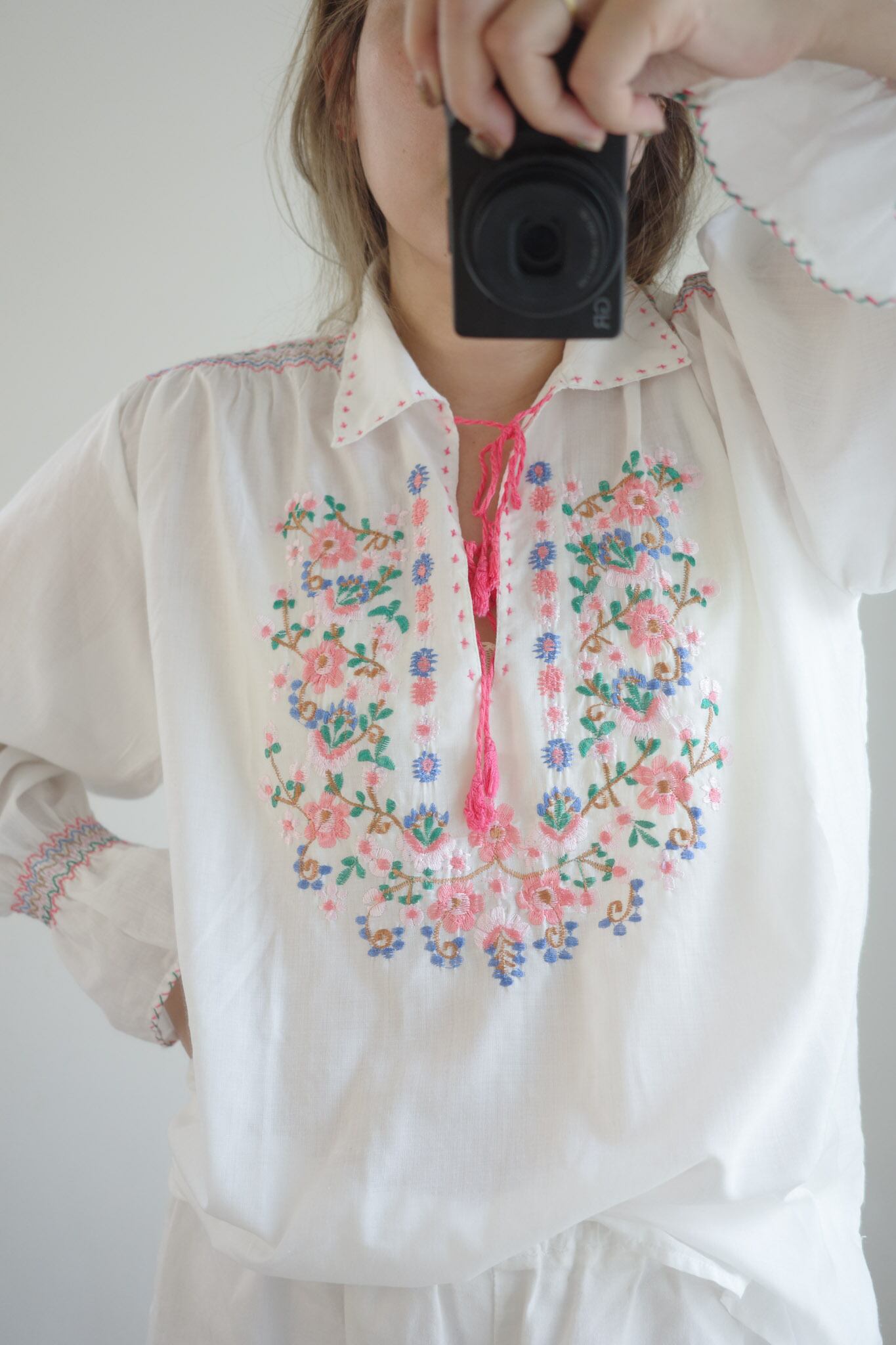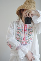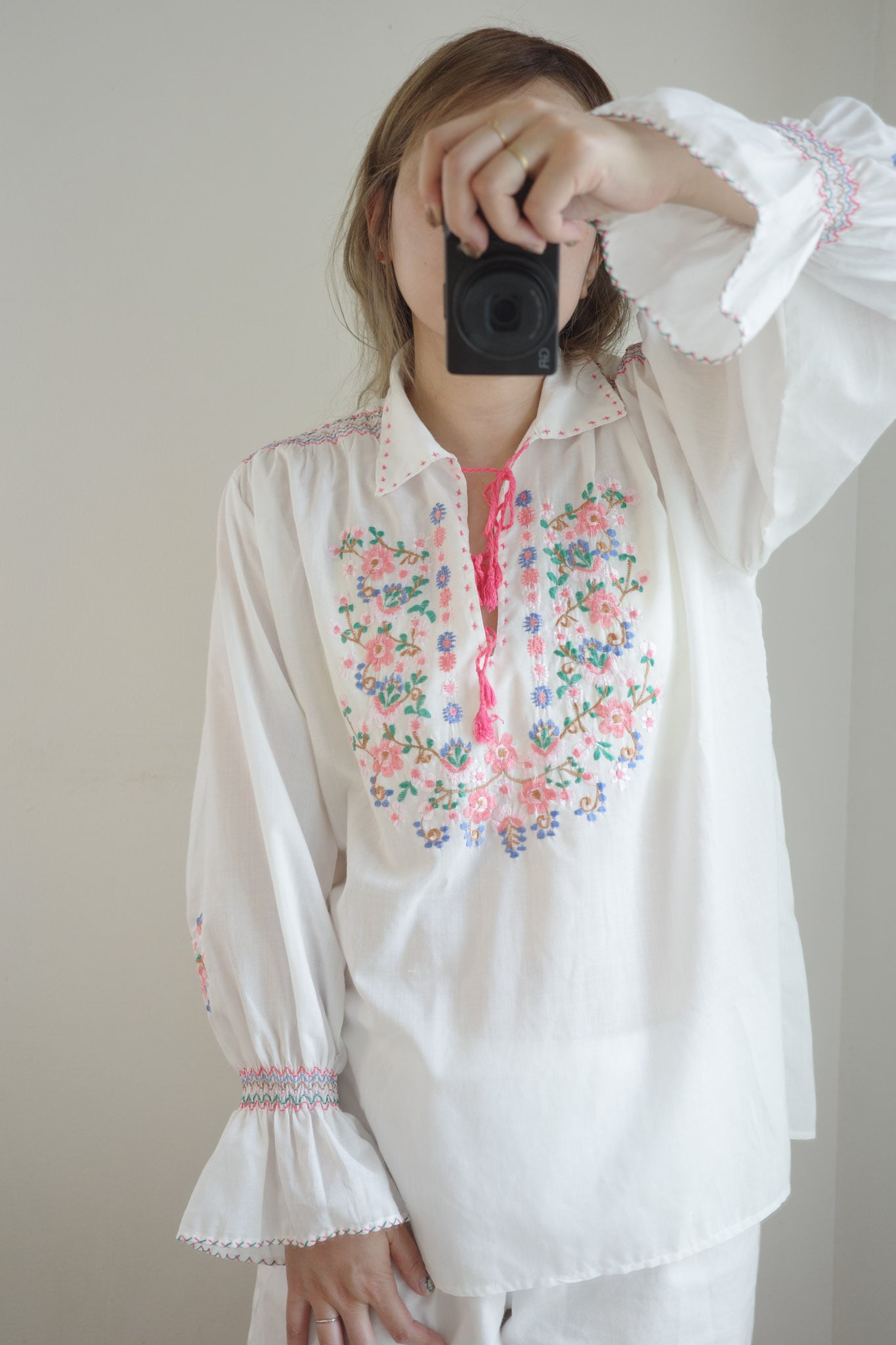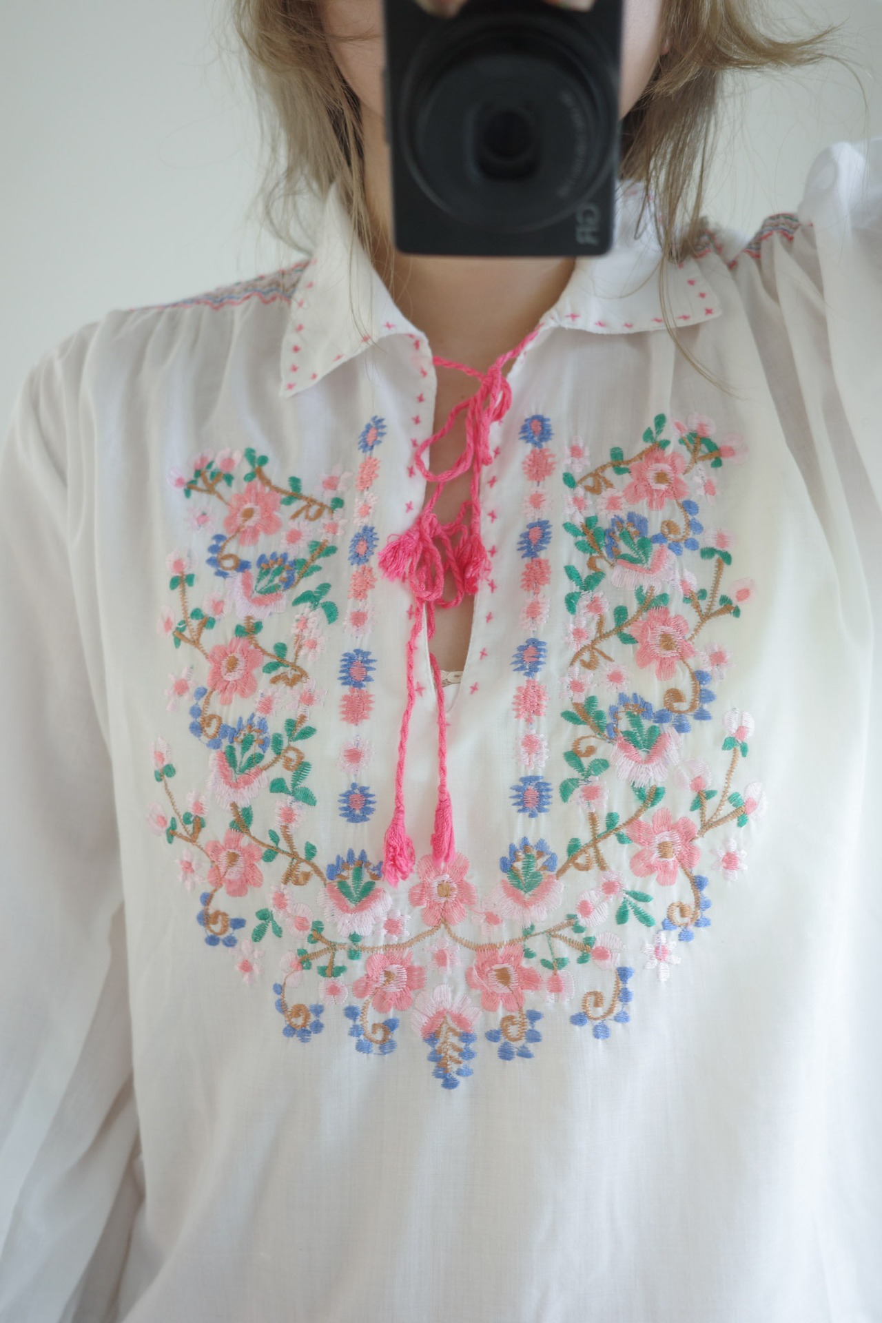 このヴィンテージのハンガリー刺繍フラワーブラウスは、繊細な刺繍と色鮮やかな花柄が魅力的な一着です。エレガントなデザインが目を引き、特別な日のコーディネートやカジュアルな日常使いに最適です。