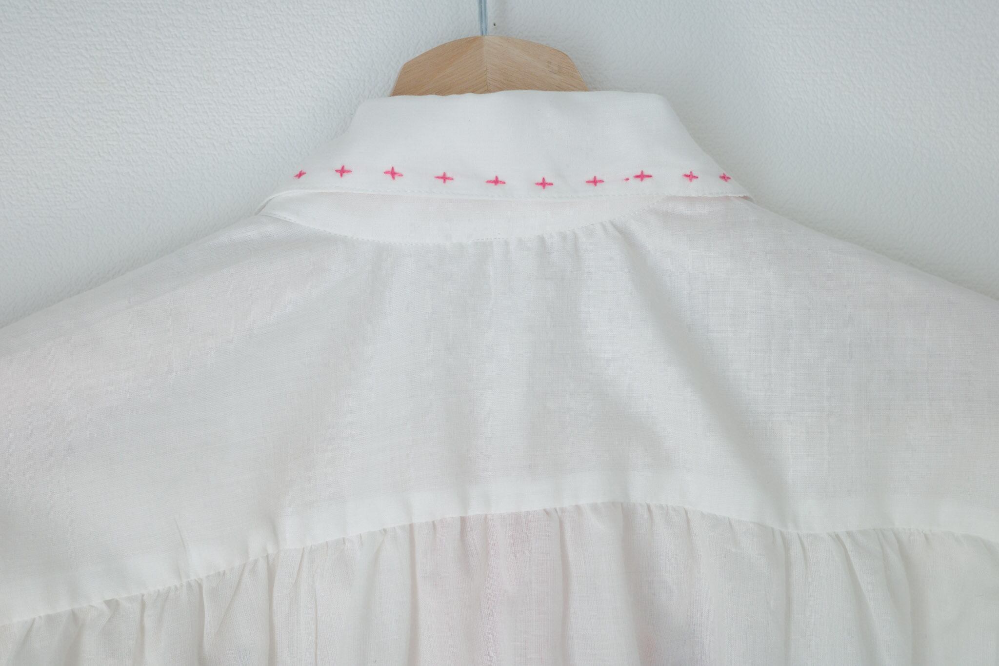 デザインのポイントは、花柄の刺繍が細部に施されていることで、胸元と袖口に華やかなカラーで施されていいます。