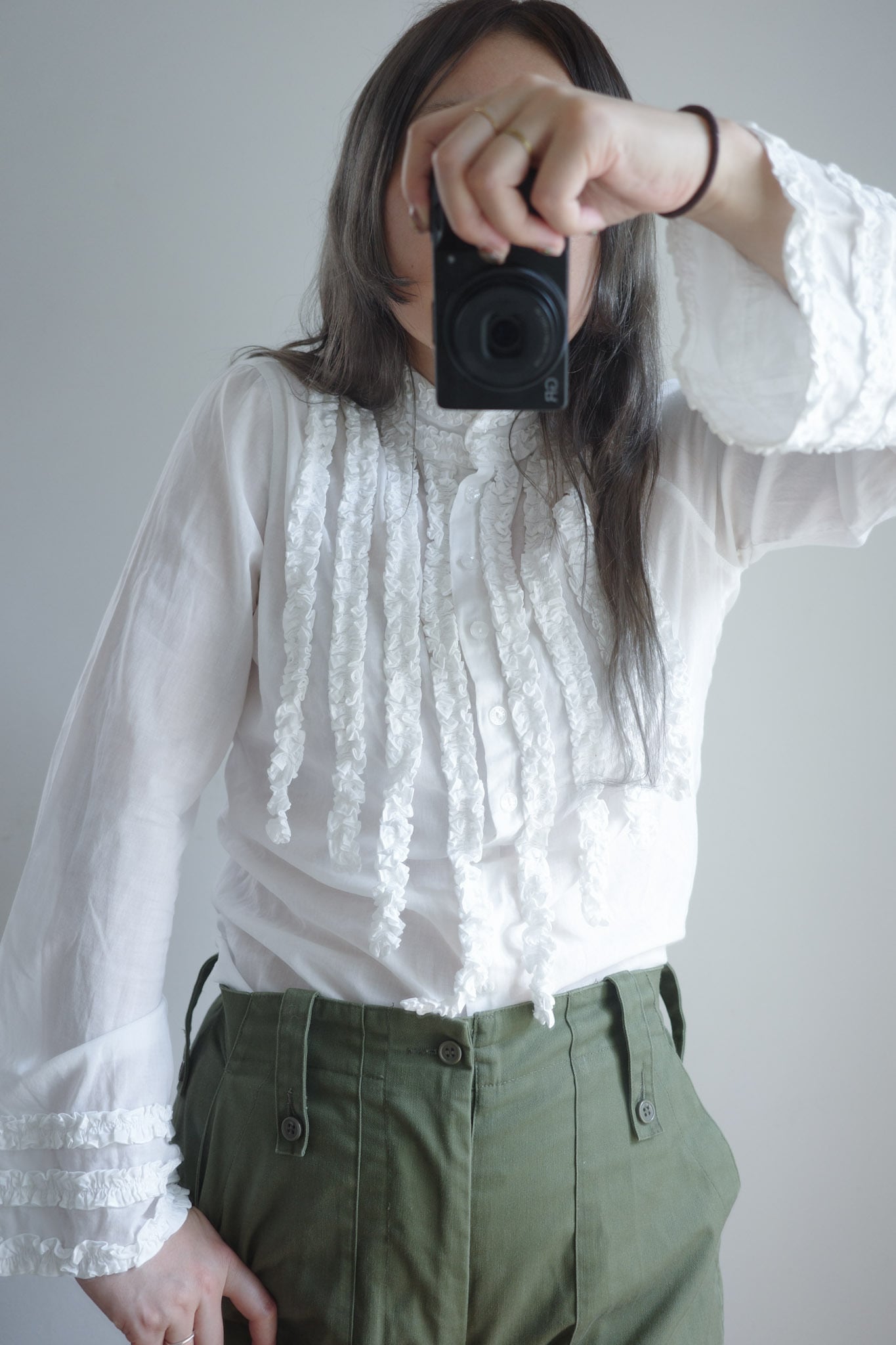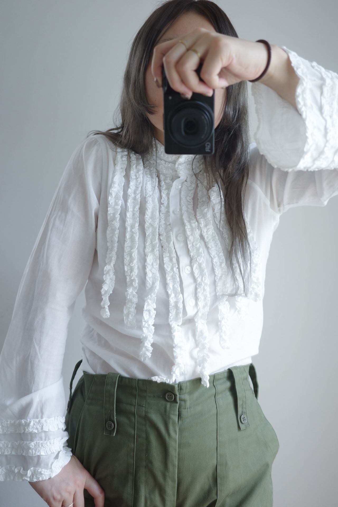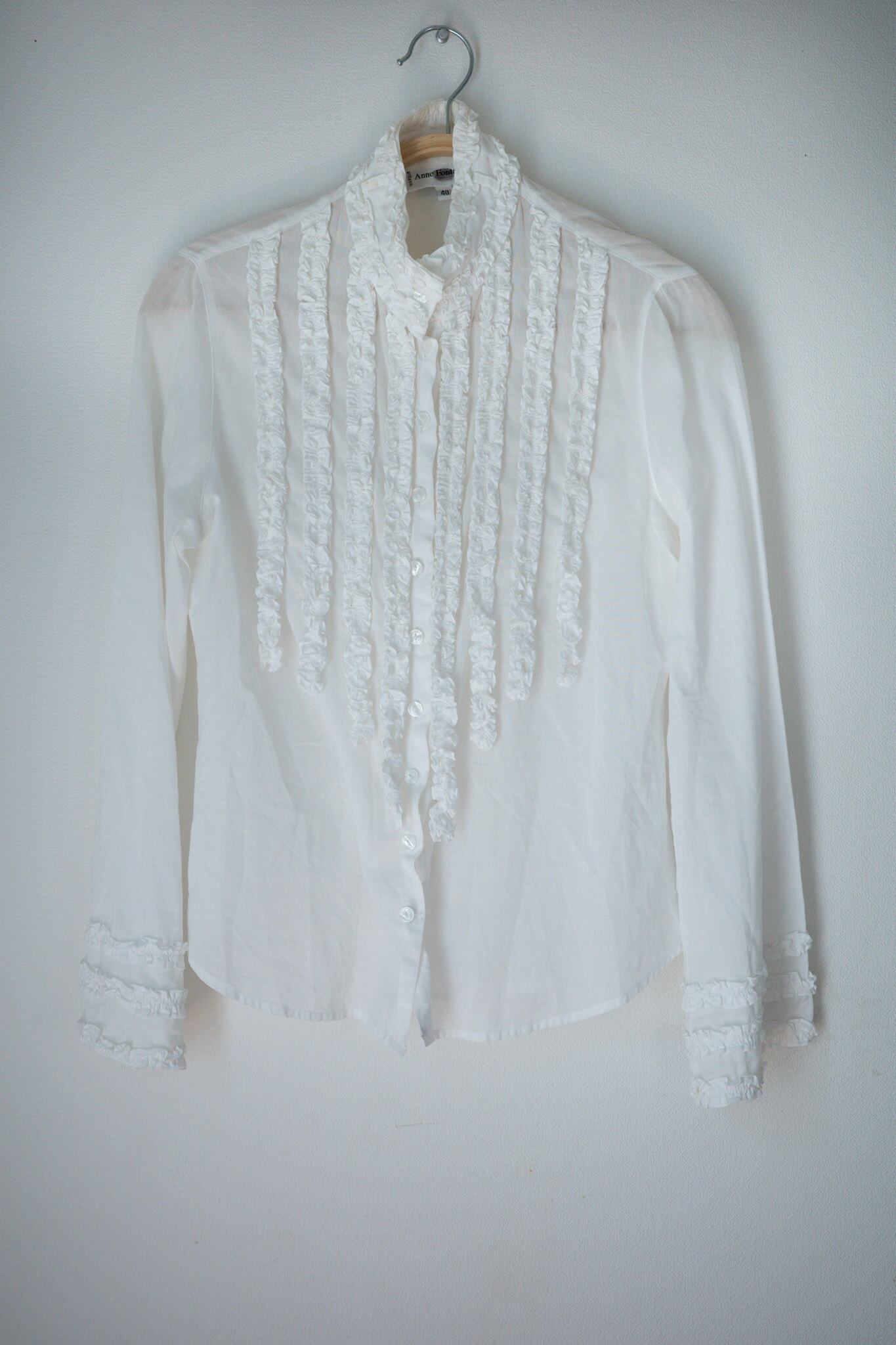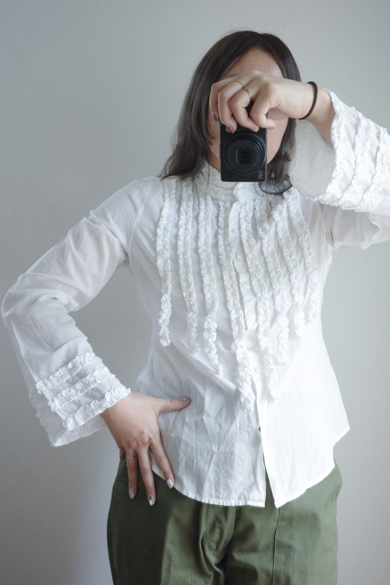 このヴィンテージのホワイトフリルブラウスは、繊細なフリルデザインとクラシックなスタイルが特徴的な一着です。優雅なシルエットが女性らしさを引き立て、カジュアルな日常使いから特別なシーンまで幅広く活躍すること間違いありません。