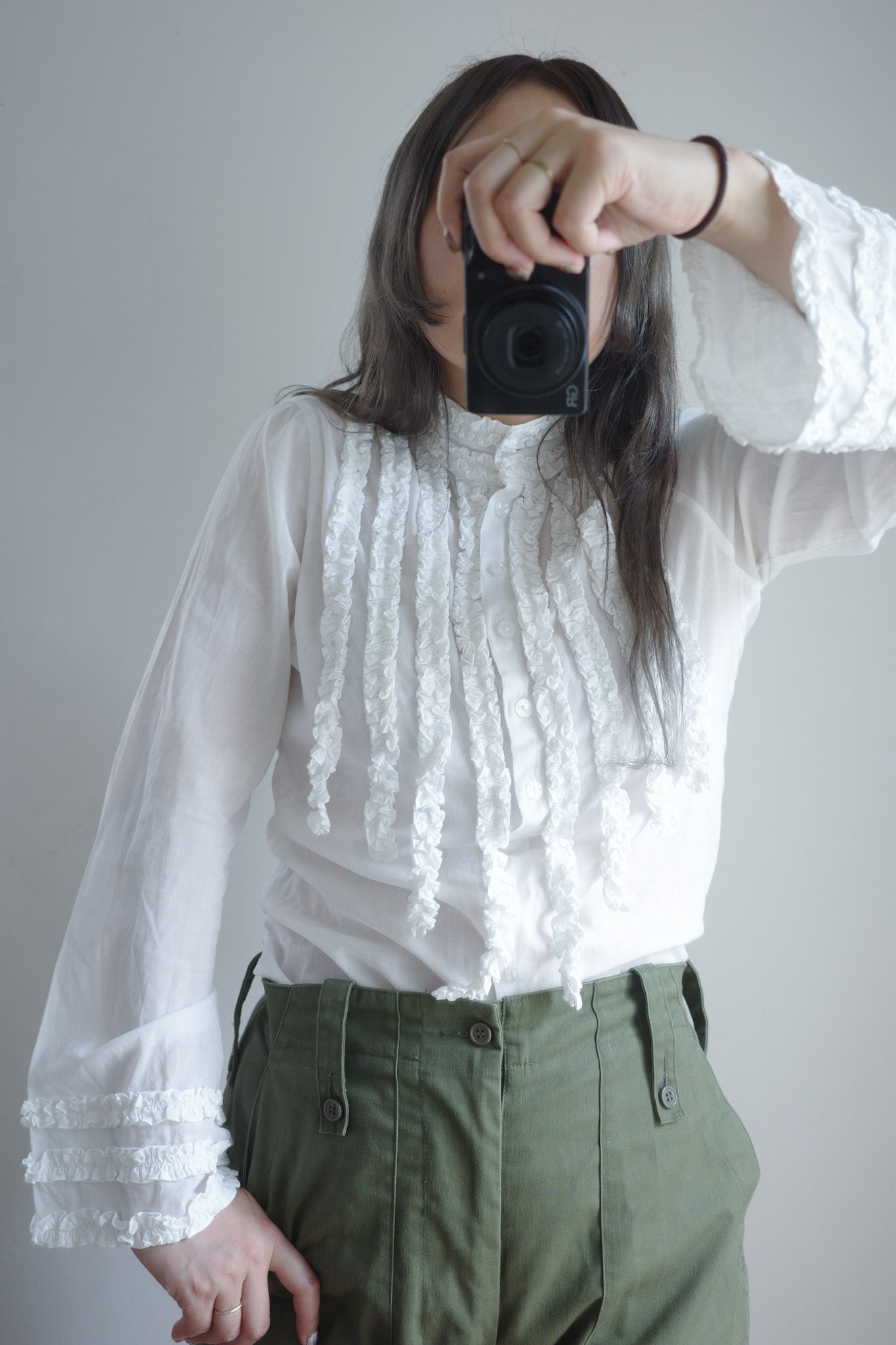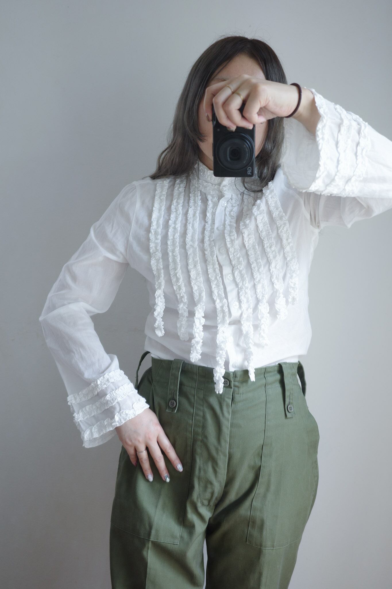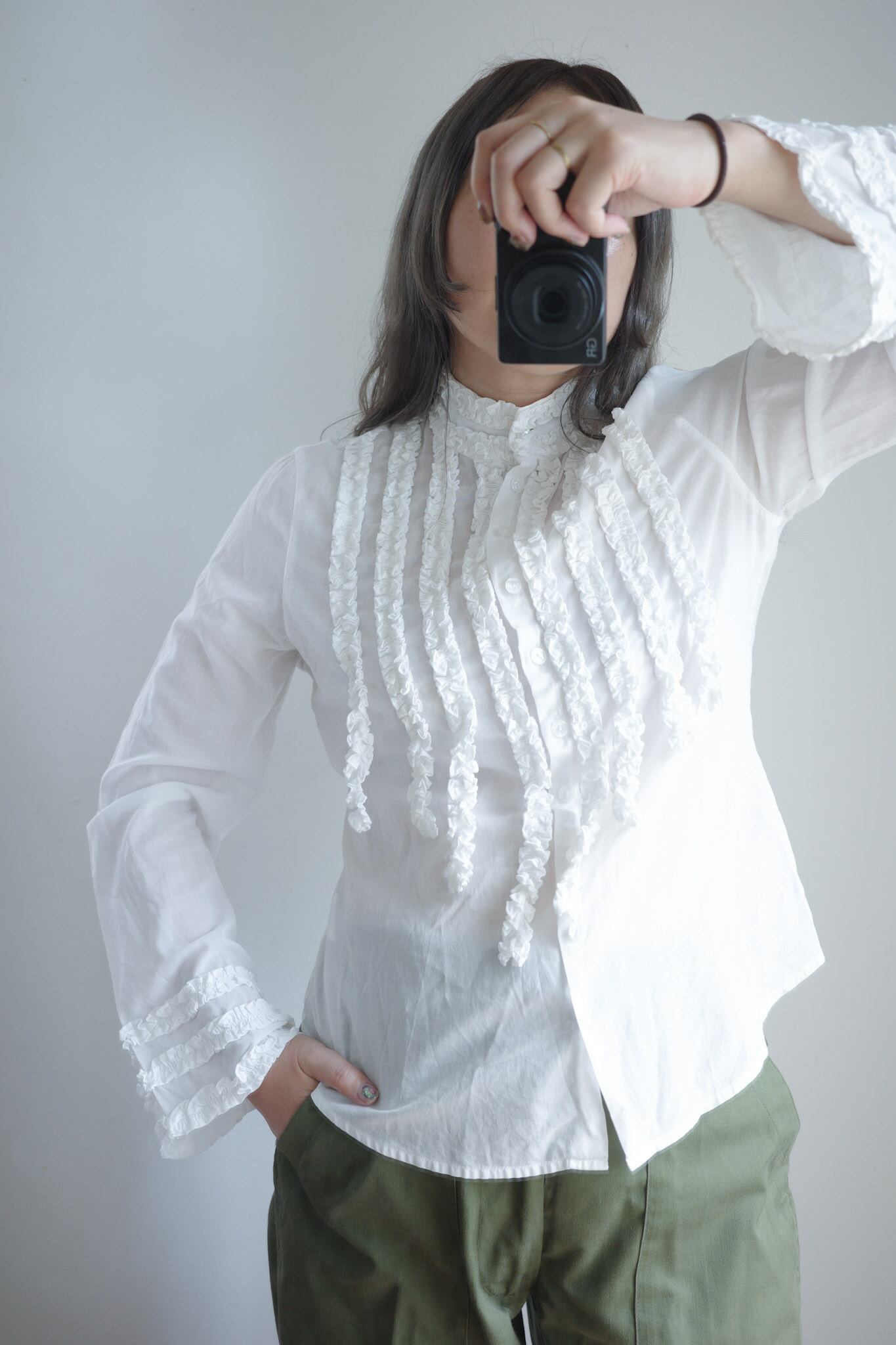 このヴィンテージのホワイトフリルブラウスは、繊細なフリルデザインとクラシックなスタイルが特徴的な一着です。優雅なシルエットが女性らしさを引き立て、カジュアルな日常使いから特別なシーンまで幅広く活躍すること間違いありません。