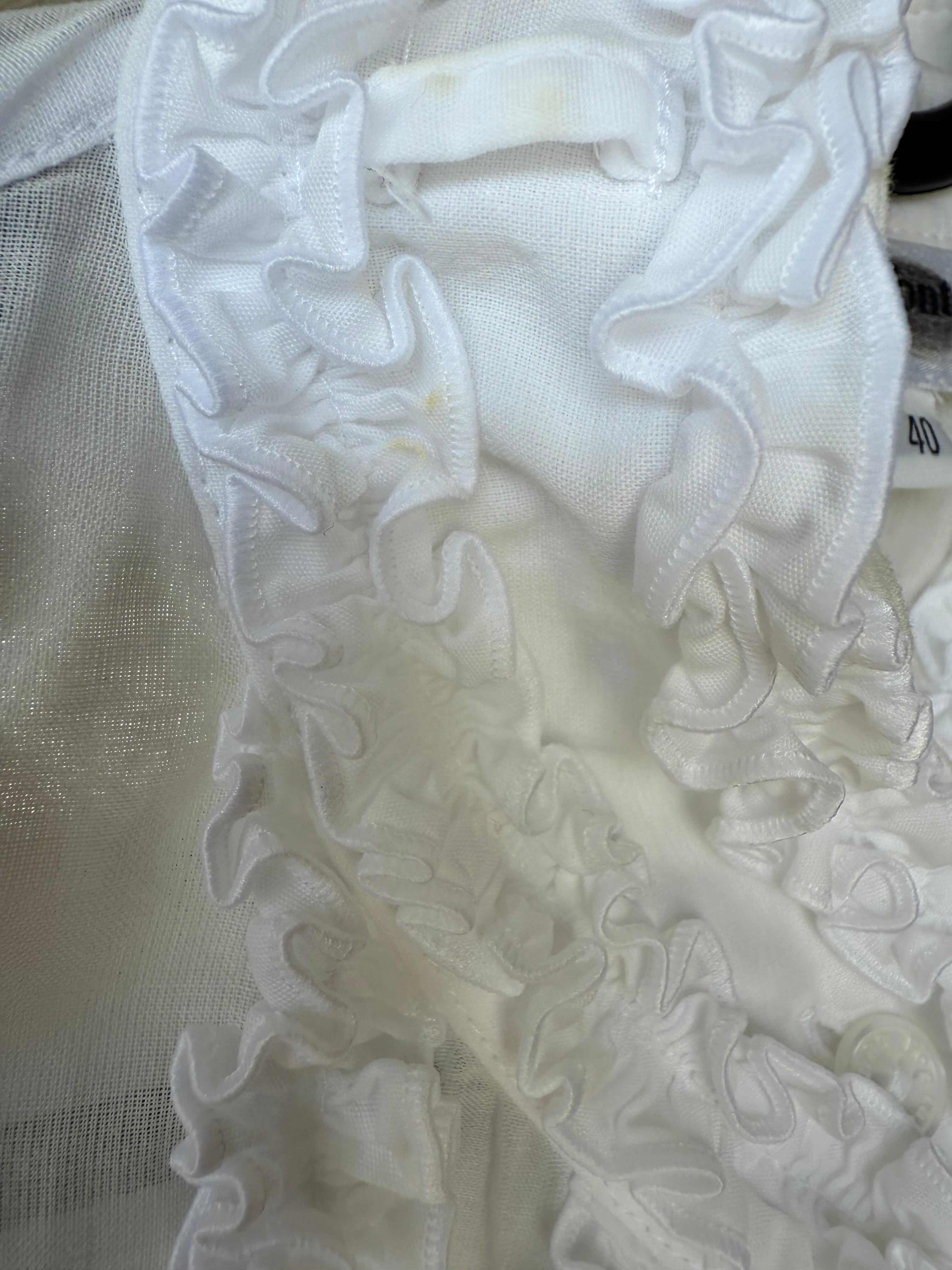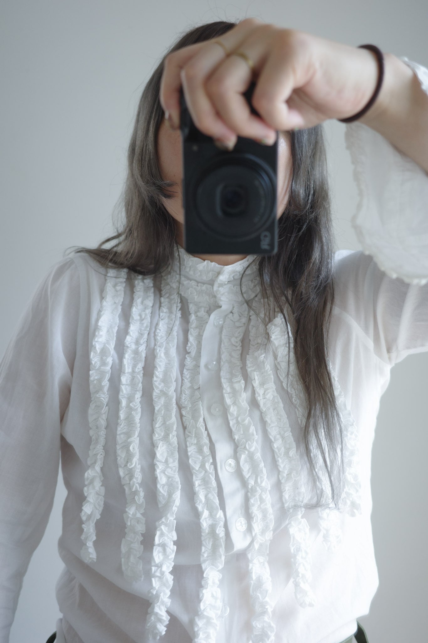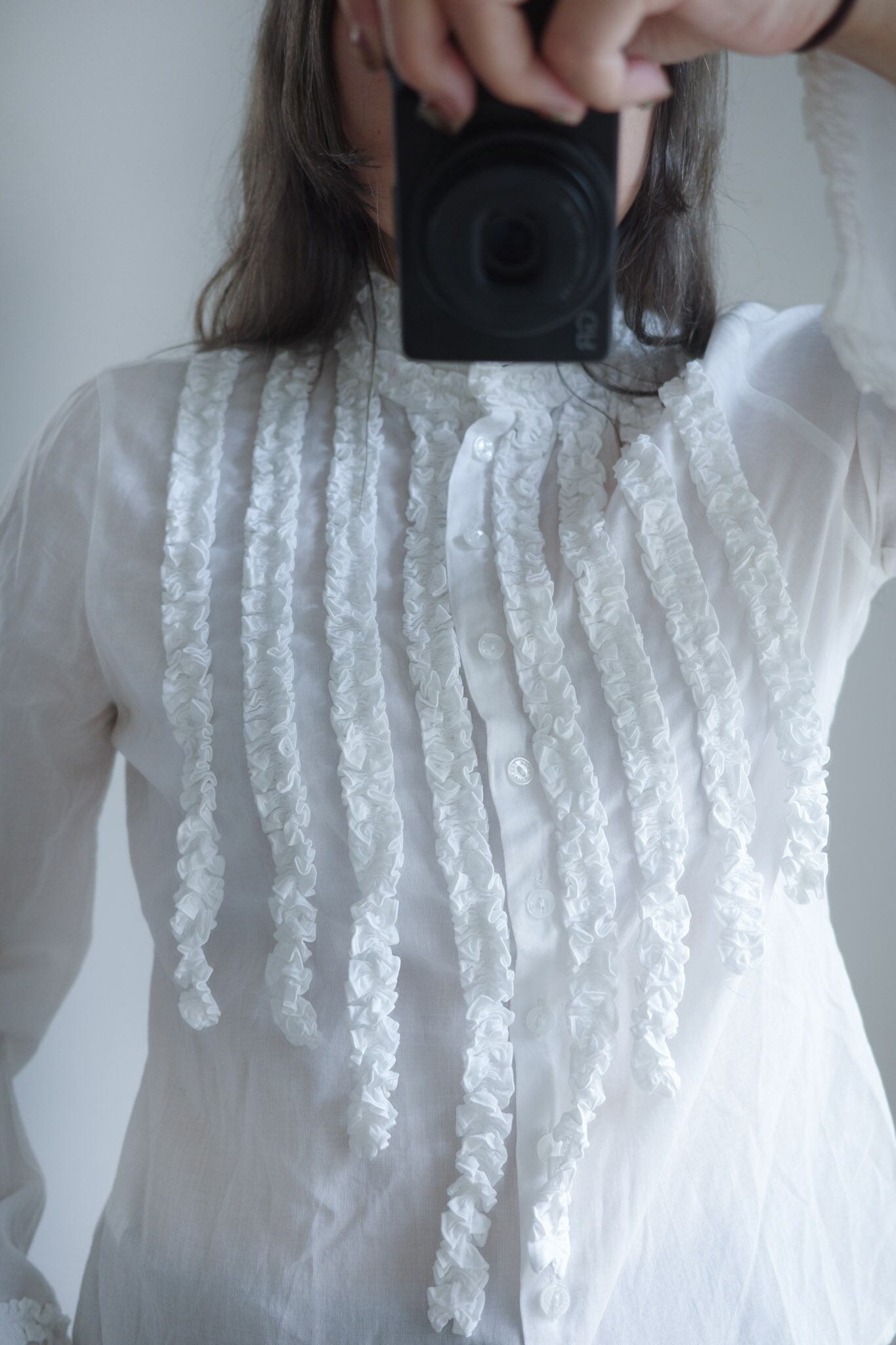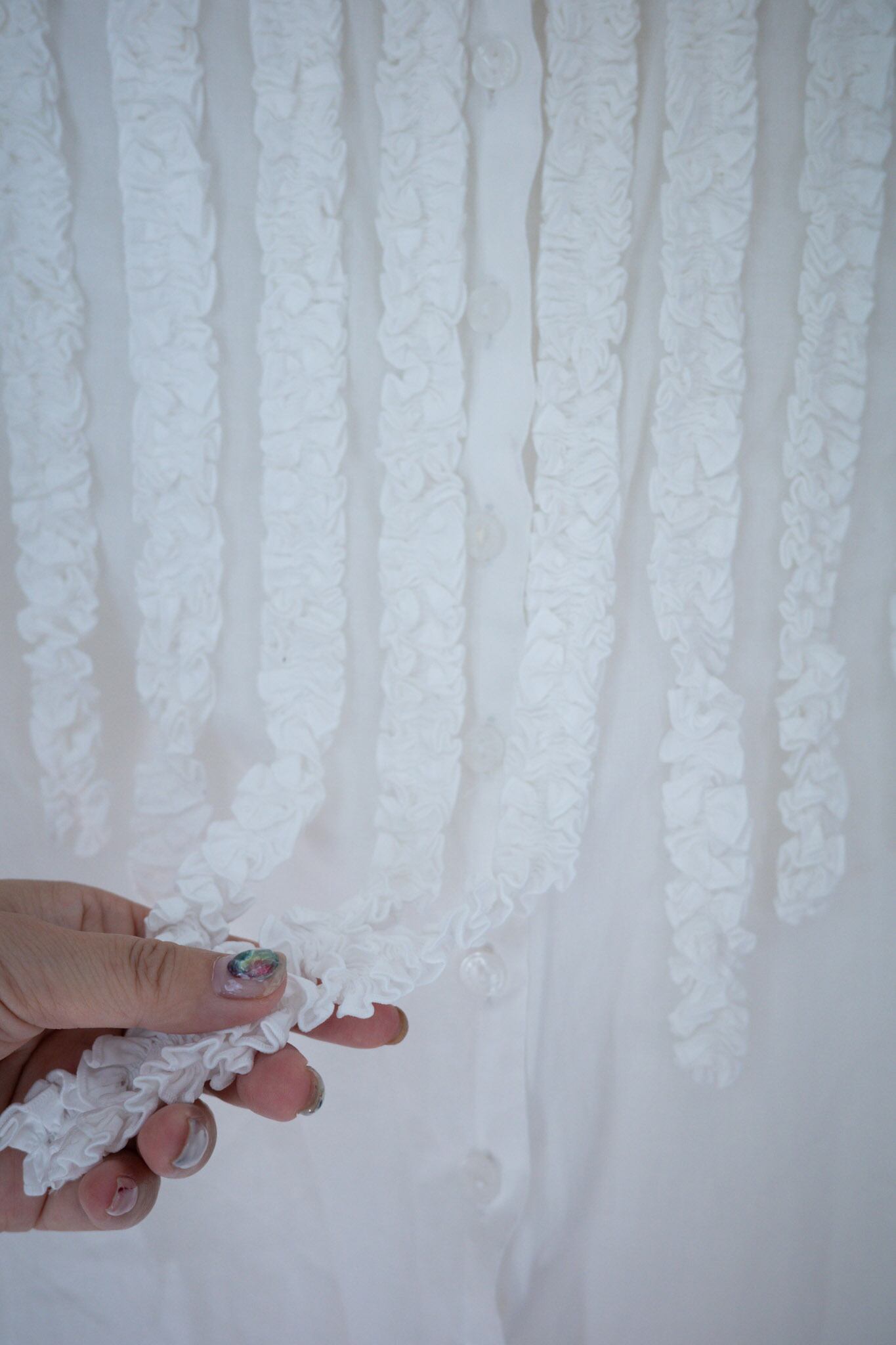 このヴィンテージのホワイトフリルブラウスは、繊細なフリルデザインとクラシックなスタイルが特徴的な一着です。優雅なシルエットが女性らしさを引き立て、カジュアルな日常使いから特別なシーンまで幅広く活躍すること間違いありません。
