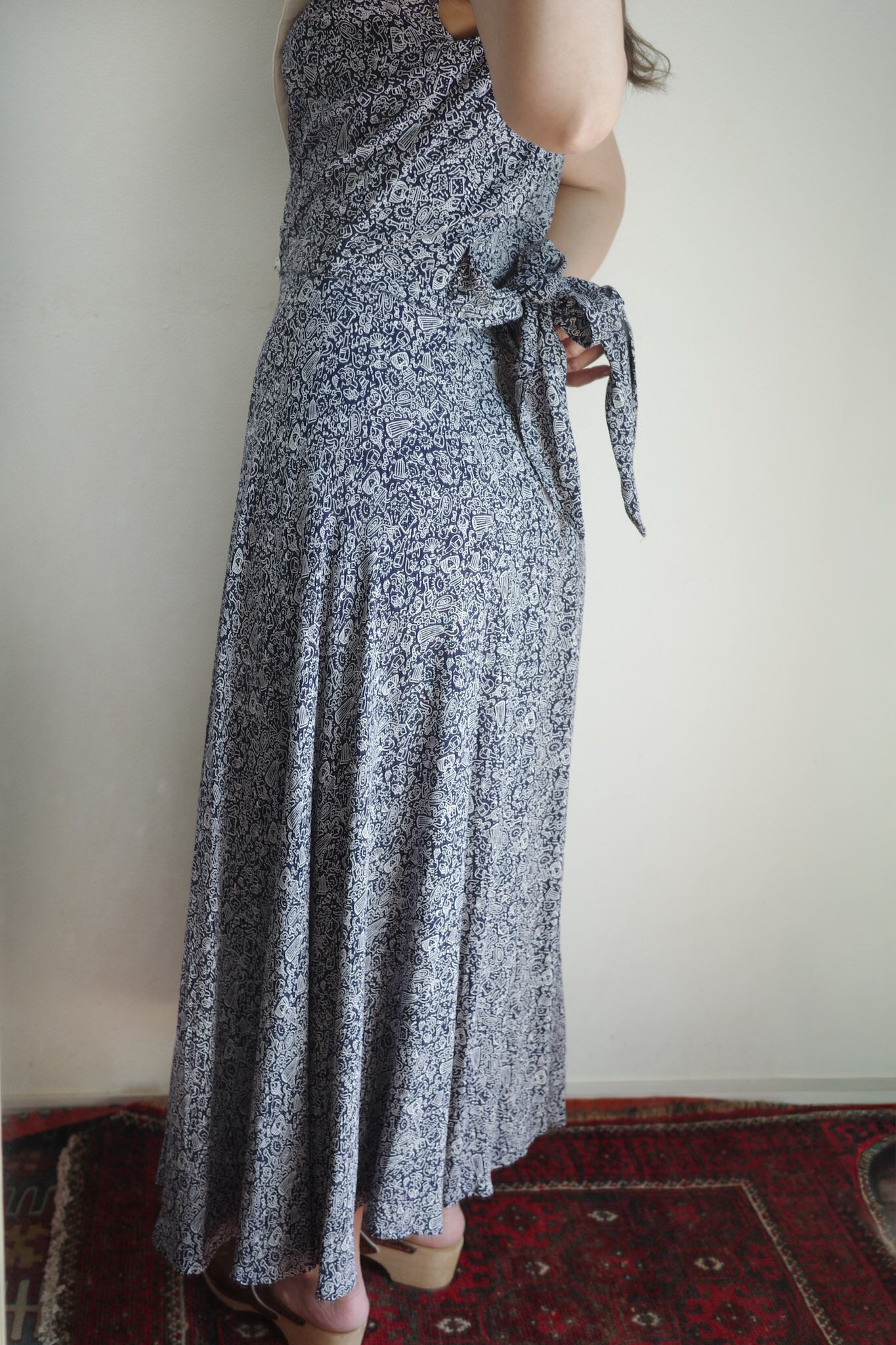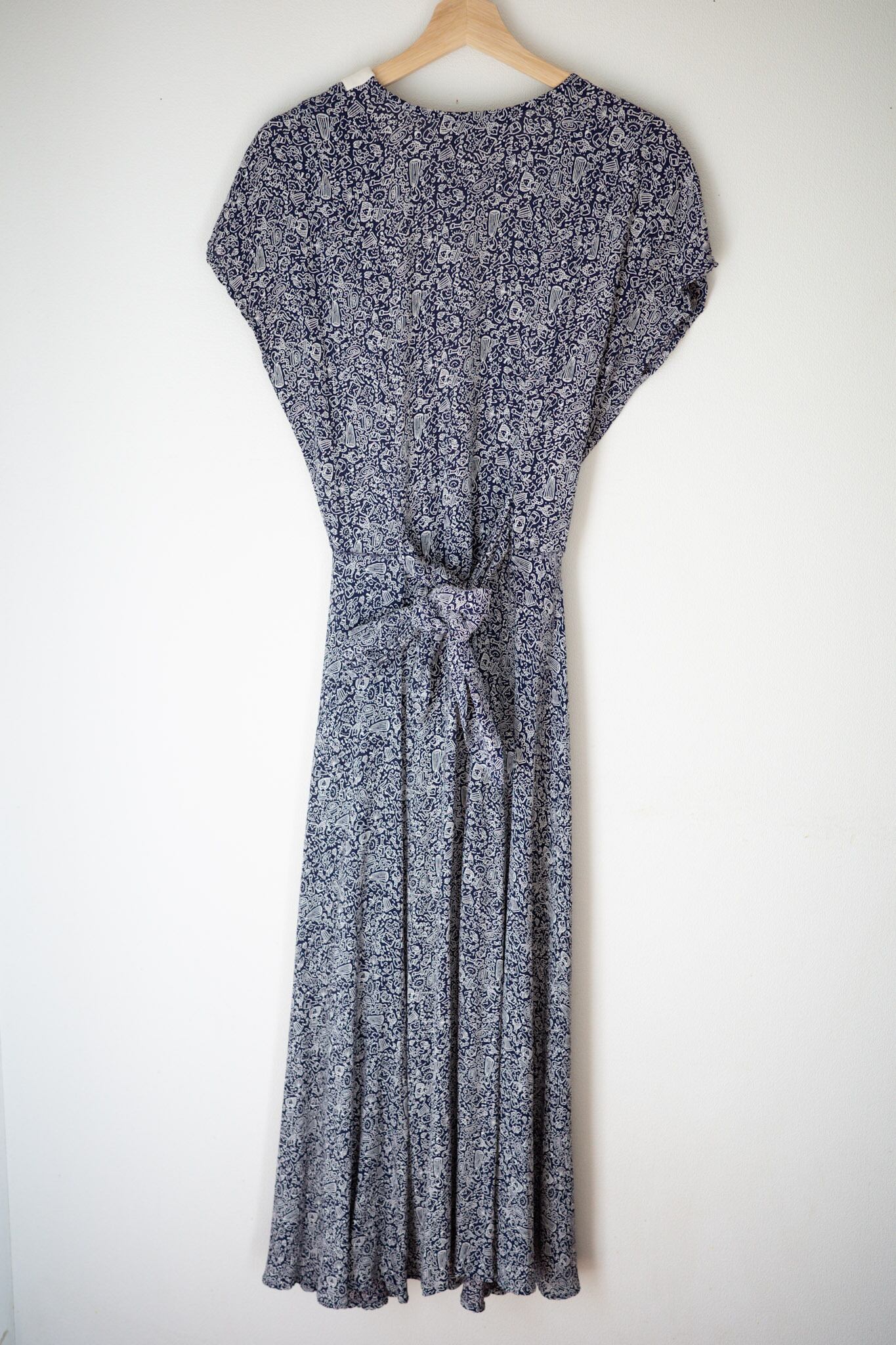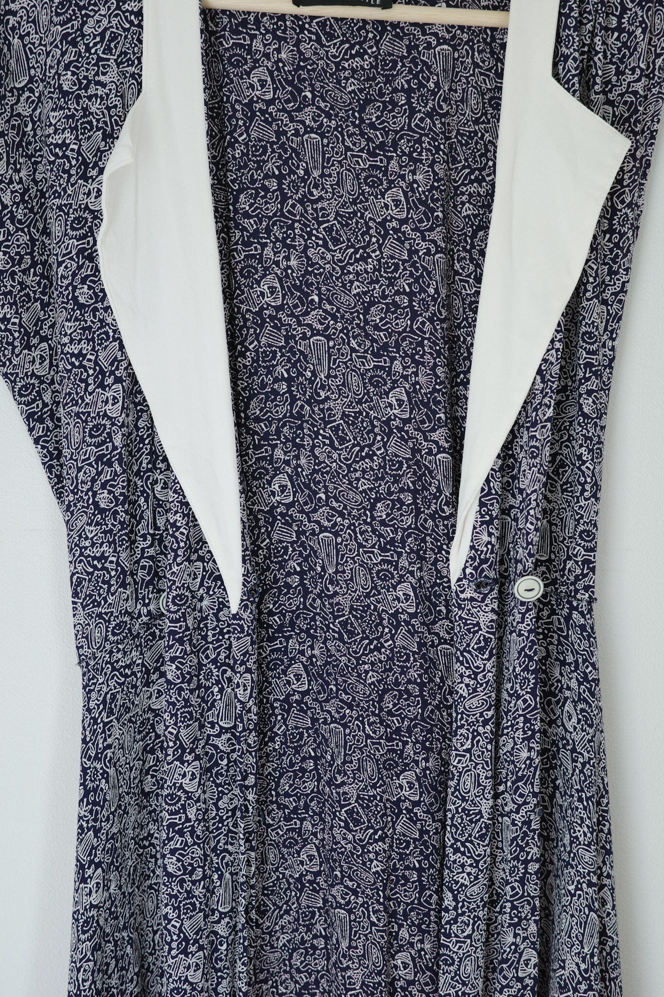 この1980年代のヴィンテージラップロングドレスは、ユニークなパターンとエレガントなホワイトカラーな襟元が特徴的な一着です。フロントに施されたホワイトカラーの襟が、シンプルながらも華やかな印象を与え、様々なシーンで活躍すること間違いなしです。