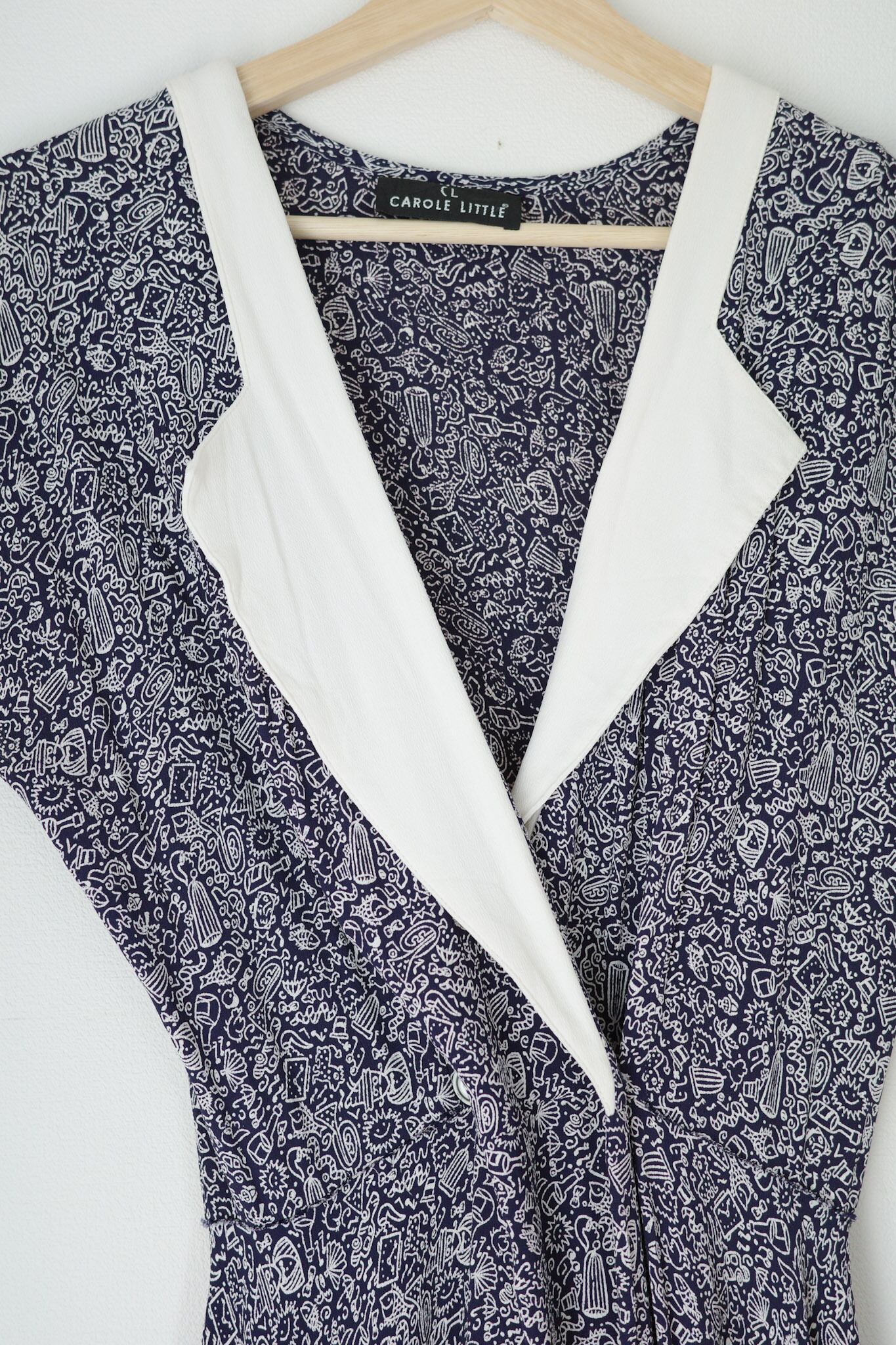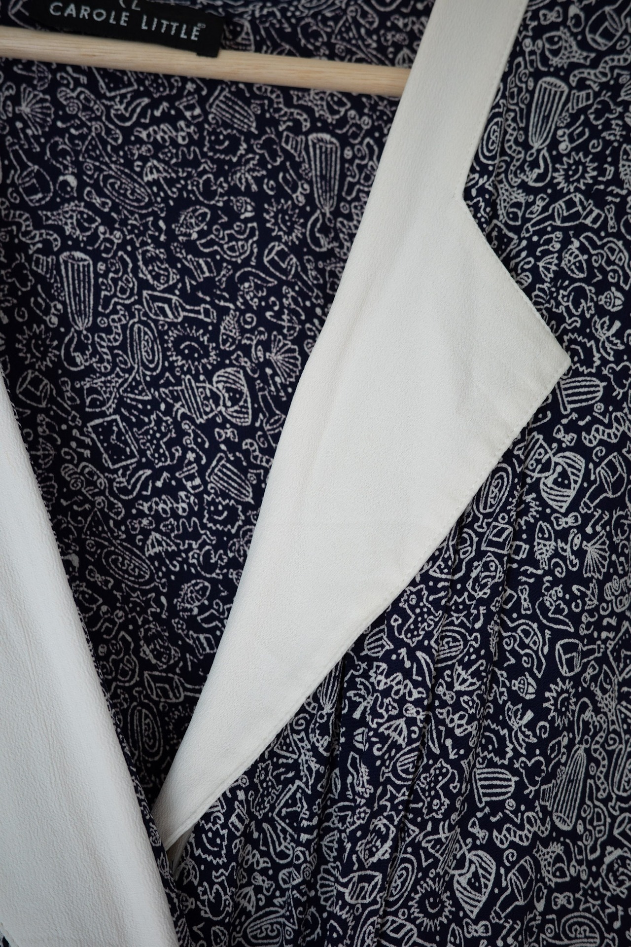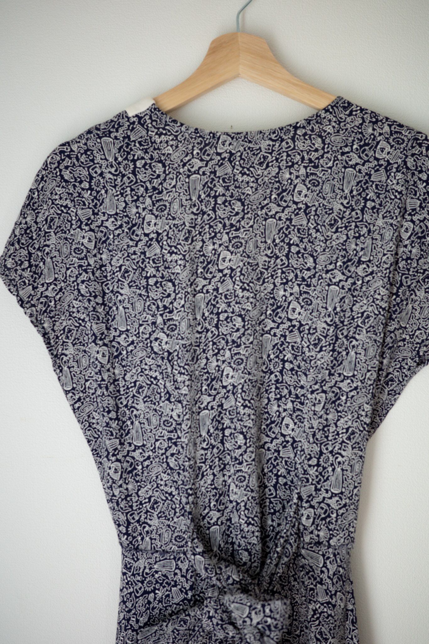 この1980年代のヴィンテージラップロングドレスは、ユニークなパターンとエレガントなホワイトカラーな襟元が特徴的な一着です。フロントに施されたホワイトカラーの襟が、シンプルながらも華やかな印象を与え、様々なシーンで活躍すること間違いなしです。