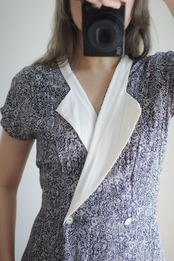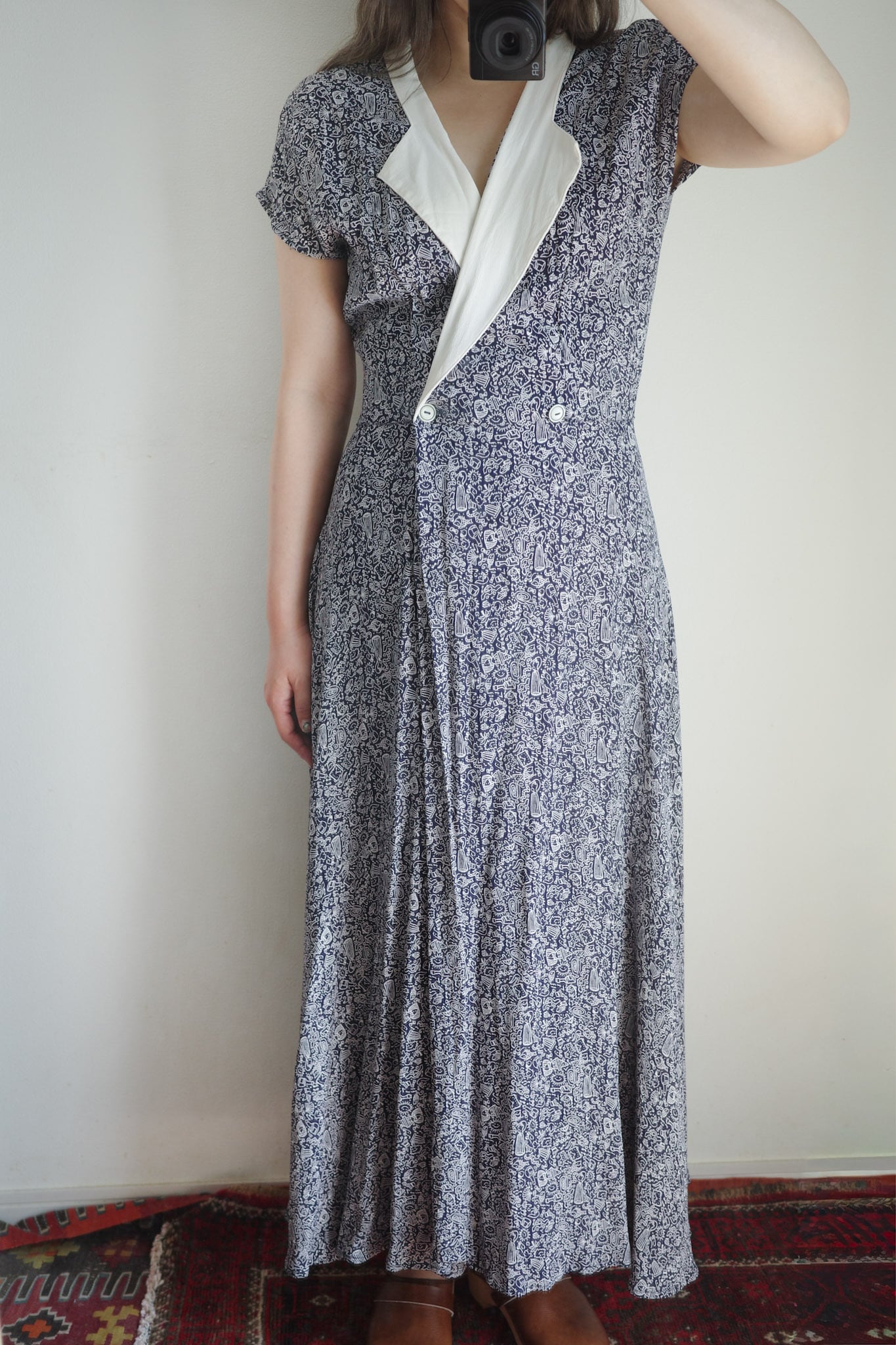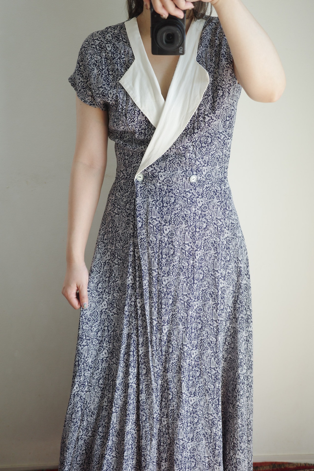 ■ 1980's vintage unuasal pattern white collar wrap long dress