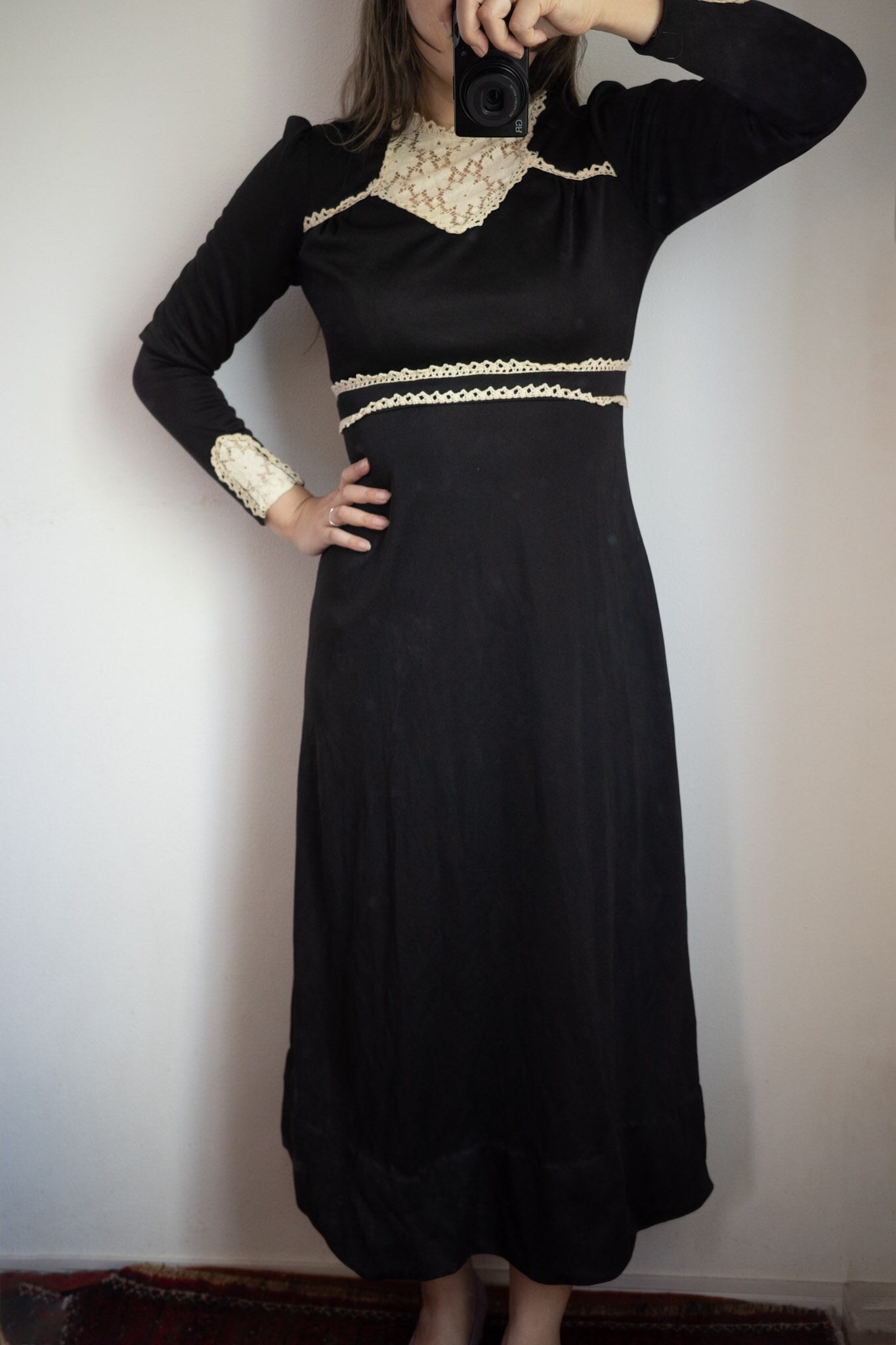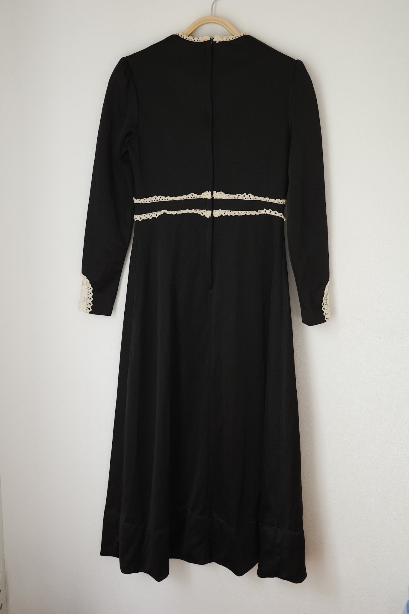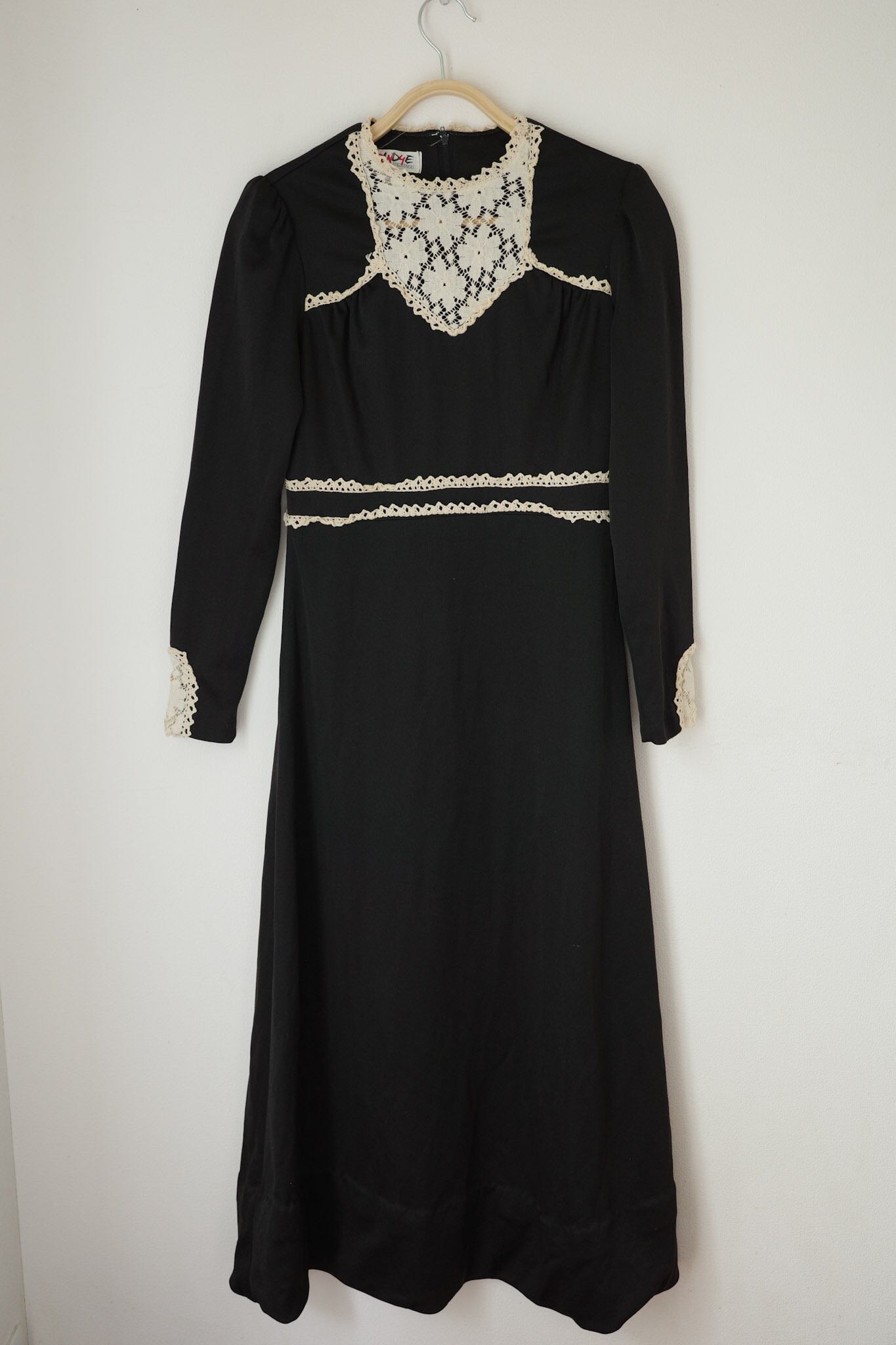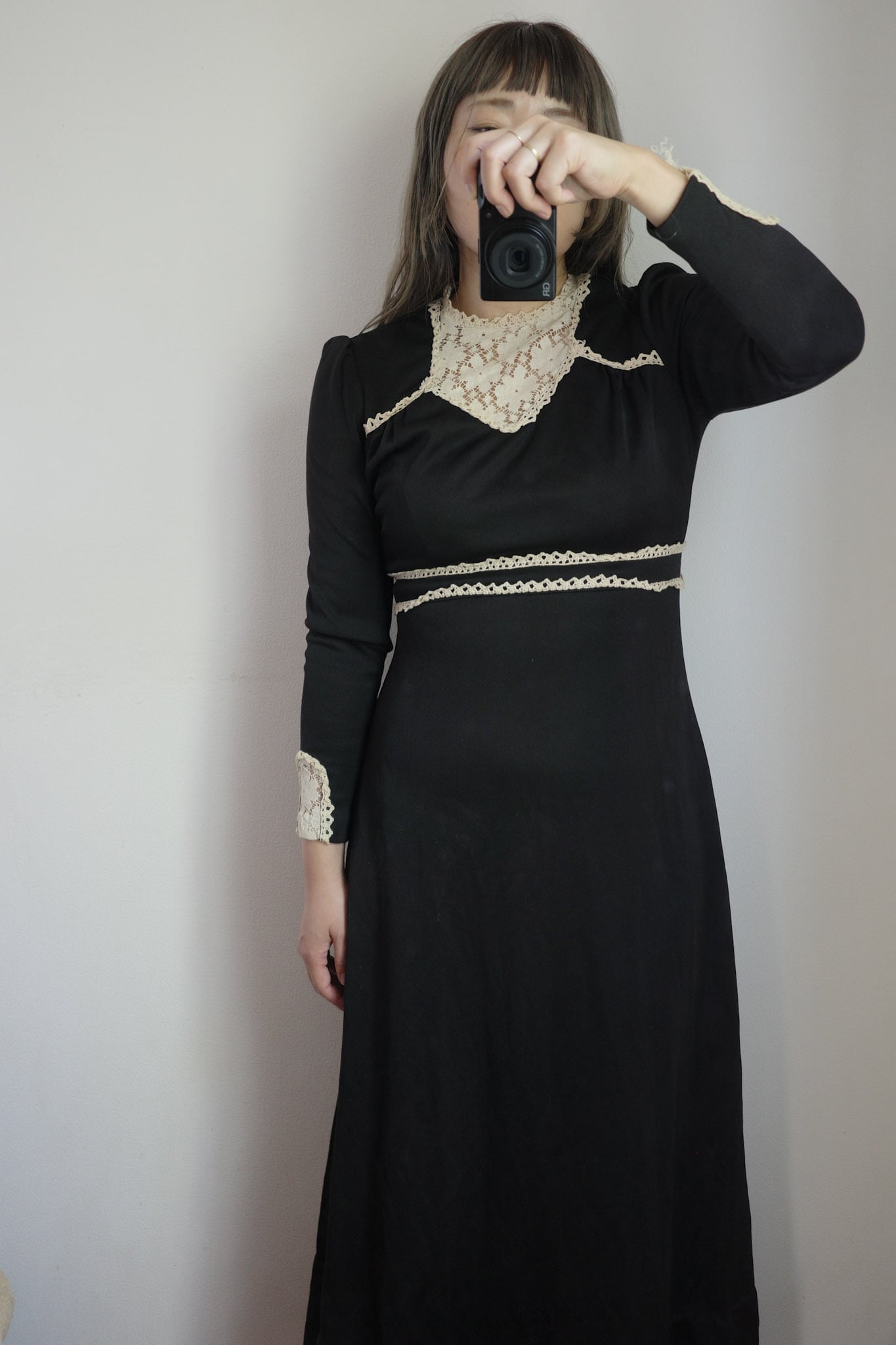 このヴィンテージレースのブラックロングドレスは、繊細で美しいレース素材とシックなブラックカラーが特徴的な一着です。エレガントな印象を与えながら、デイリースタイルから特別なイベントまで、多様なシーンでの活躍が期待できます。