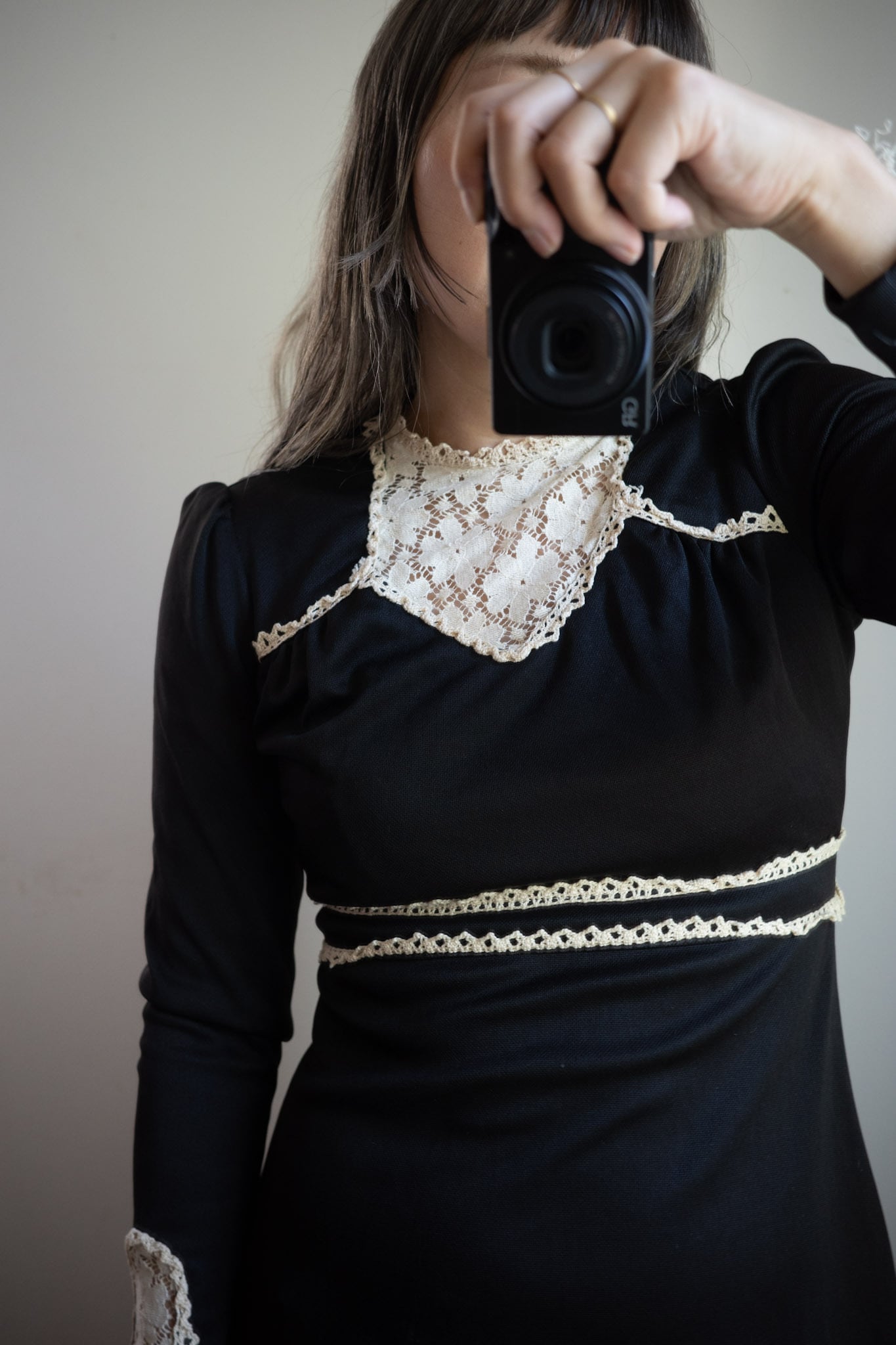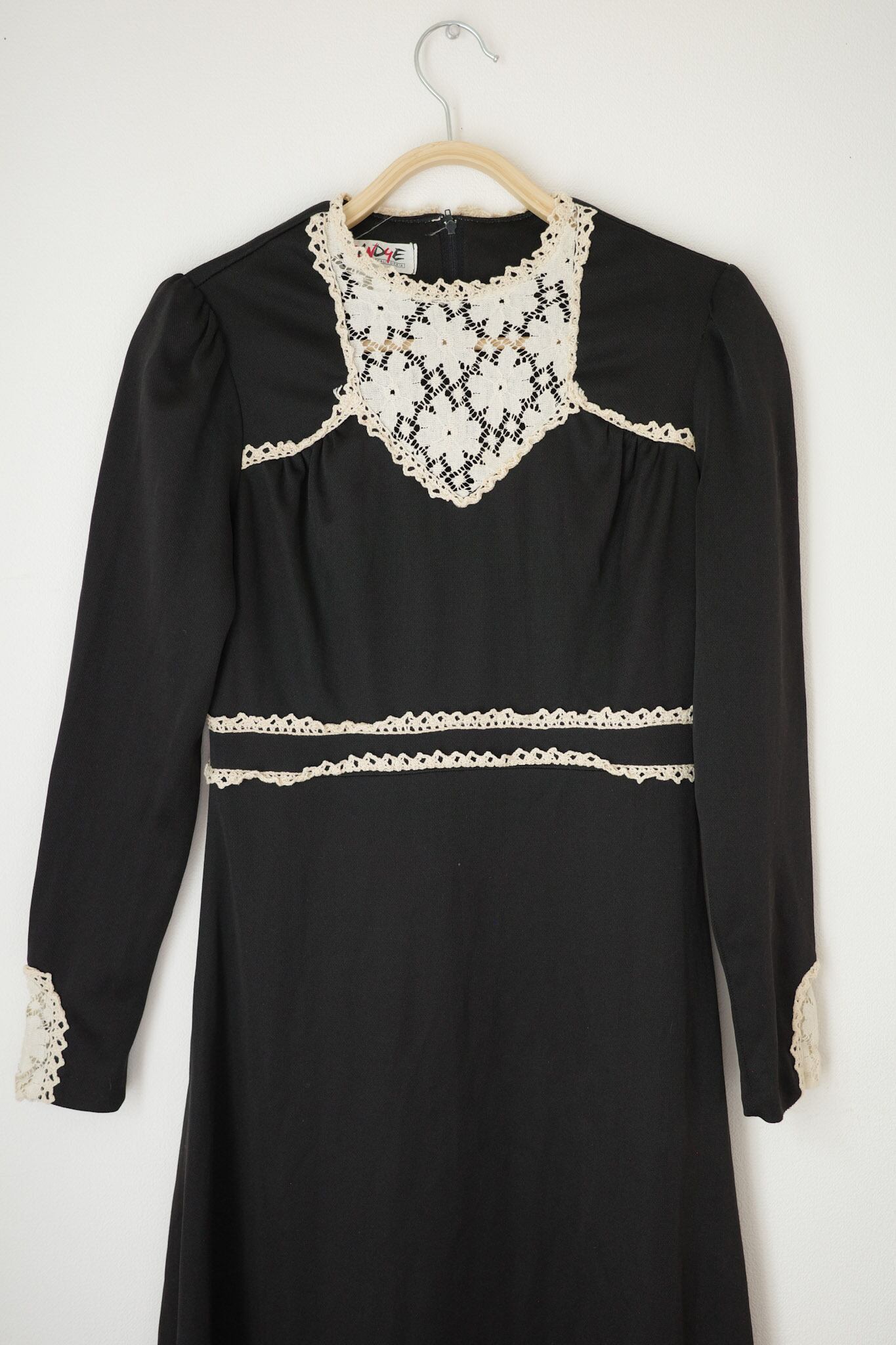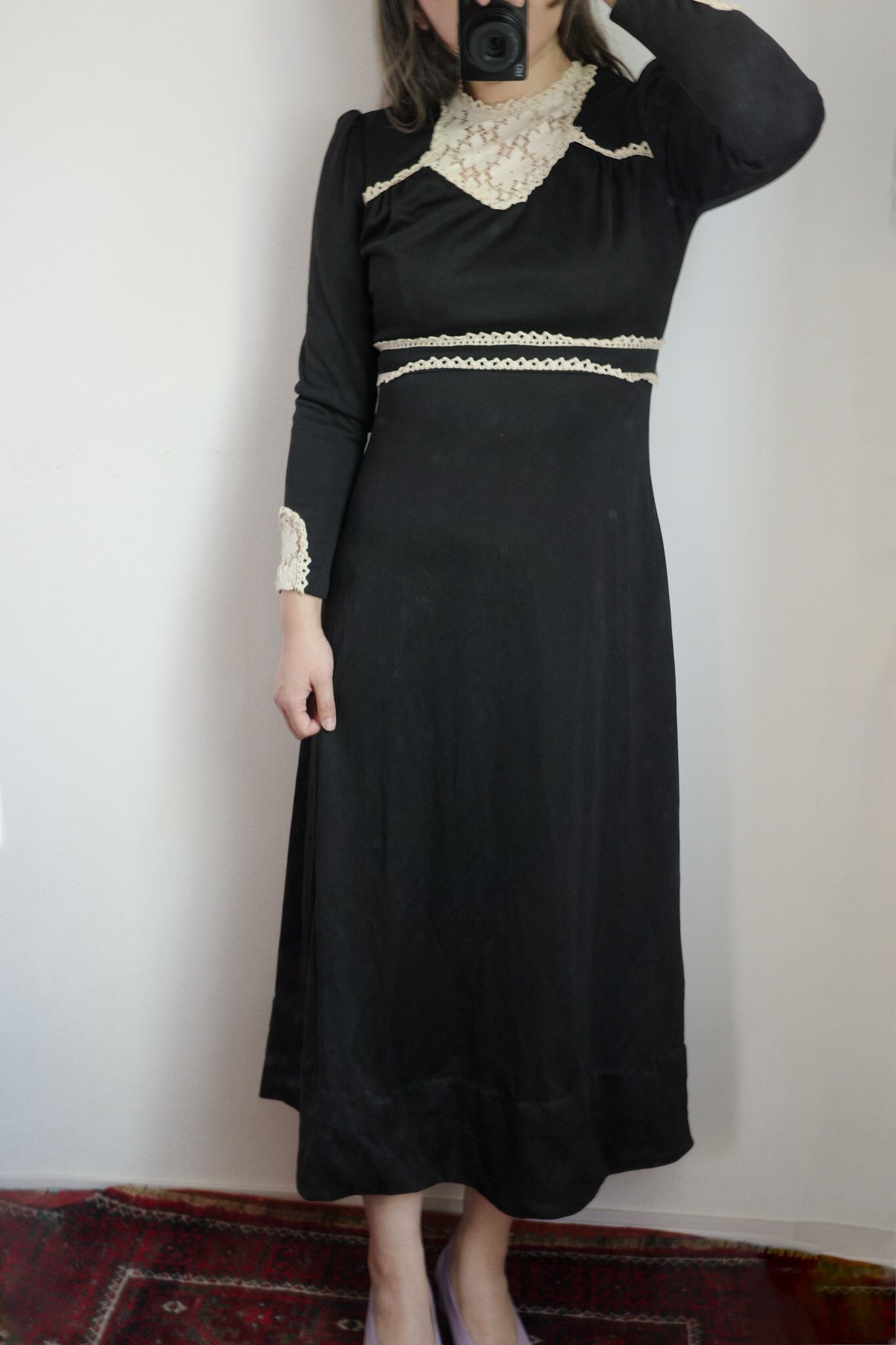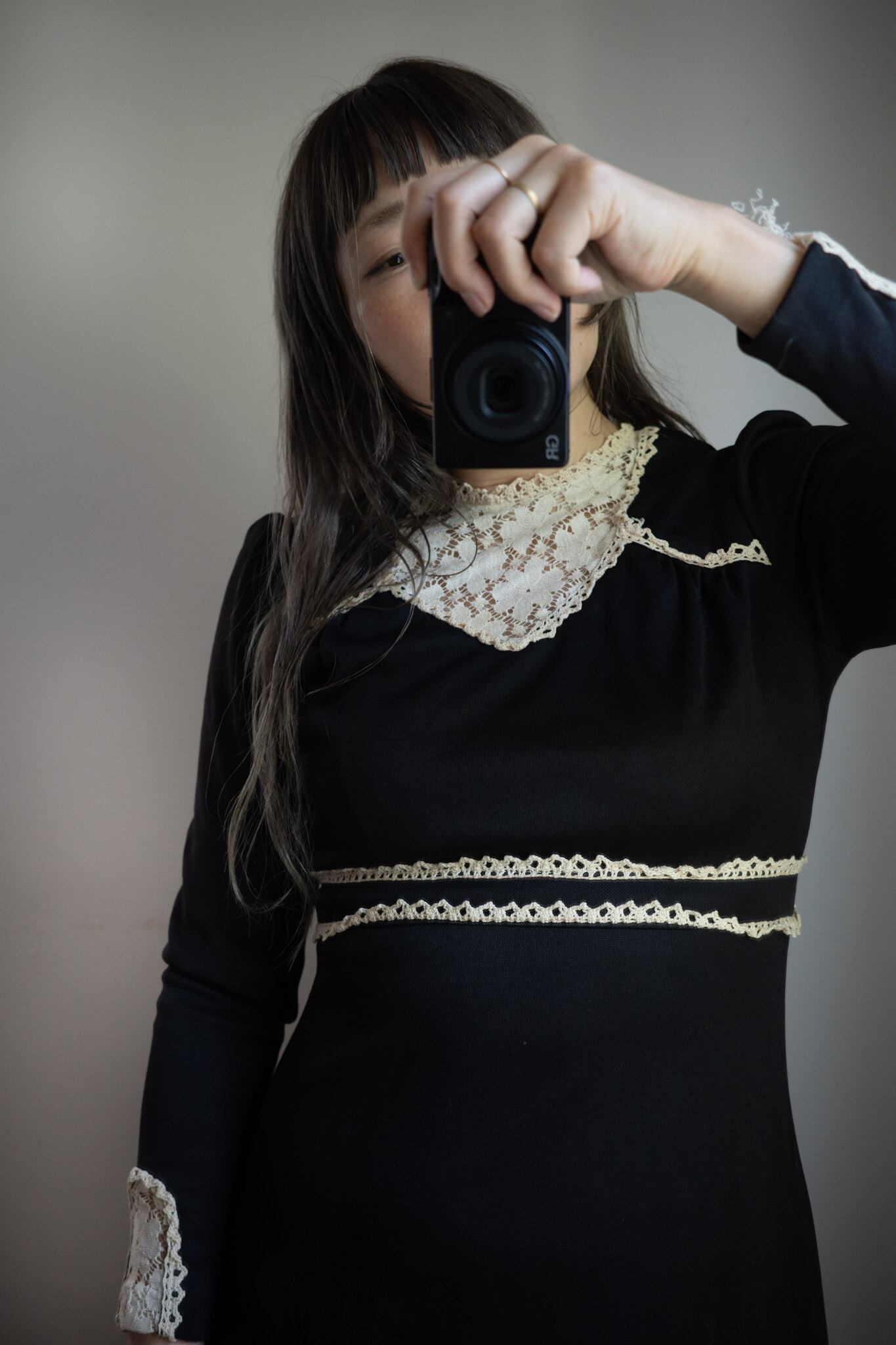 このヴィンテージレースのブラックロングドレスは、繊細で美しいレース素材とシックなブラックカラーが特徴的な一着です。エレガントな印象を与えながら、デイリースタイルから特別なイベントまで、多様なシーンでの活躍が期待できます。