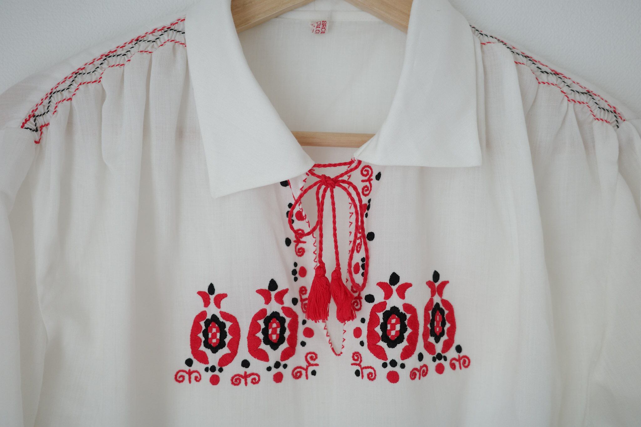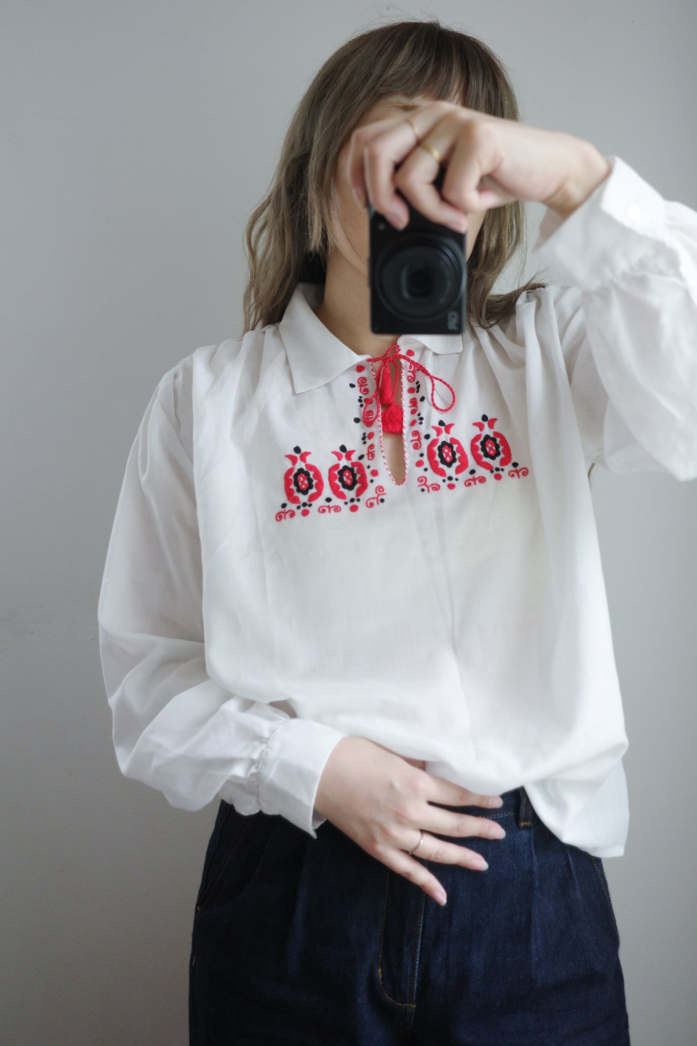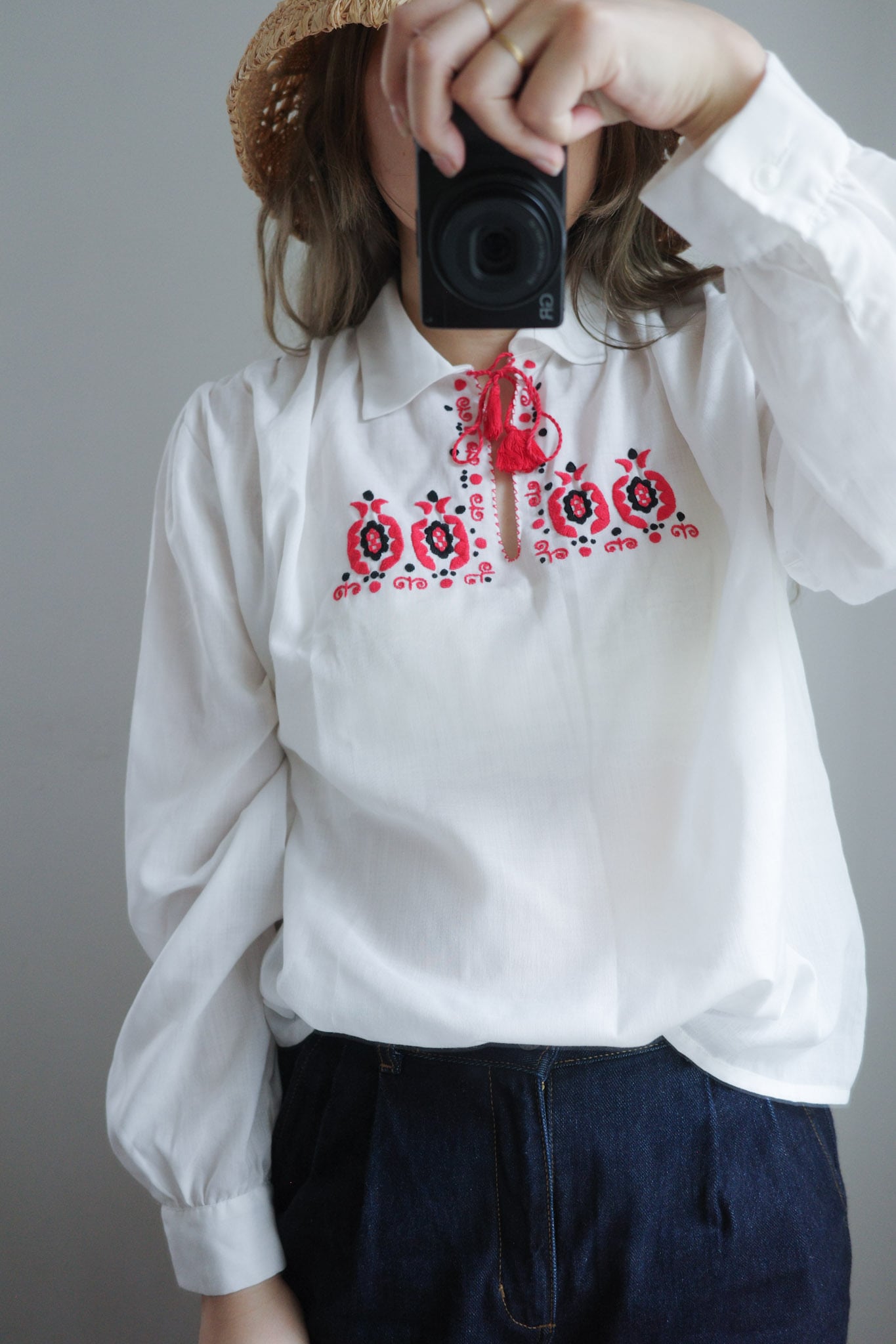 このヴィンテージレッド刺繍フォークロアブラウスは、鮮やかなレッドカラーと精緻な刺繍が施されたデザインが特徴的な一着です。デイリースタイルから特別なお出かけまで幅広いシーンでの活躍が期待できるアイテムです。