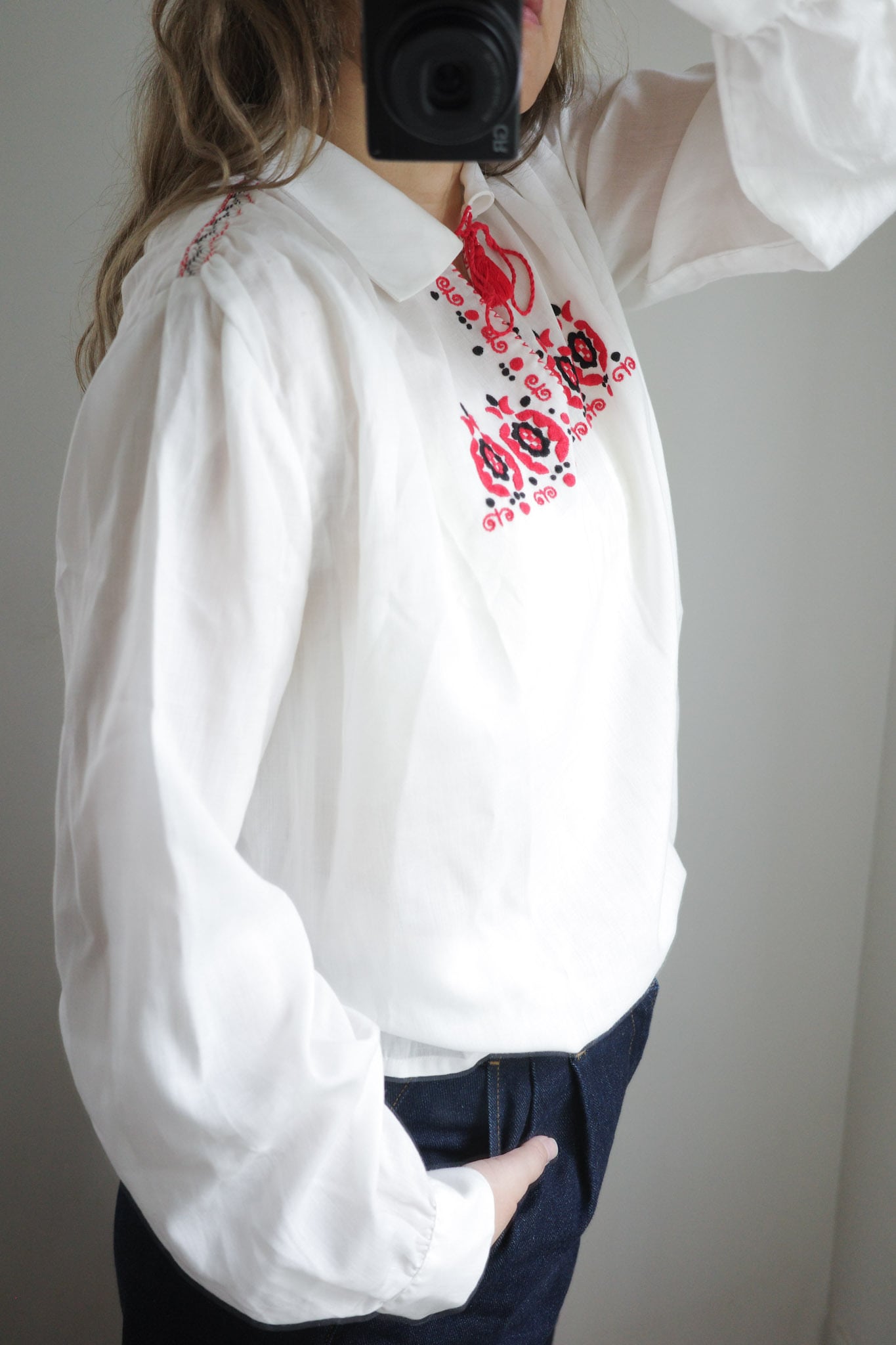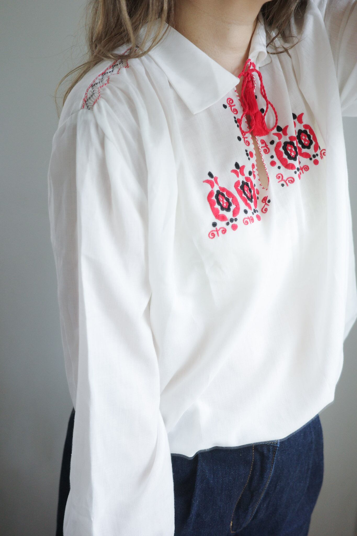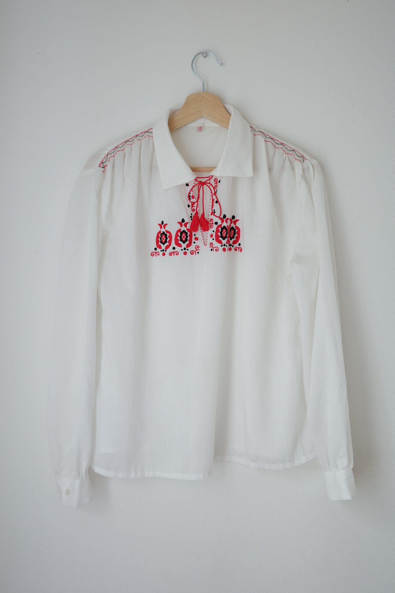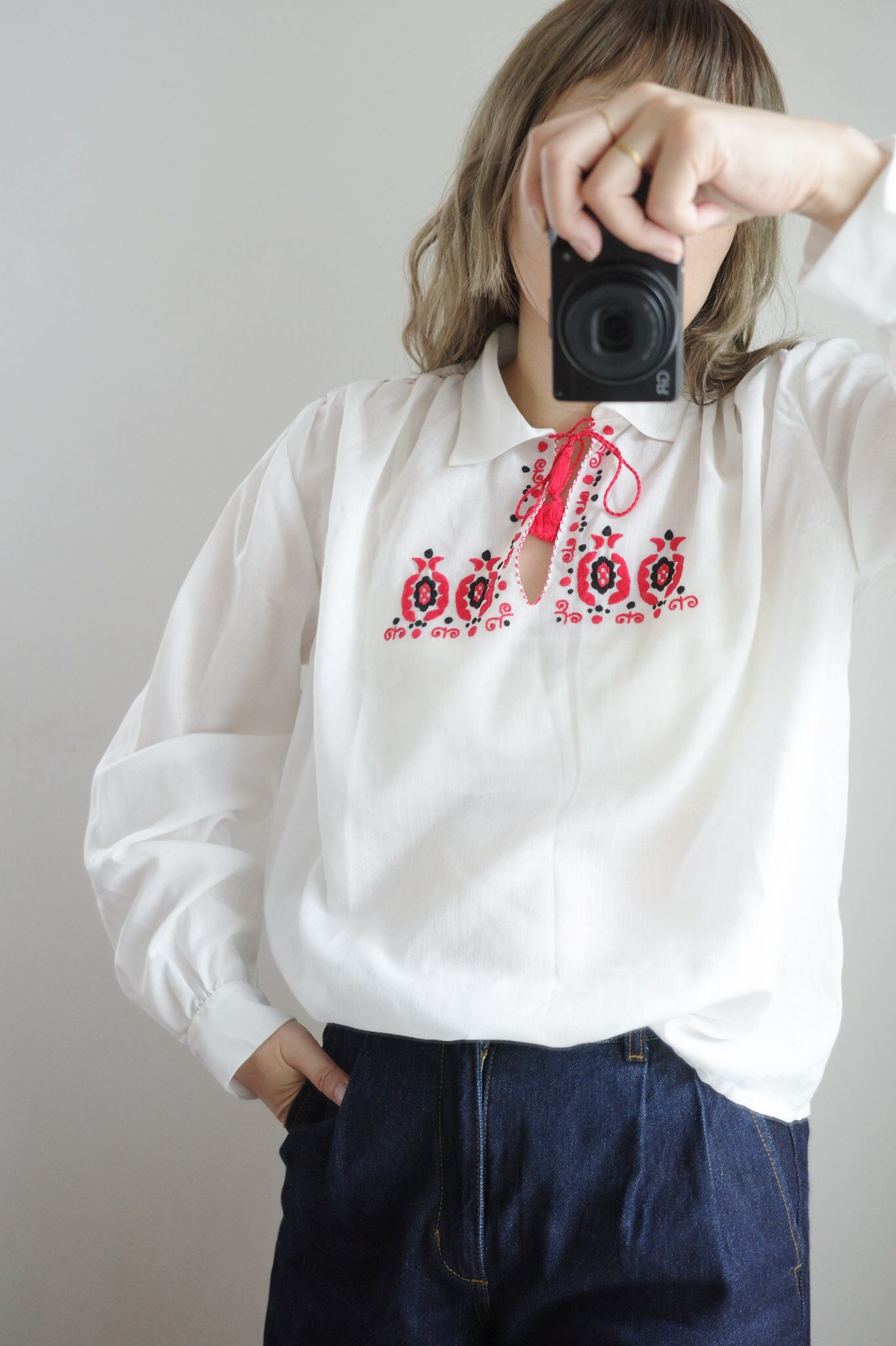 このヴィンテージレッド刺繍フォークロアブラウスは、鮮やかなレッドカラーと精緻な刺繍が施されたデザインが特徴的な一着です。デイリースタイルから特別なお出かけまで幅広いシーンでの活躍が期待できるアイテムです。