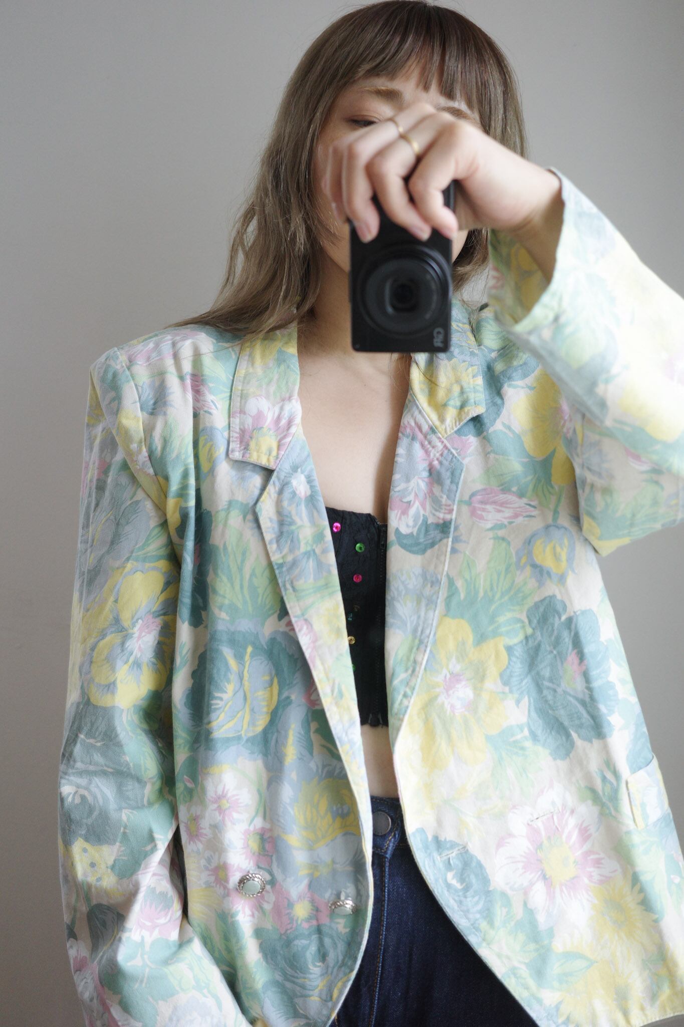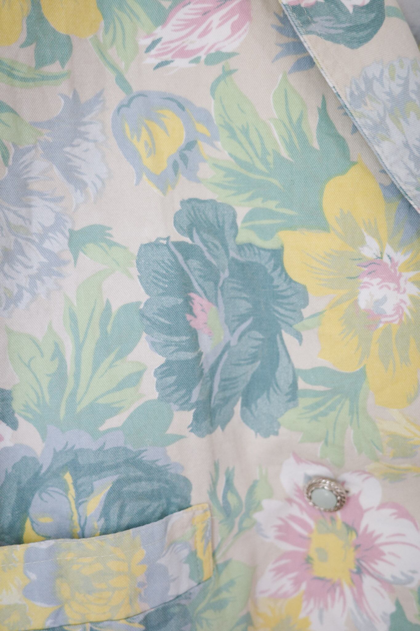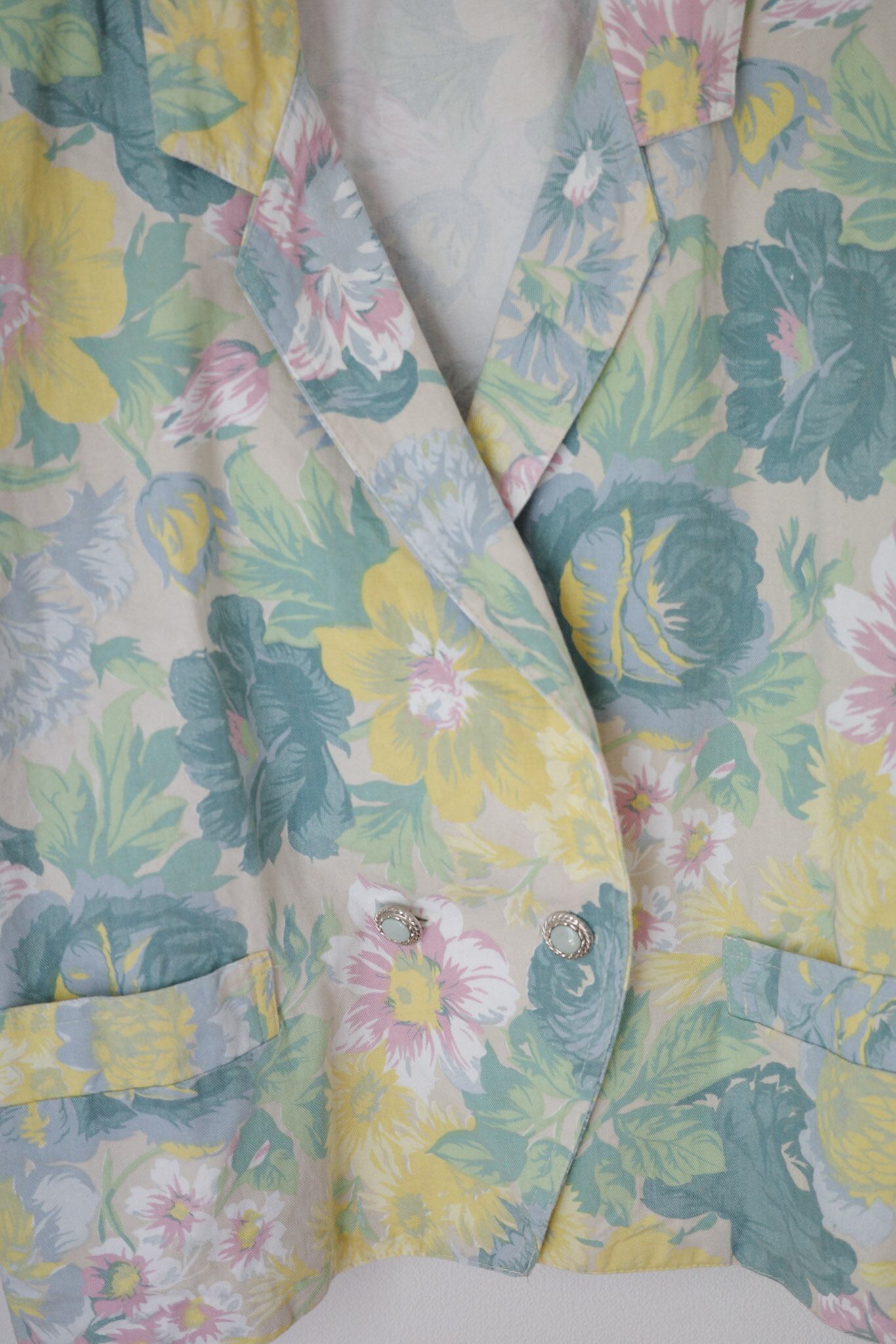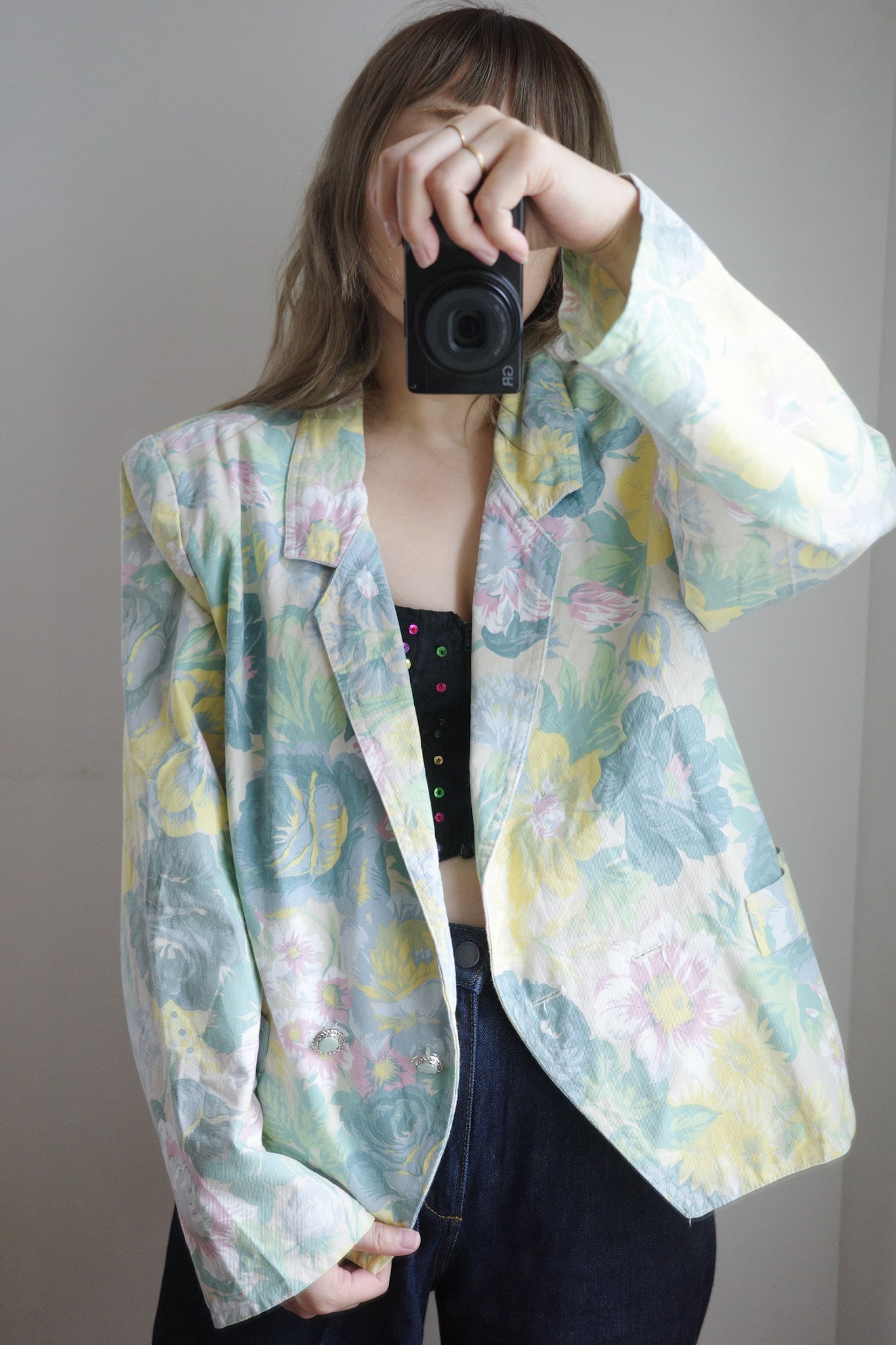 この1980年代のフローラルジャケットブラウスは、ビンテージならではの華やかな花柄とパッド入りのショルダーが特徴的な一着です。日常のコーディネートから特別なお出かけまで、多様なシーンで活躍するアイテムです。
