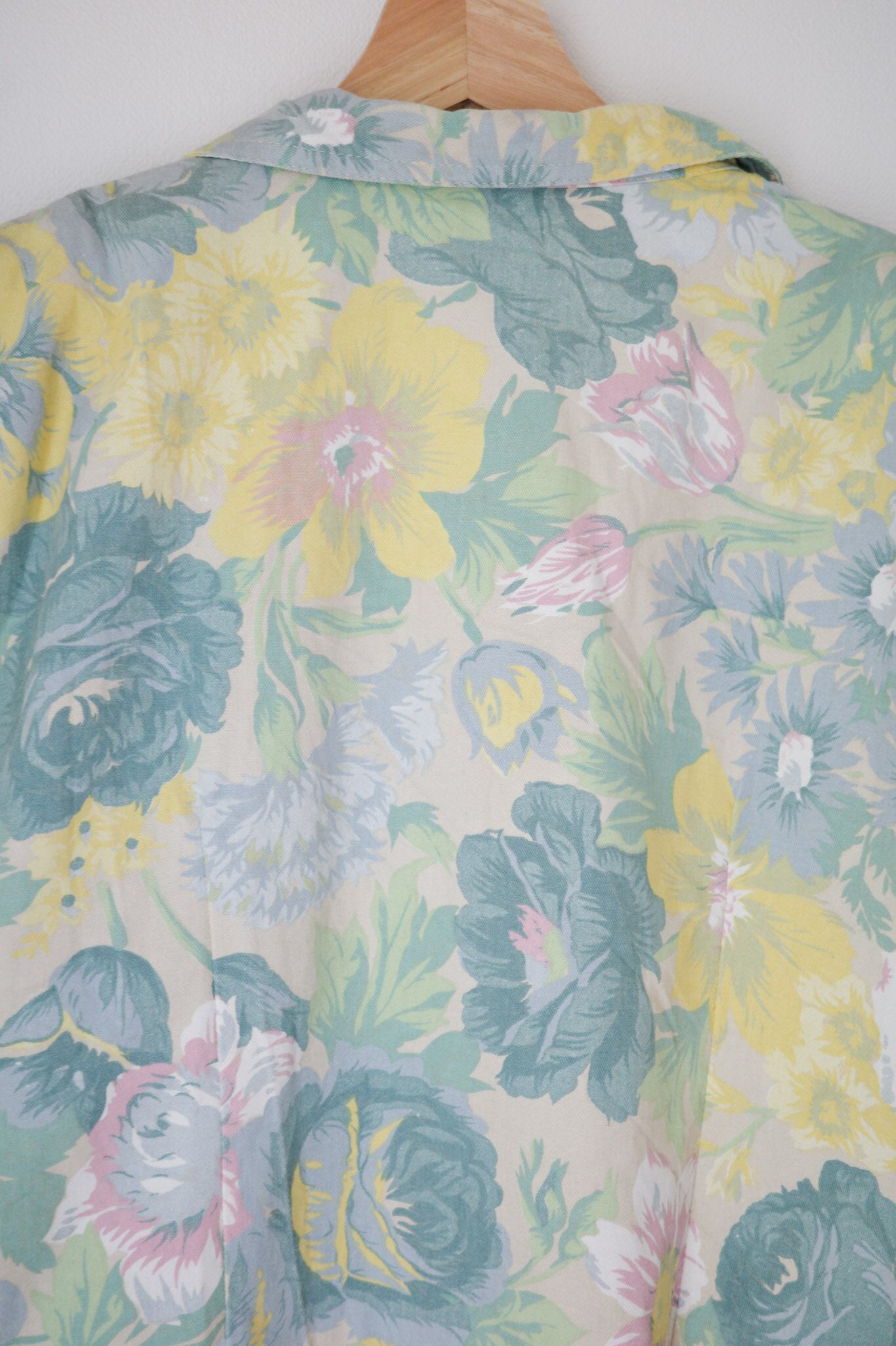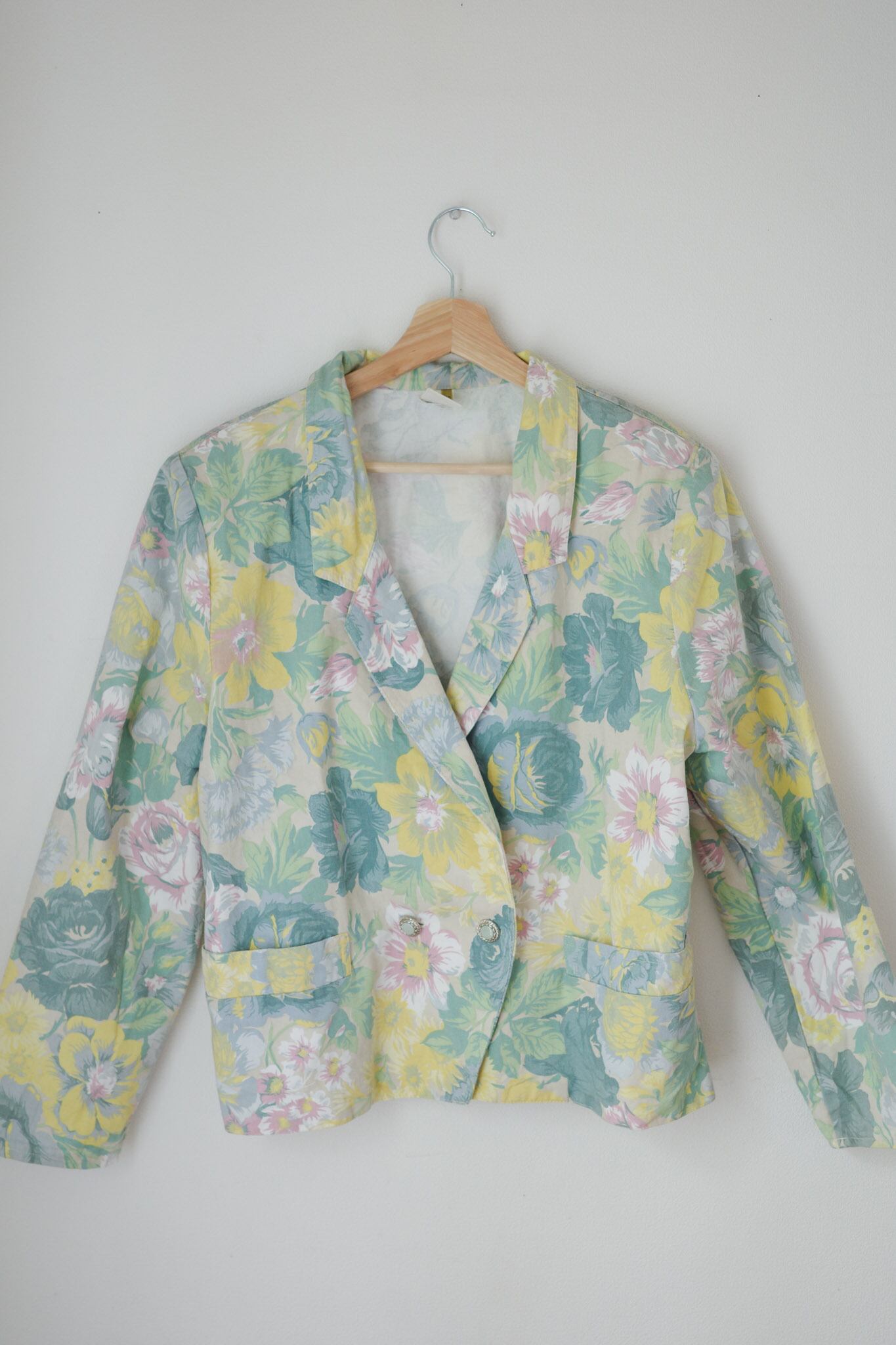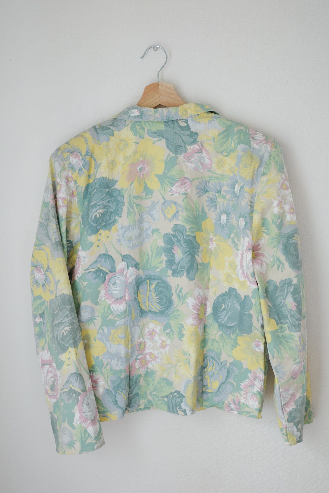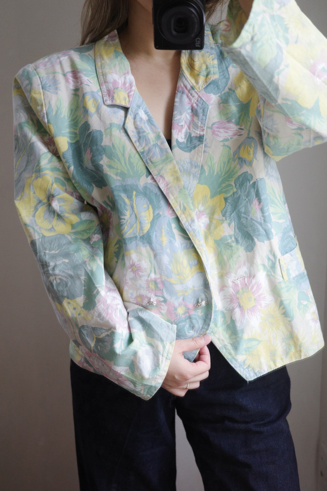 この1980年代のフローラルジャケットブラウスは、ビンテージならではの華やかな花柄とパッド入りのショルダーが特徴的な一着です。日常のコーディネートから特別なお出かけまで、多様なシーンで活躍するアイテムです。