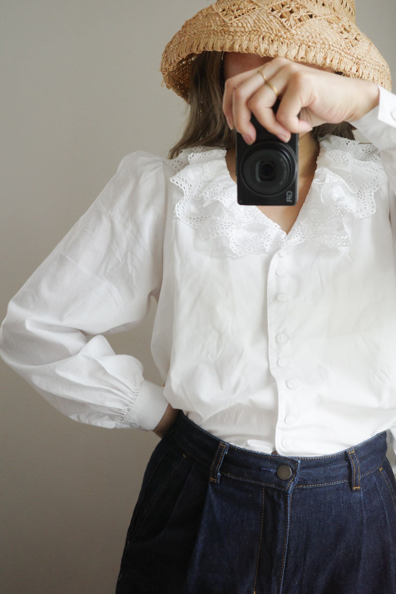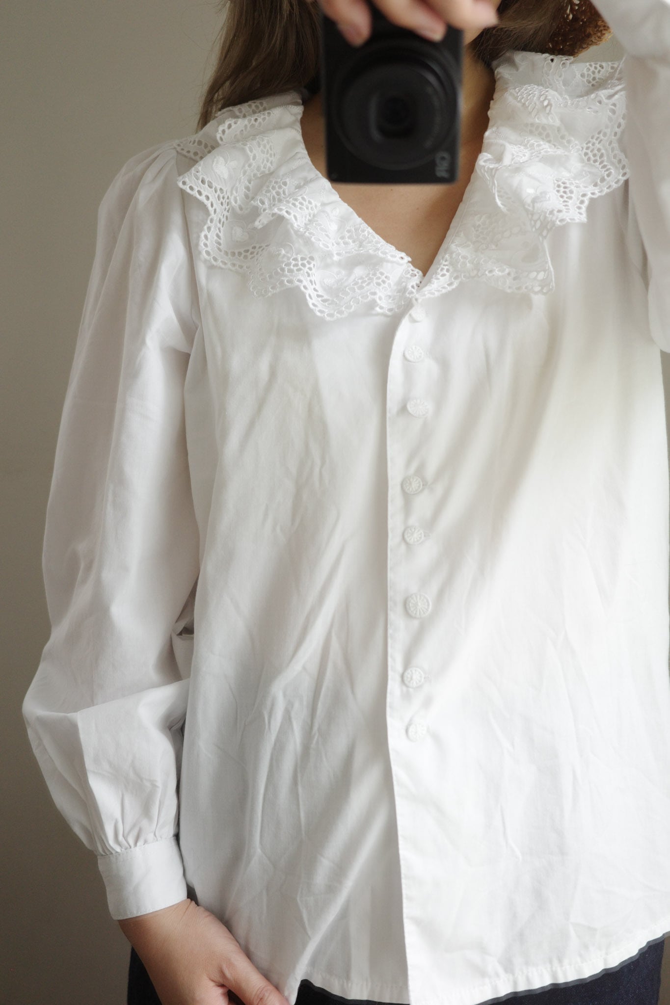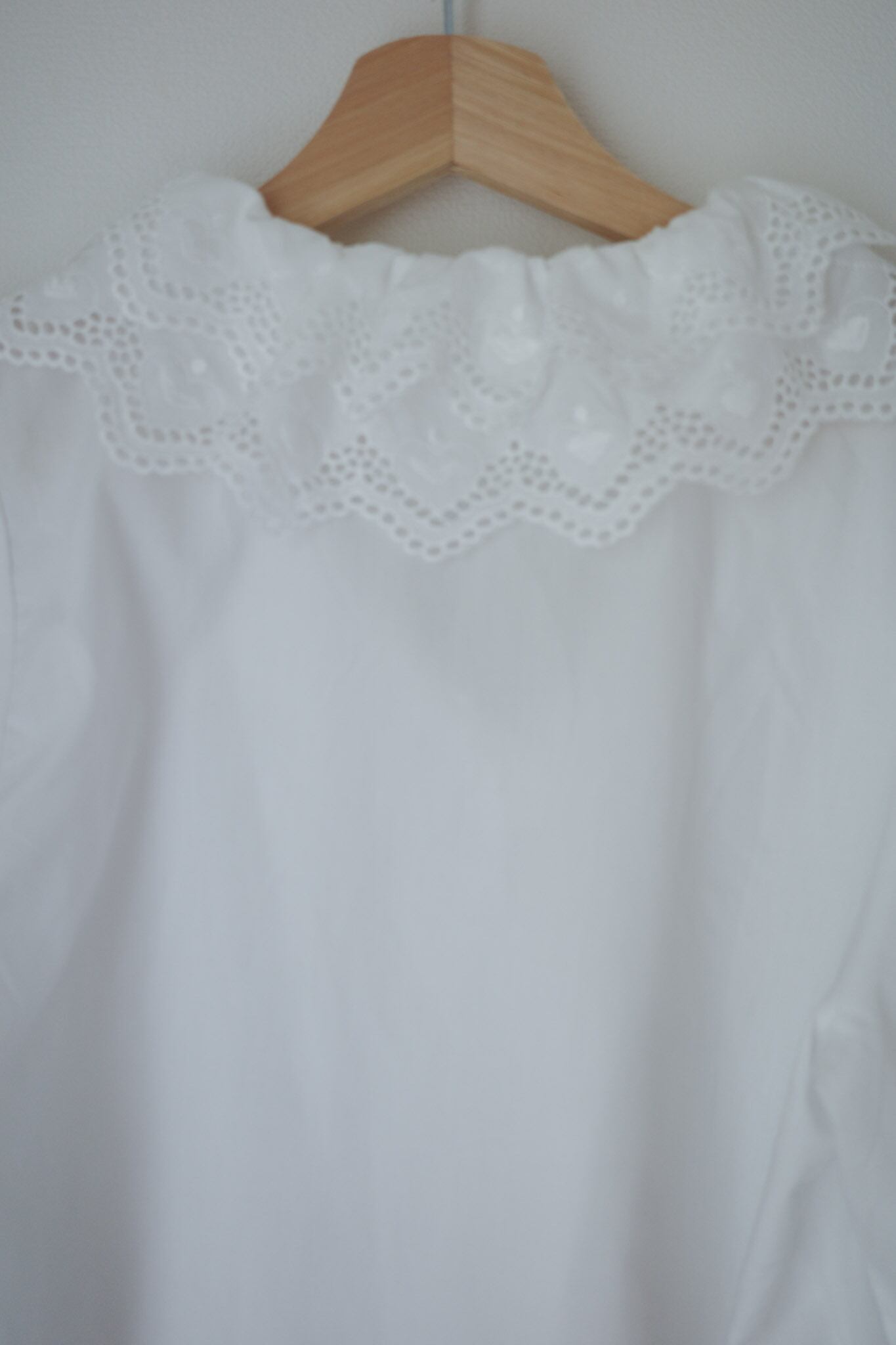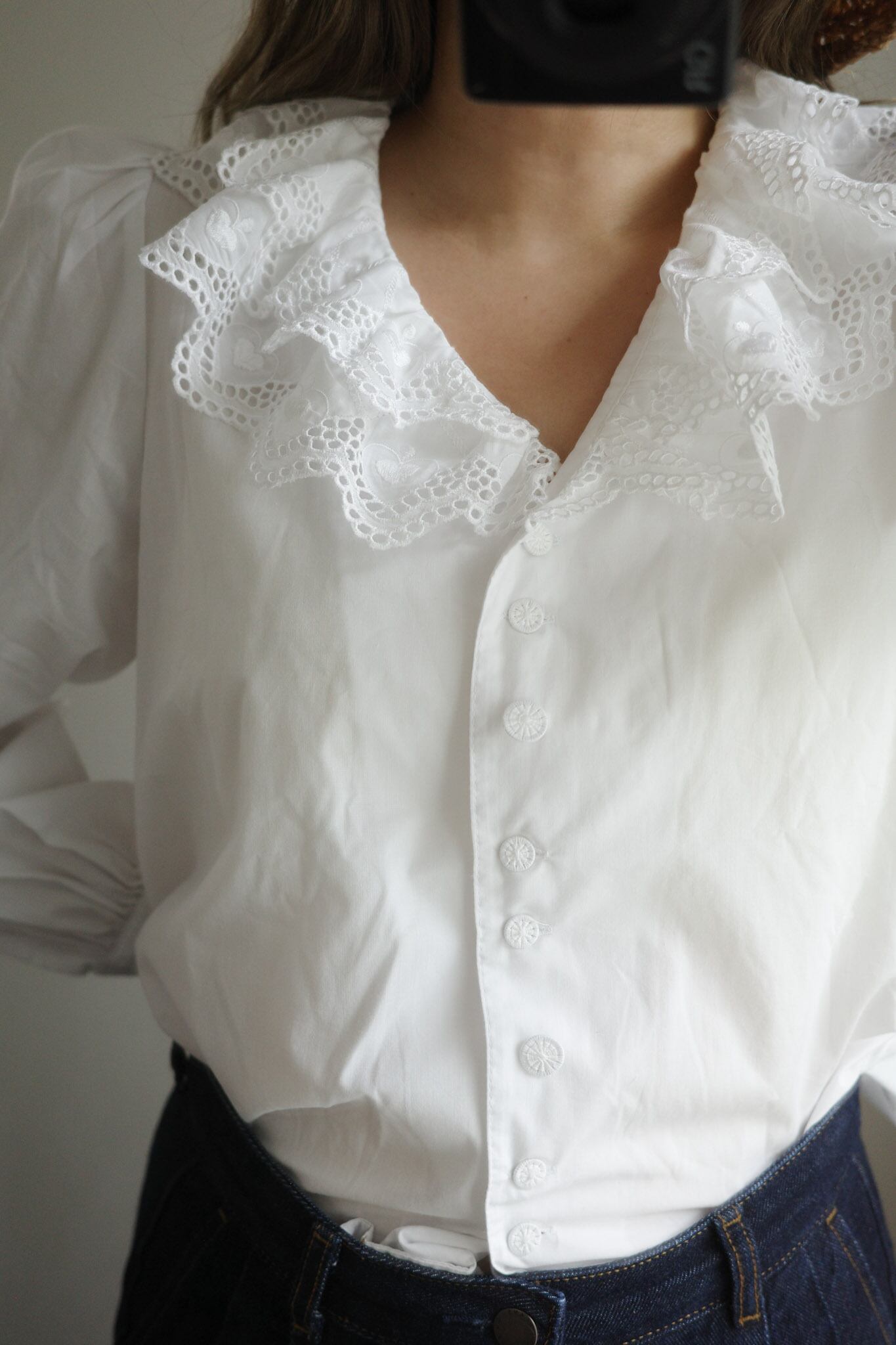 このヴィンテージホワイトフリルカラーのブラウスは、エレガントなフリルデザインと柔らかなホワイトカラーが特徴的な一着です。デイリーコーディネートから特別なお出かけまで、様々なシーンで活躍できるアイテムです。