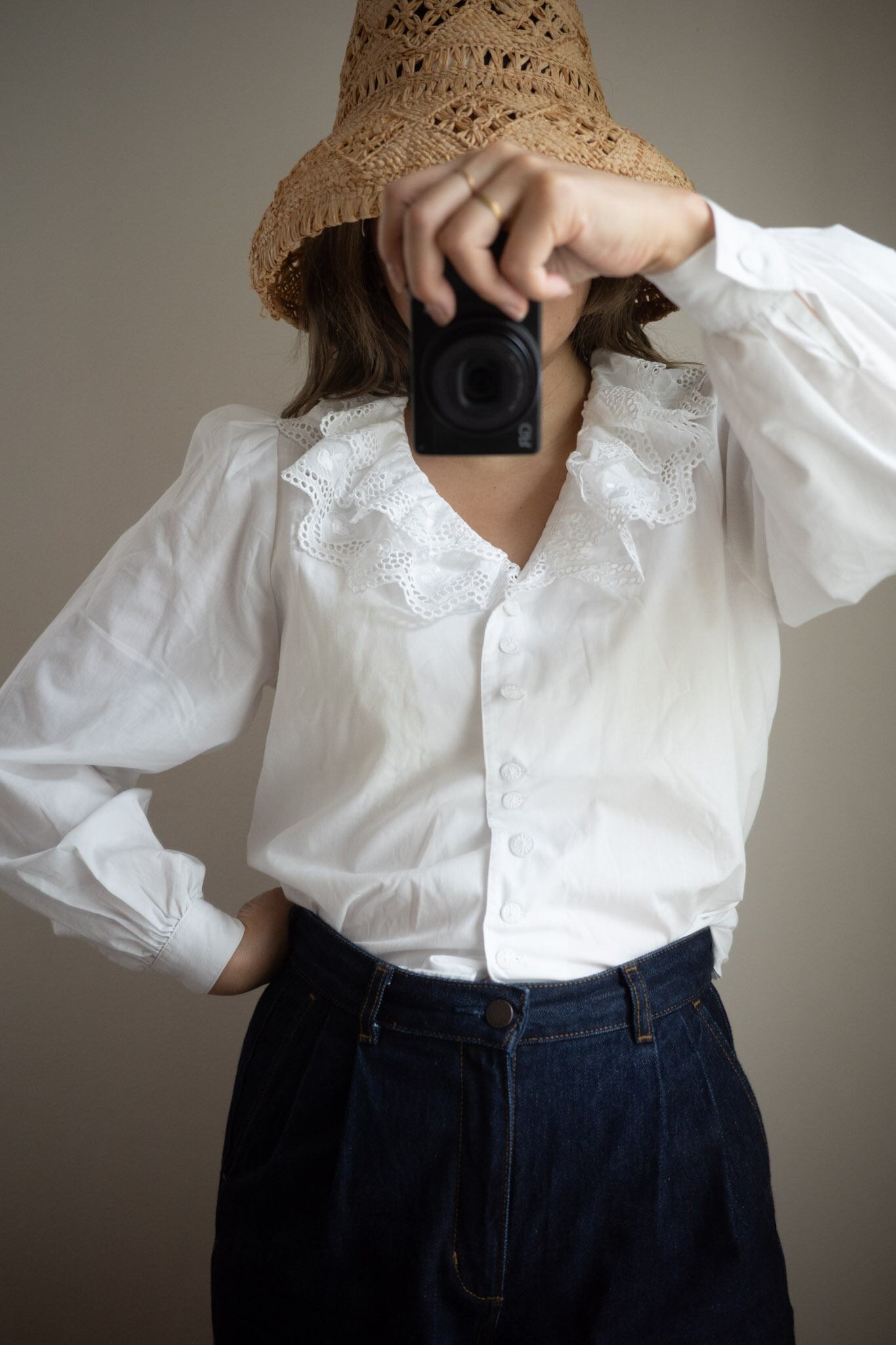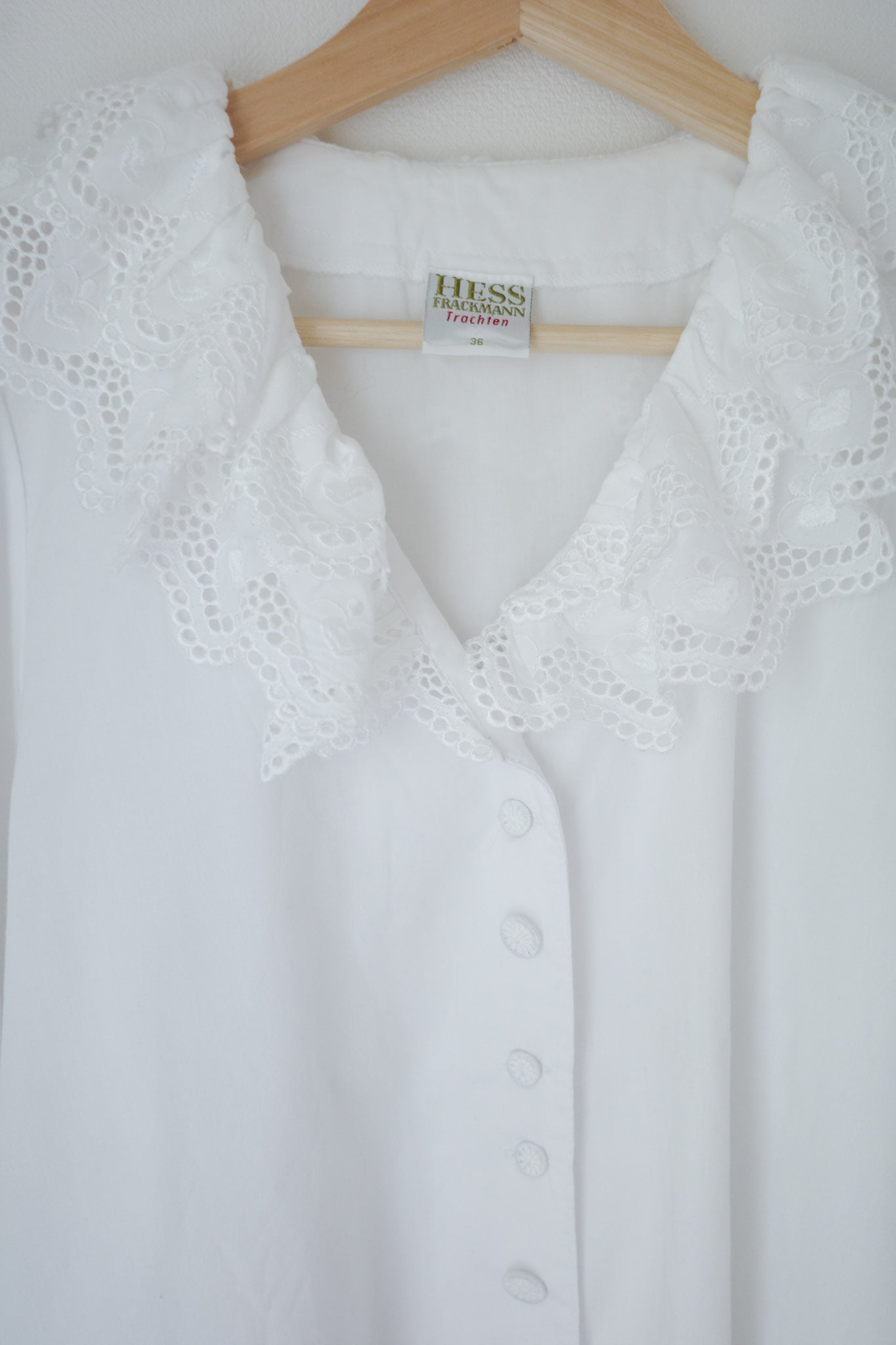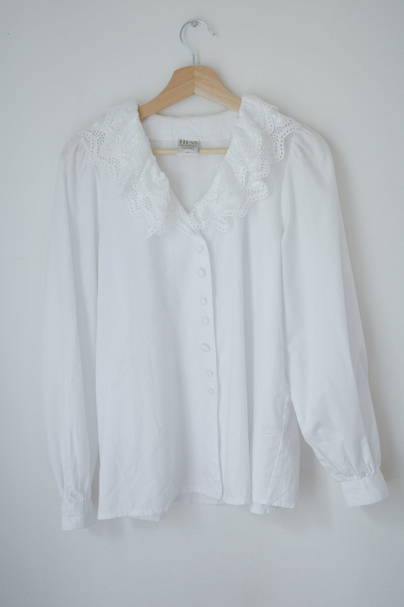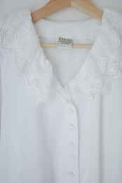 このヴィンテージホワイトフリルカラーのブラウスは、エレガントなフリルデザインと柔らかなホワイトカラーが特徴的な一着です。デイリーコーディネートから特別なお出かけまで、様々なシーンで活躍できるアイテムです。