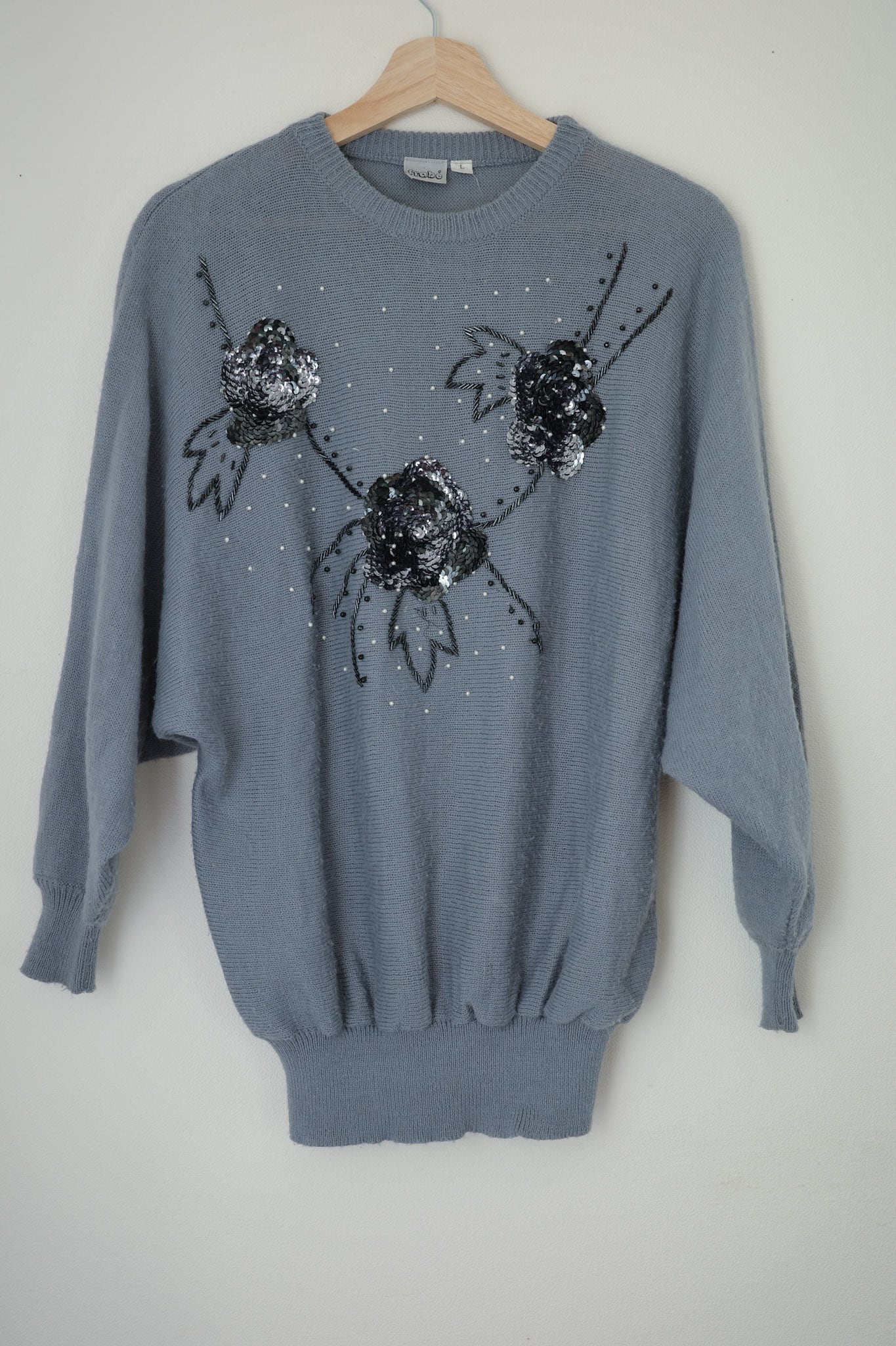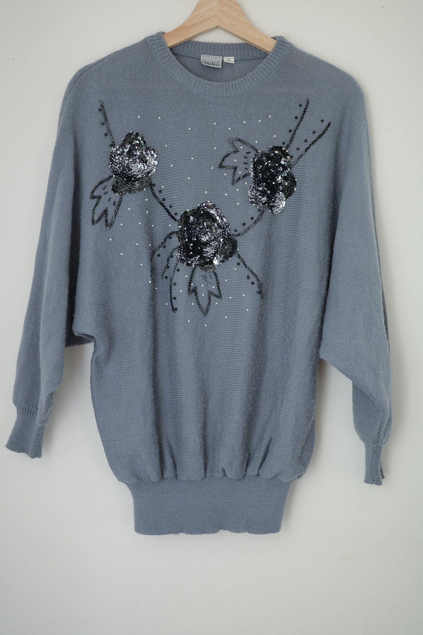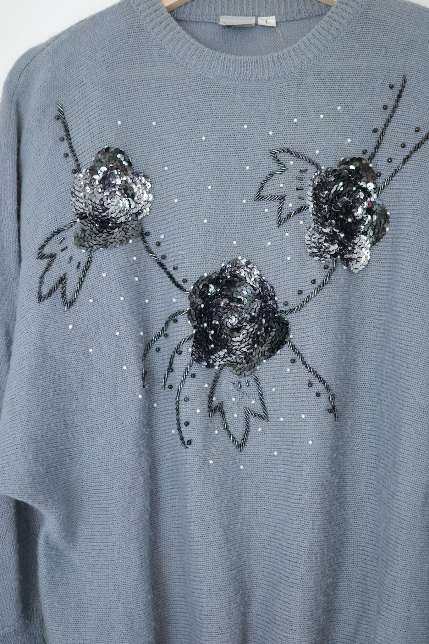 この1980年代のブルーグレー・スパンコールニットセーターは、独特の色合いと花を型どったスパンコールが特徴的な一着です。