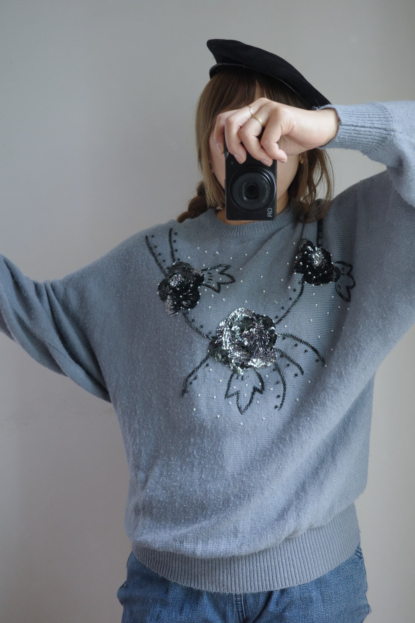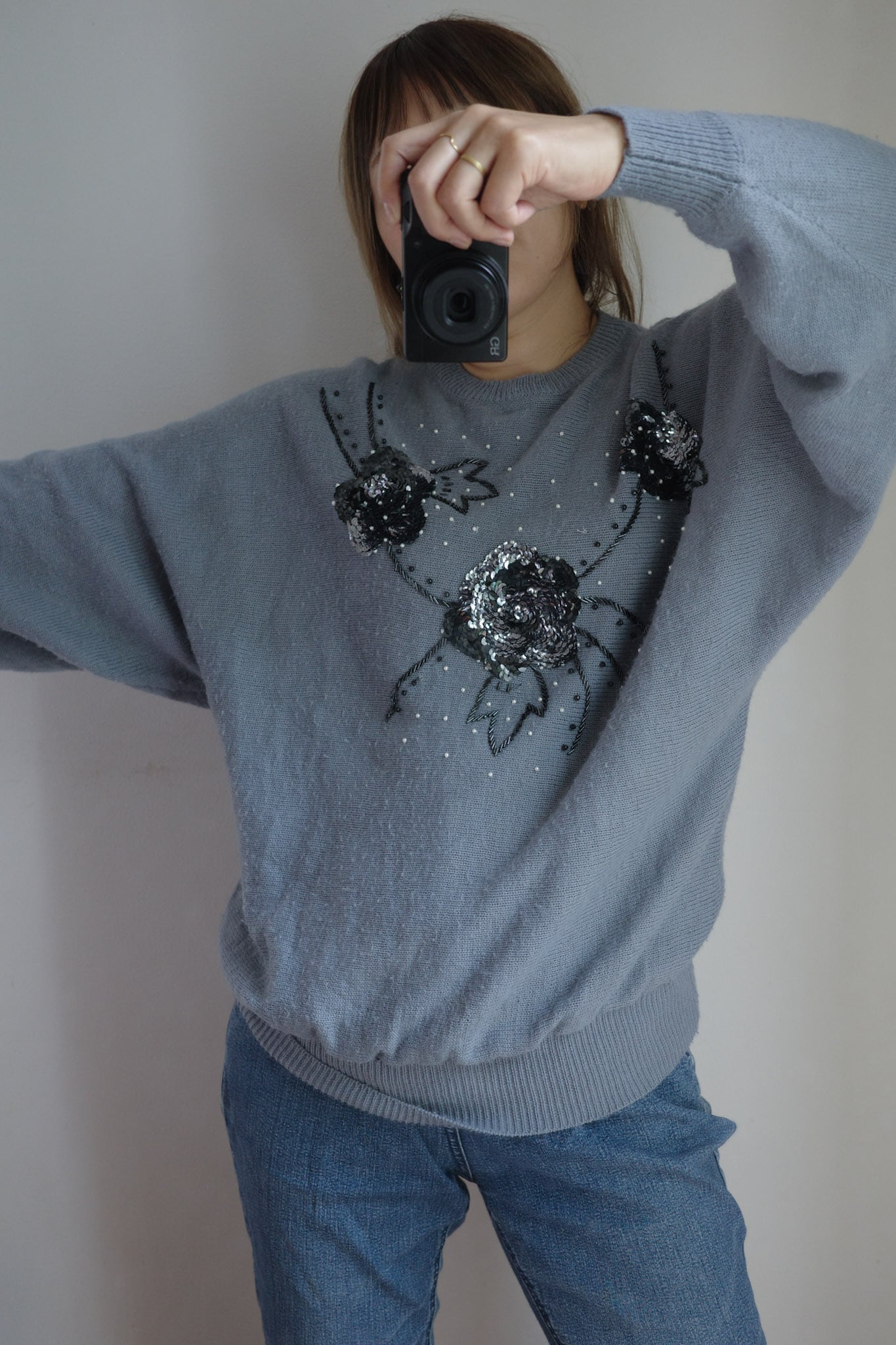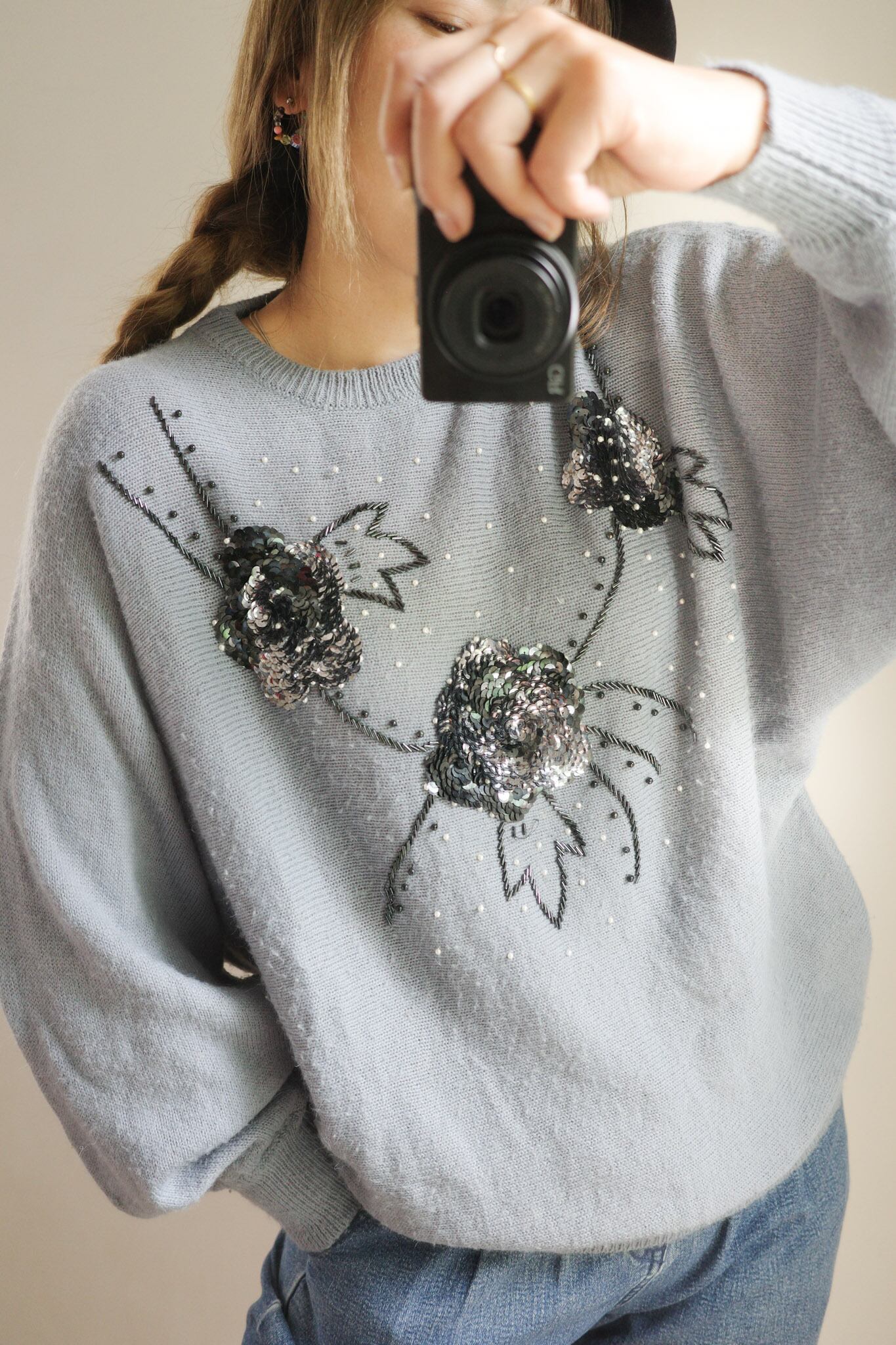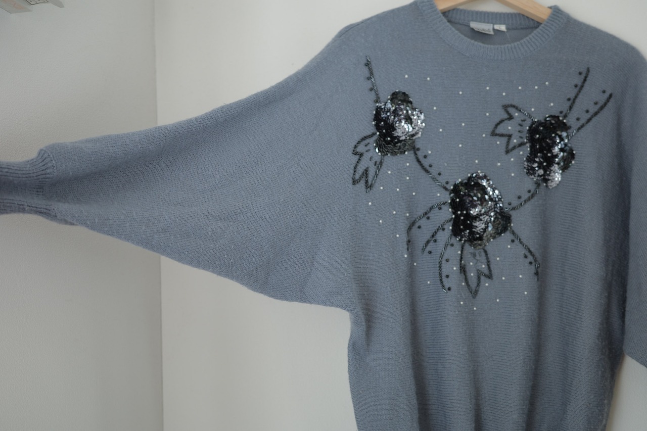 この1980年代のブルーグレー・スパンコールニットセーターは、独特の色合いと花を型どったスパンコールが特徴的な一着です。