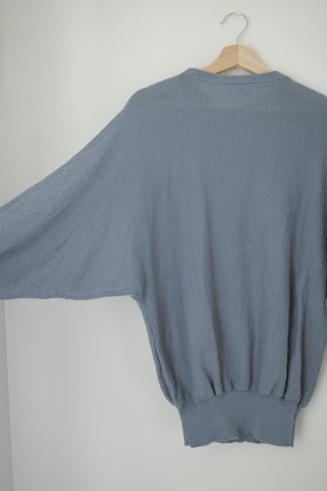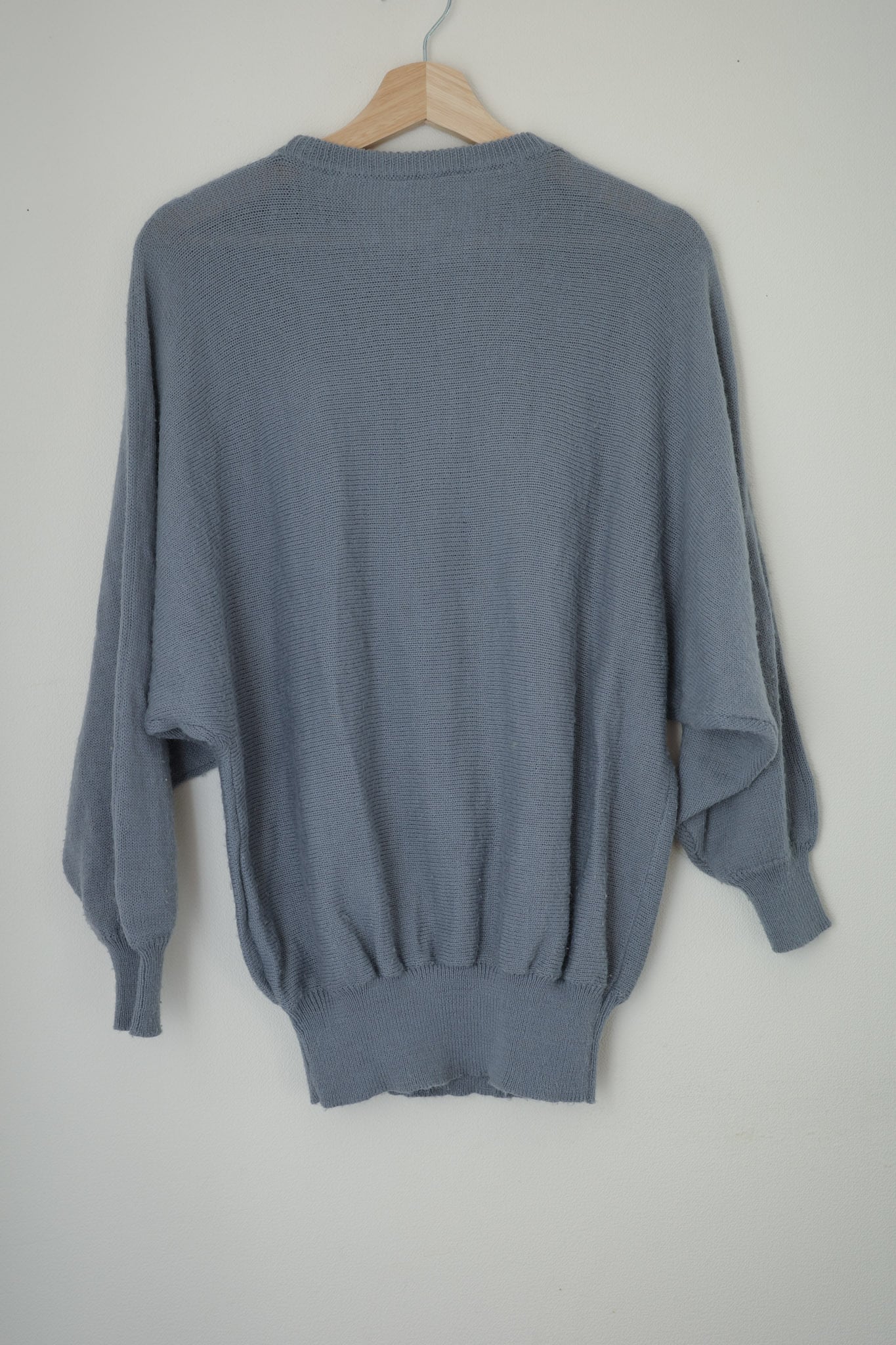 柔らかなニット素材は、心地よい着心地で色見も落ち着いたブルーグレーなのでどんなボトムスとも相性が良いアイテムです。