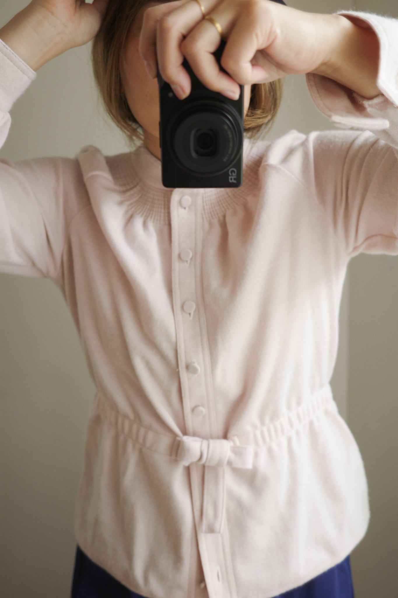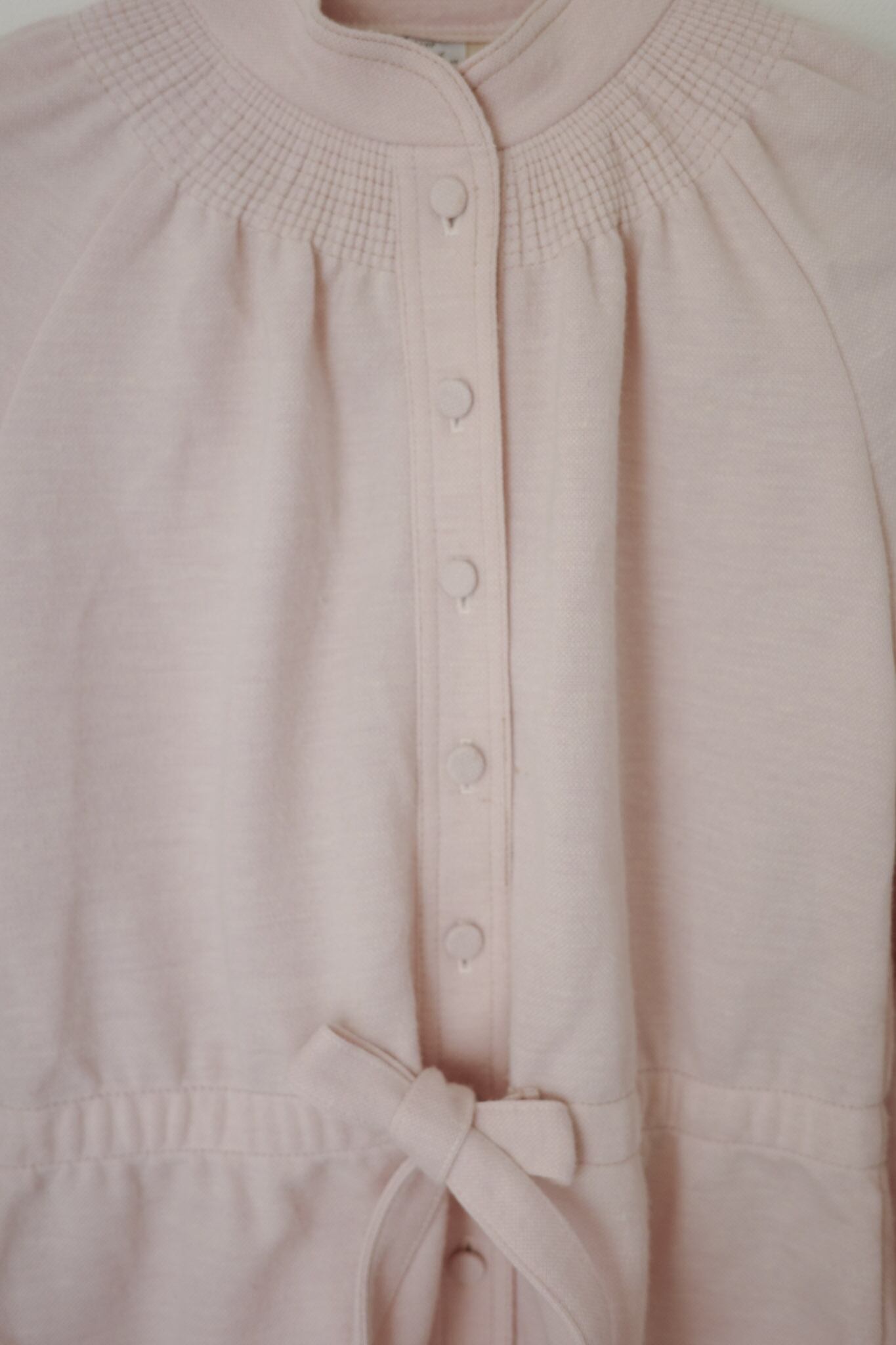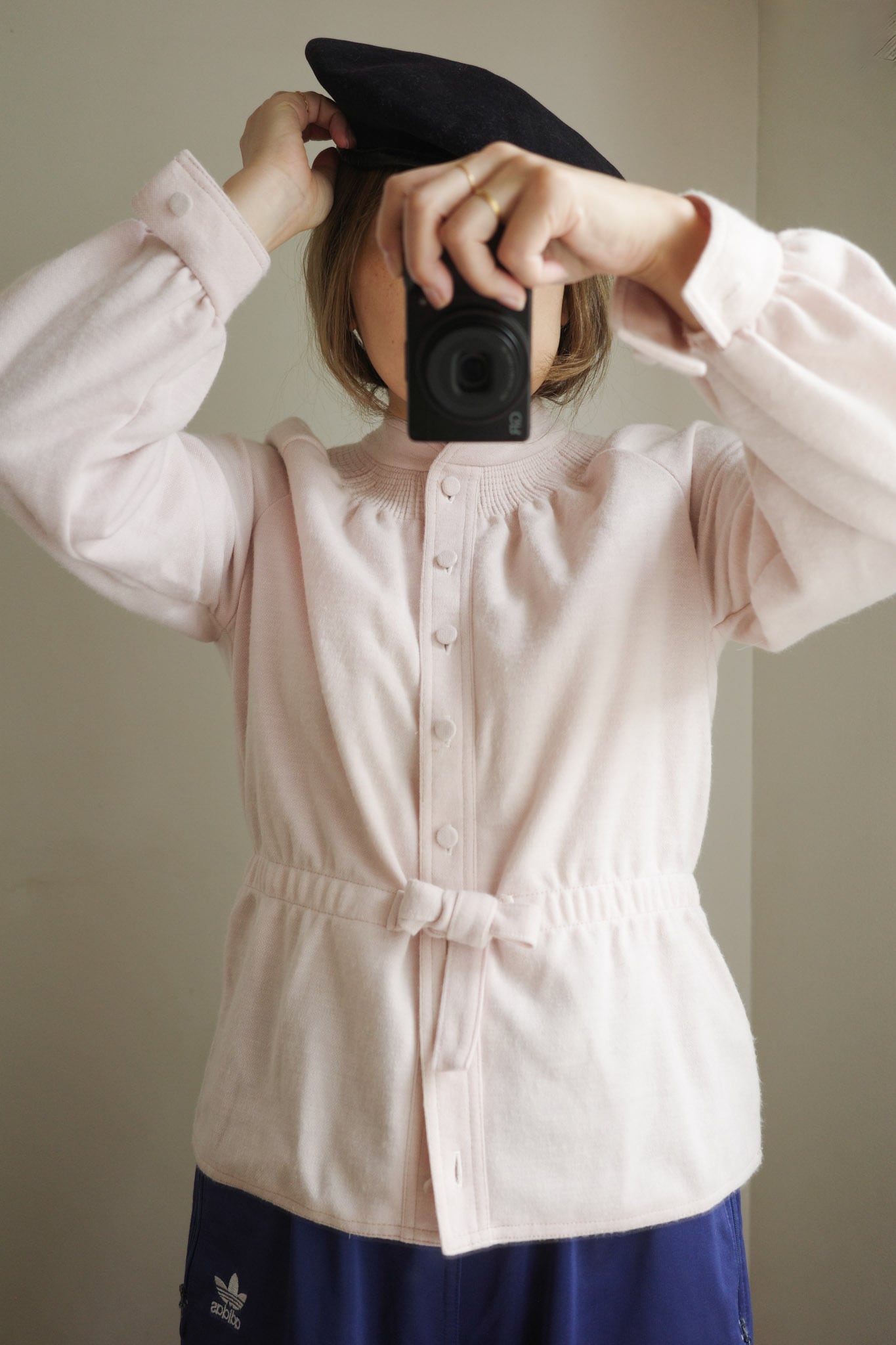 このヴィンテージペールピンクドローストリングウエストカーディガンは、柔らかなピンク色とリラックスしたシルエットが特徴的な一着です。