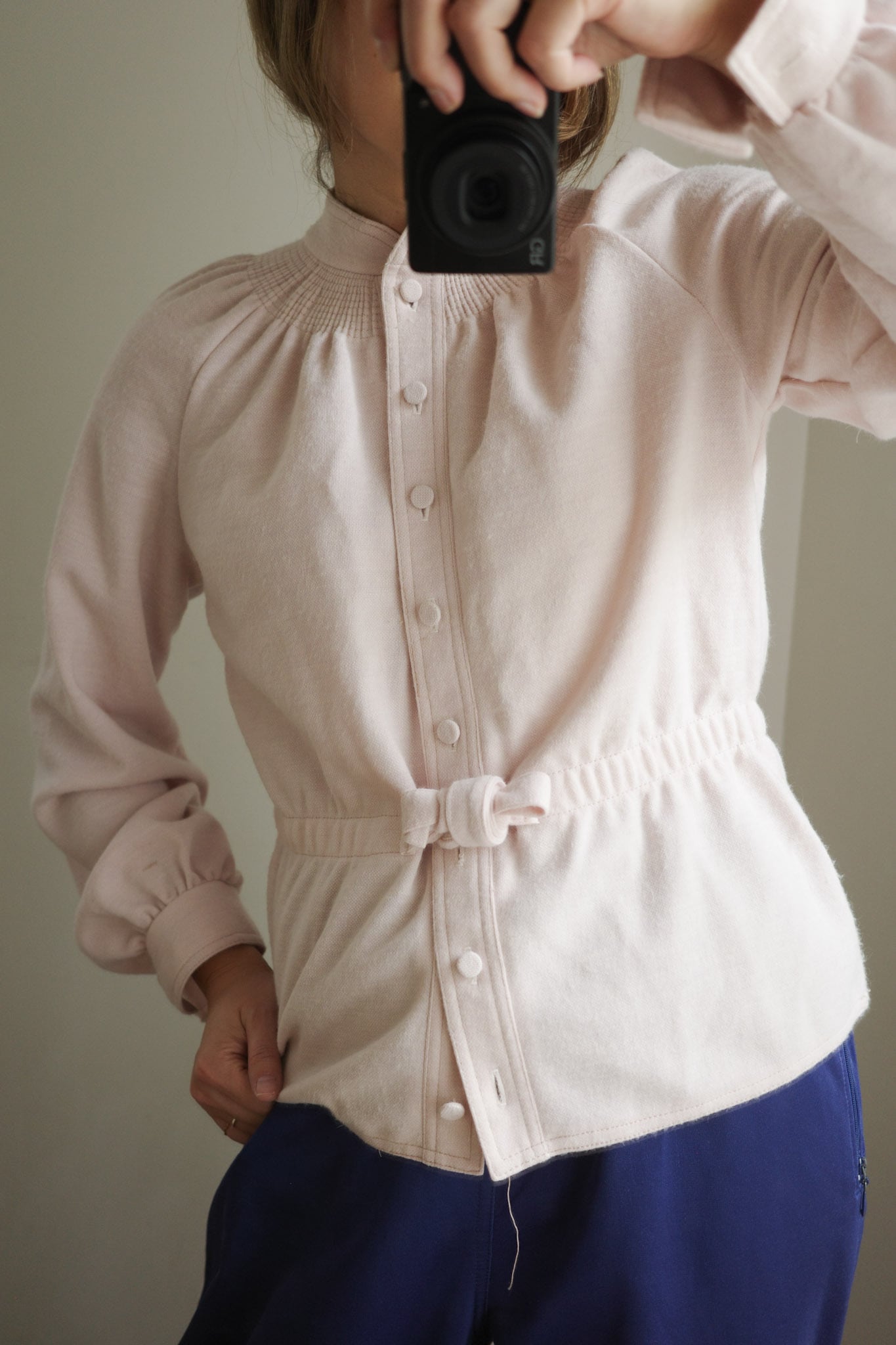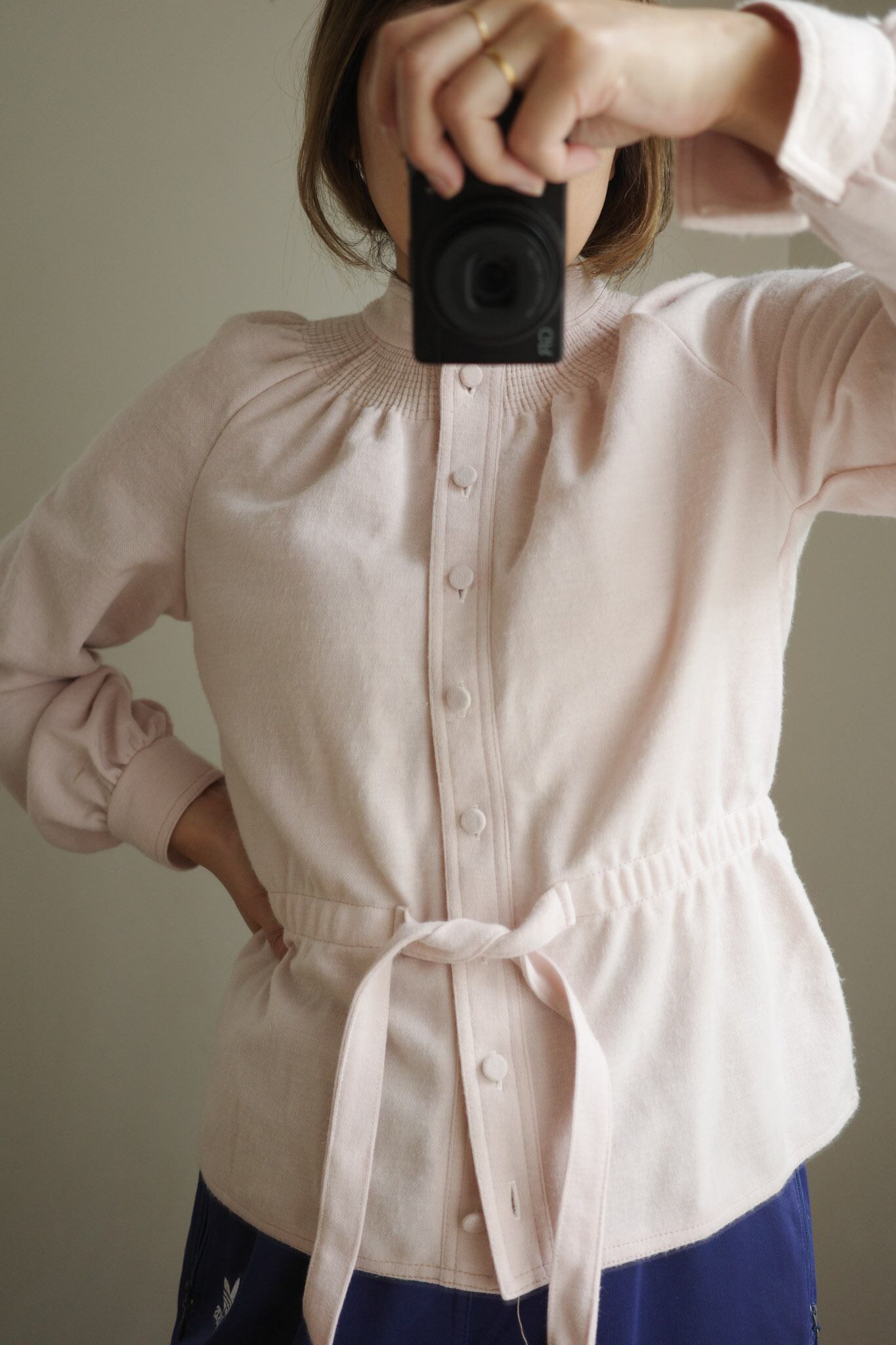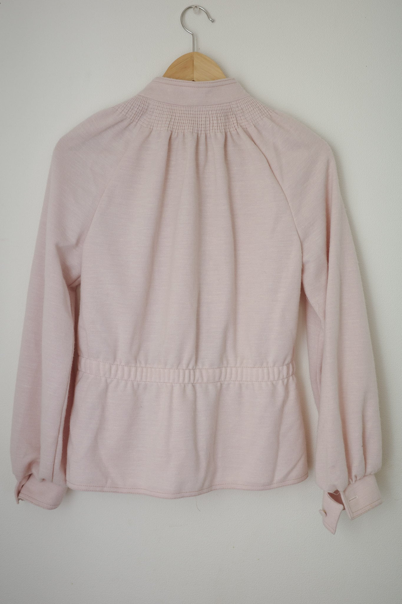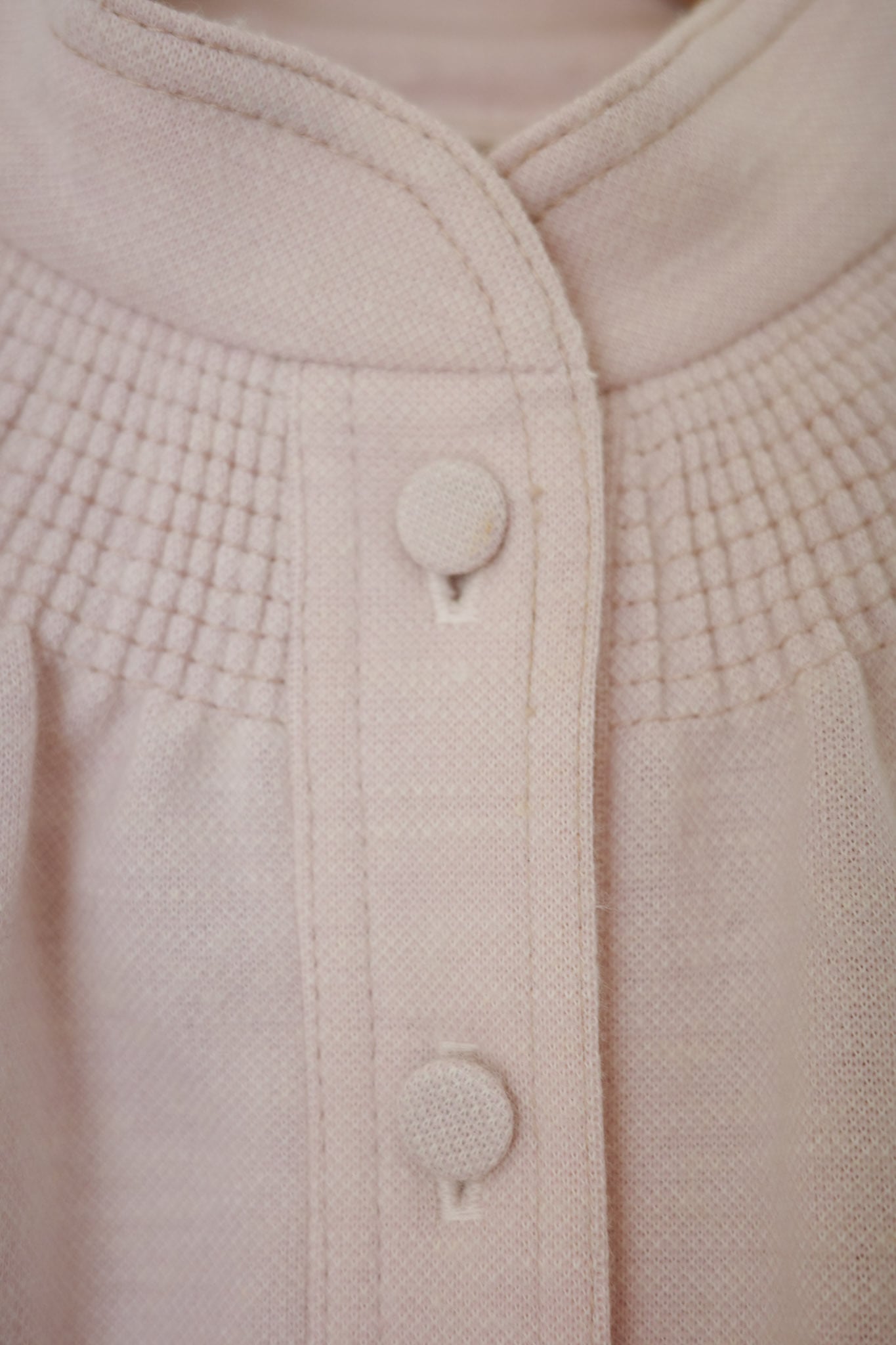 このヴィンテージペールピンクドローストリングウエストカーディガンは、柔らかなピンク色とリラックスしたシルエットが特徴的な一着です。