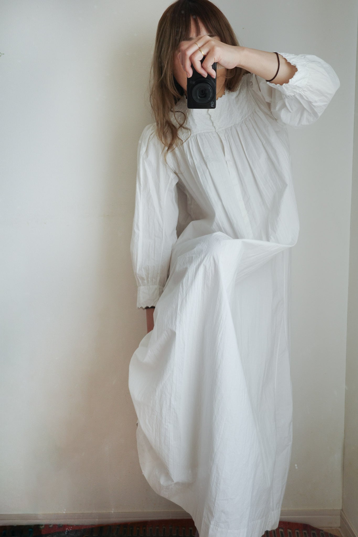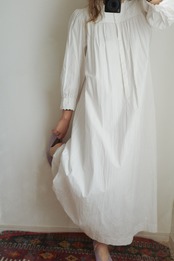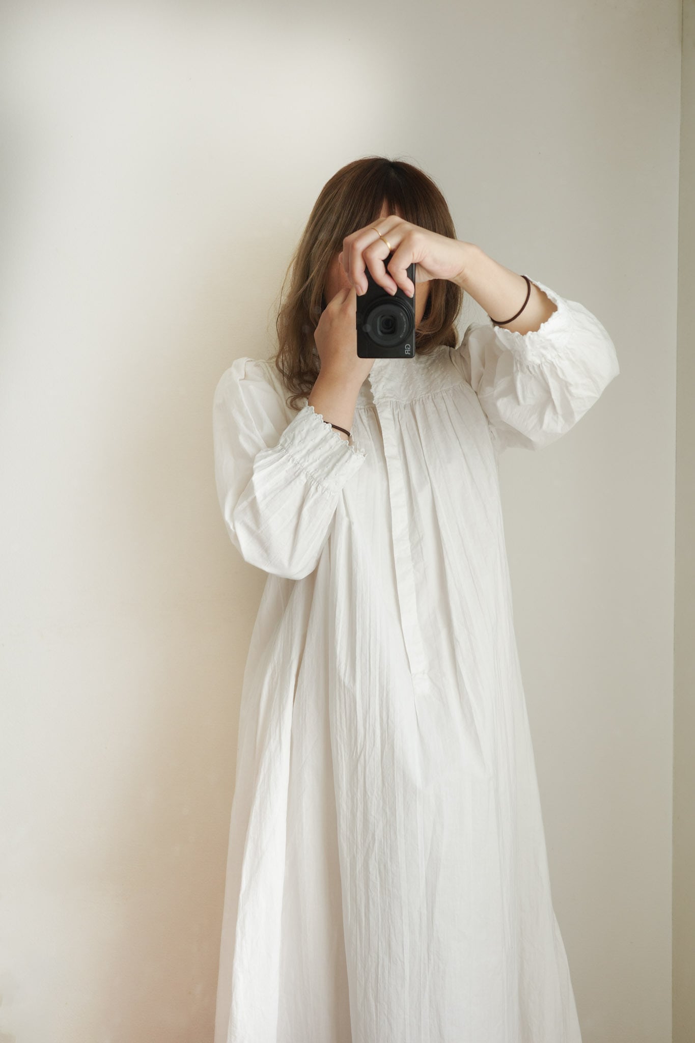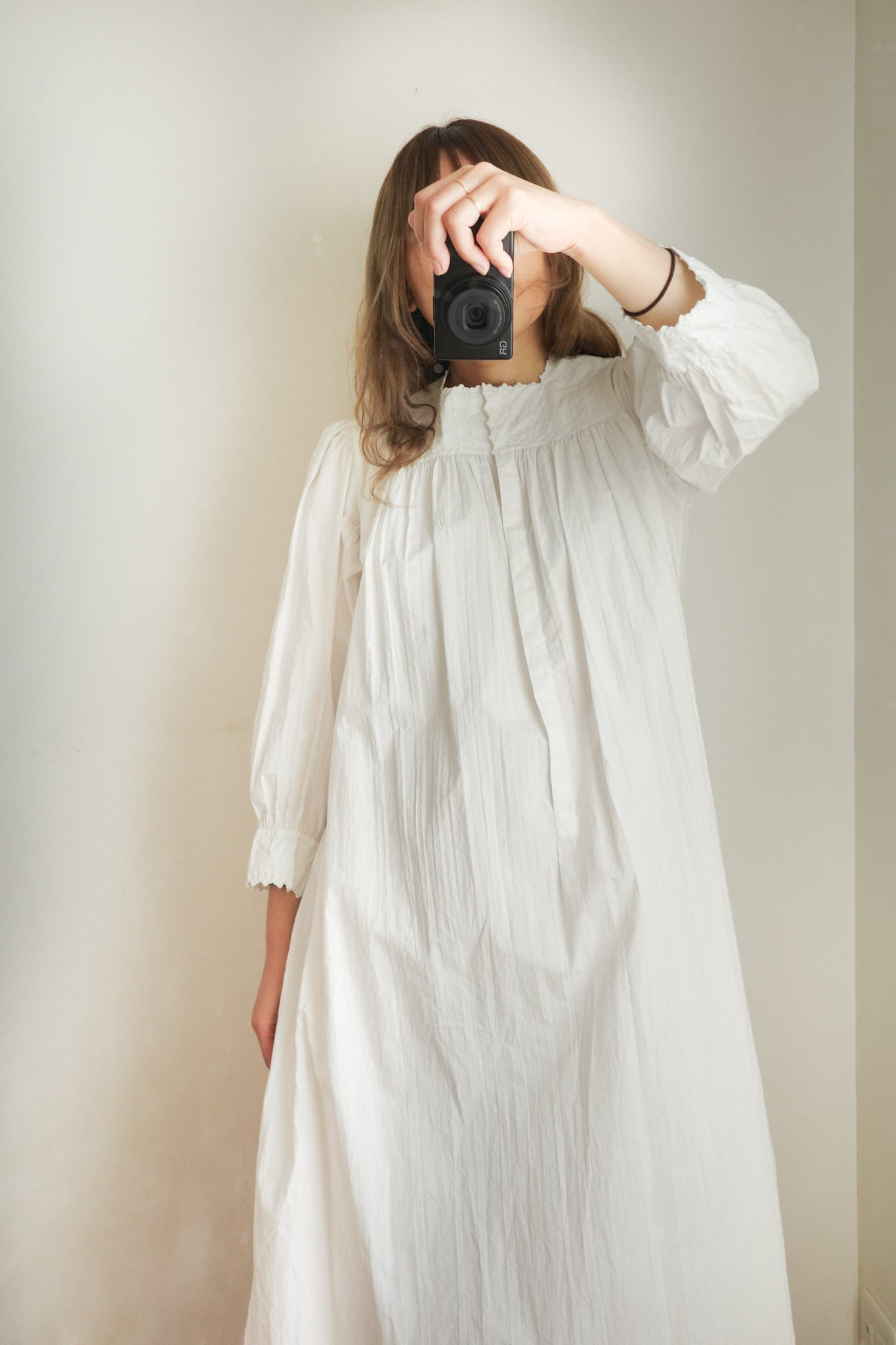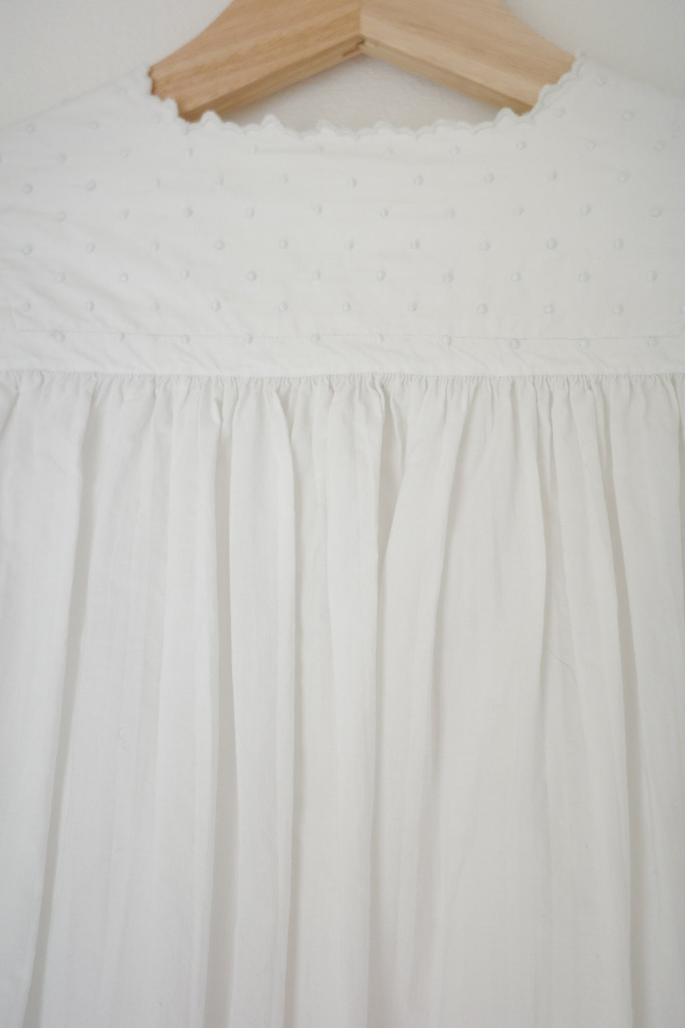 この魅力的なエドワーディアンスタイルのコットンナイトガウンは、パフスリーブと刺繍ドットが特徴的な一着です。ゆったりとしたスタイルを楽しむためのアイテムとして、さまざまなシーンでご活用いただけます。