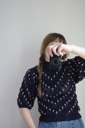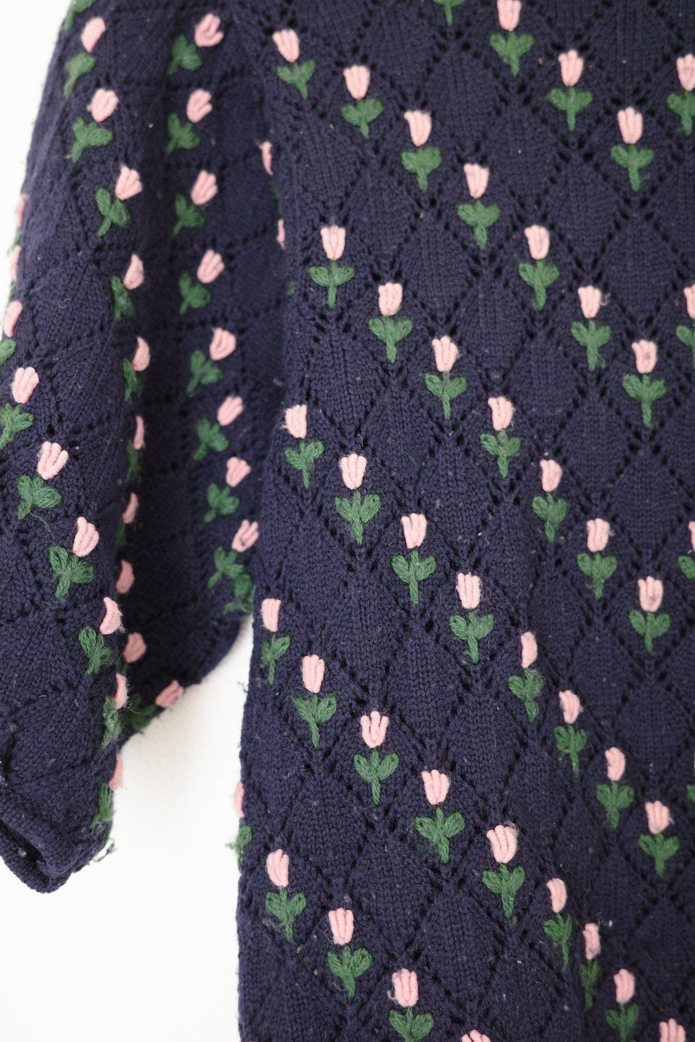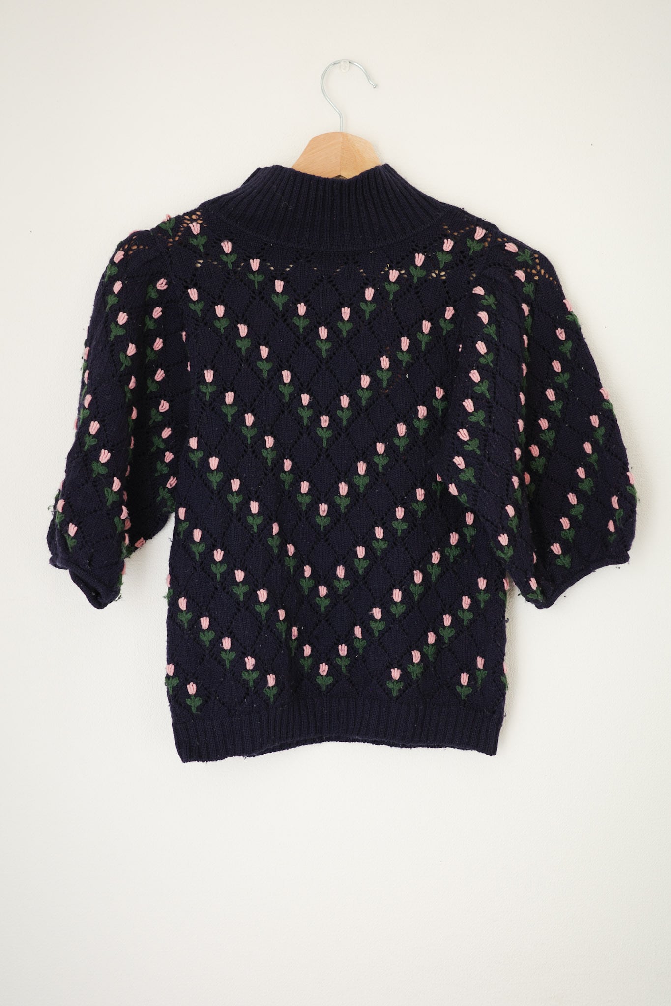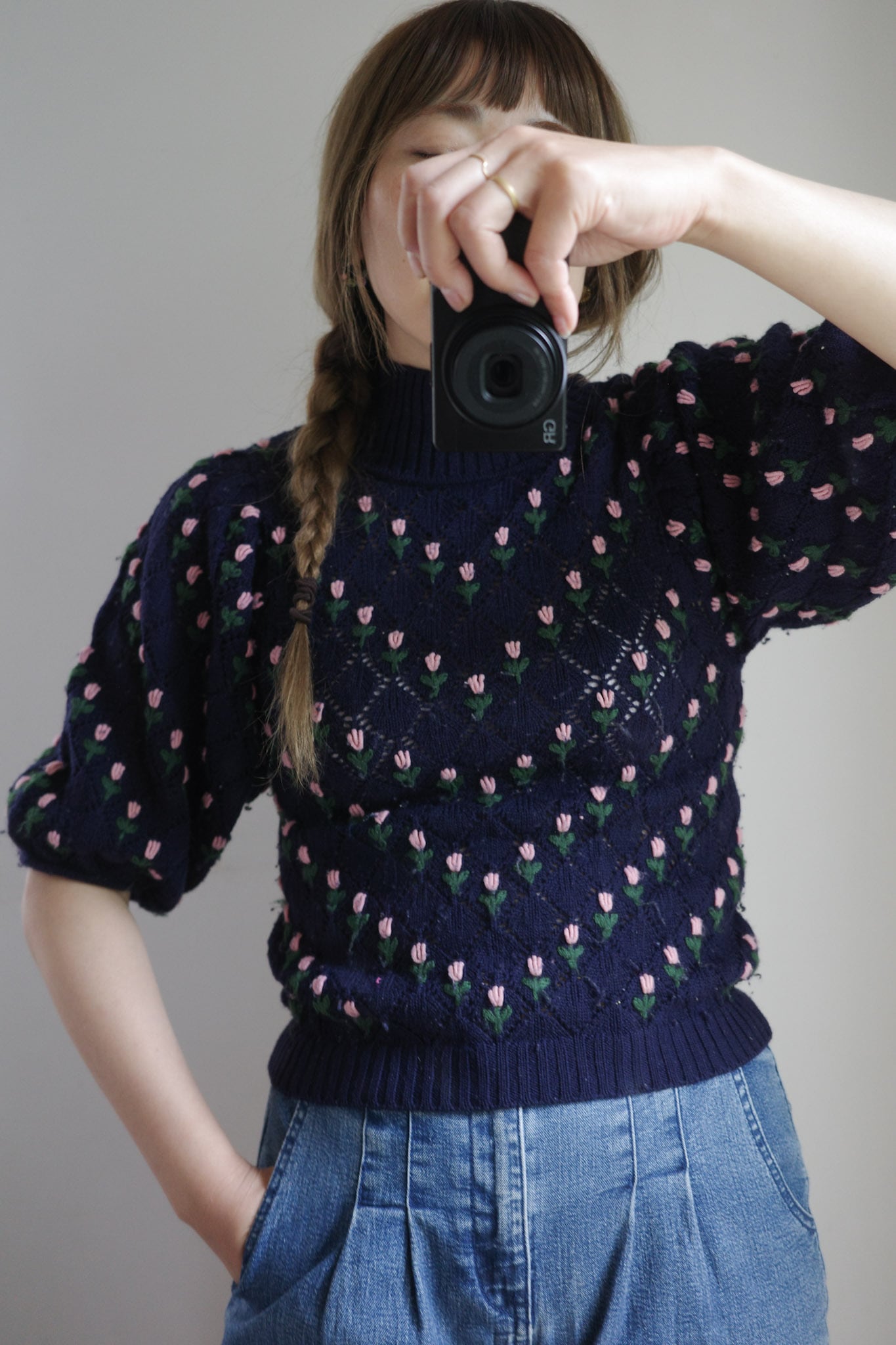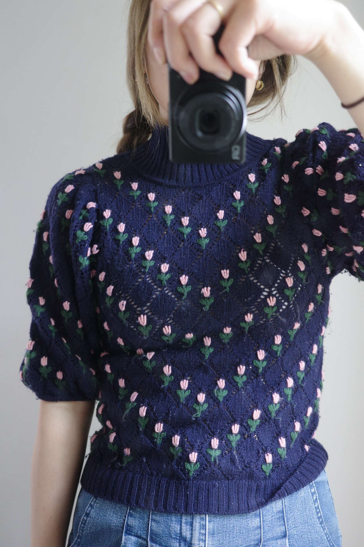 このヴィンテージネイビー半袖ニットトップは、シンプルながらもスタイリッシュなデザインが特徴的な一着です。落ち着いたネイビーカラーが、さまざまなコーディネートにぴったりハマります。ピンクの花柄が施されていてガーリーなアイテムです。