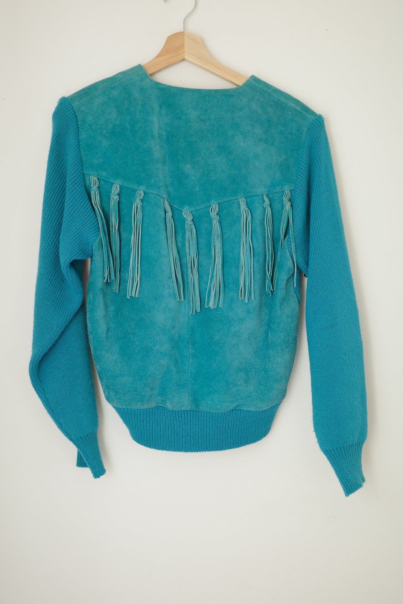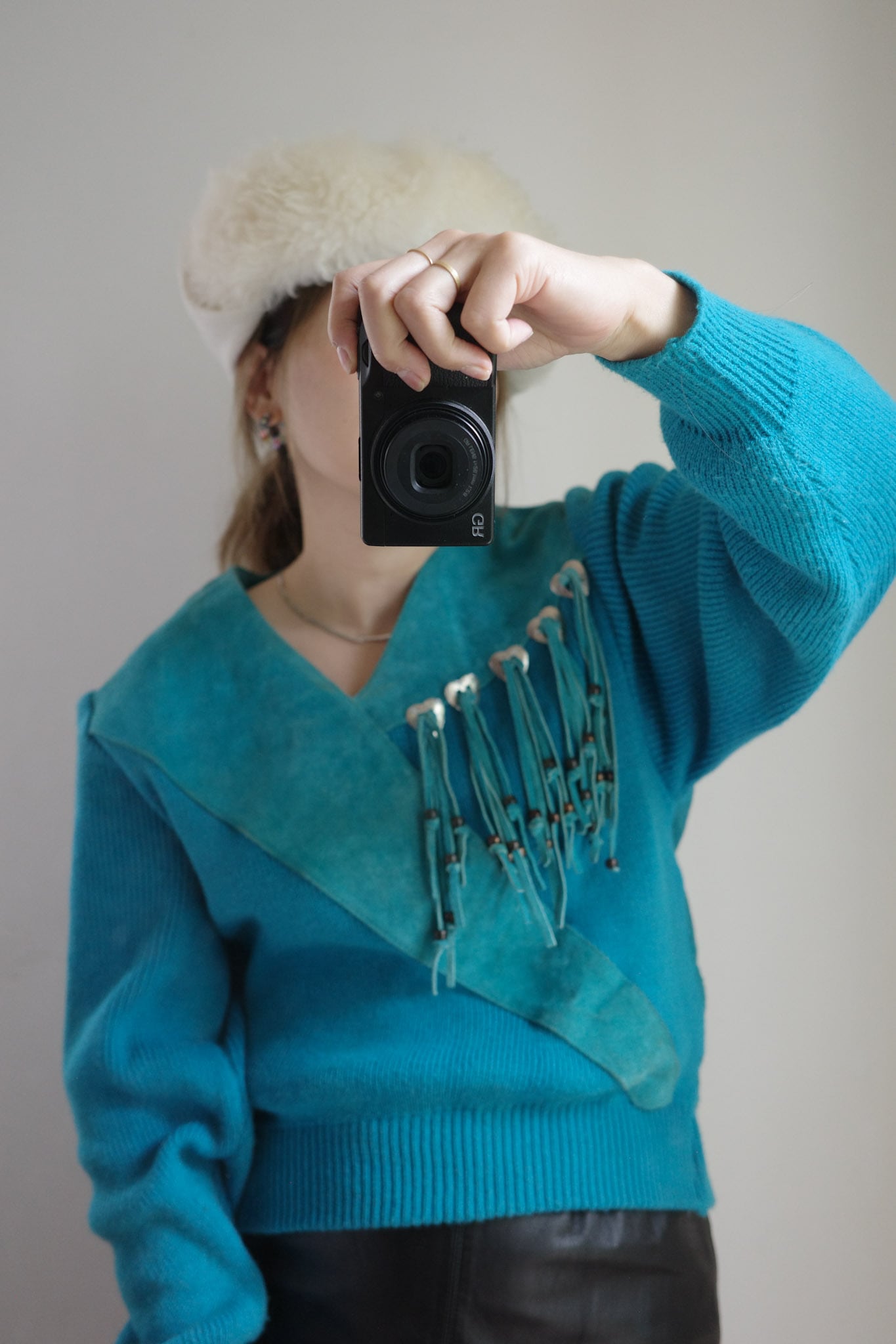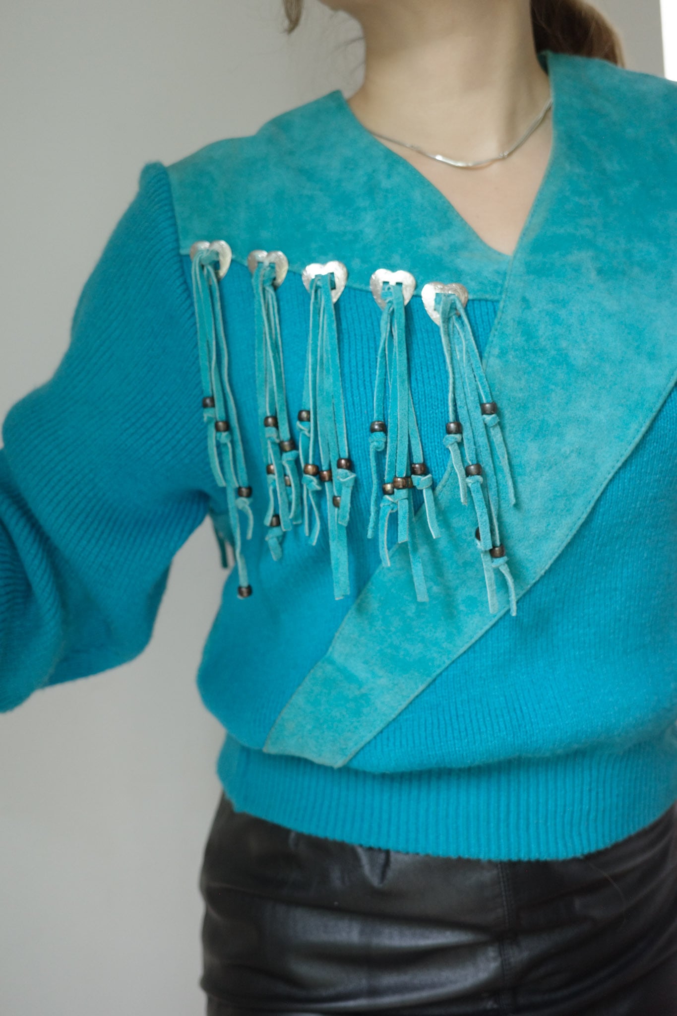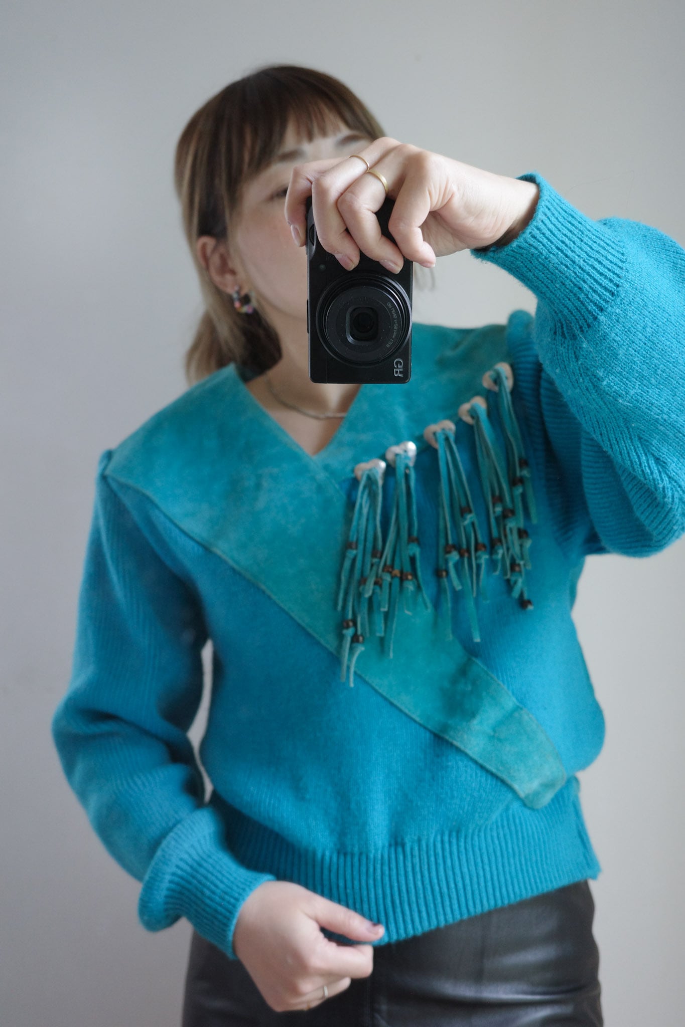この1980年代のスカイブルーフリンジニット&レザートップは、鮮やかなスカイブルーと個性的なフリンジデザインが特徴的な一着です。