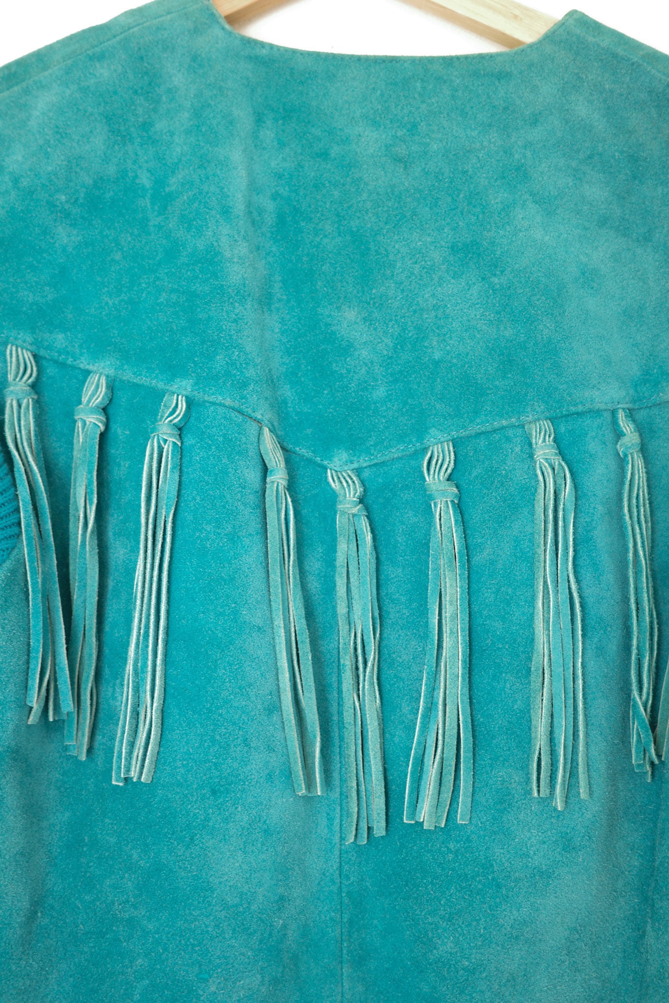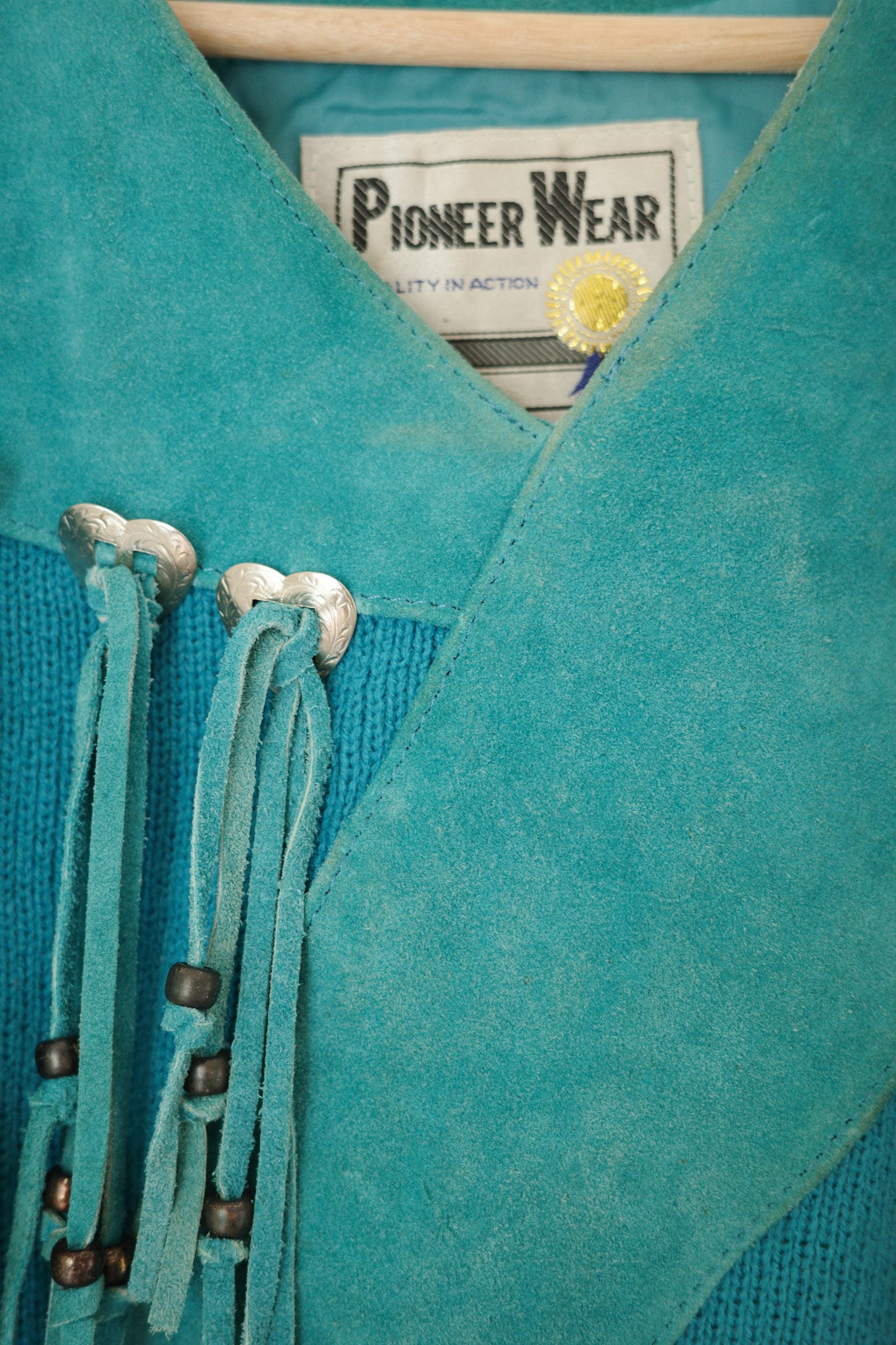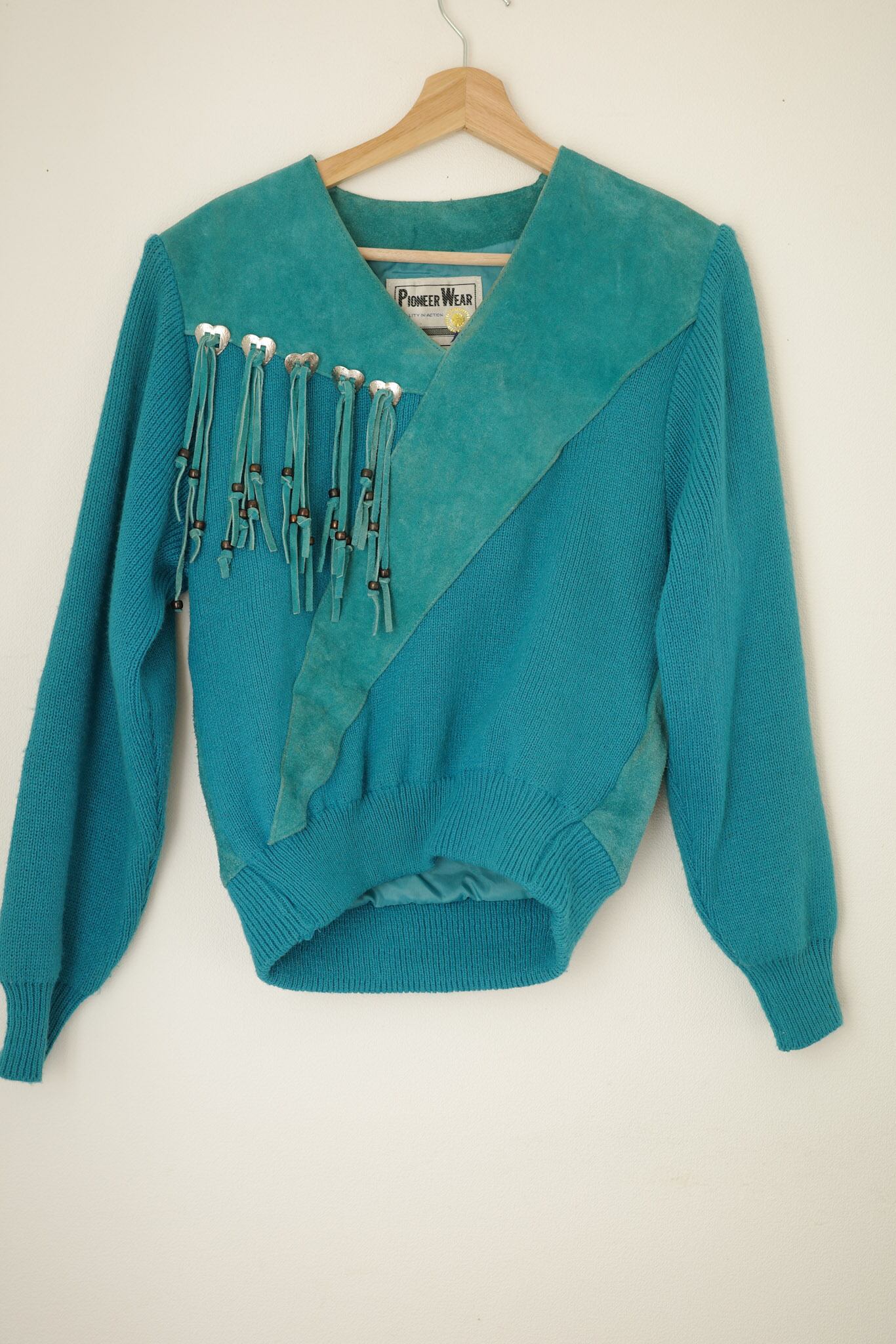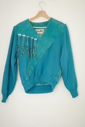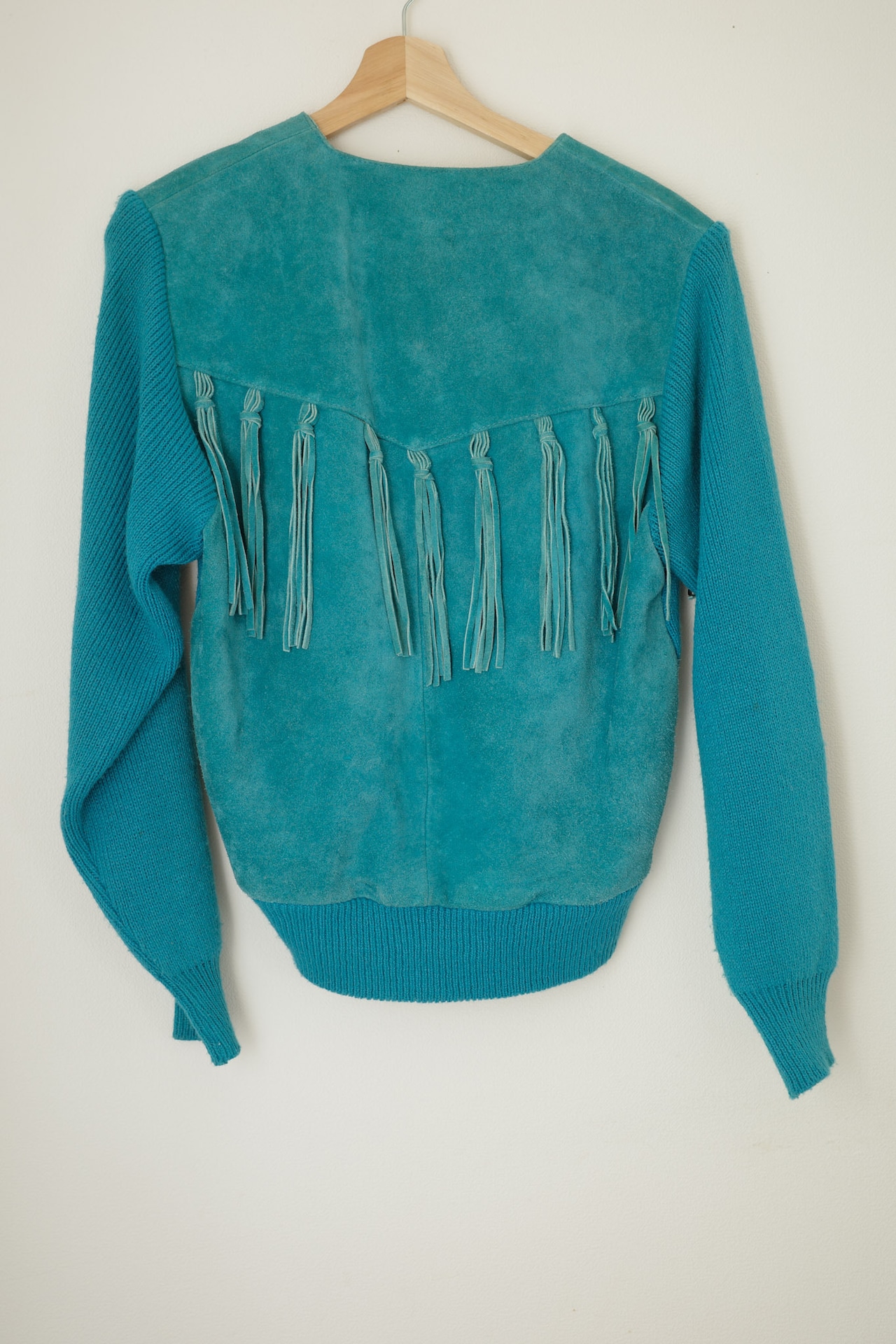この1980年代のスカイブルーフリンジニット&レザートップは、鮮やかなスカイブルーと個性的なフリンジデザインが特徴的な一着です。
